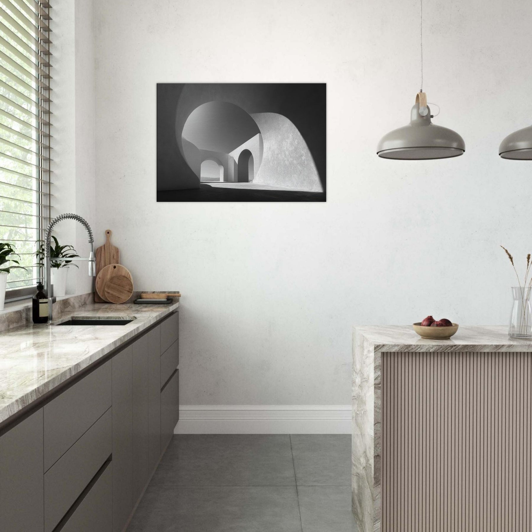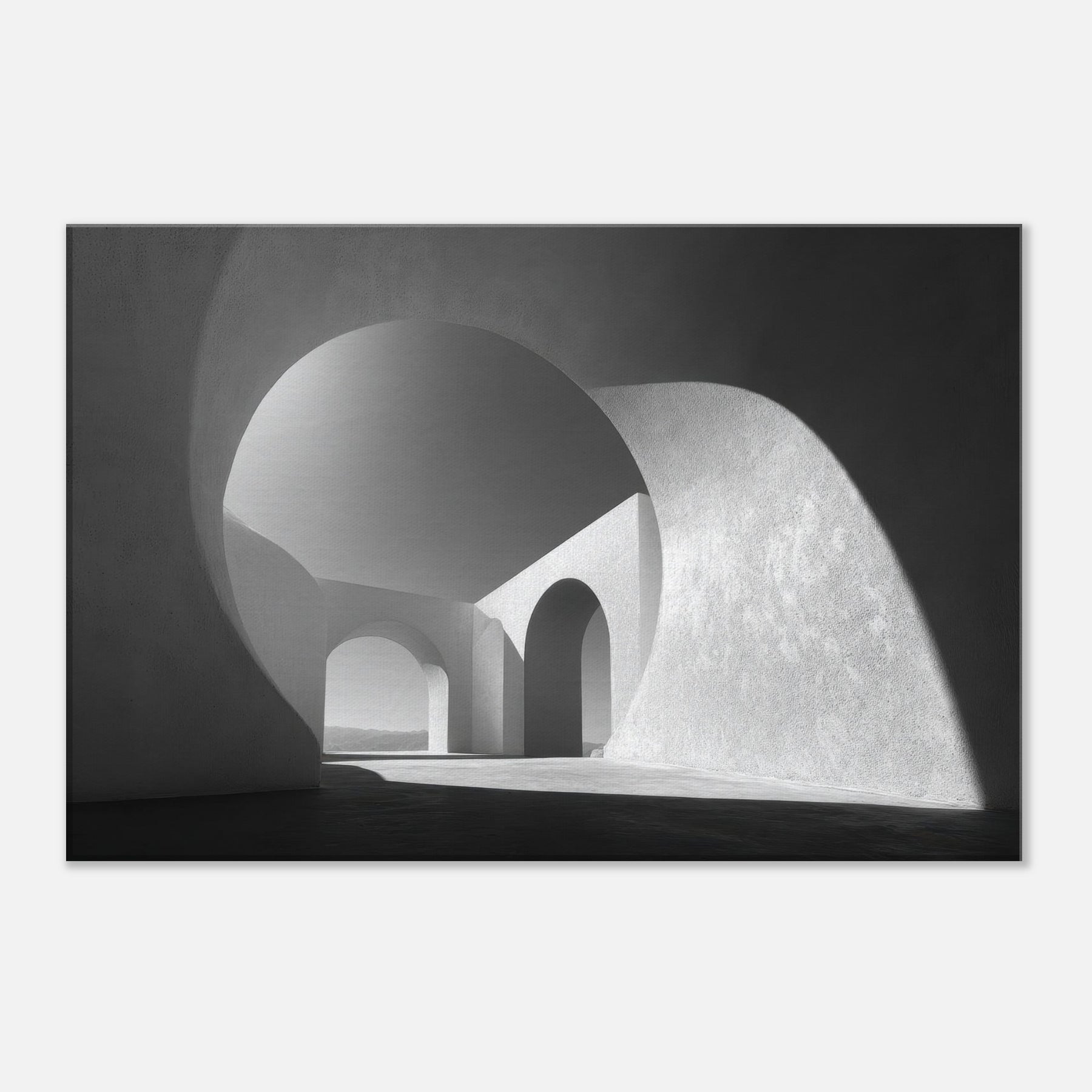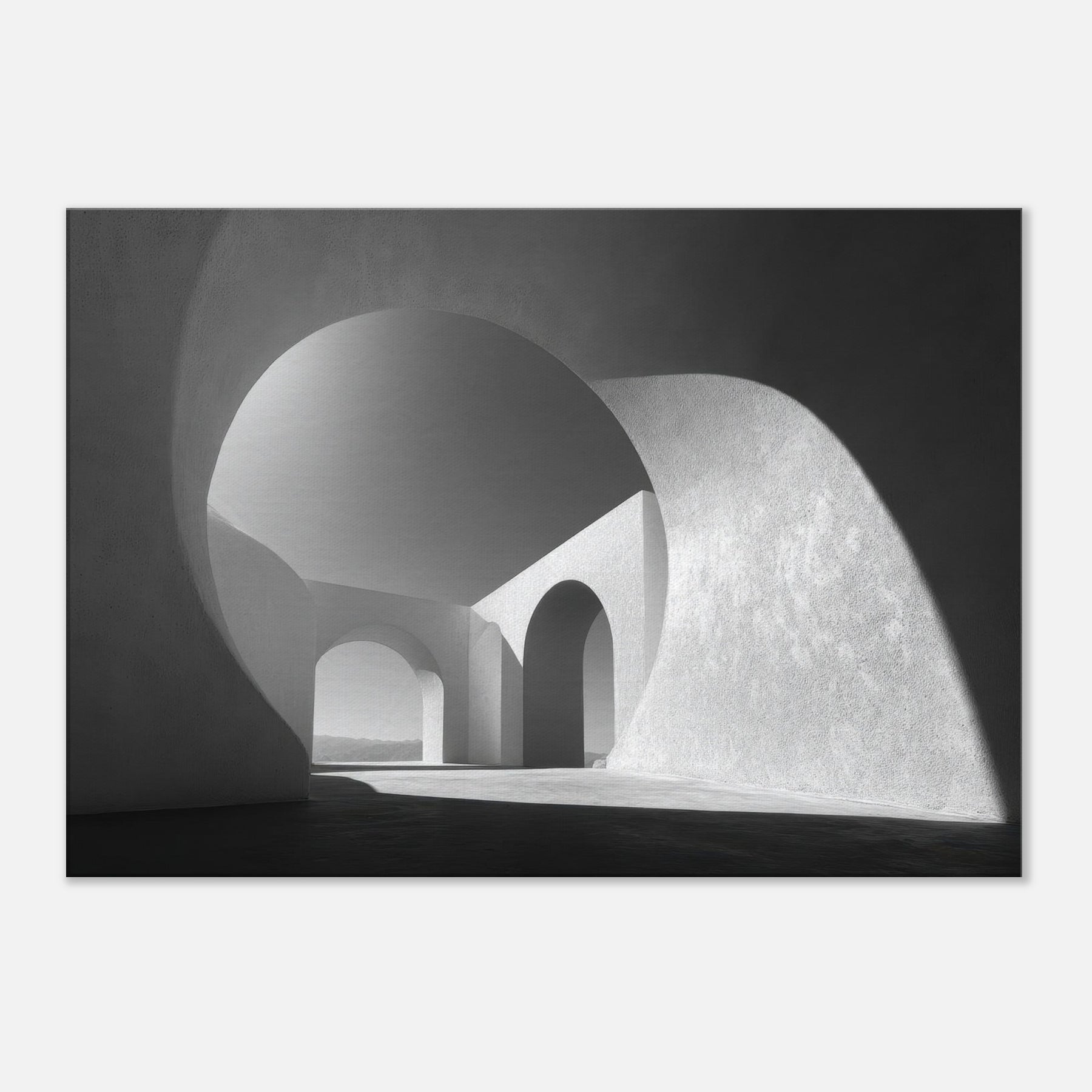 An Archway opens the room to light and distance, a study in clean lines and quiet power. In black and white, the composition shelters your space in spaciousness, inviting contemplation as shadows trace the curves and arches.