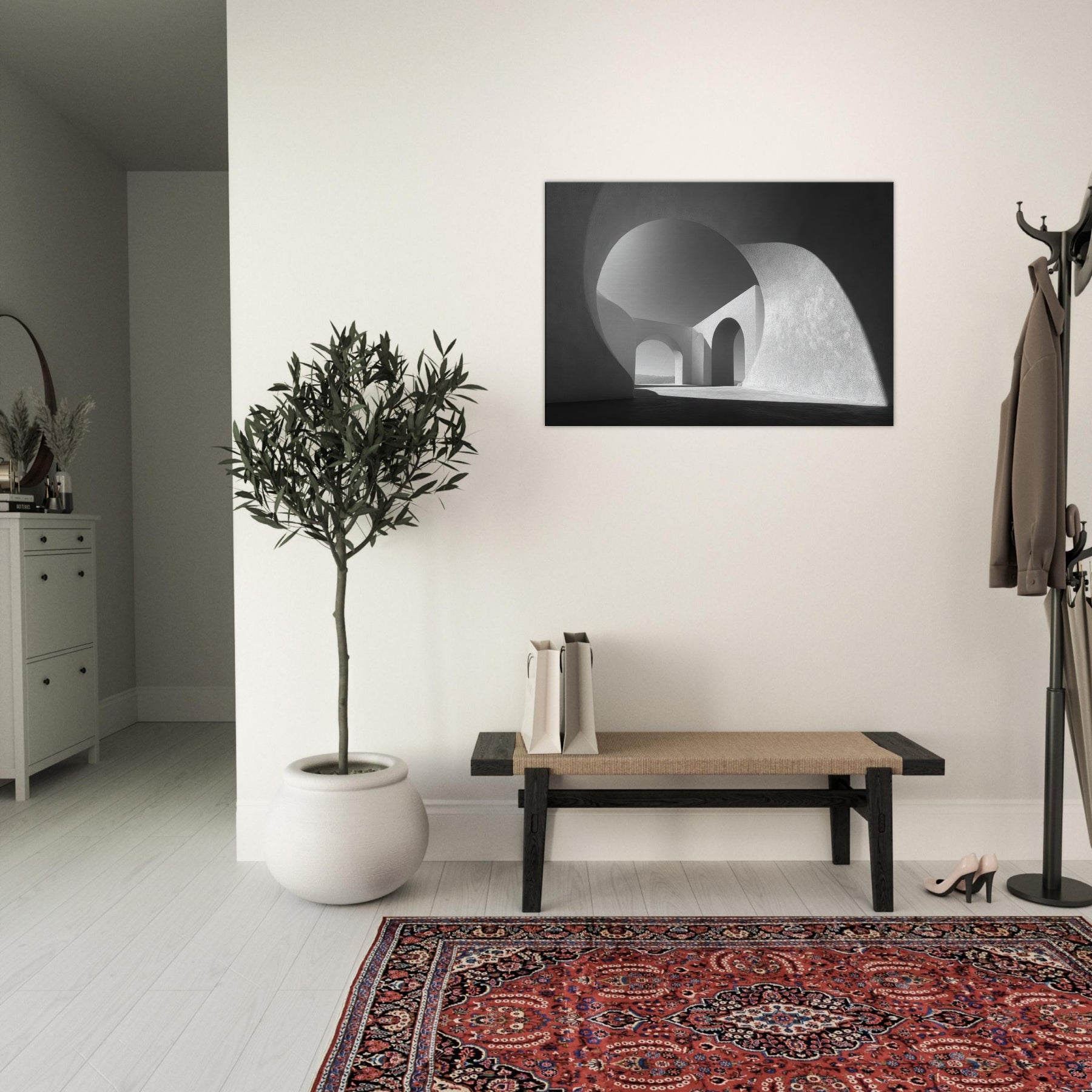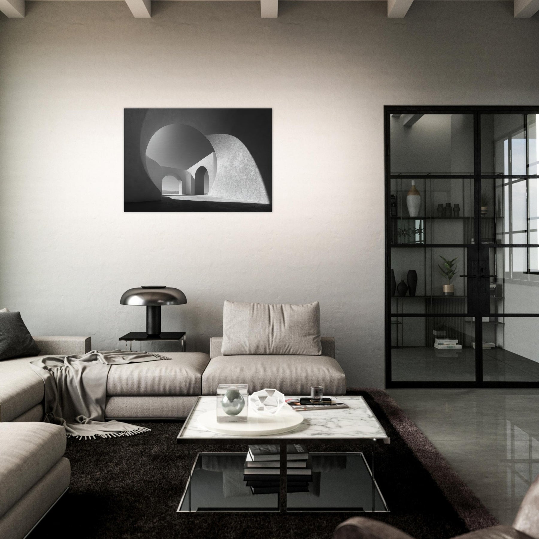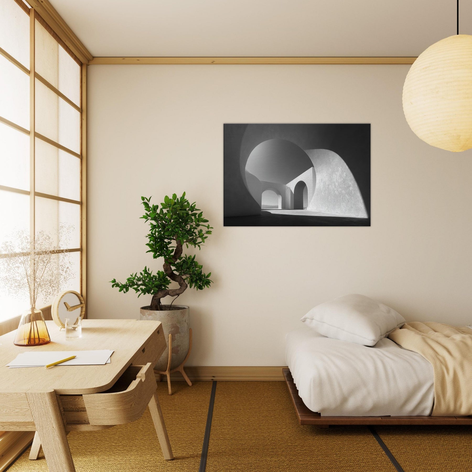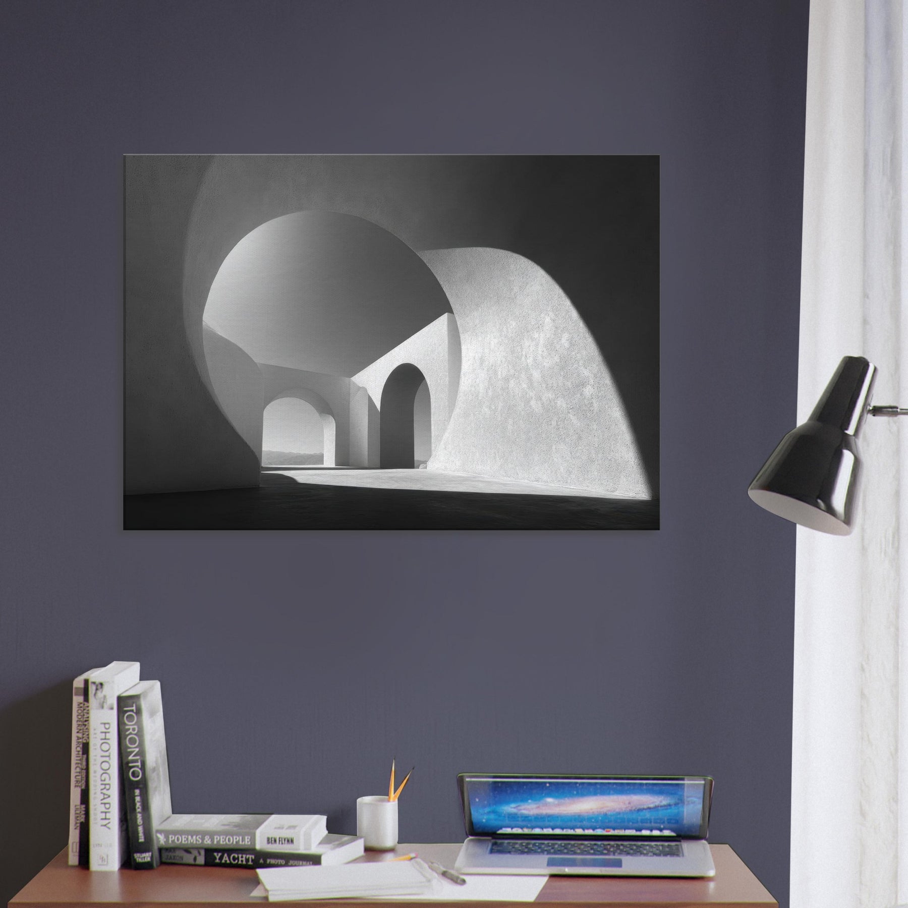 An Archway opens the room to light and distance, a study in clean lines and quiet power. In black and white, the composition shelters your space in spaciousness, inviting contemplation as shadows trace the curves and arches.