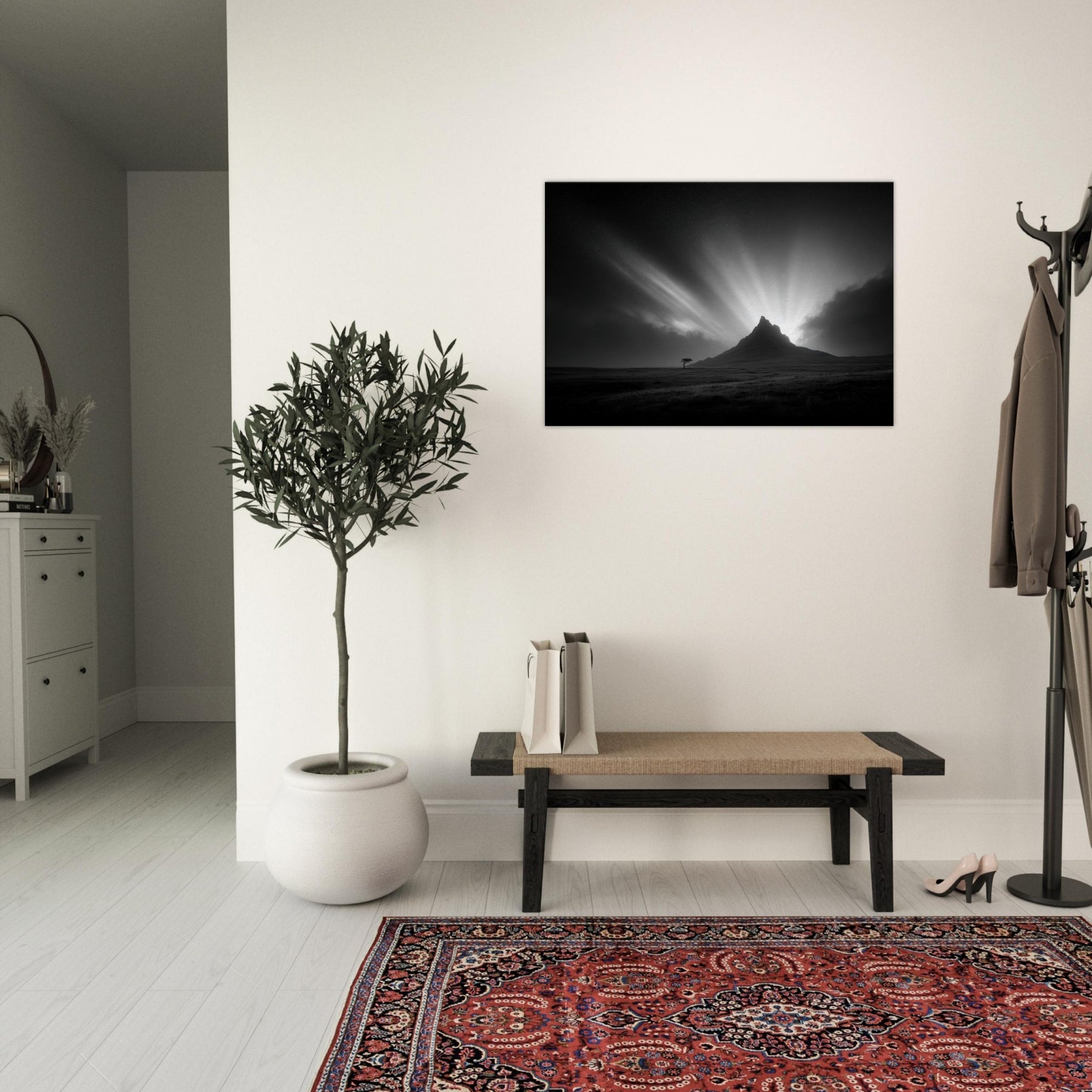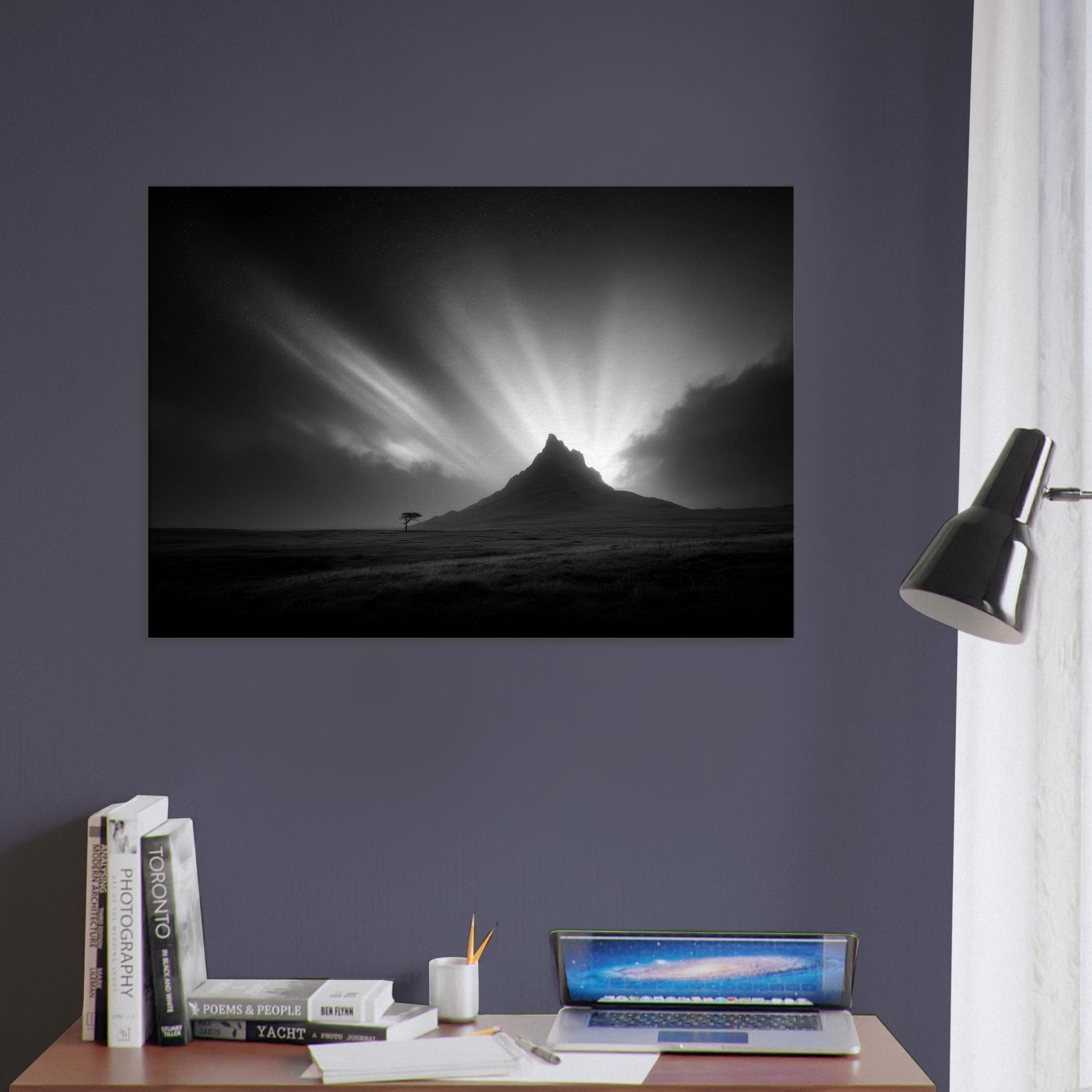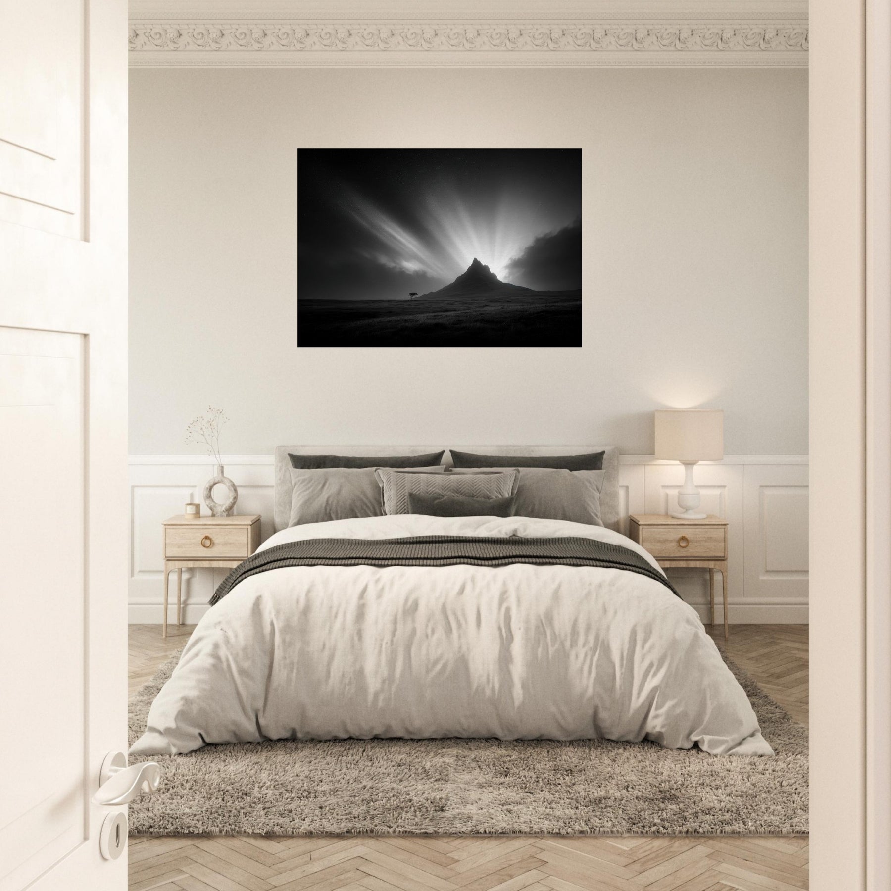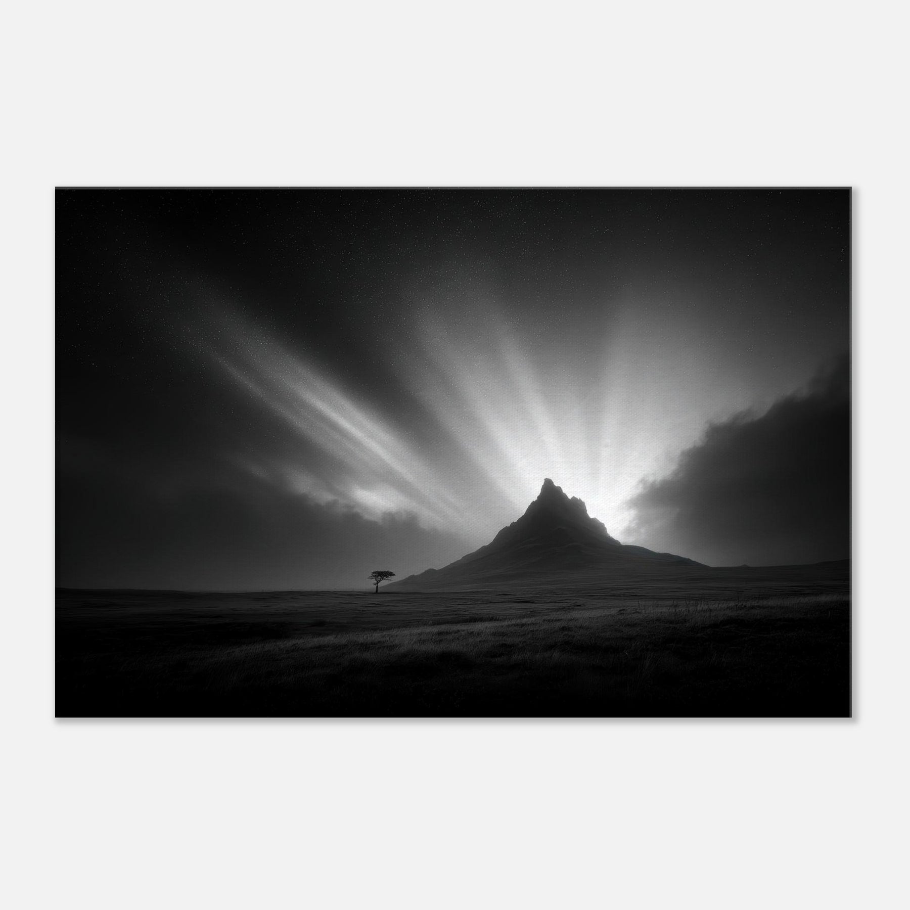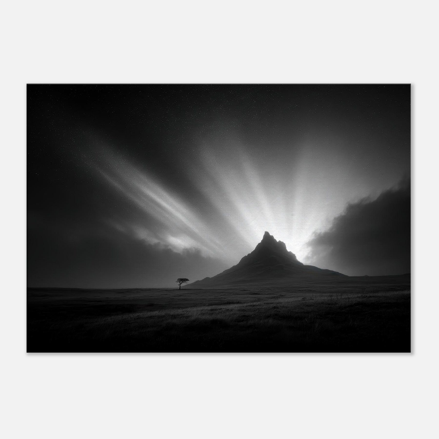 An arresting study of the Aurora Borealis rendered in stark black and white, this image folds the mystic night into a quiet room. The mountain silhouette grounds the breathless sky as light bursts carve a hush across the room, inviting contemplative stillness.