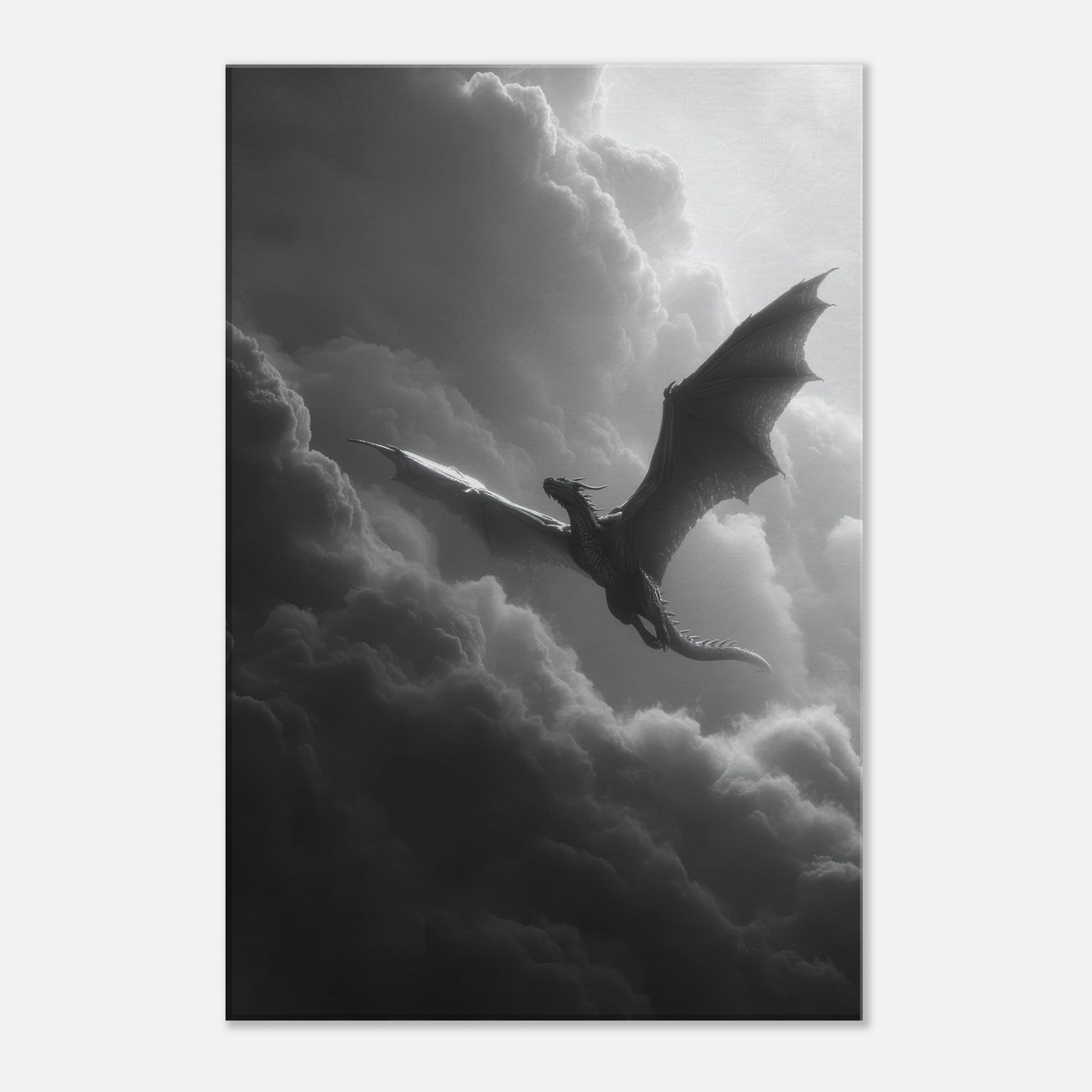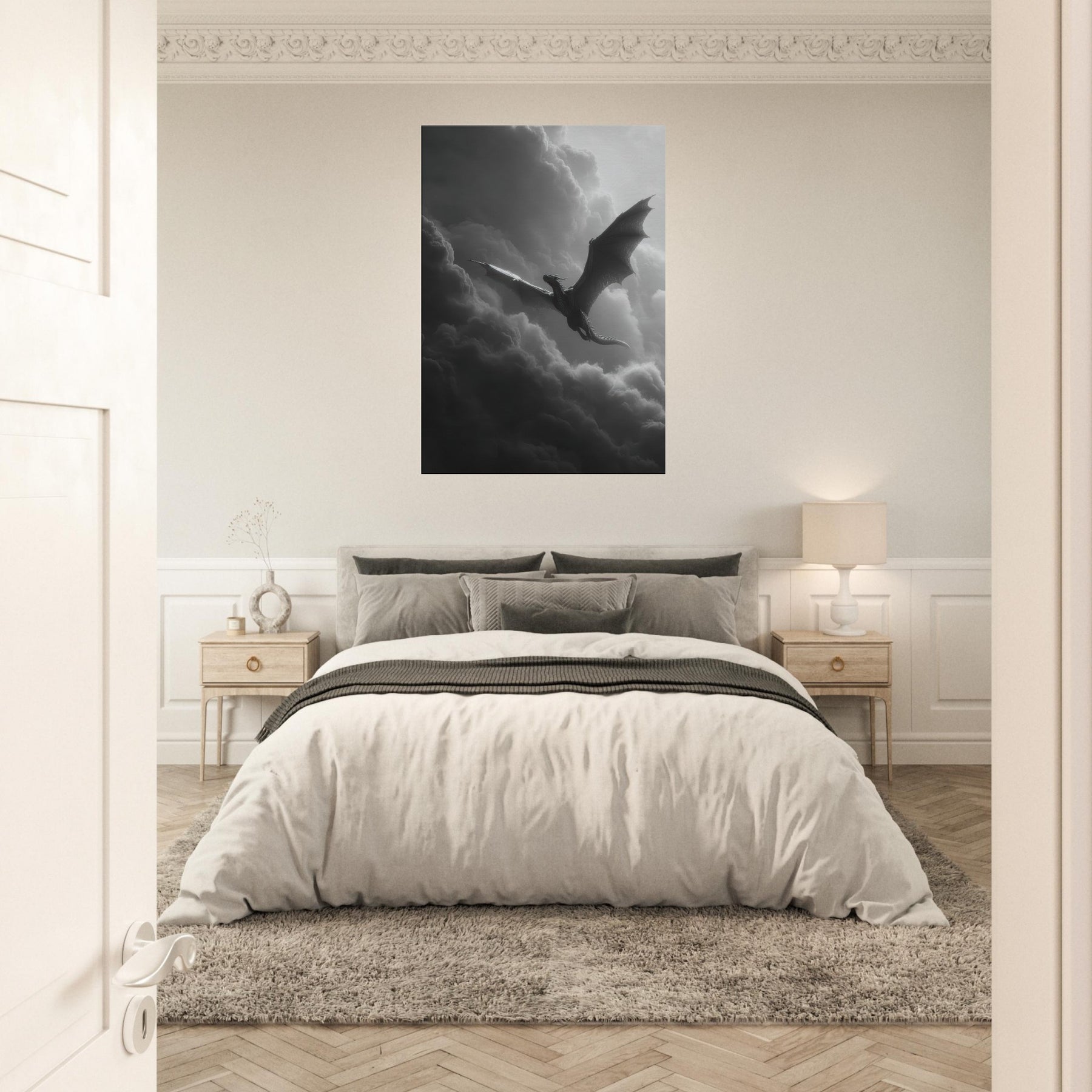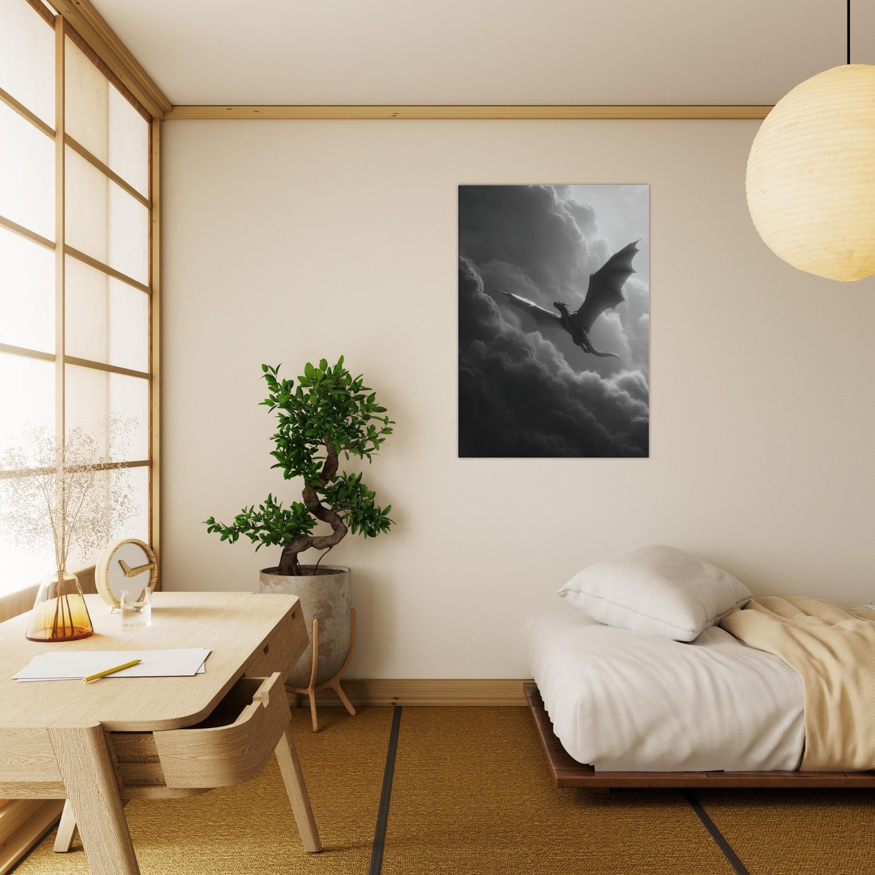 Let the Azure Dragon of the East flying through thunderous skies breathe myth into your room. In black and white, its sinewy wings carve the air, a dramatic counterpoint to soft fabrics and warm wood.