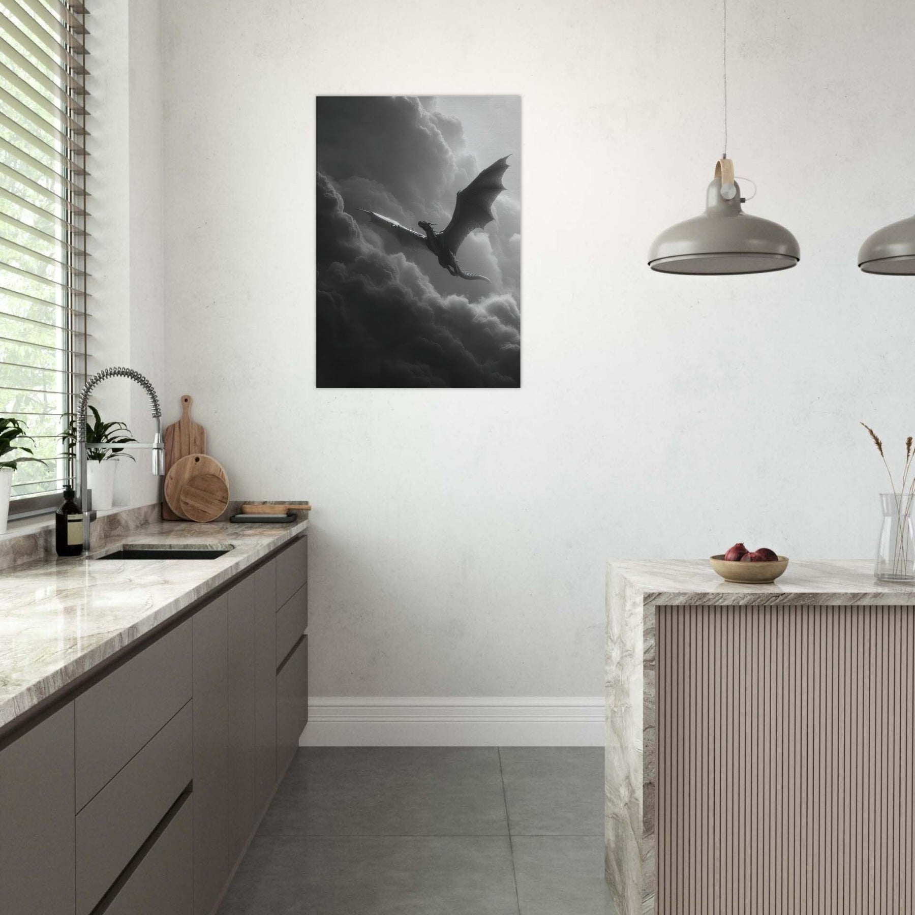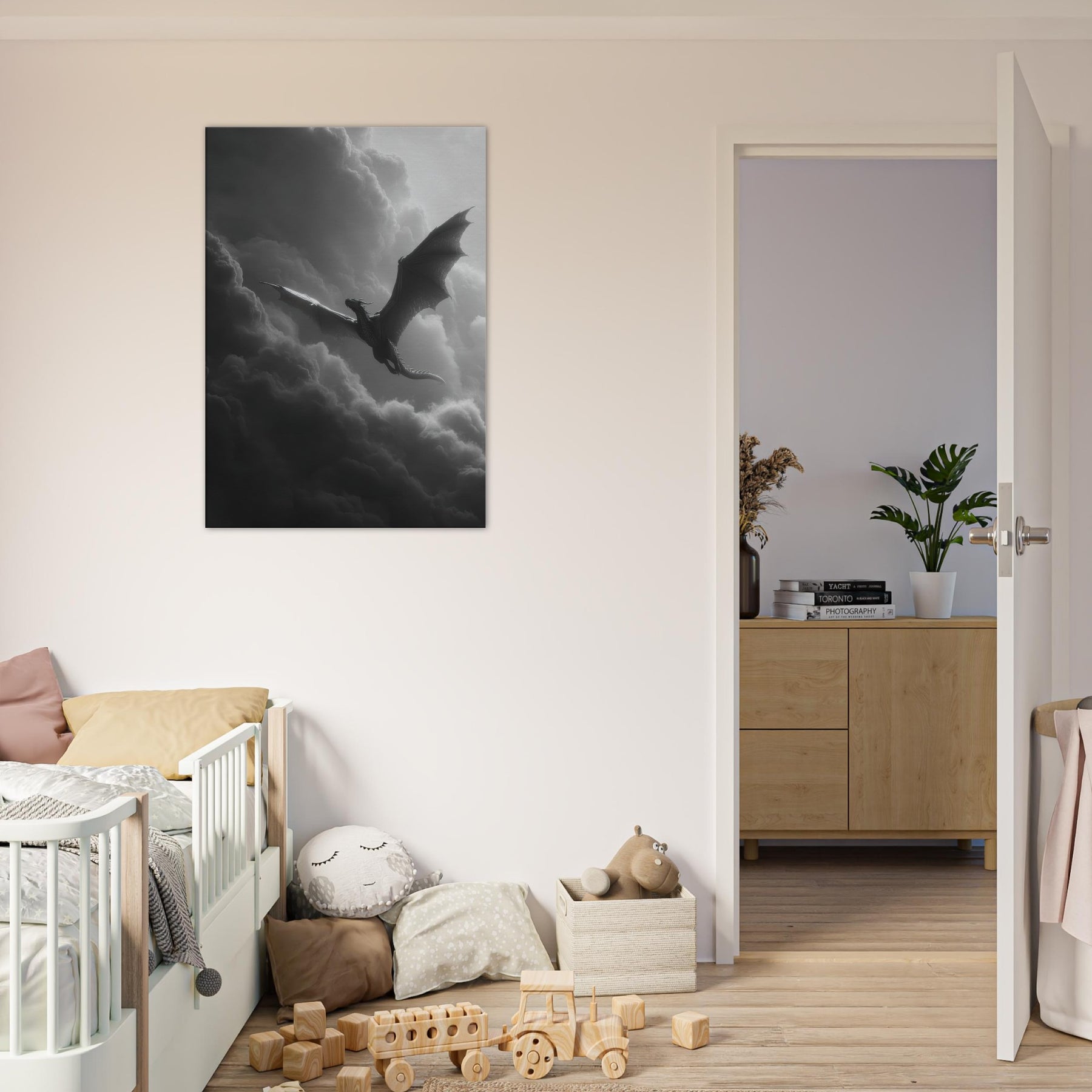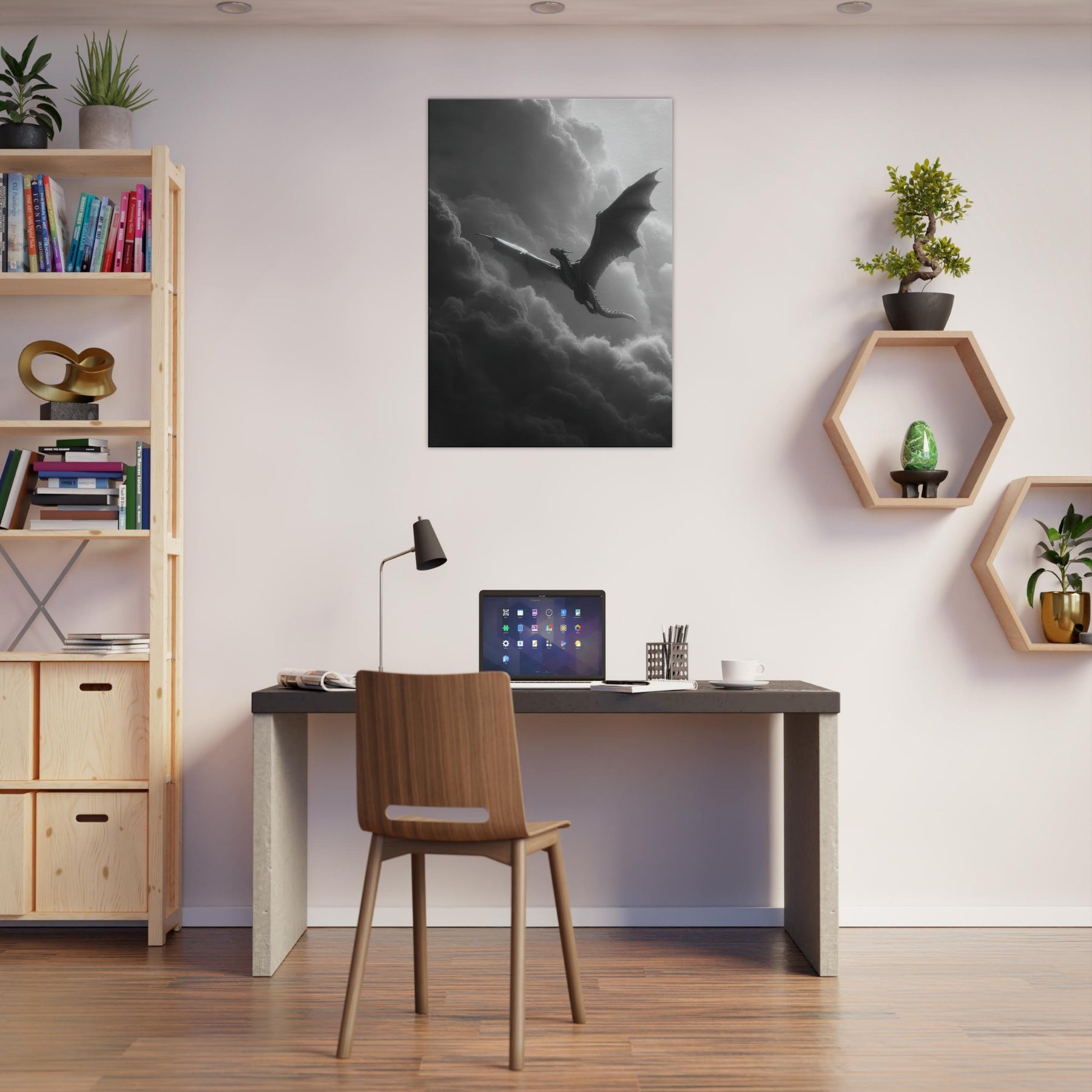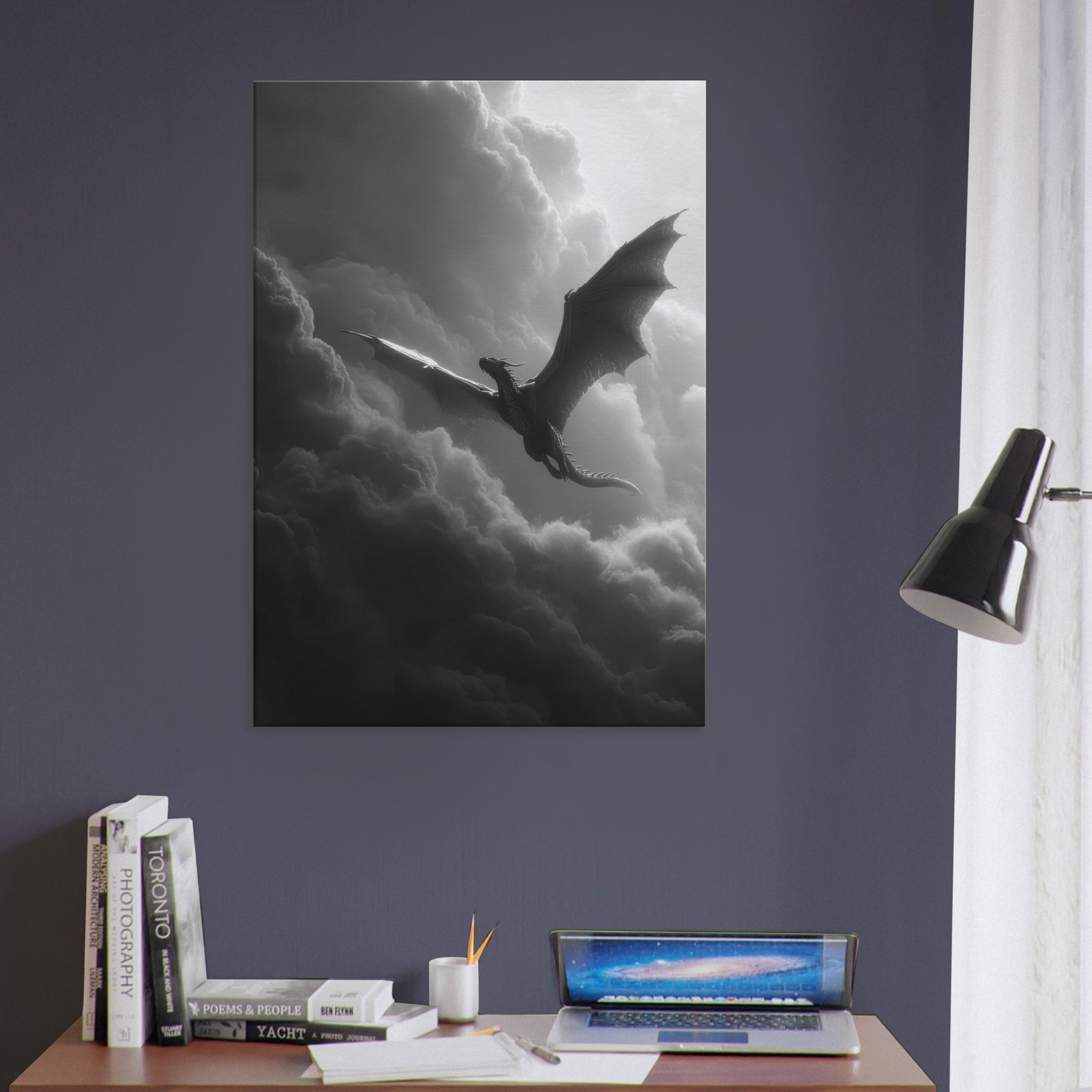 Let the Azure Dragon of the East flying through thunderous skies breathe myth into your room. In black and white, its sinewy wings carve the air, a dramatic counterpoint to soft fabrics and warm wood.