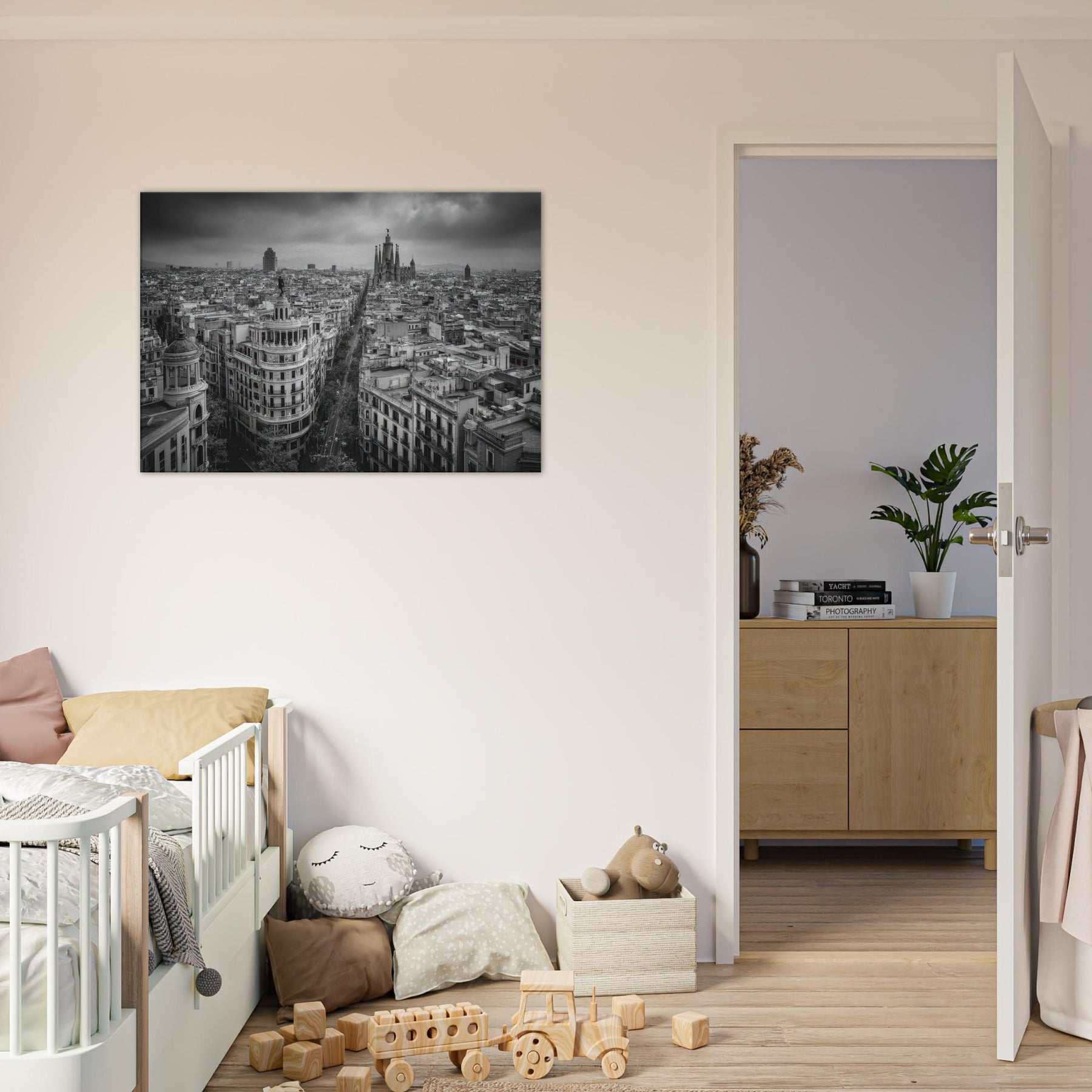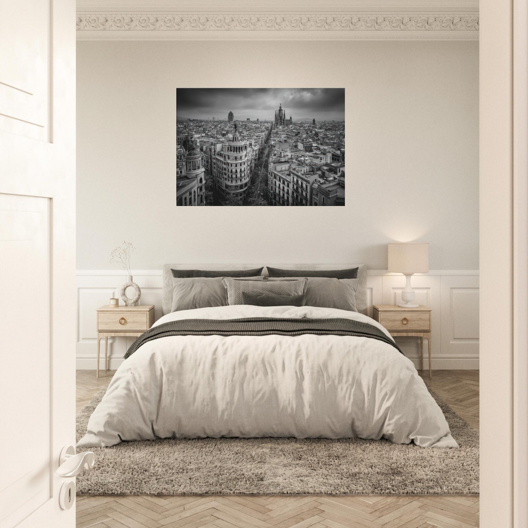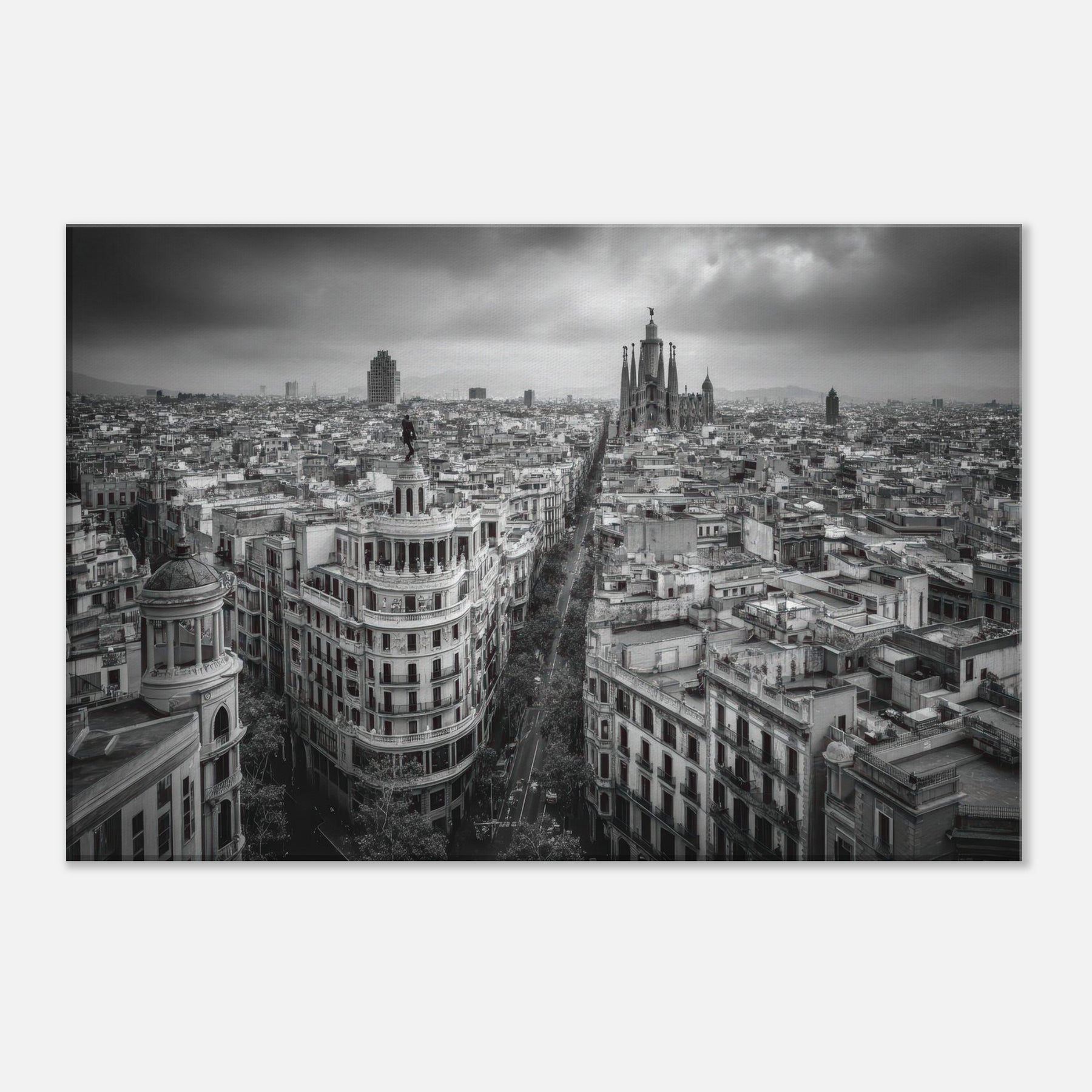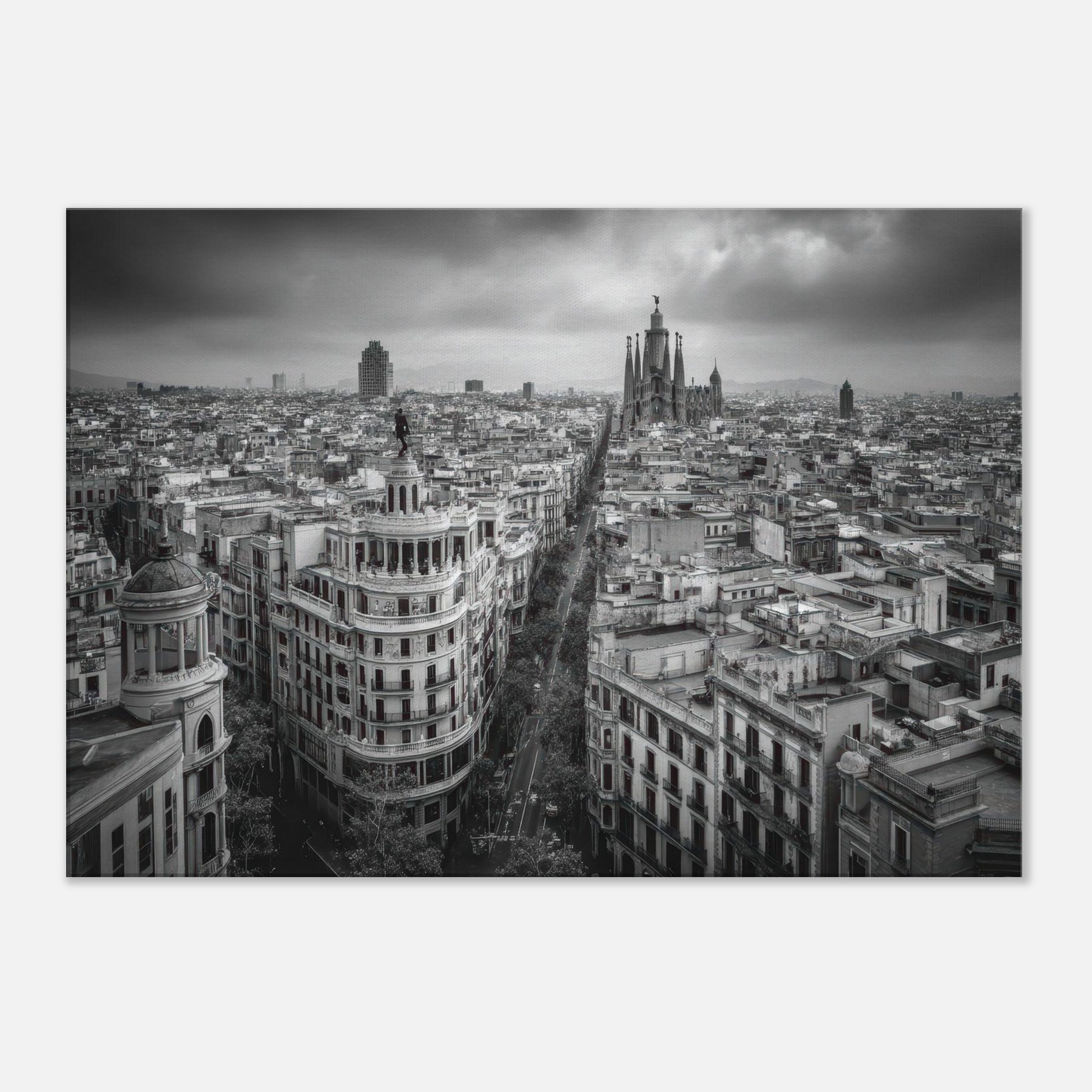 Barcelona unfolds in monochrome: a breath of wind over rooftops, the distant cathedral spires carved in graphite. This bold black and white cityscape invites quiet contemplation, where street lamps flicker like a heartbeat and the avenue becomes a ribbon of light.