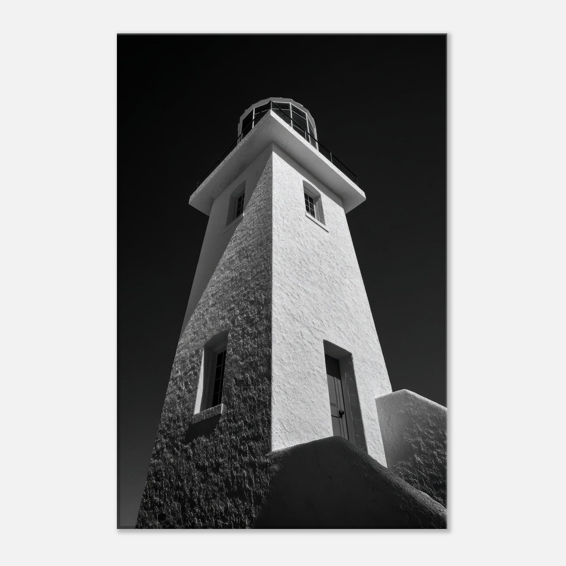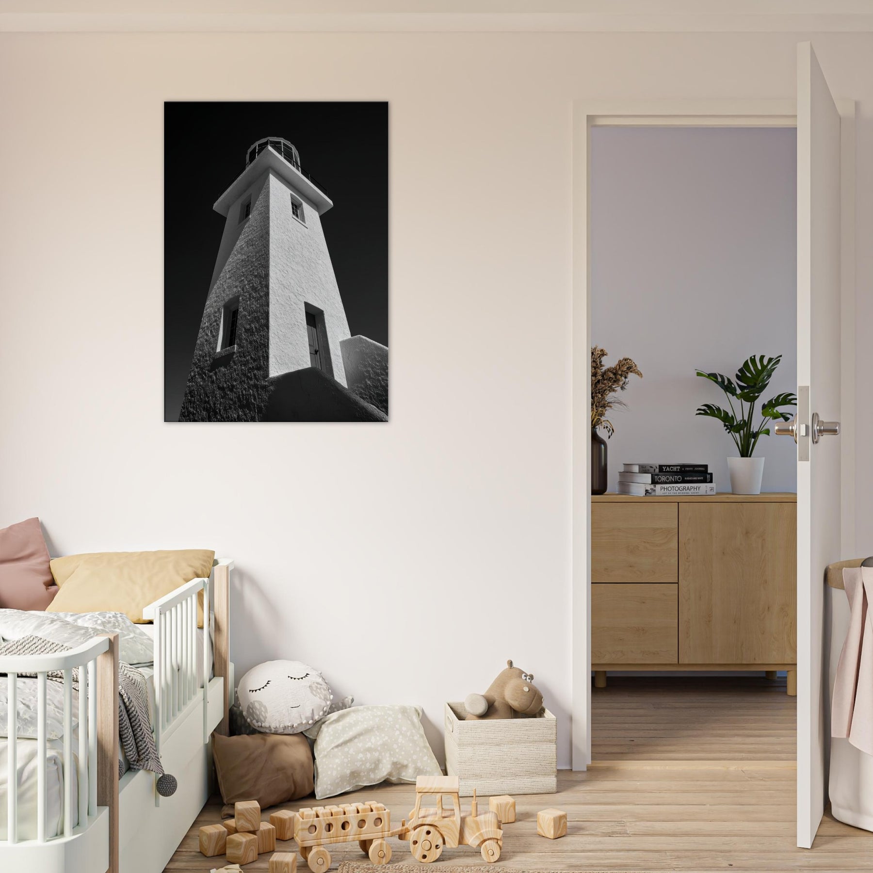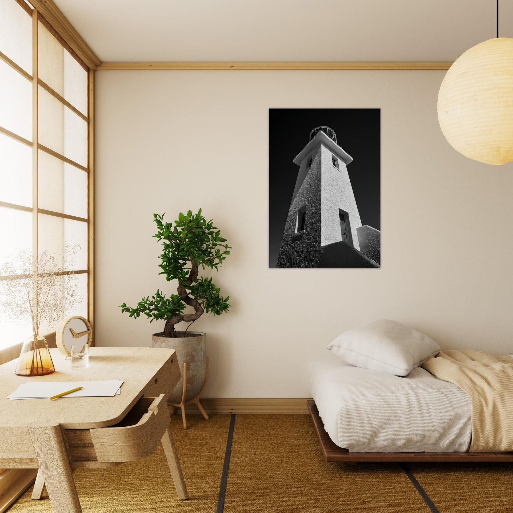 Stand tall against the horizon, the Lighthouse rises in stark relief as if etched in light itself. The black and white contrast renders the coastline into sculpted shadows, inviting calm into any room.