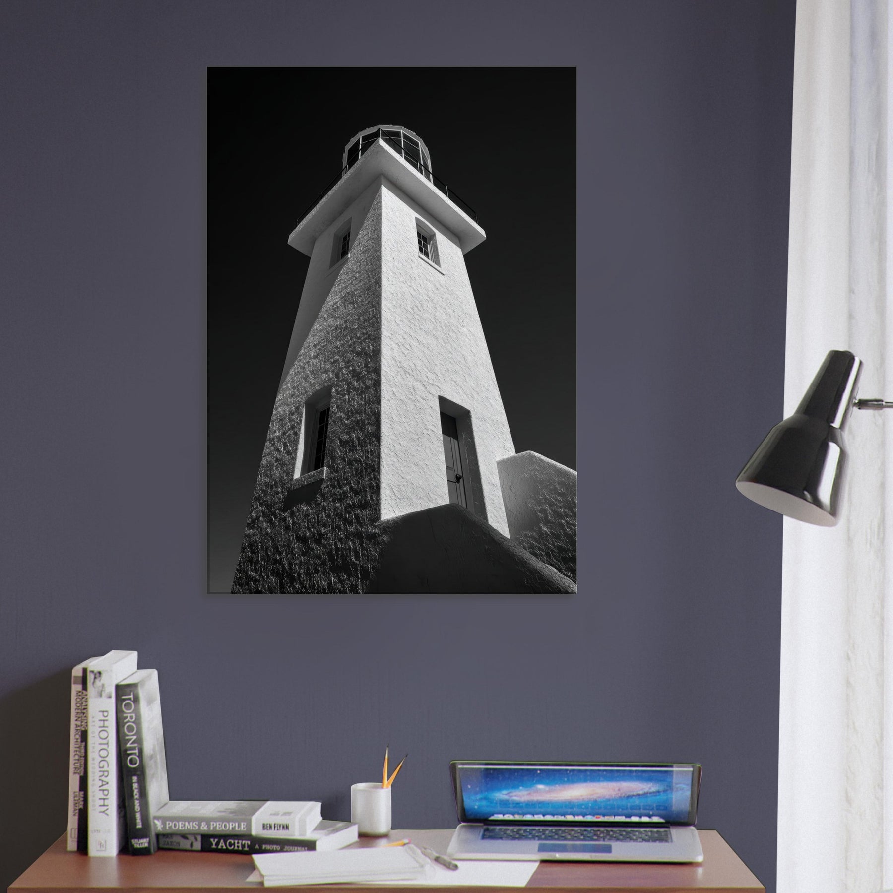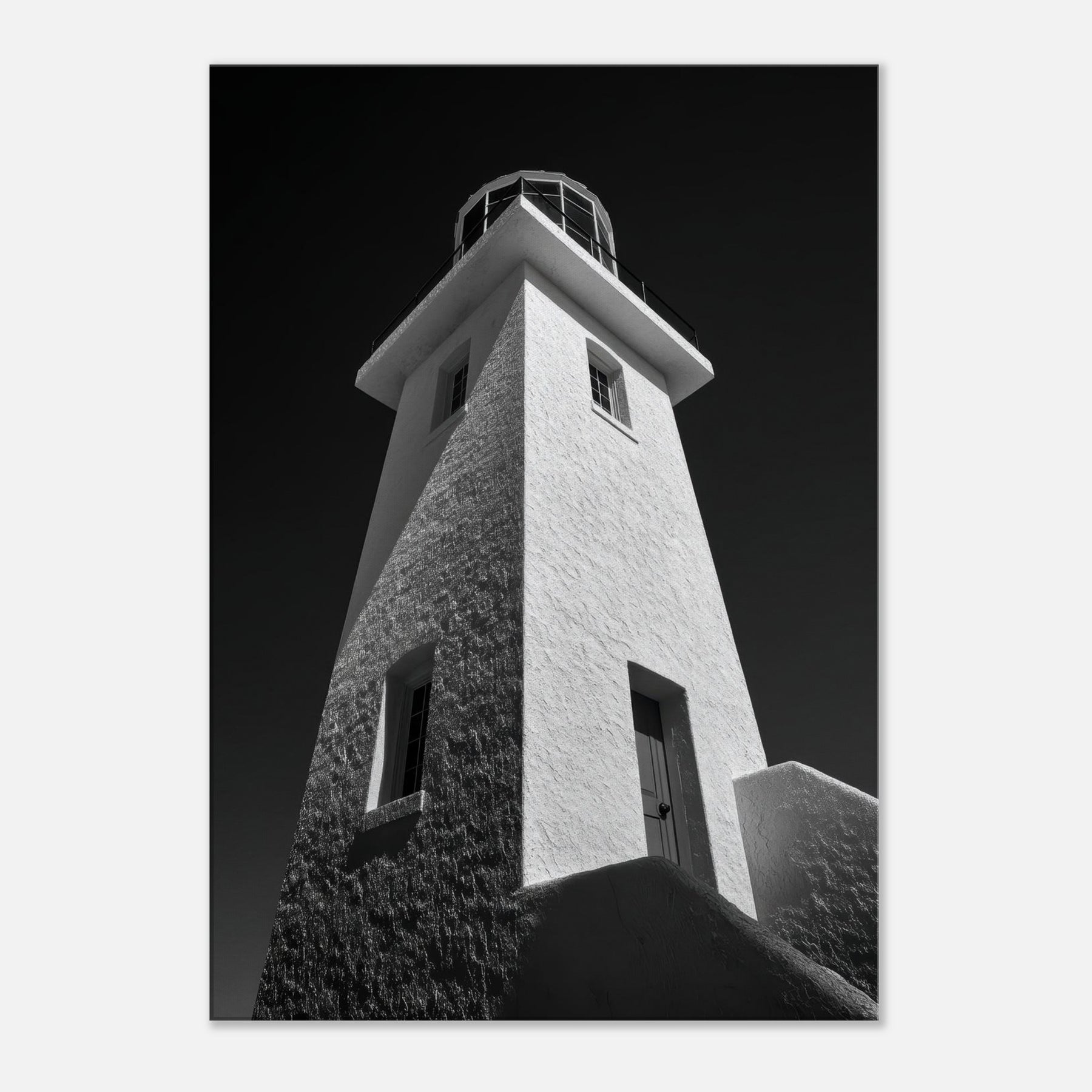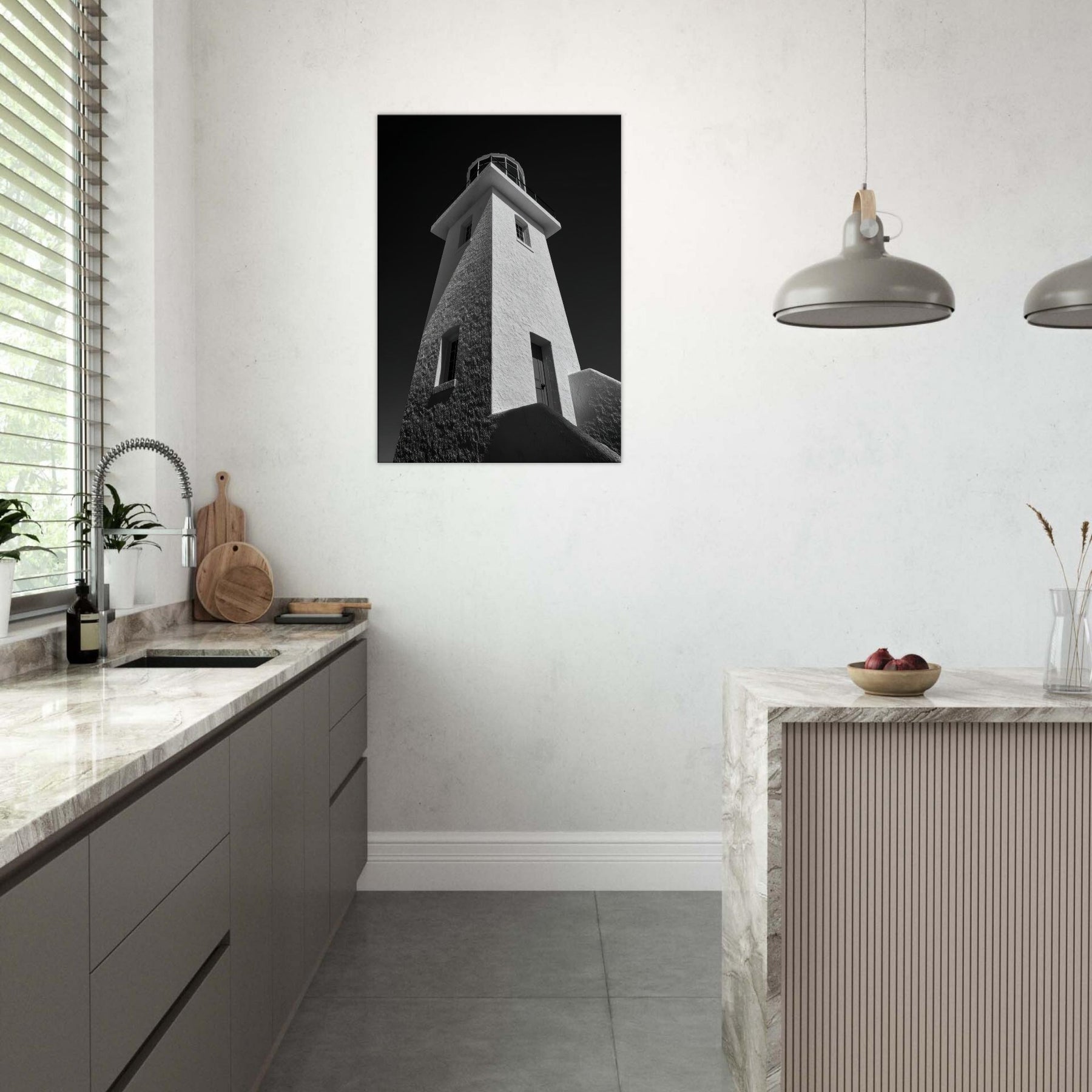 Stand tall against the horizon, the Lighthouse rises in stark relief as if etched in light itself. The black and white contrast renders the coastline into sculpted shadows, inviting calm into any room.
