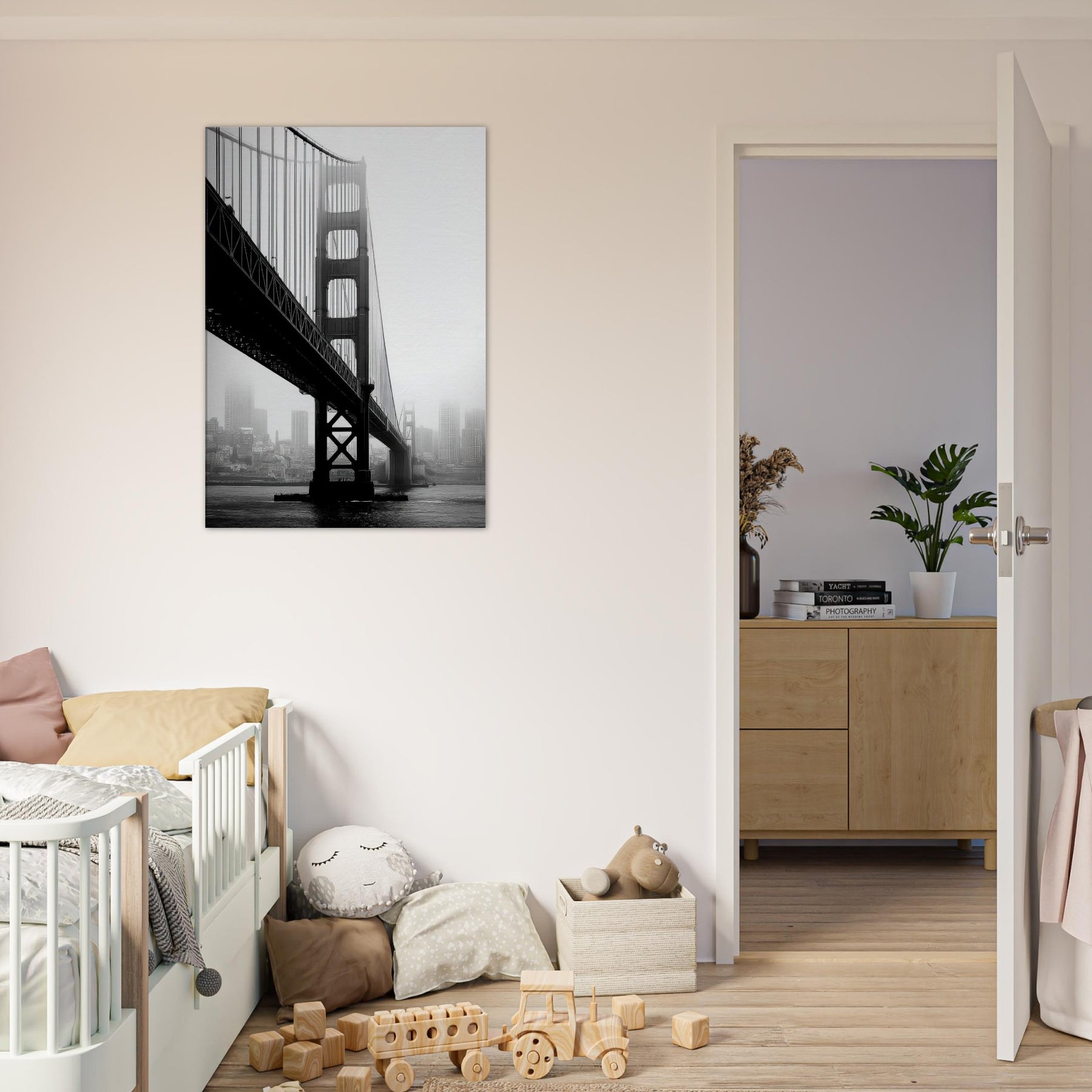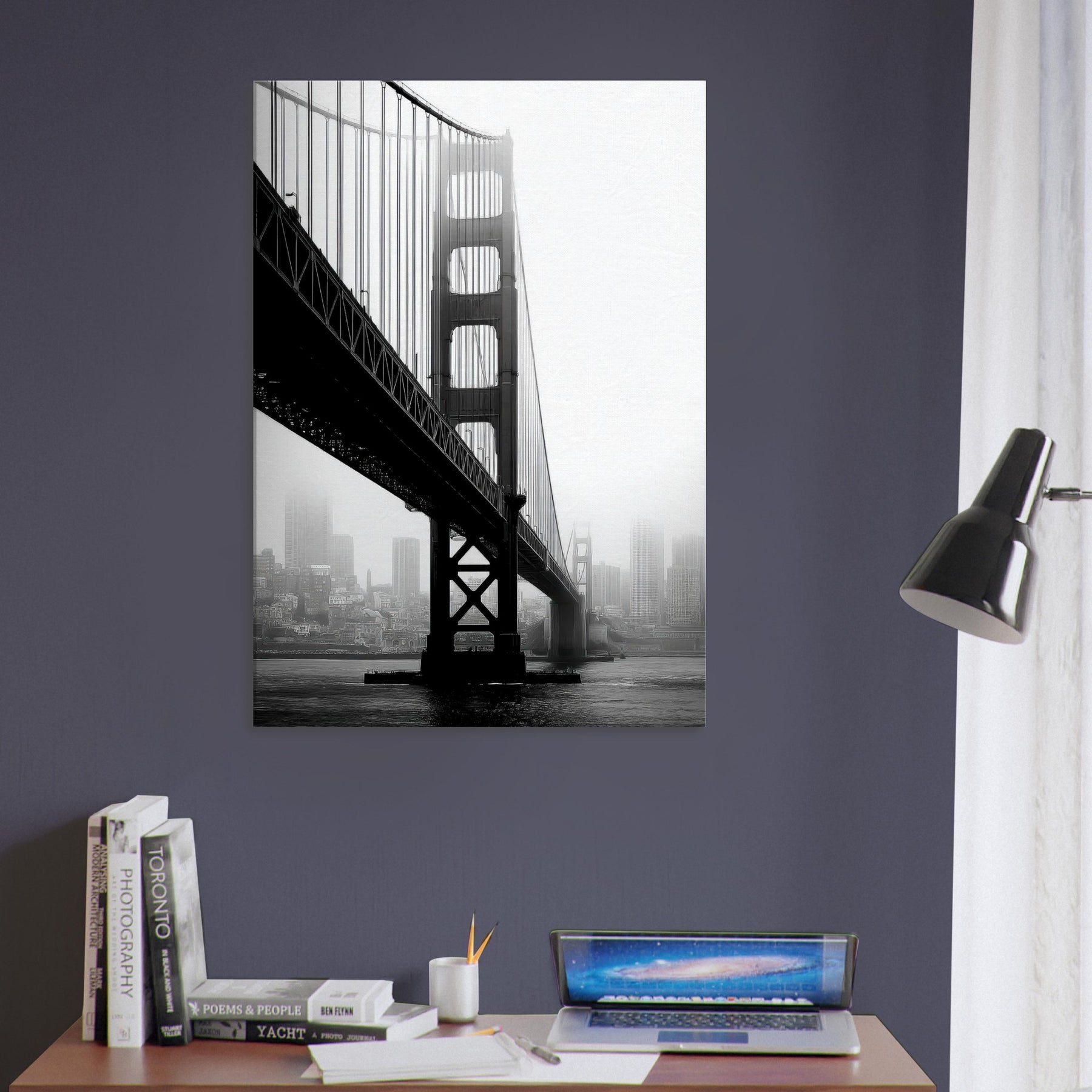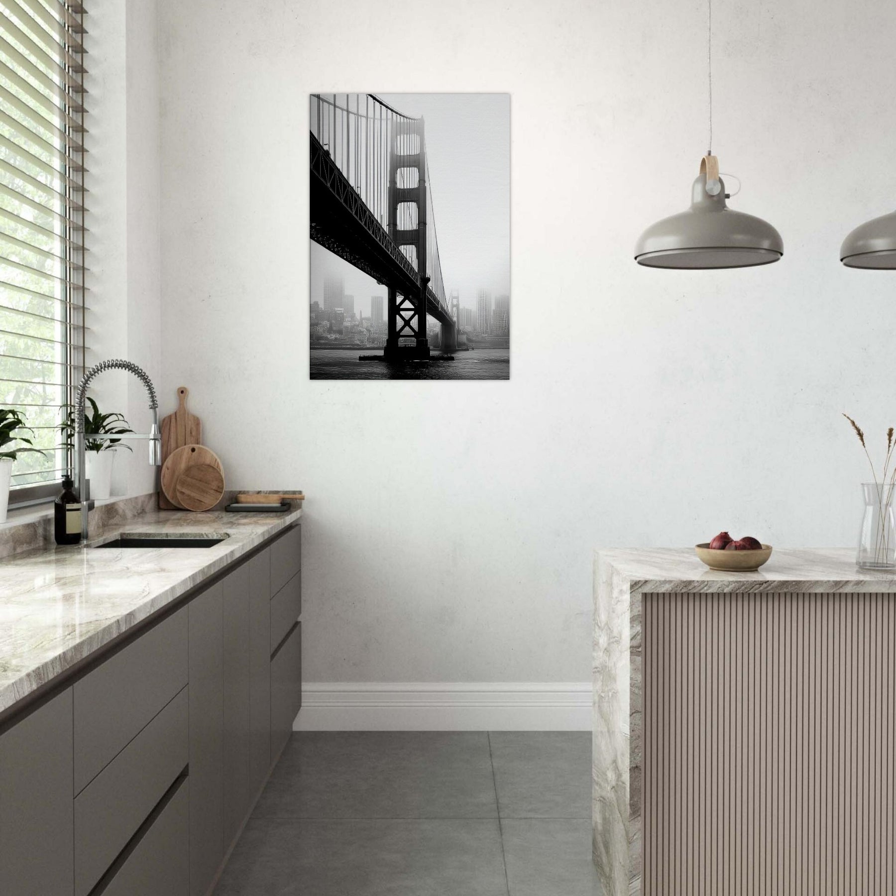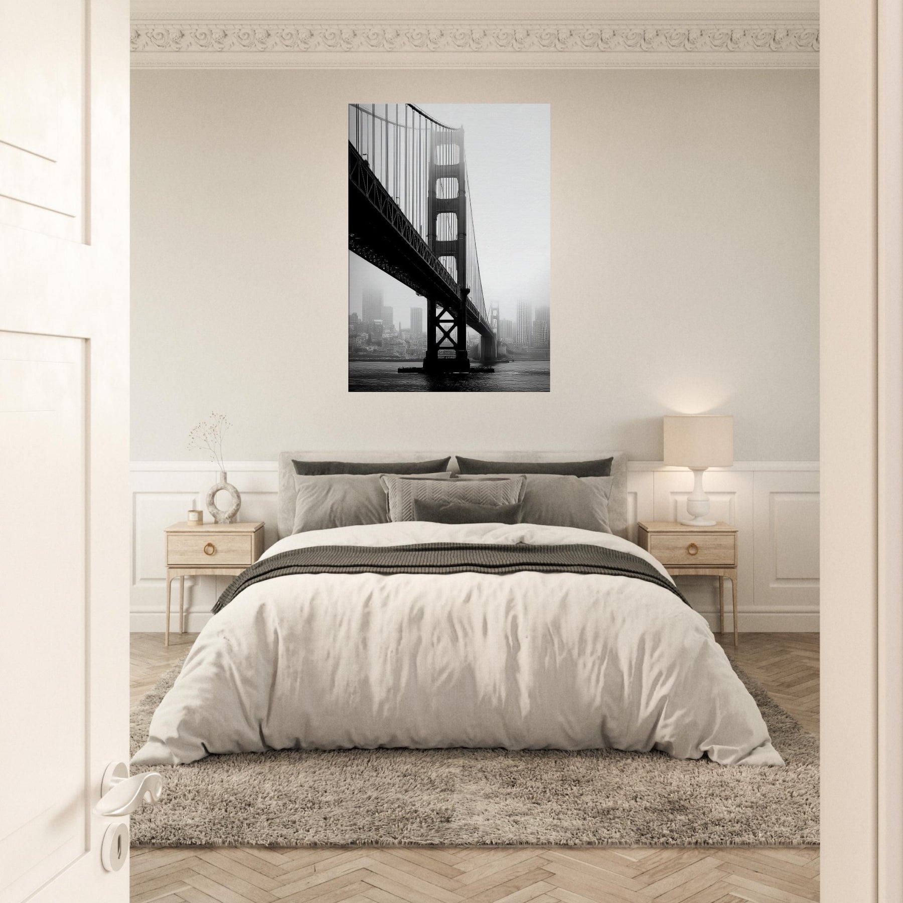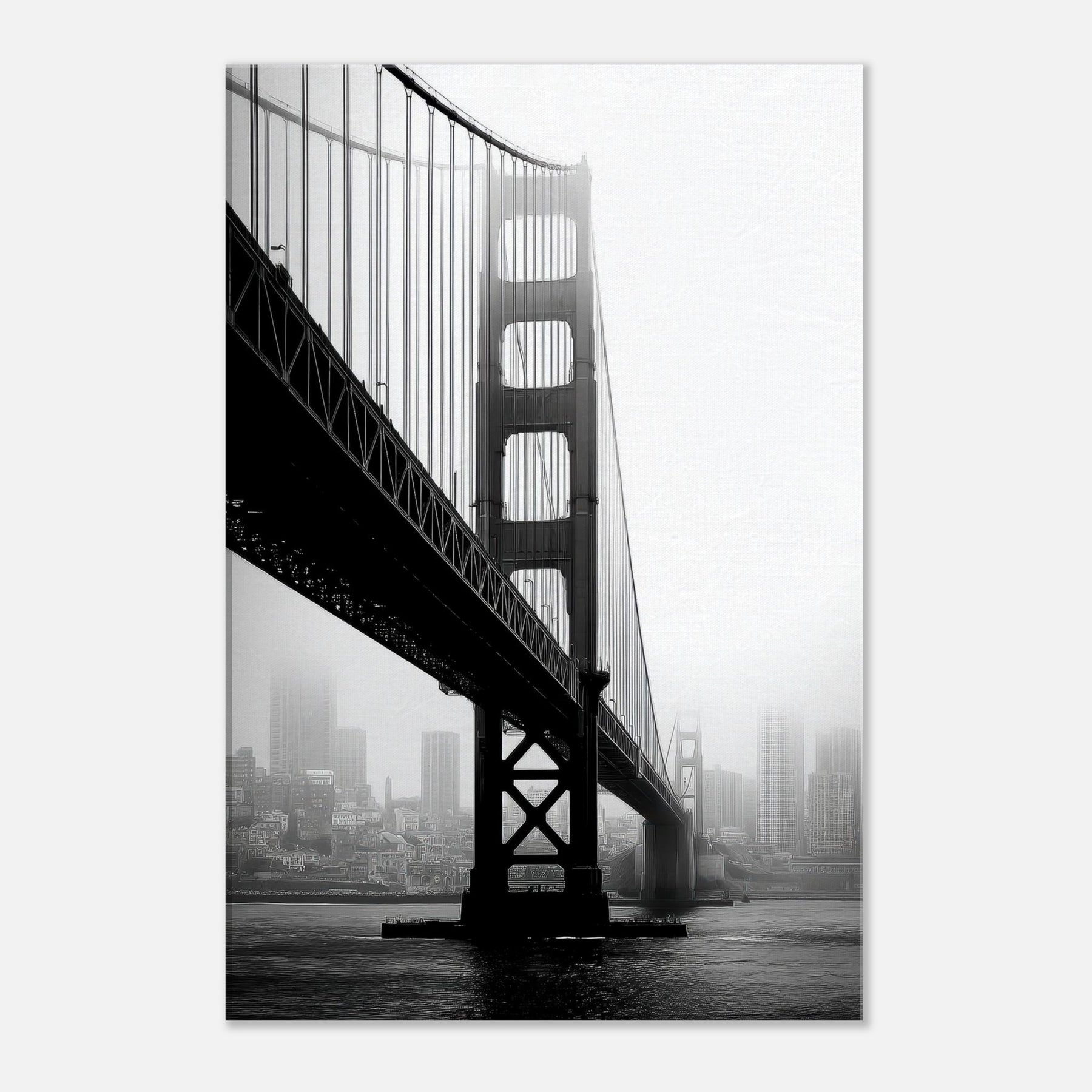 An elegant study of famous bridges, this black and white print renders Golden Gate and Tower Bridge as poised silhouettes against a mist soft cityscape.