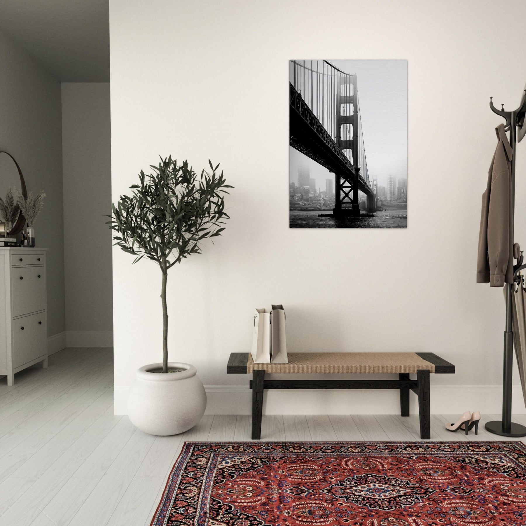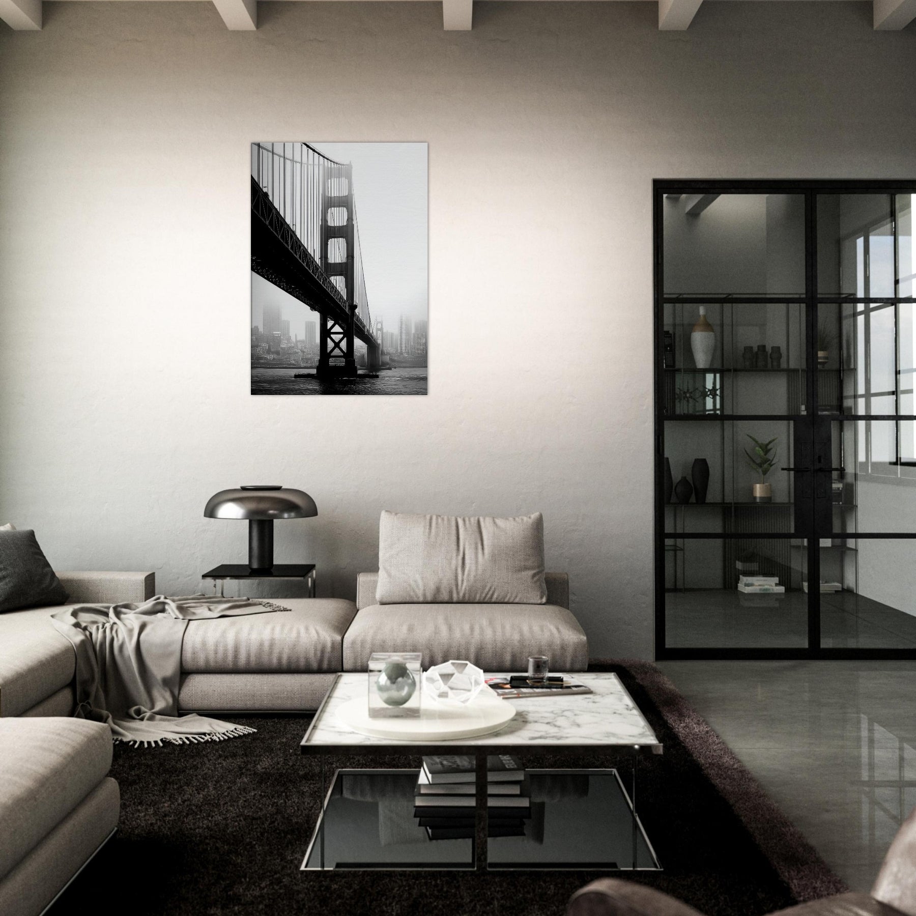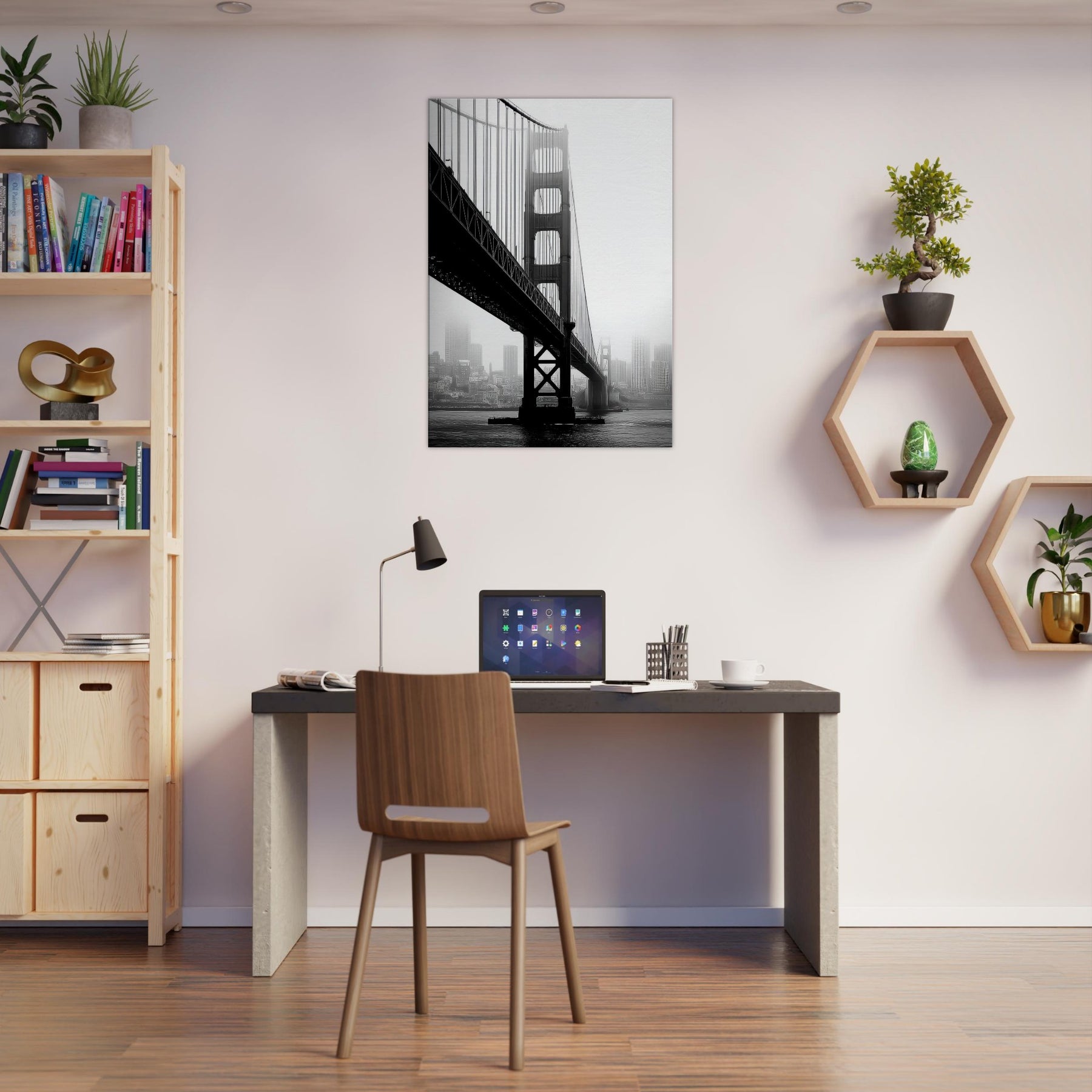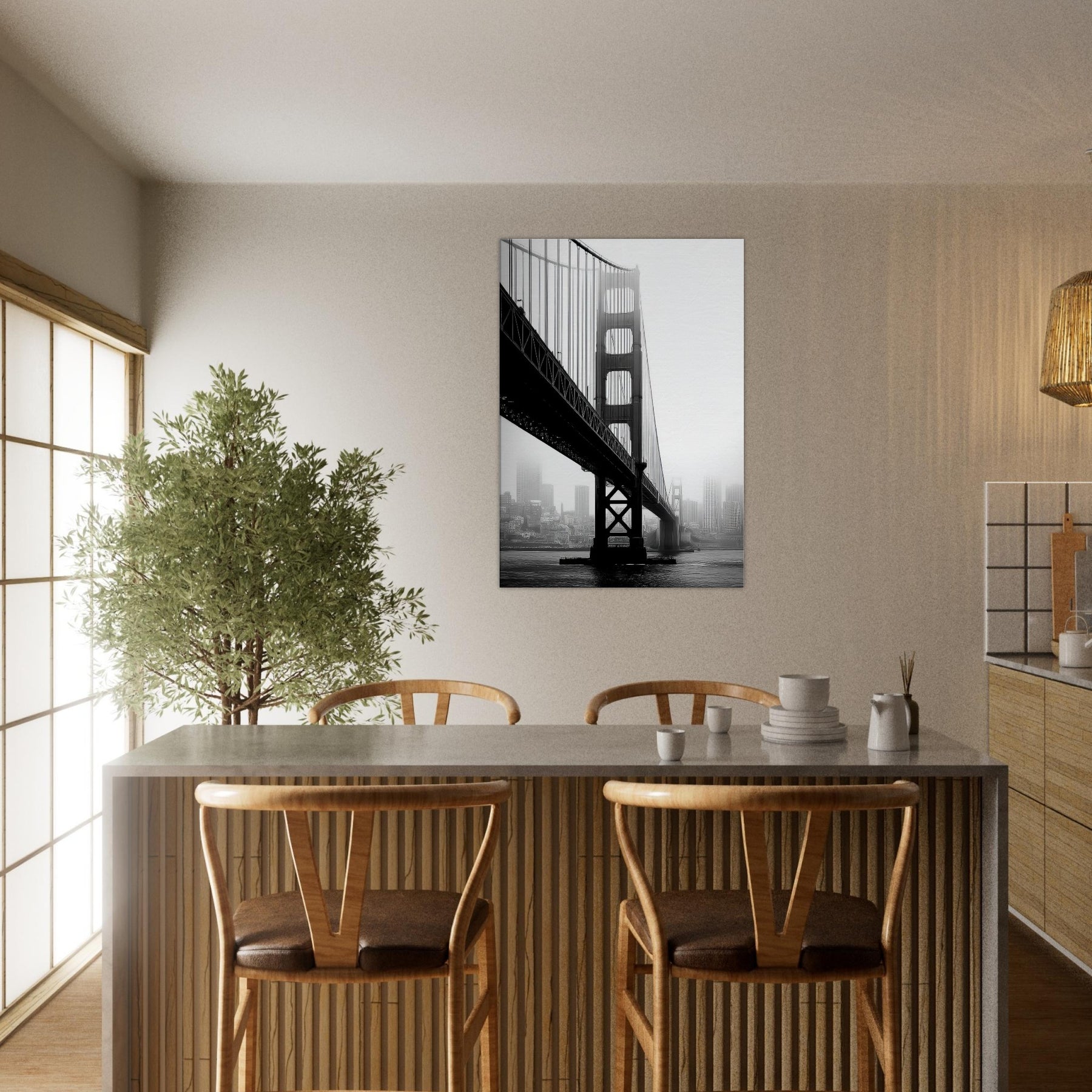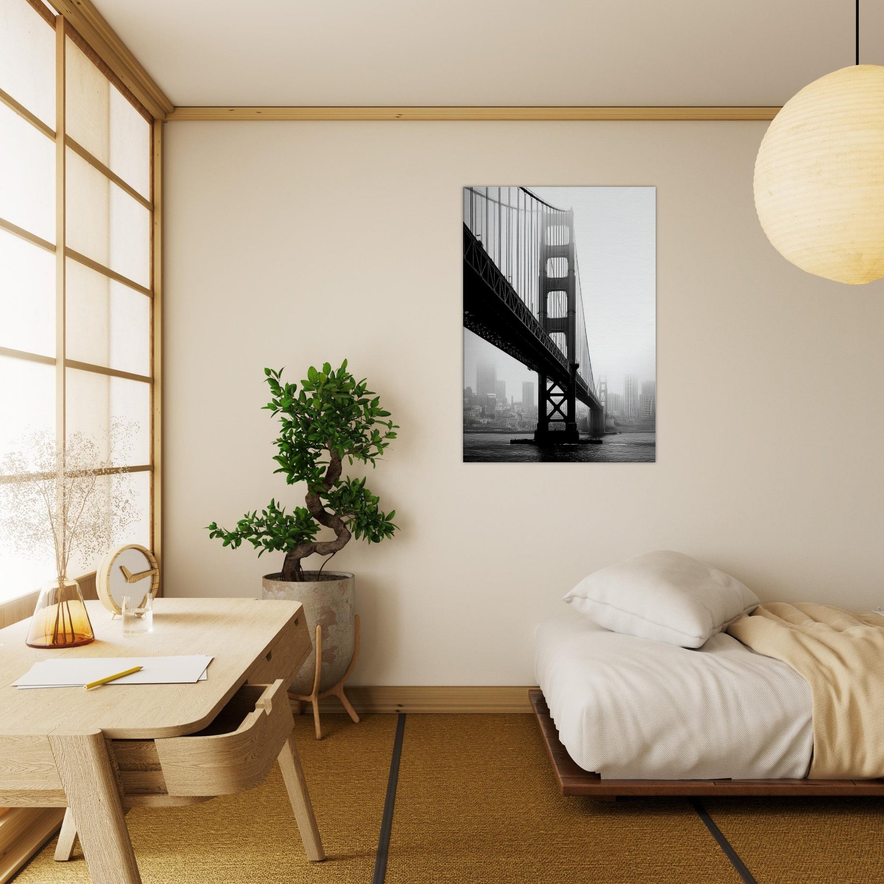 An elegant study of famous bridges, this black and white print renders Golden Gate and Tower Bridge as poised silhouettes against a mist soft cityscape.