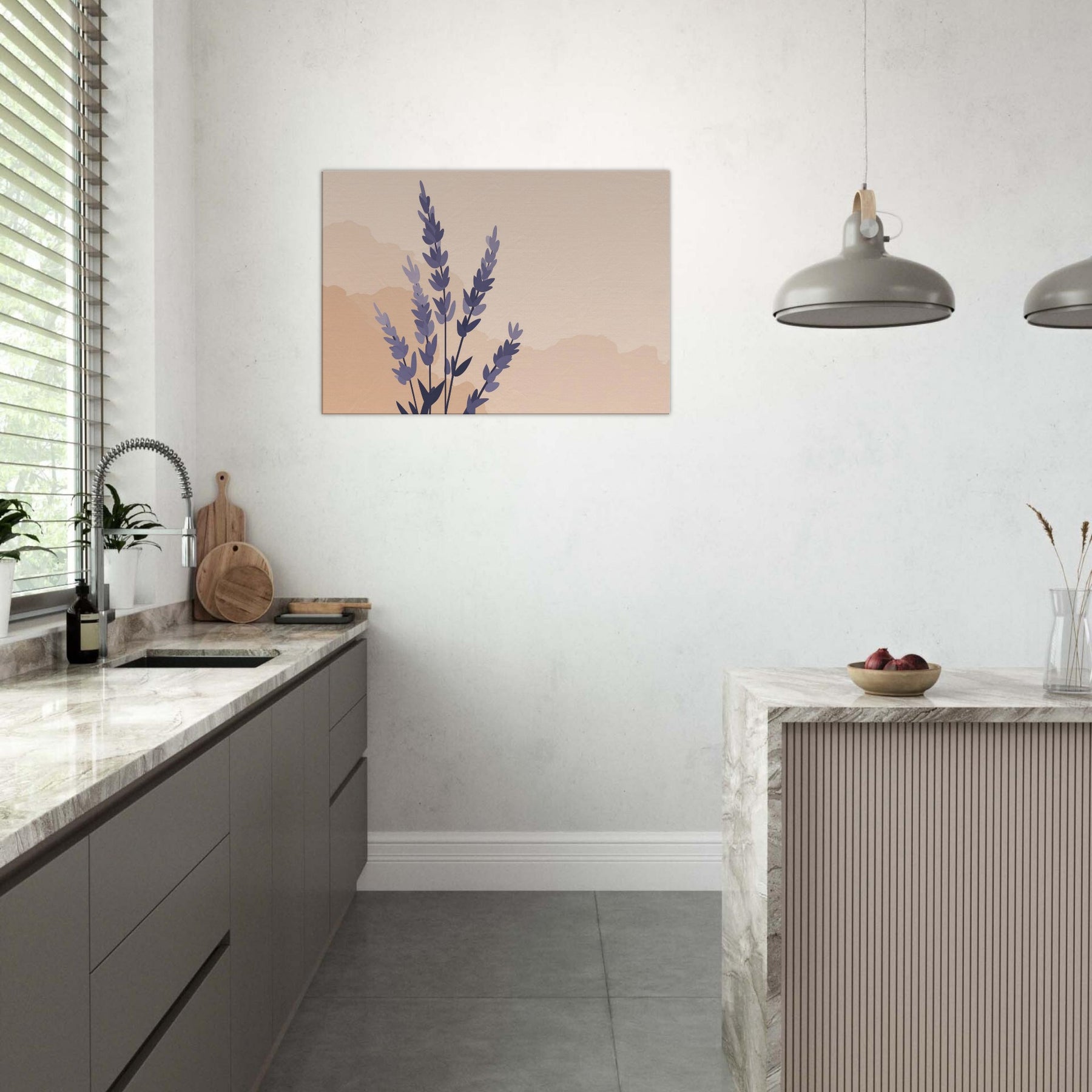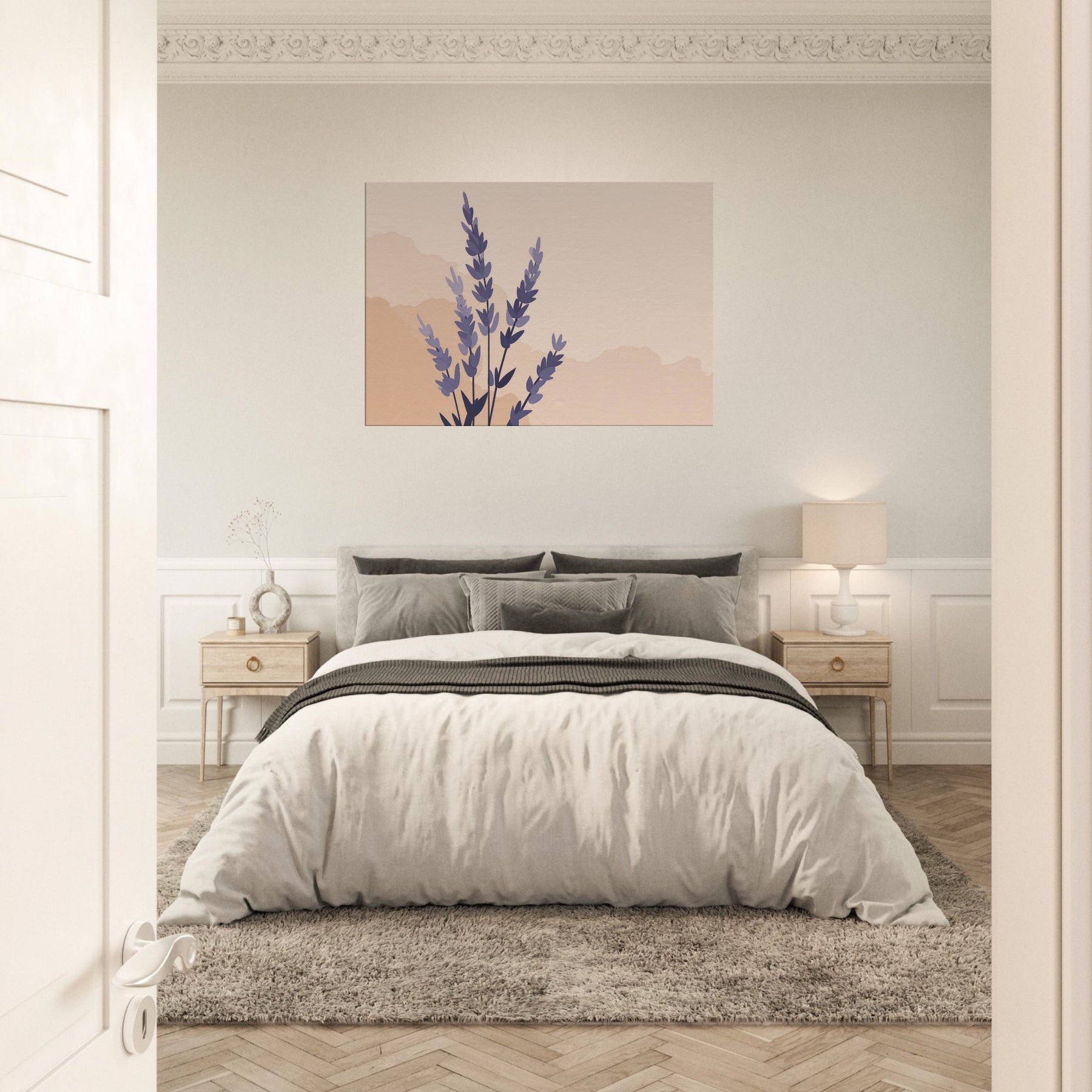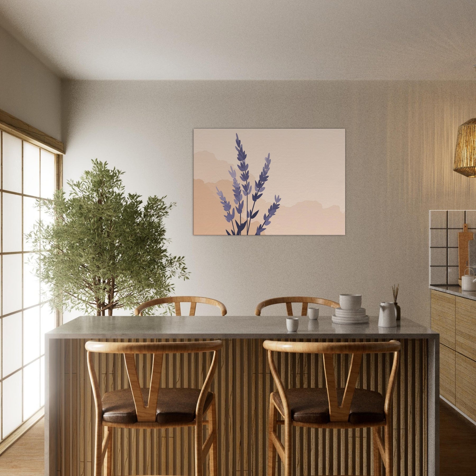 From the soft peach backdrop to the precise, unworried lavender stems, this minimalist study invites quiet contemplation. The absence of detail slows time, letting your space breathe with scent of fields and dusk. The Primary Subject Lavender anchors the composition, its lilac tones and clean lines echoing the calm rhythm of nature. Ideal for a living room or bedroom, it adds serenity, clarity, and a warm, atmospheric glow that elevates everyday moments.