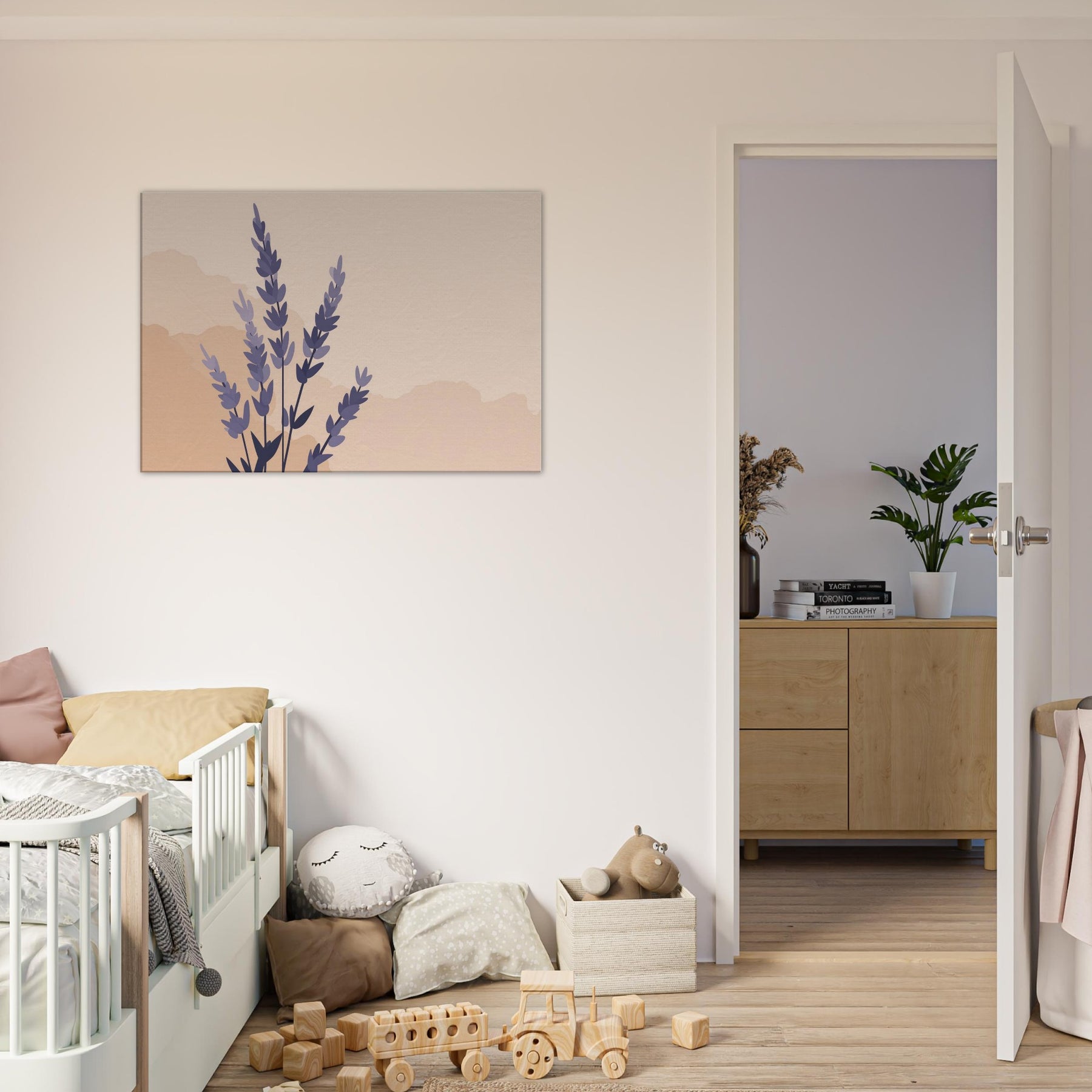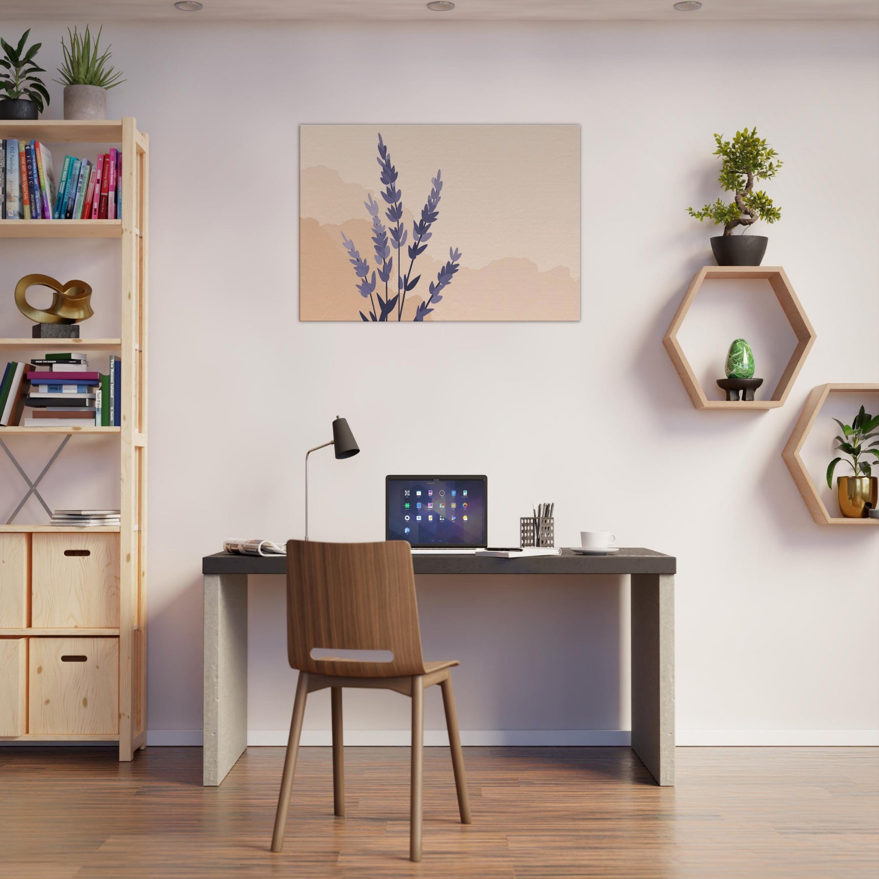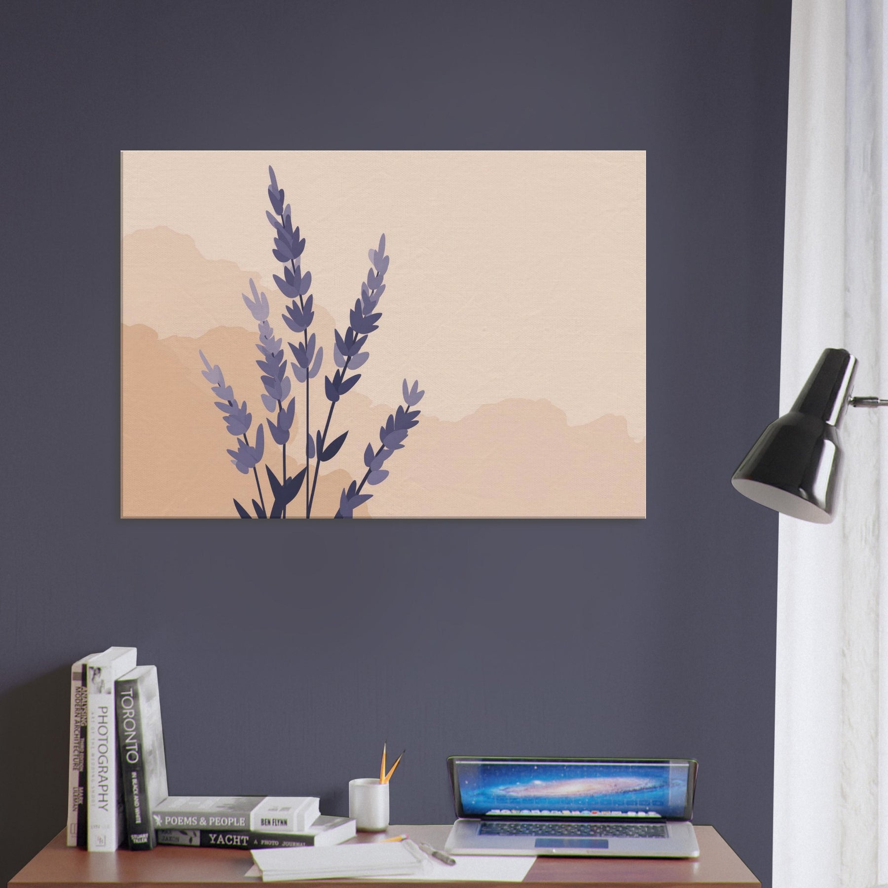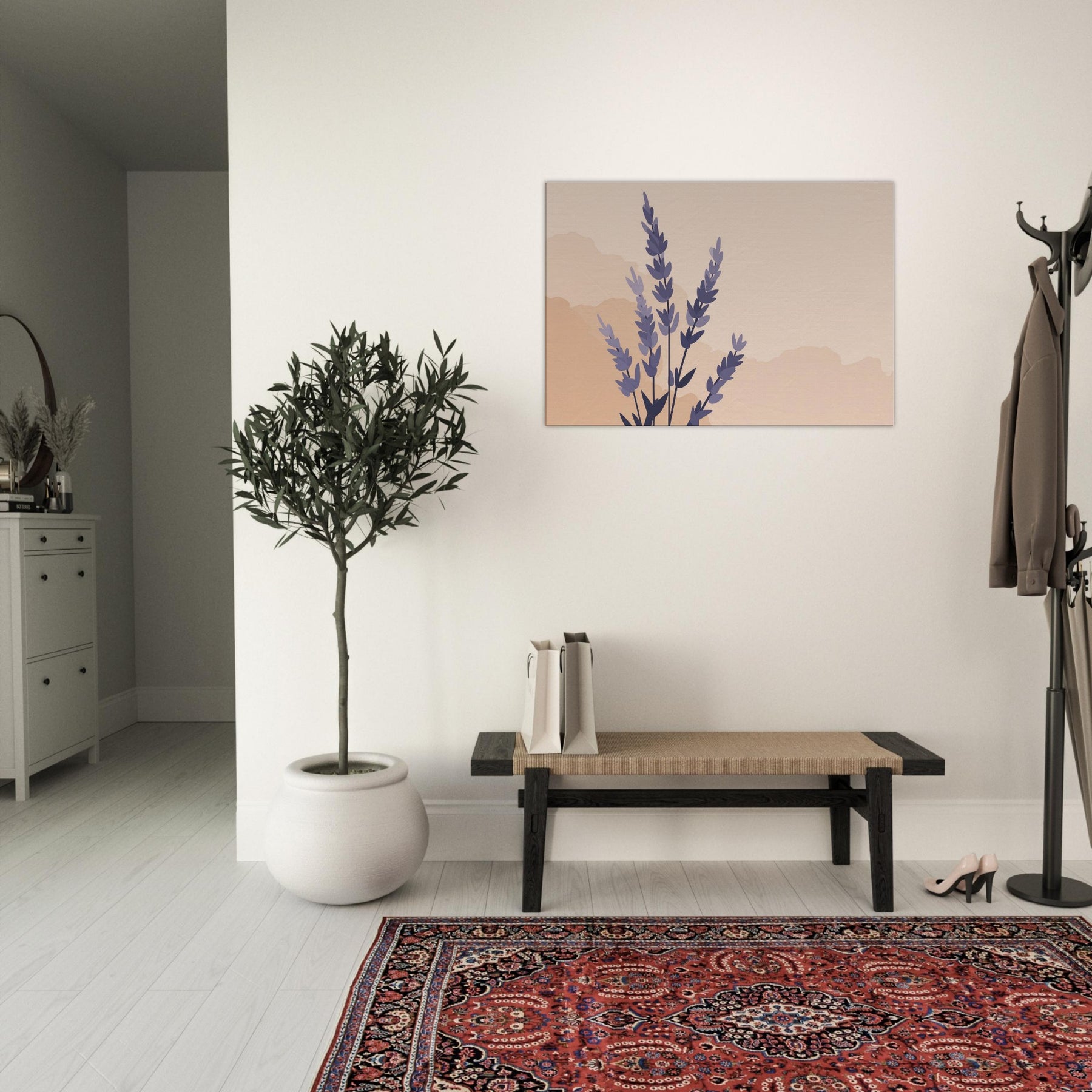From the soft peach backdrop to the precise, unworried lavender stems, this minimalist study invites quiet contemplation. The absence of detail slows time, letting your space breathe with scent of fields and dusk. The Primary Subject Lavender anchors the composition, its lilac tones and clean lines echoing the calm rhythm of nature. Ideal for a living room or bedroom, it adds serenity, clarity, and a warm, atmospheric glow that elevates everyday moments.