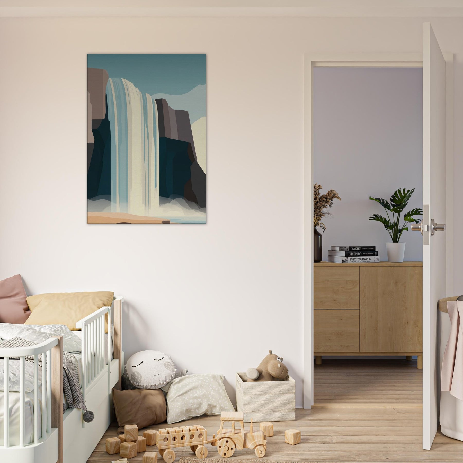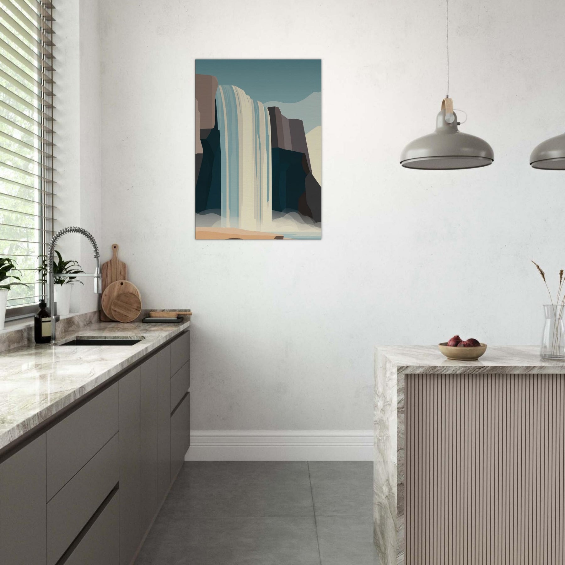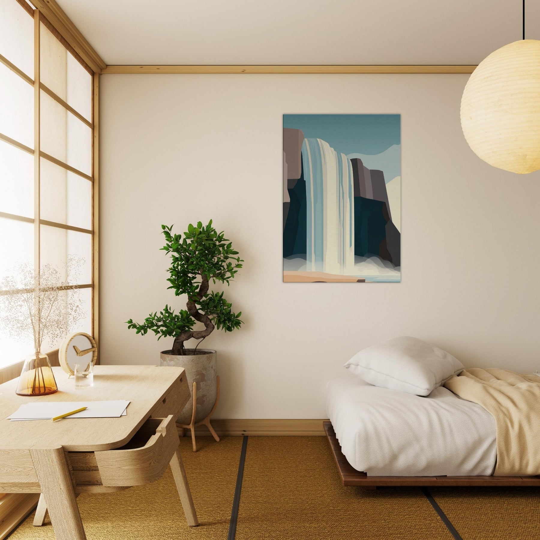 Waterfall spills in a breath of pale light, turning rugged cliffs into a quiet moment of grace. This minimalist composition renders nature in soft planes and cool tones, inviting the room to exhale and slow down. Imagine the hush of cascading water translated into color, the mist brushing the air, and a horizon that anchors the space with serene balance. Placed above a sofa or in a reading nook, it brings clarity, depth, and a nature infused stillness that makes everyday moments feel poised and calm.