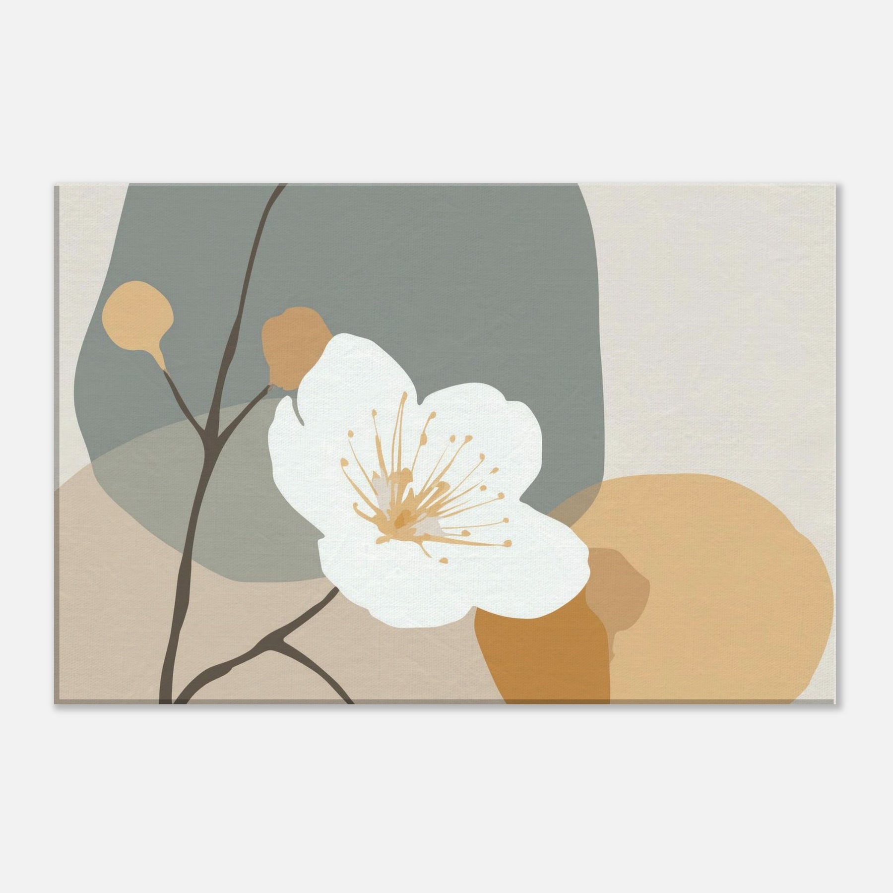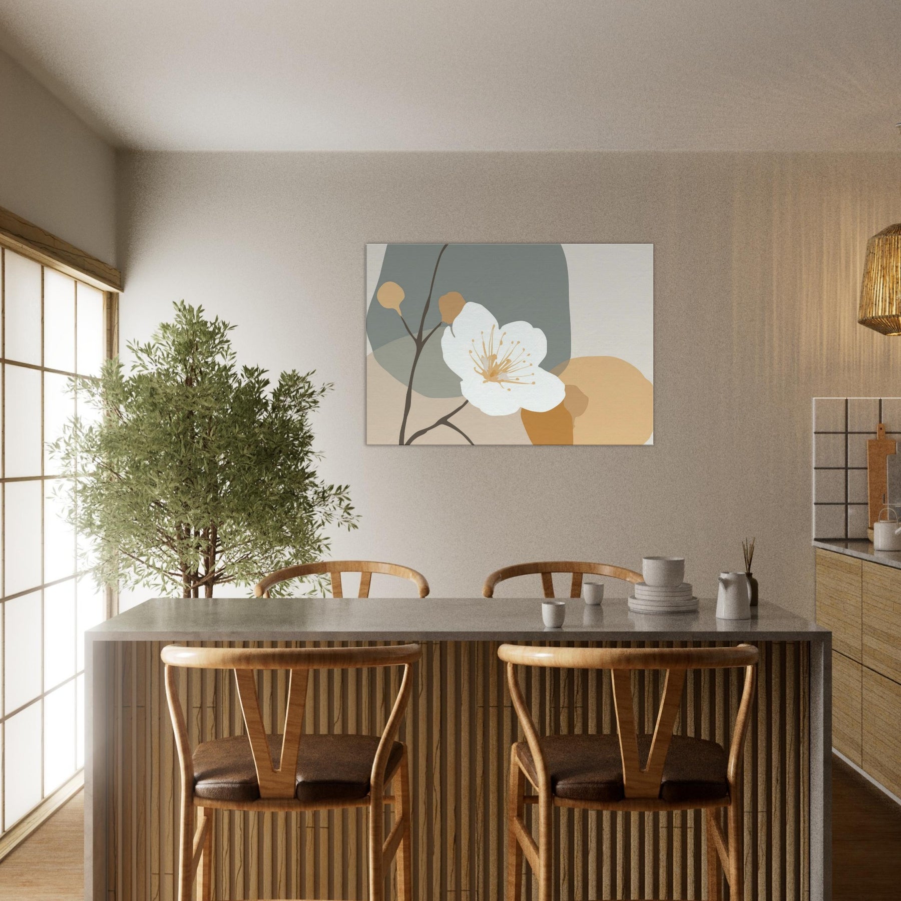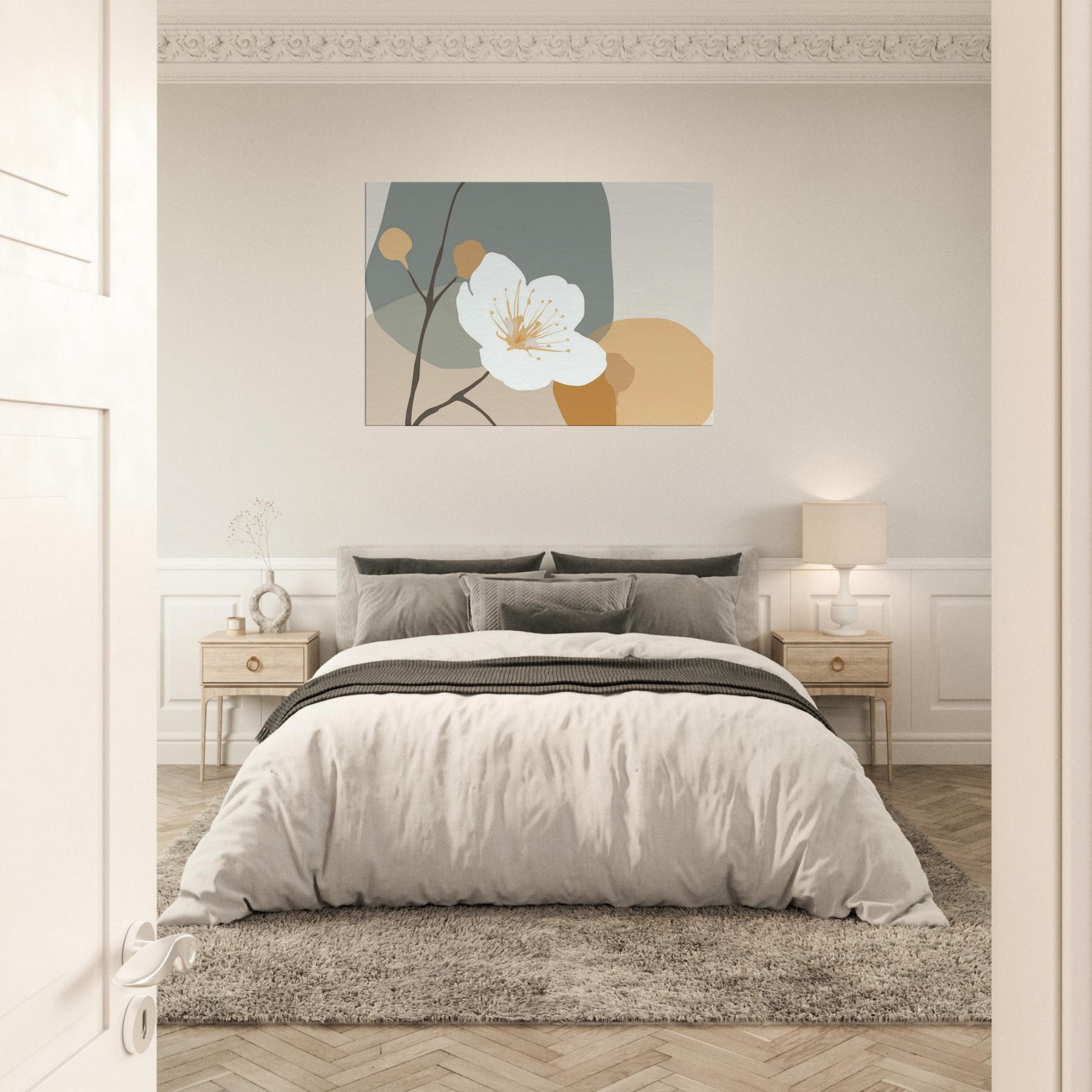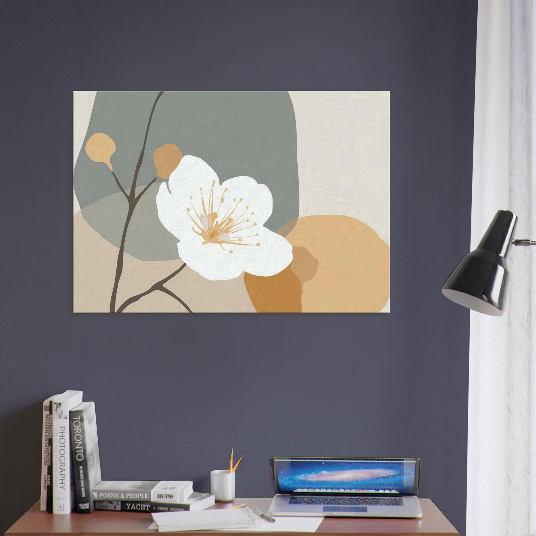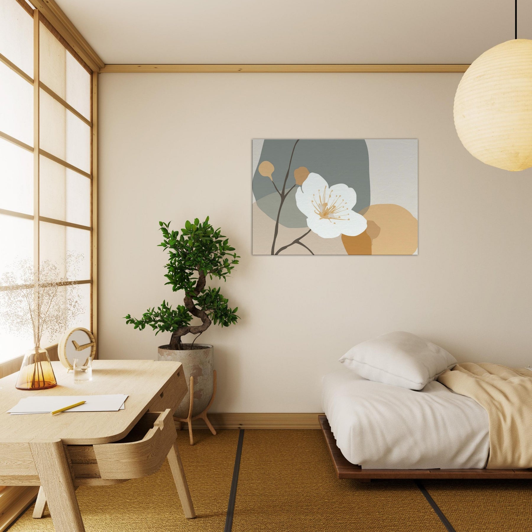 Embrace quiet elegance with this Cherry Blossom study in soft, overlapping shapes. The minimalist composition invites the eye to rest on a single white bloom, its warm amber stamen catching the light of everyday living spaces. Subdued earth tones mingle with gentle taupes to create a serene atmosphere that feels both modern and timeless. This piece elevates a wall with a breath of nature, transforming hallways, bedrooms, or living areas into a calm sanctuary.