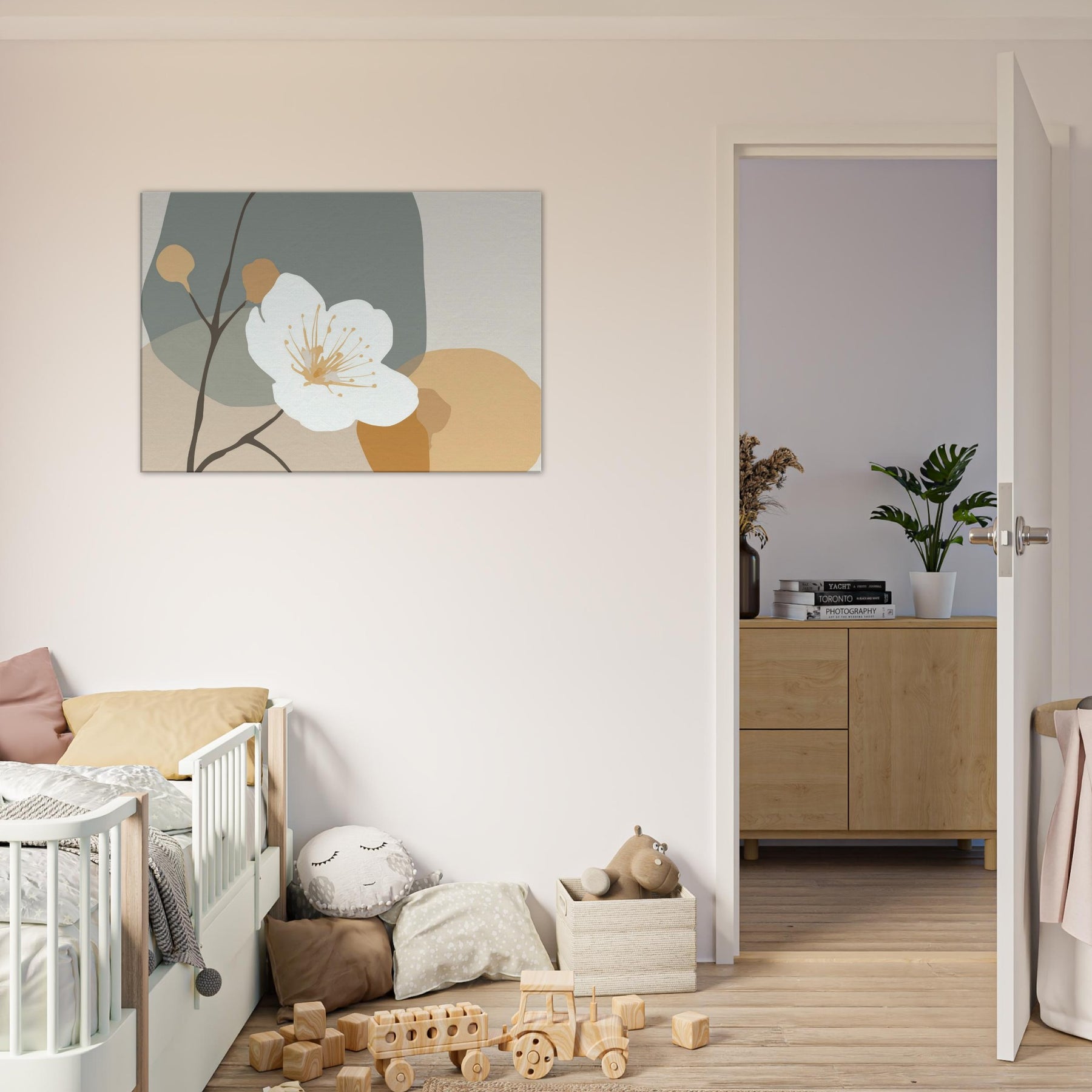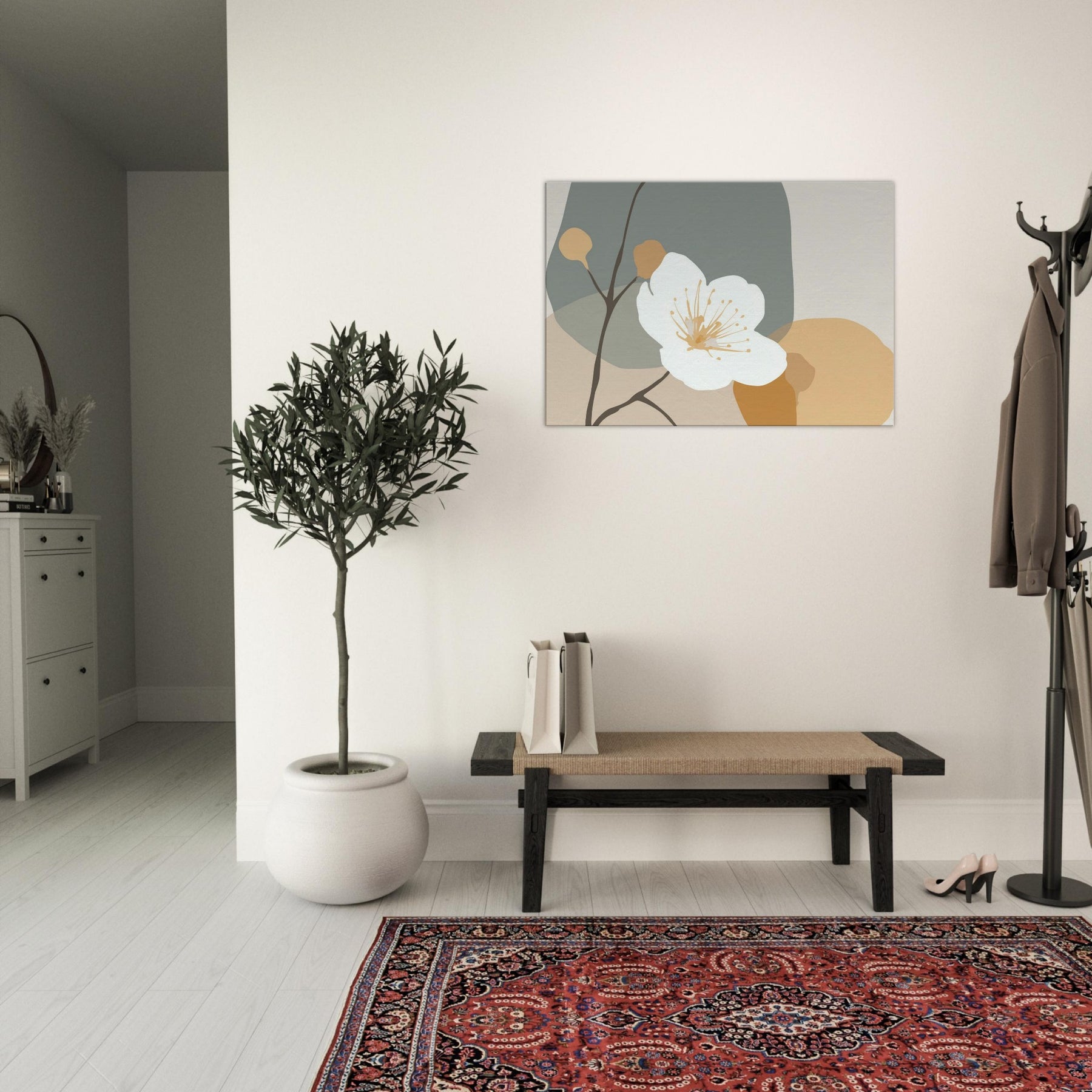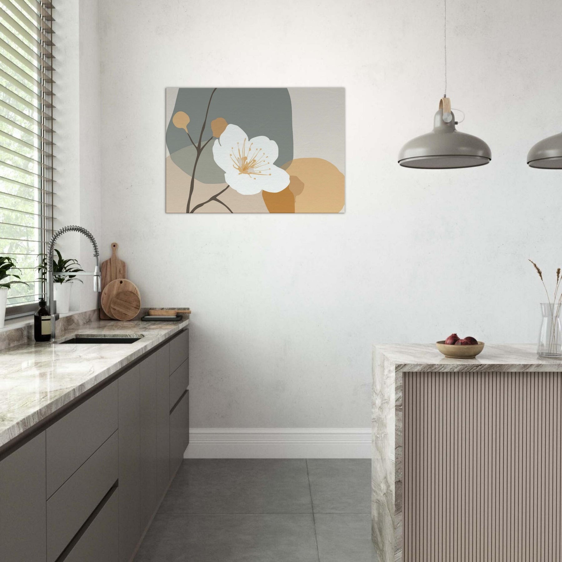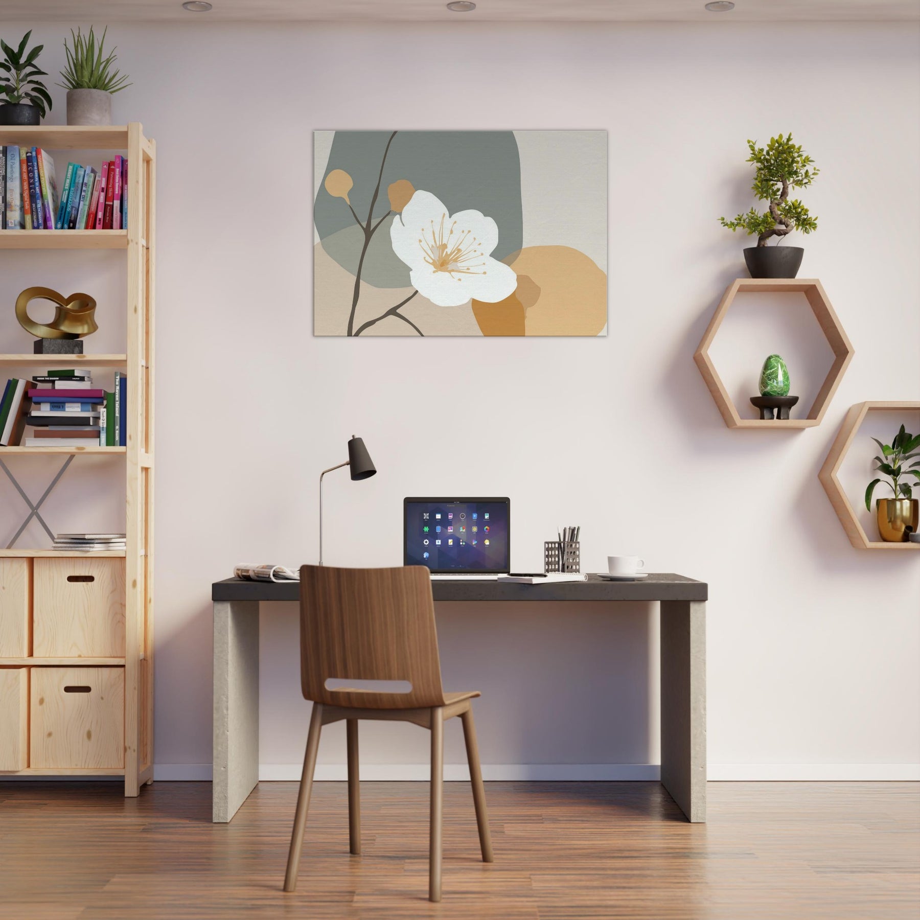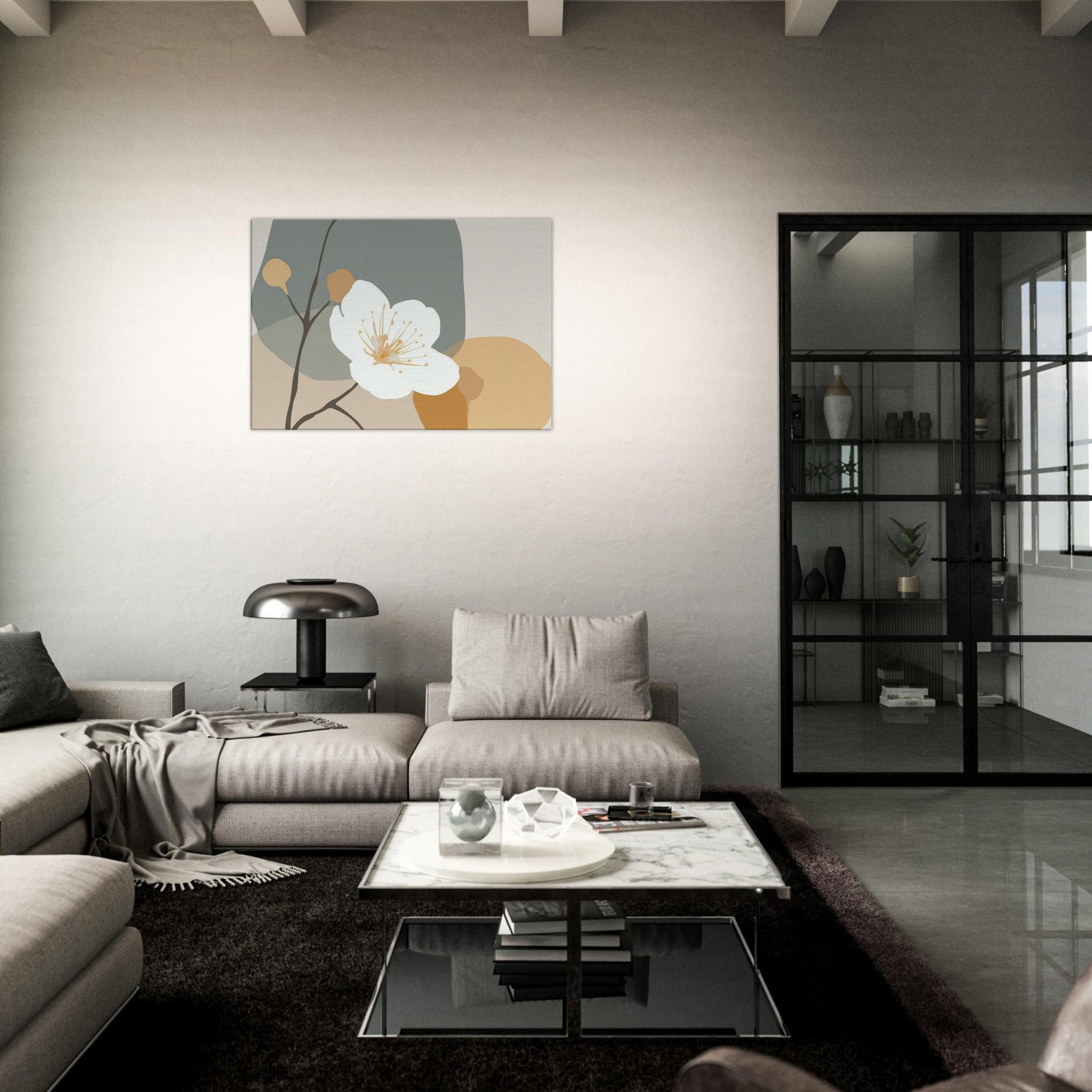 Embrace quiet elegance with this Cherry Blossom study in soft, overlapping shapes. The minimalist composition invites the eye to rest on a single white bloom, its warm amber stamen catching the light of everyday living spaces. Subdued earth tones mingle with gentle taupes to create a serene atmosphere that feels both modern and timeless. This piece elevates a wall with a breath of nature, transforming hallways, bedrooms, or living areas into a calm sanctuary.