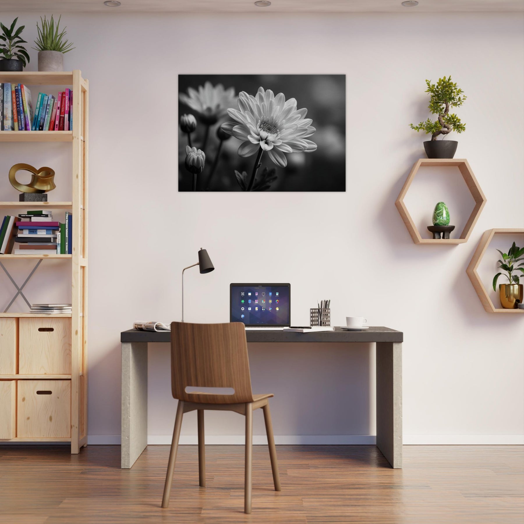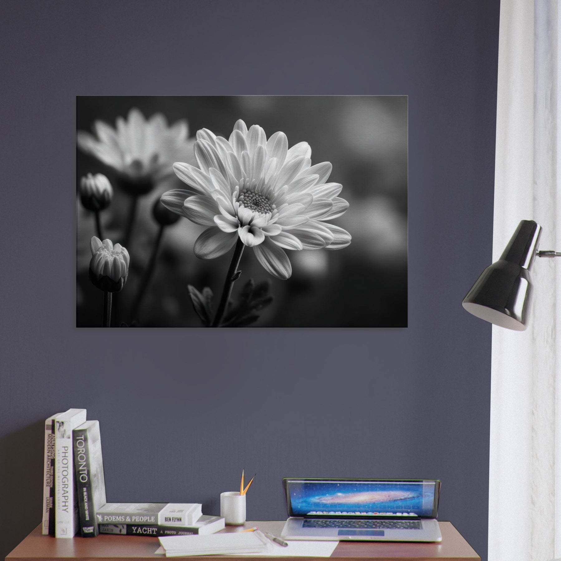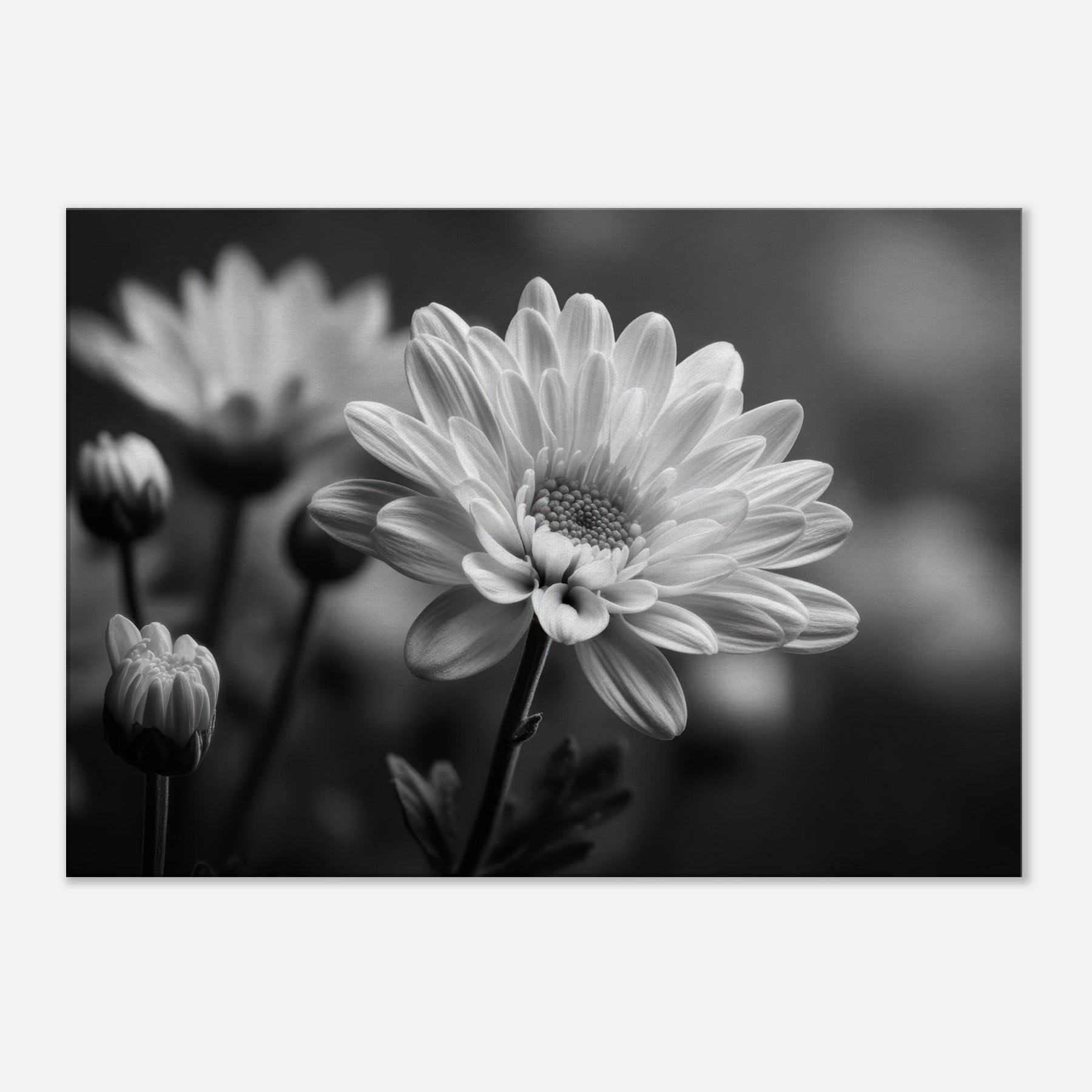 Capture a quiet breath of nature in monochrome with this Chrysanthemum study. The petals unfold in soft gradients of light and shadow, lending a serene rhythm to any room.