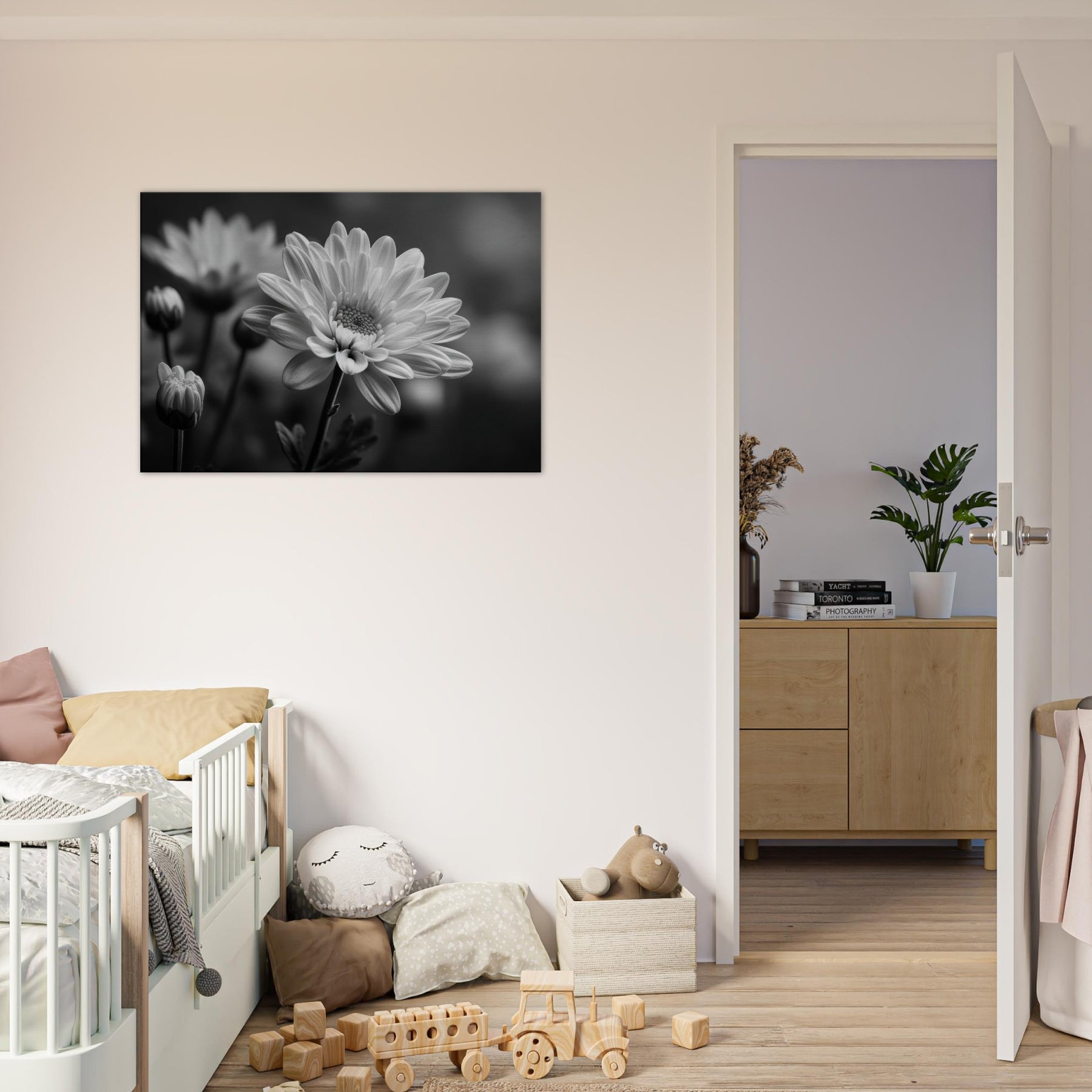 This black and white bloom evokes timeless elegance, turning a bare wall into a contemplative corner perfect for a living room, hallway, or bedroom. The subtle textures invite touch via the eye, while the composition creates depth and calm. A refined focal point that enhances atmosphere without overpowering, it invites guests to linger and savor stillness.