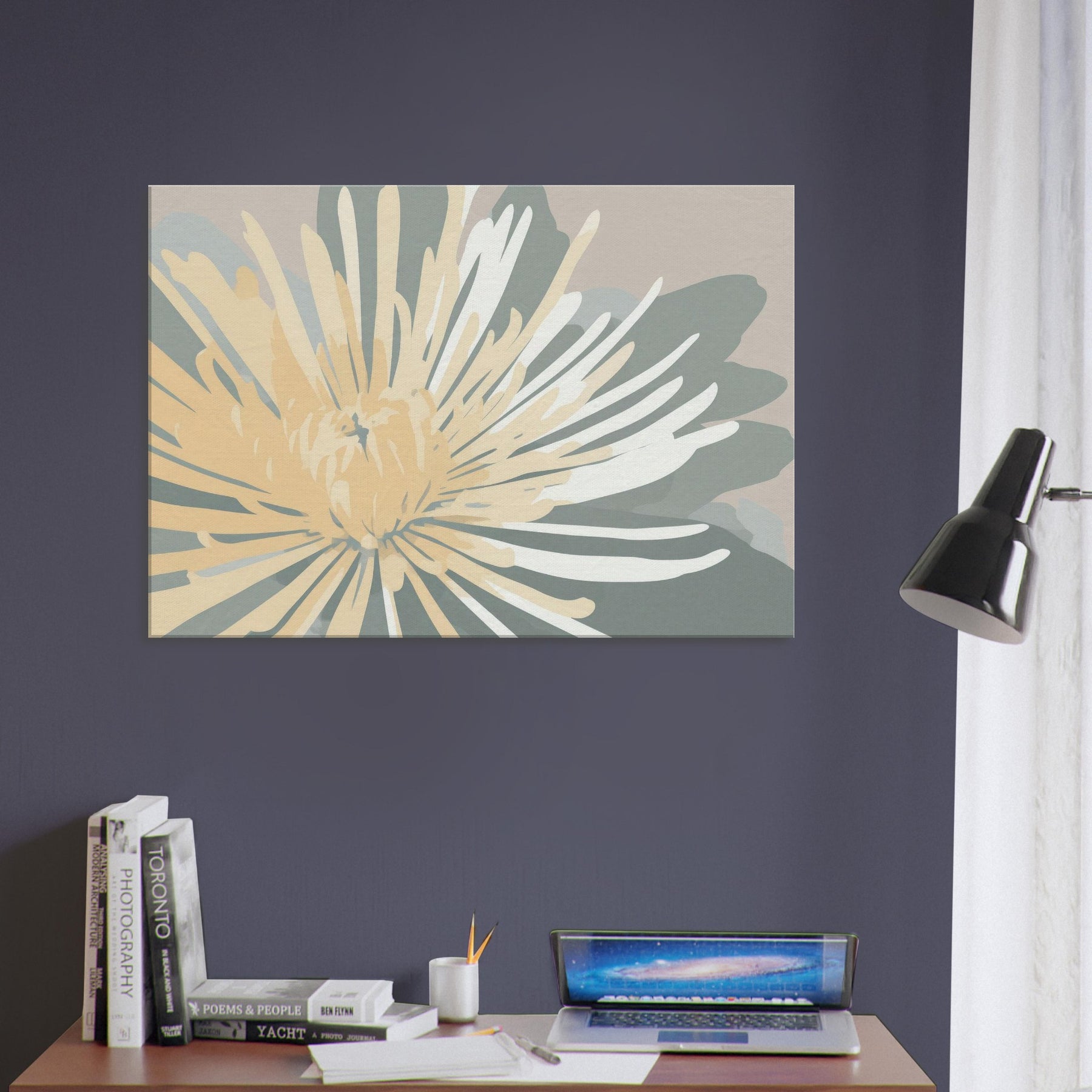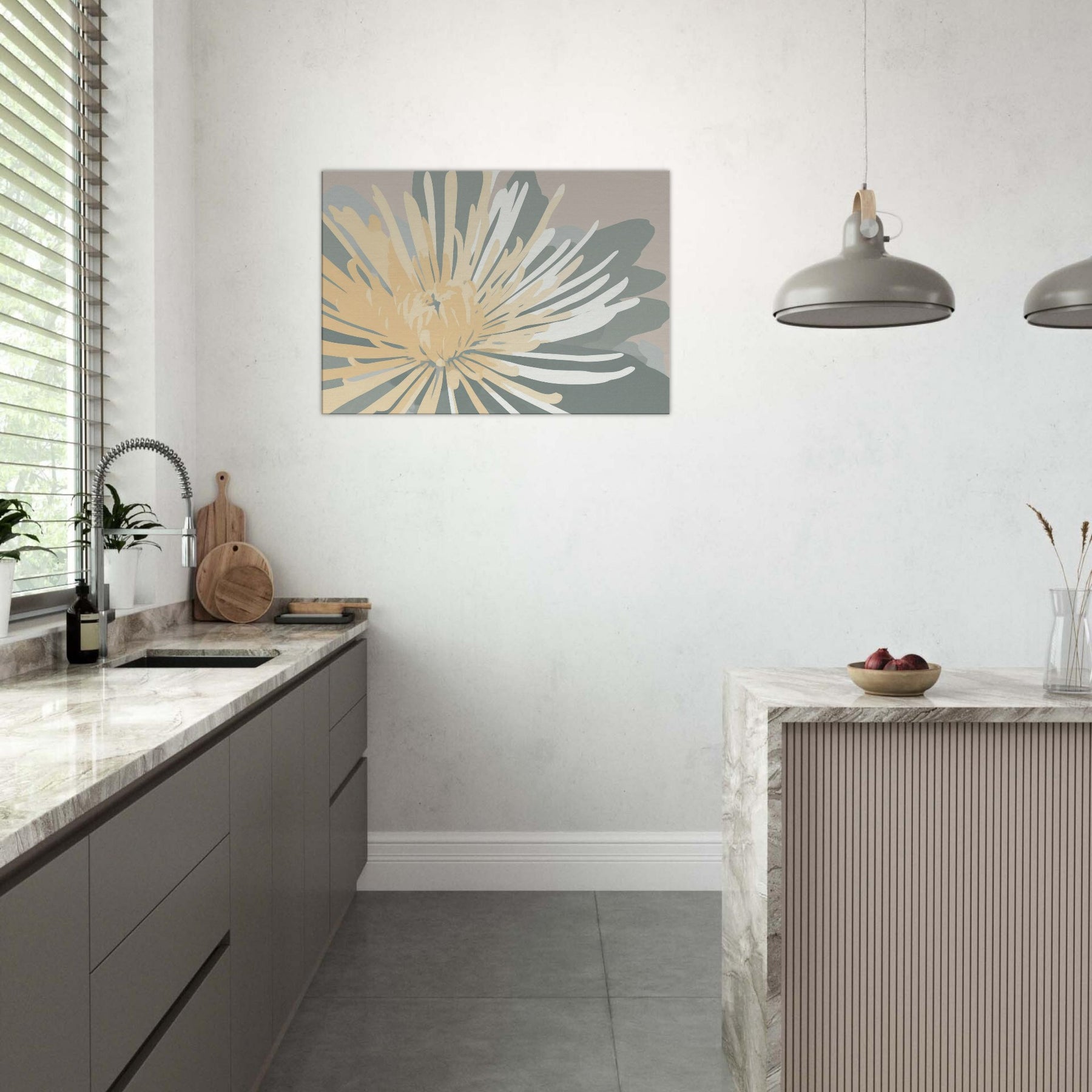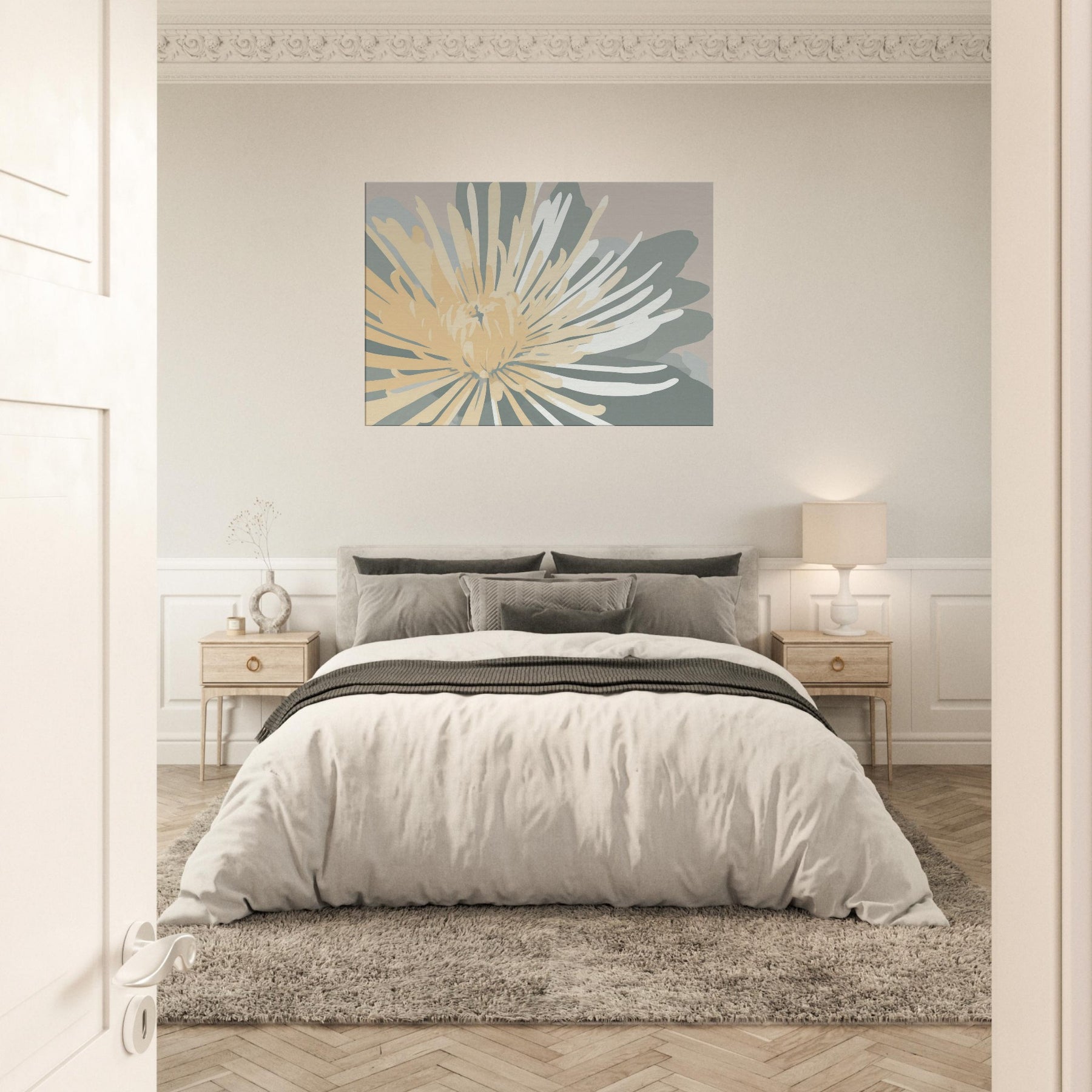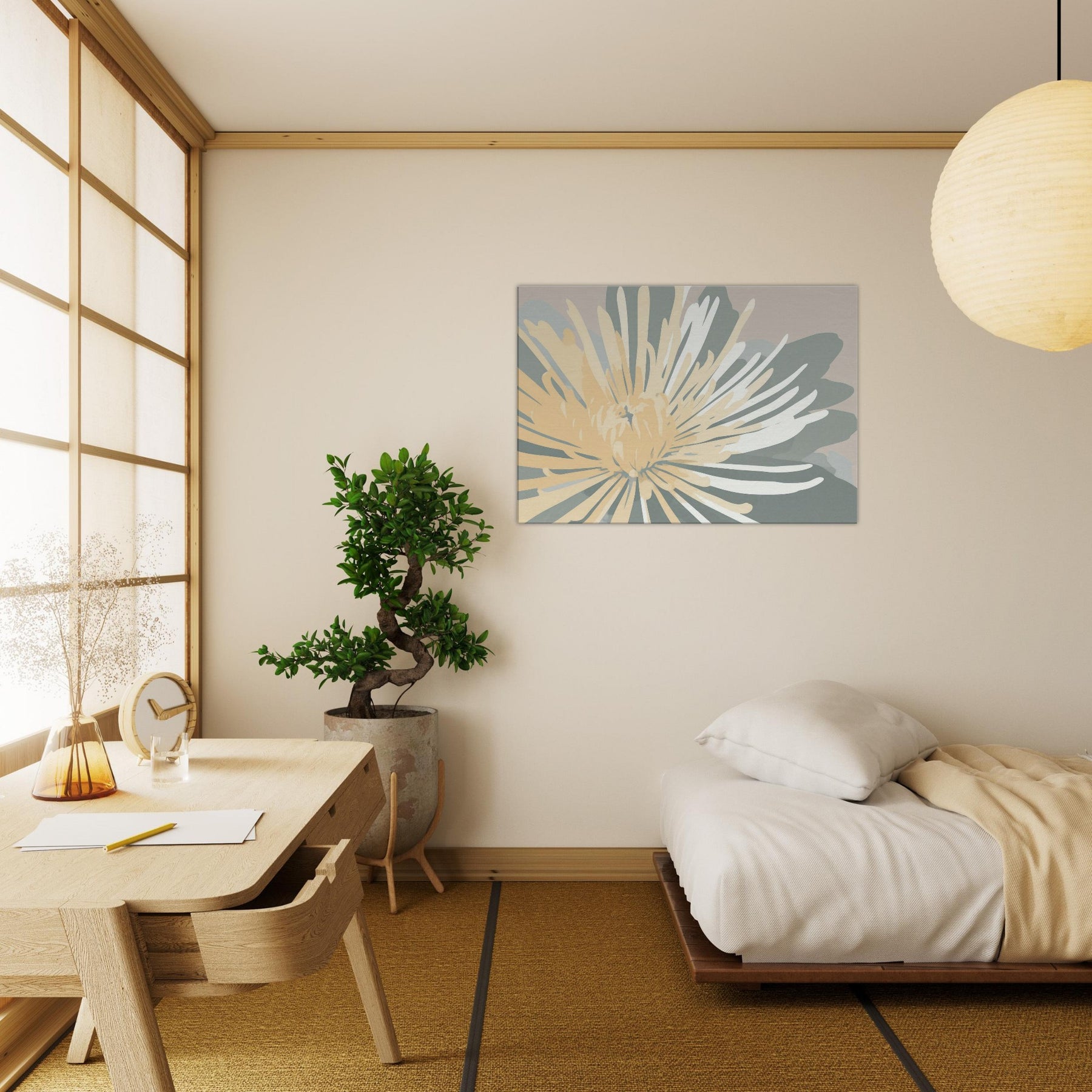 Like a breath of quiet morning light, this minimalist depiction of a chrysanthemum invites calm into any room. Subtle petals unfurl in soft earth tones, creamy ivories, warm sand, and muted sage, ethereal yet grounded. The clean silhouettes create space for reflection, while the gentle contrast hints at nature's resilience. Hang it where conversation lingers or where stillness is desired, and let the Chrysanthemum anchor the mood, a timeless focal point that makes living spaces feel open, serene, and effortless.