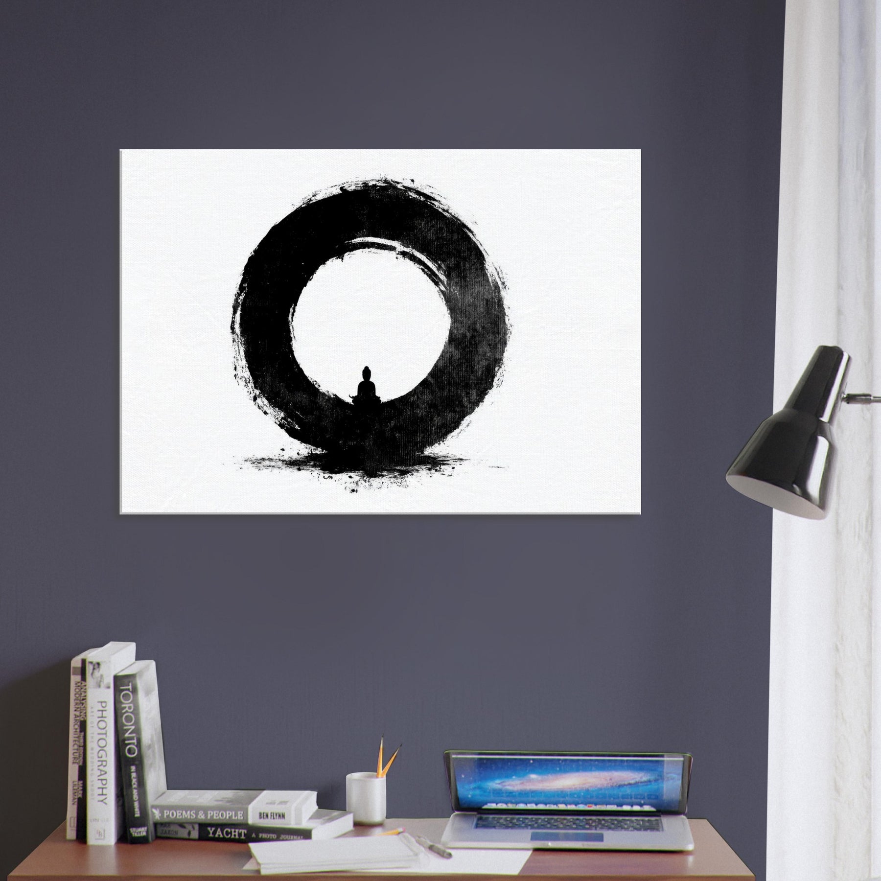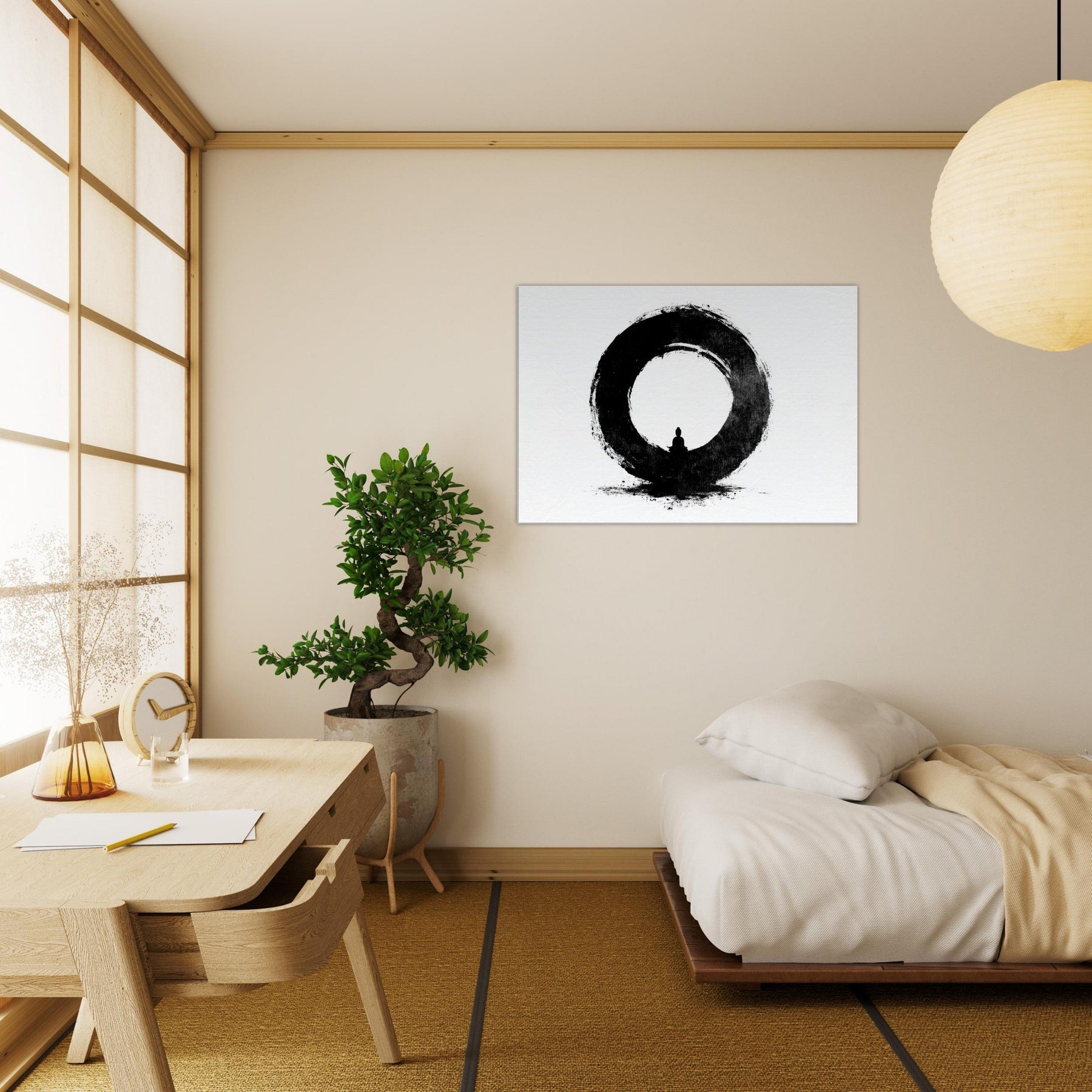 Ensō (Zen Circle) is rendered in a single, expansive black brushstroke that encircles an intentional emptiness. The stark contrast against white space evokes stillness, balance, and a meditative breath in the room. This piece invites quiet reflection and subtle energy into any living space, its minimalist form harmonizing with wood, linen, and natural light. The mystic circle becomes a tranquil focal point from a cozy corner to a sunlit wall enhancing daily rituals, evening calm, and a sense of spacious serenity.