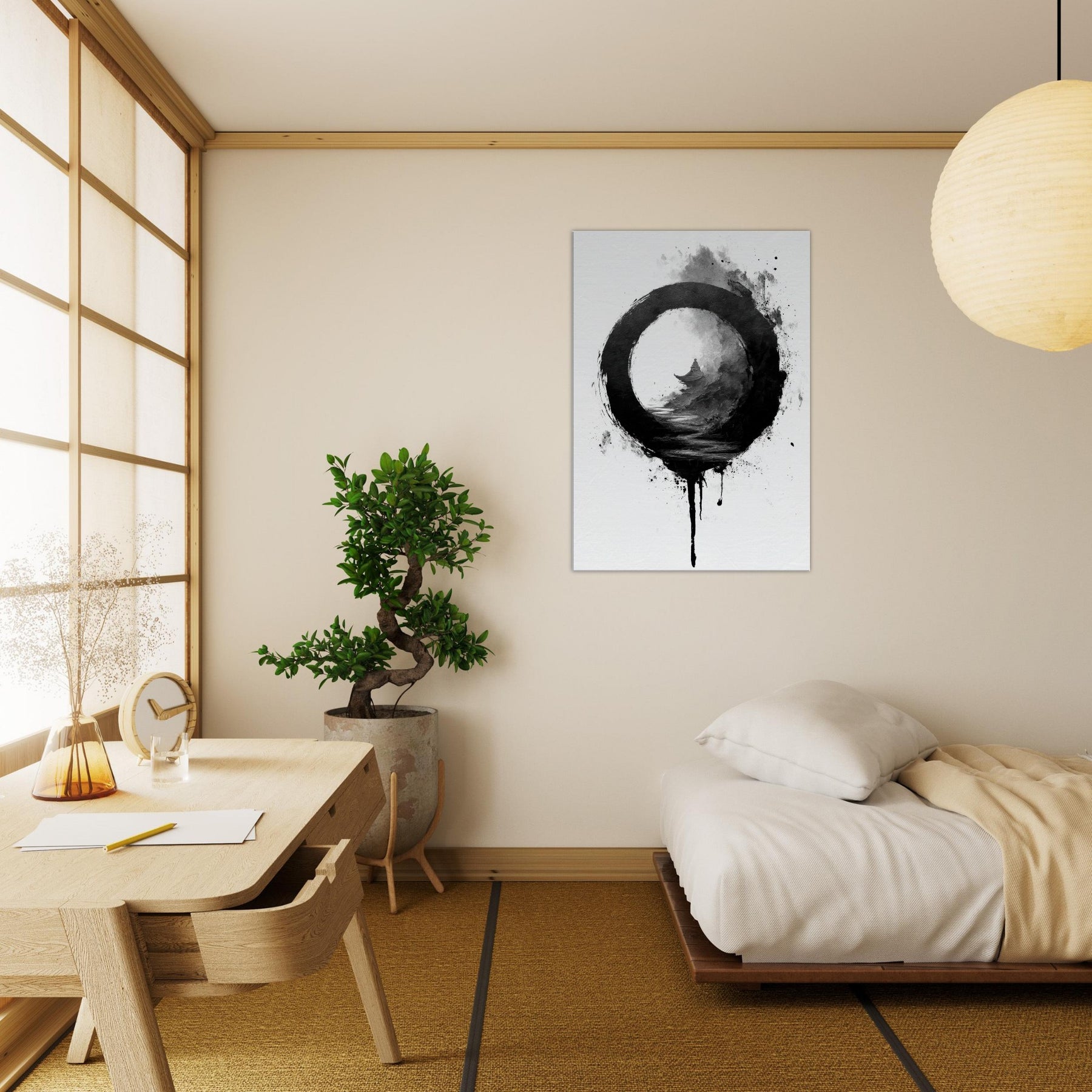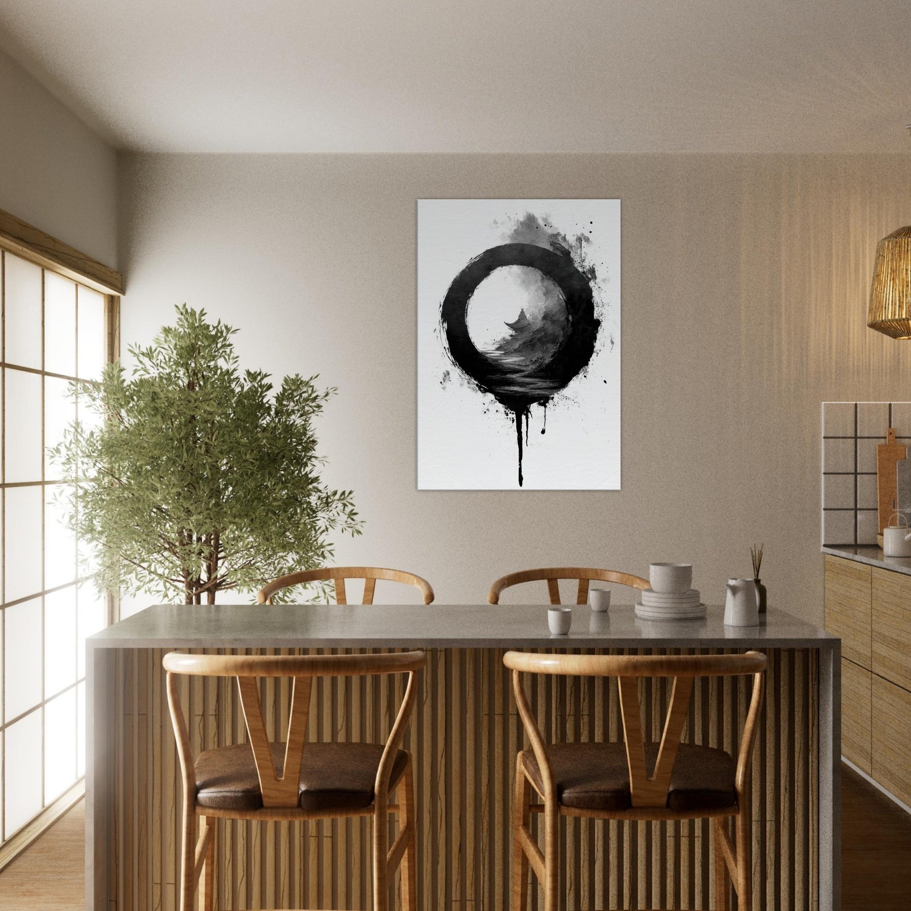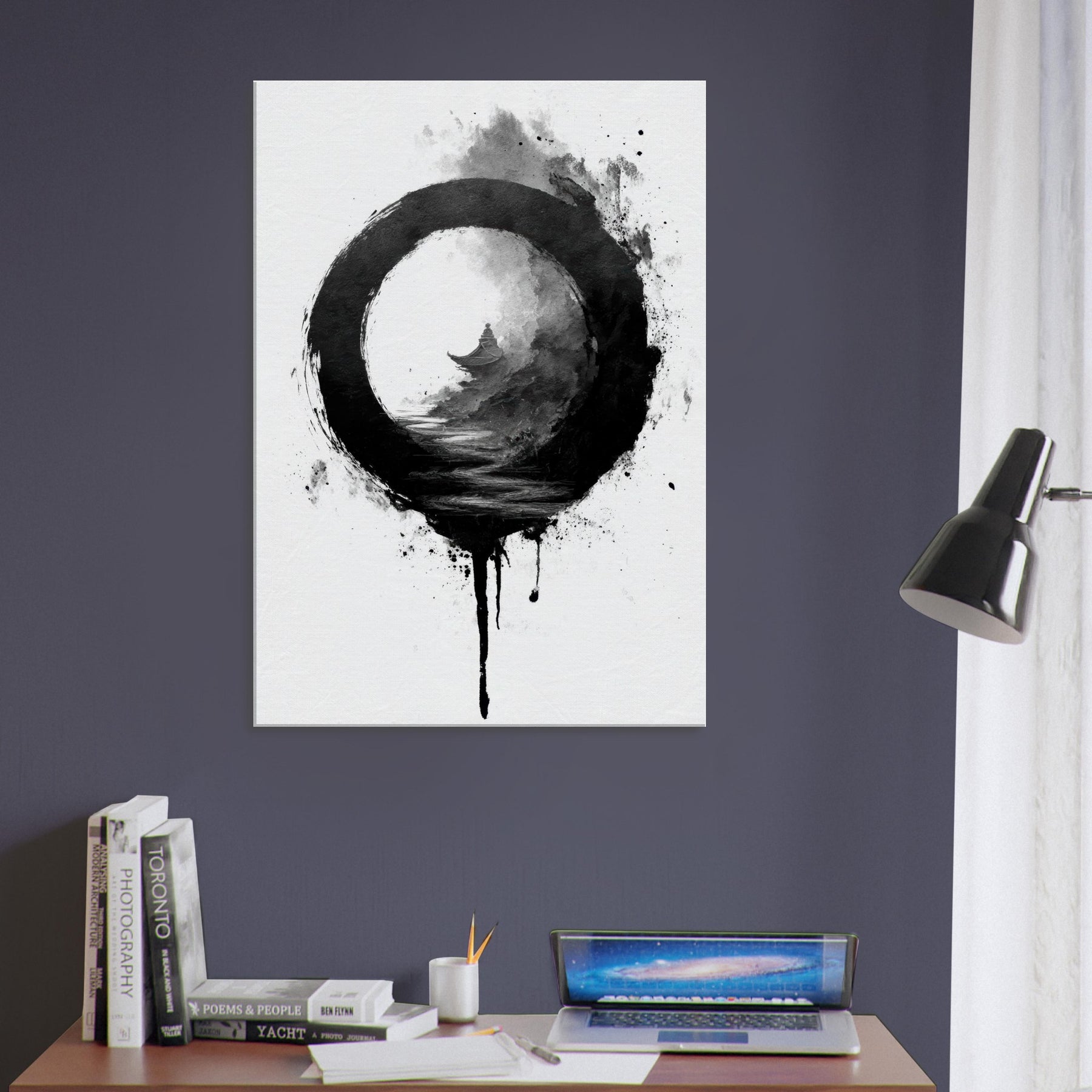 Let the Ensō guide your space into quiet contemplation. This black and white meditation hangs like a breath, a circular brushstroke that opens onto a misty shore where a pagoda emerges. Ink bleeds into the white with graceful drips, creating depth and mystery that shifts with the light. The work invites stillness, grounding a living room or study with balance, focus, and a subtle sense of mystery. Place it where you seek clarity, ritual, or simply a moment of pause. The central subject is Ensō (Zen Circle).