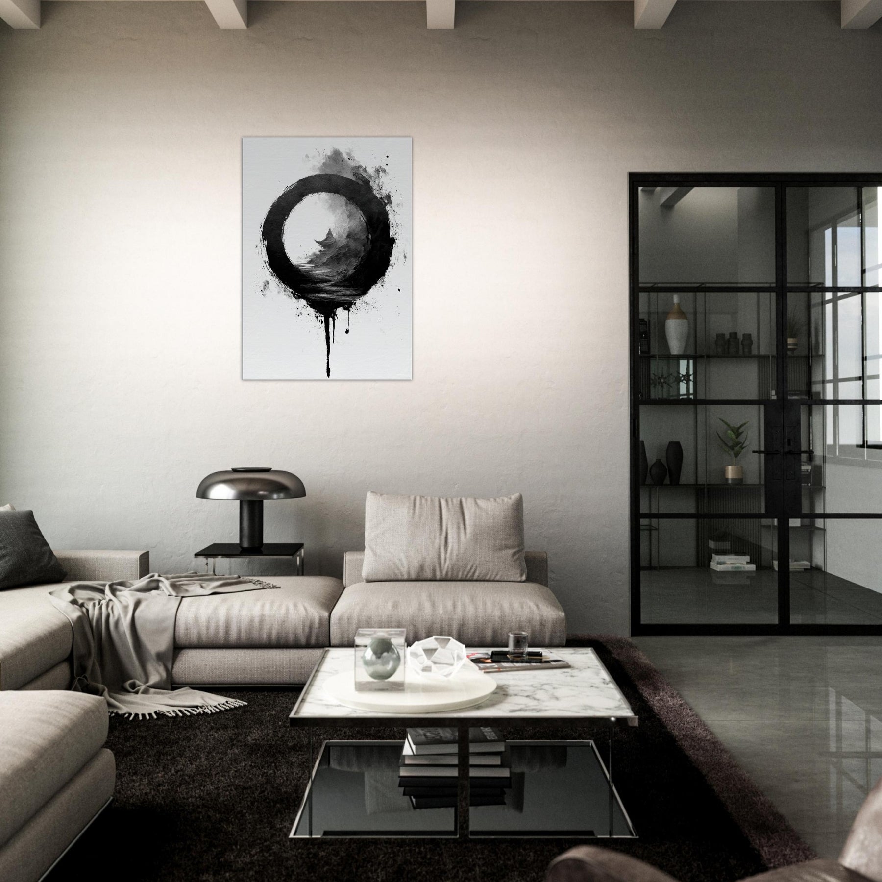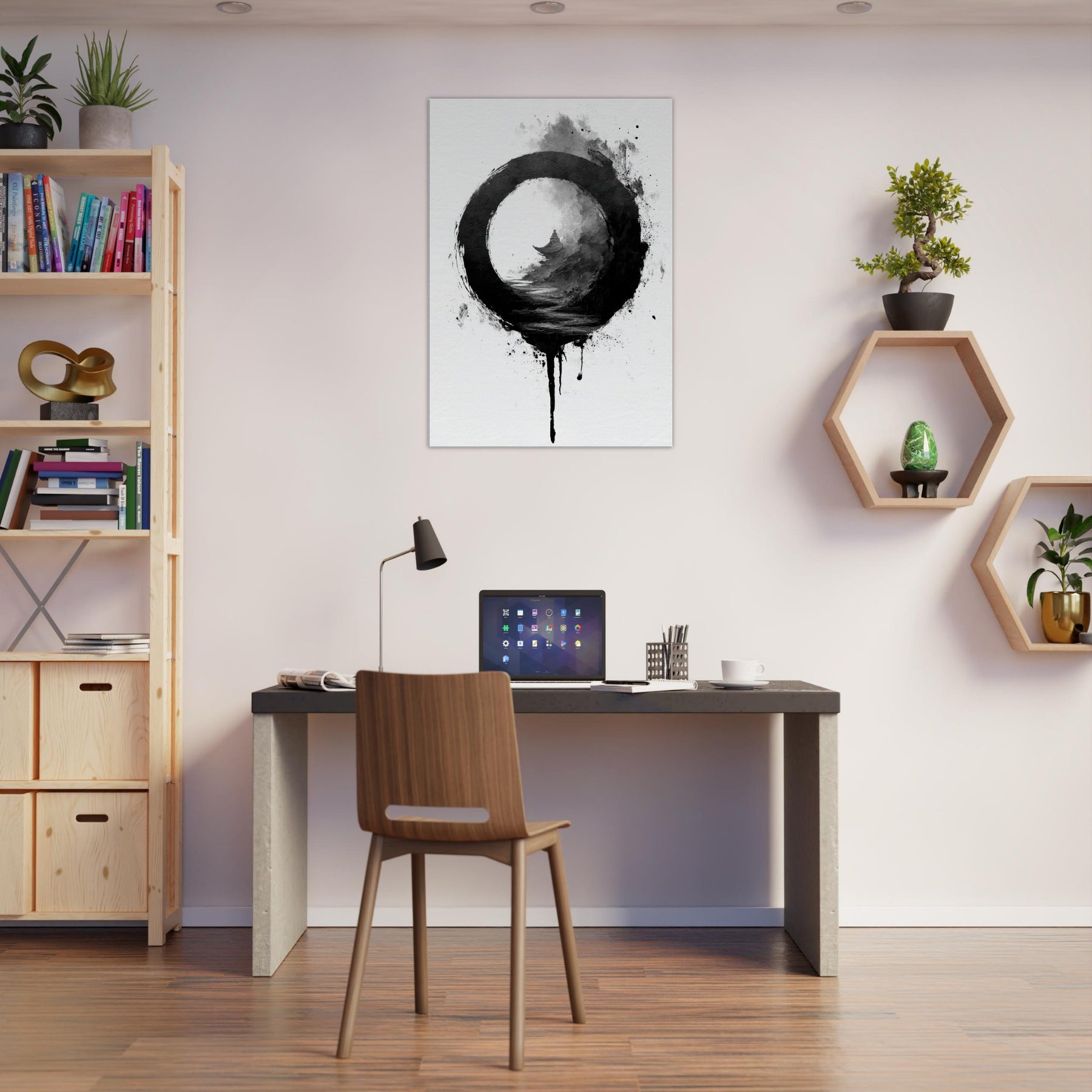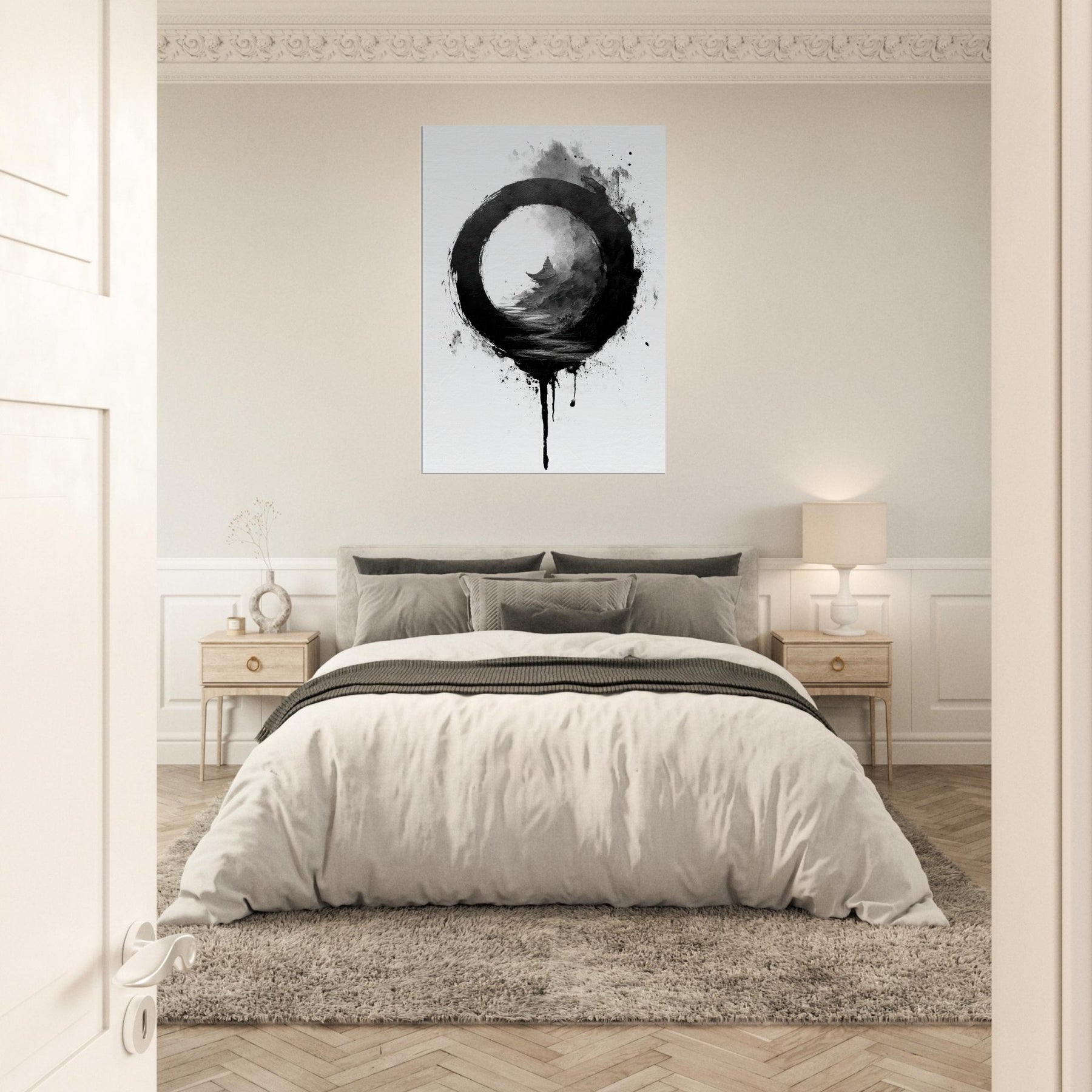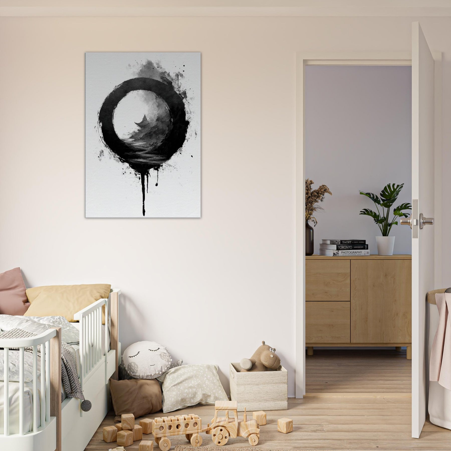 Let the Ensō guide your space into quiet contemplation. This black and white meditation hangs like a breath, a circular brushstroke that opens onto a misty shore where a pagoda emerges. Ink bleeds into the white with graceful drips, creating depth and mystery that shifts with the light. The work invites stillness, grounding a living room or study with balance, focus, and a subtle sense of mystery. Place it where you seek clarity, ritual, or simply a moment of pause. The central subject is Ensō (Zen Circle).