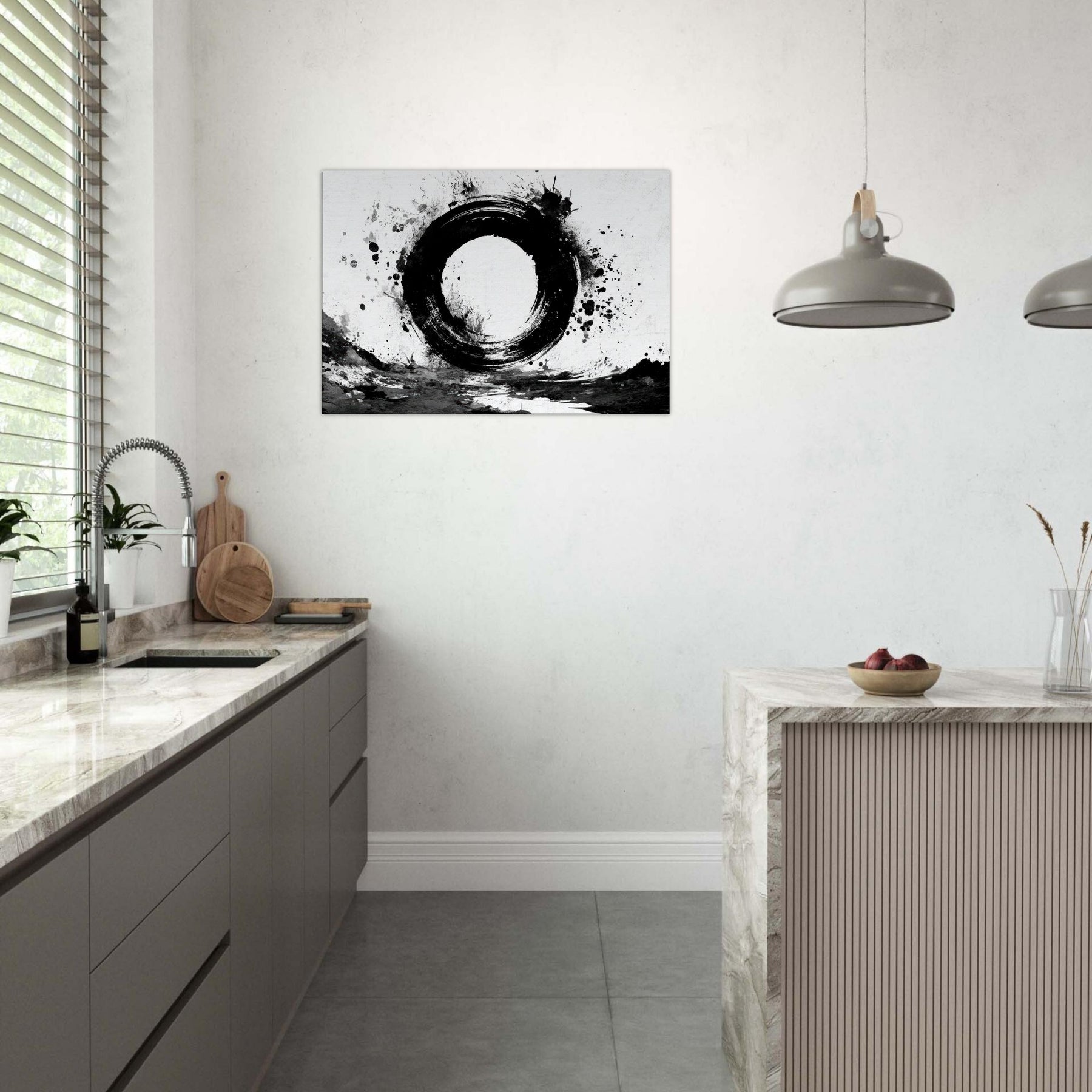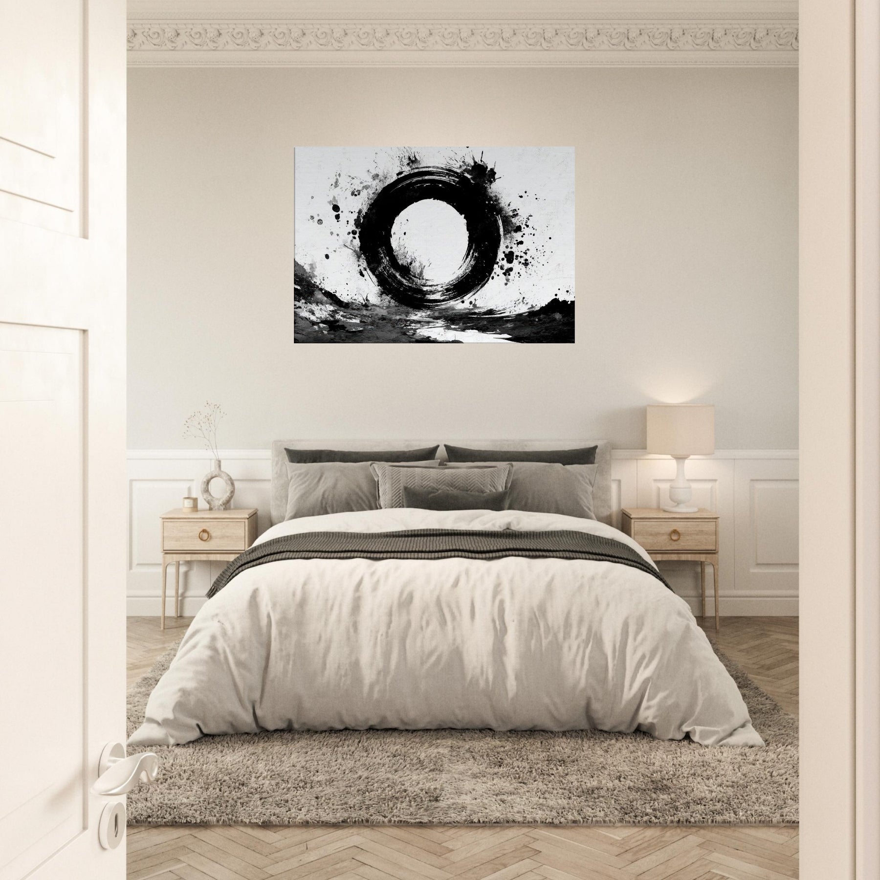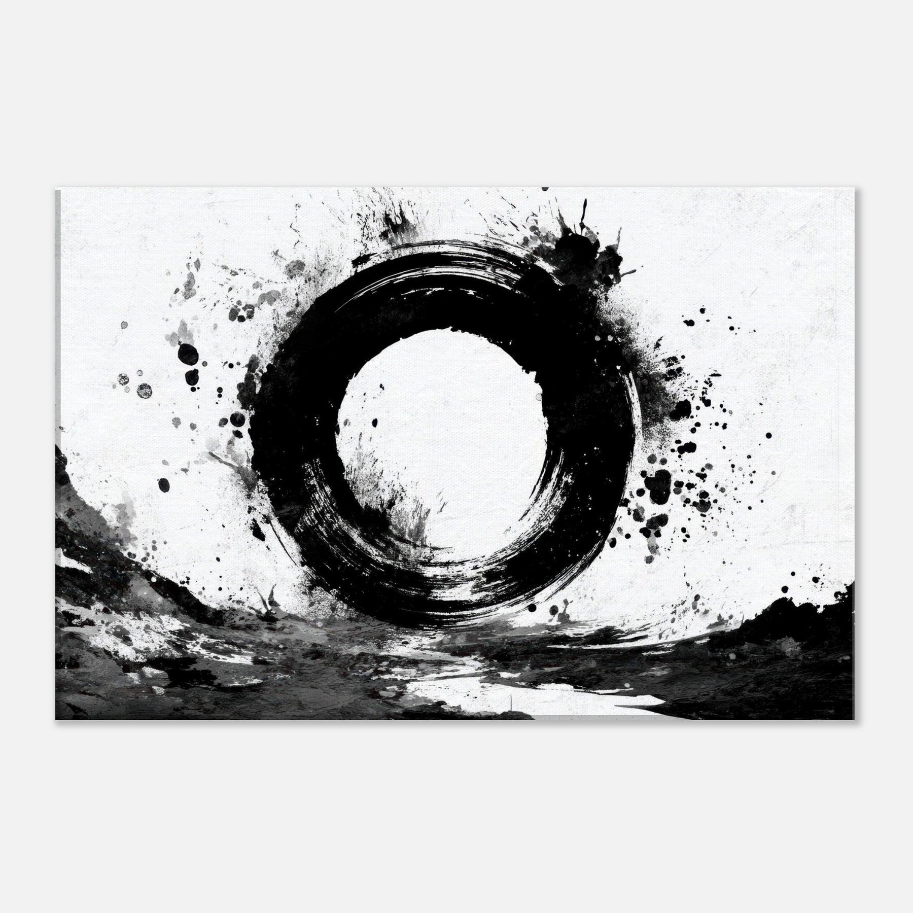 The round, imperfect ring feels like a doorway to calm; the surrounding splatters echo the spontaneity of daily life and the quiet discipline of Zen.