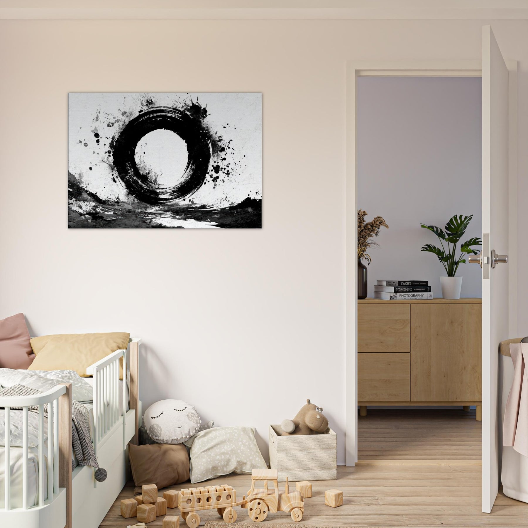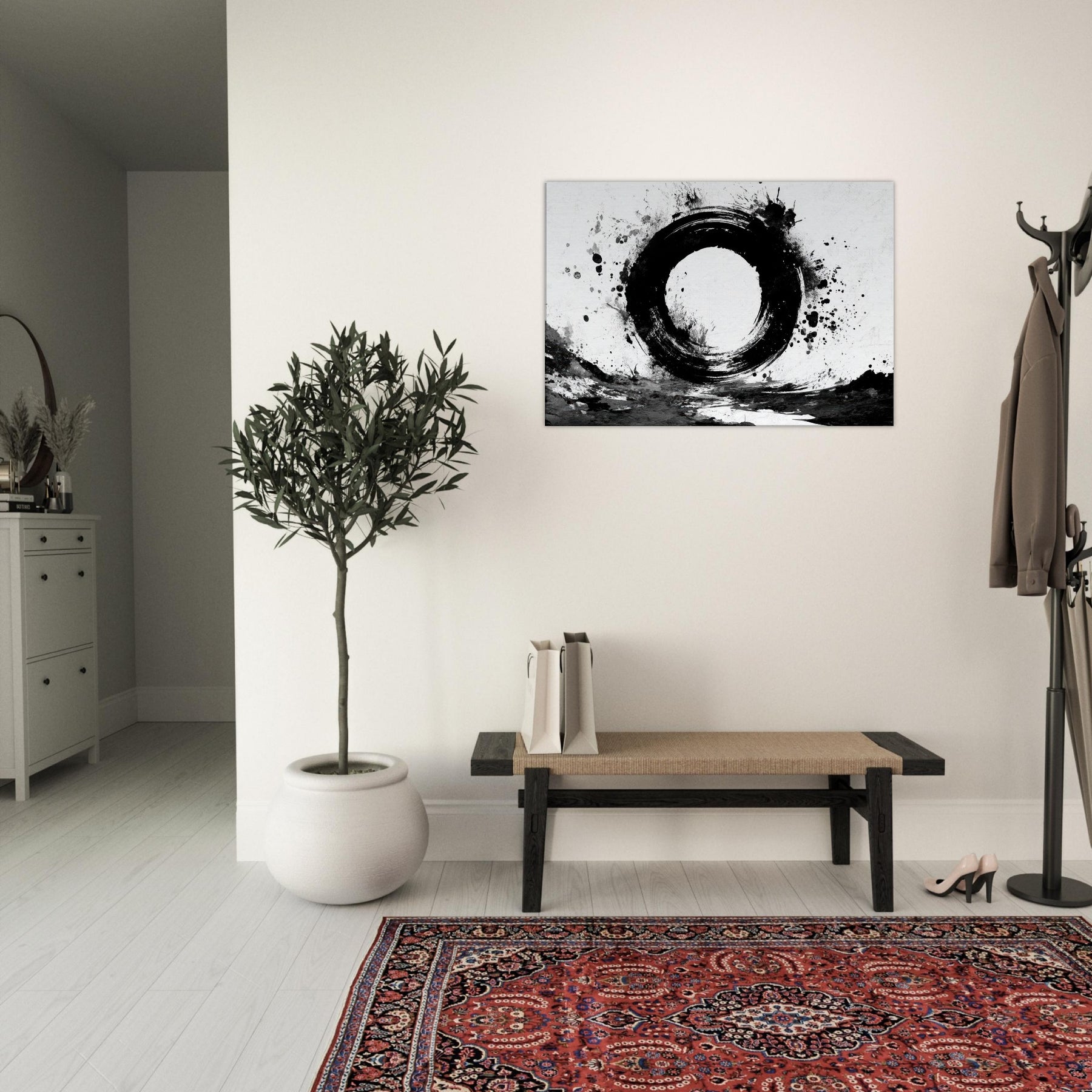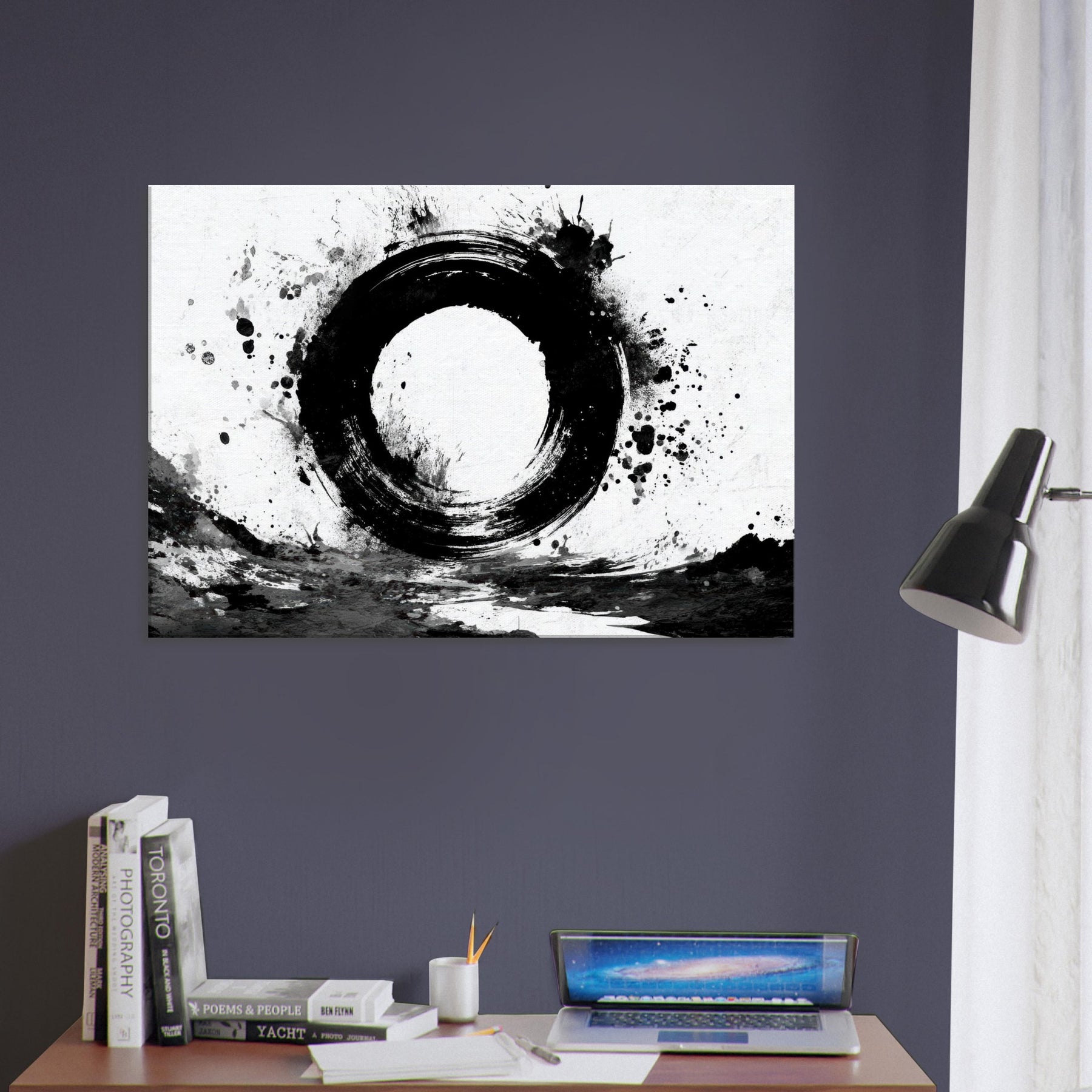 The round, imperfect ring feels like a doorway to calm; the surrounding splatters echo the spontaneity of daily life and the quiet discipline of Zen.
