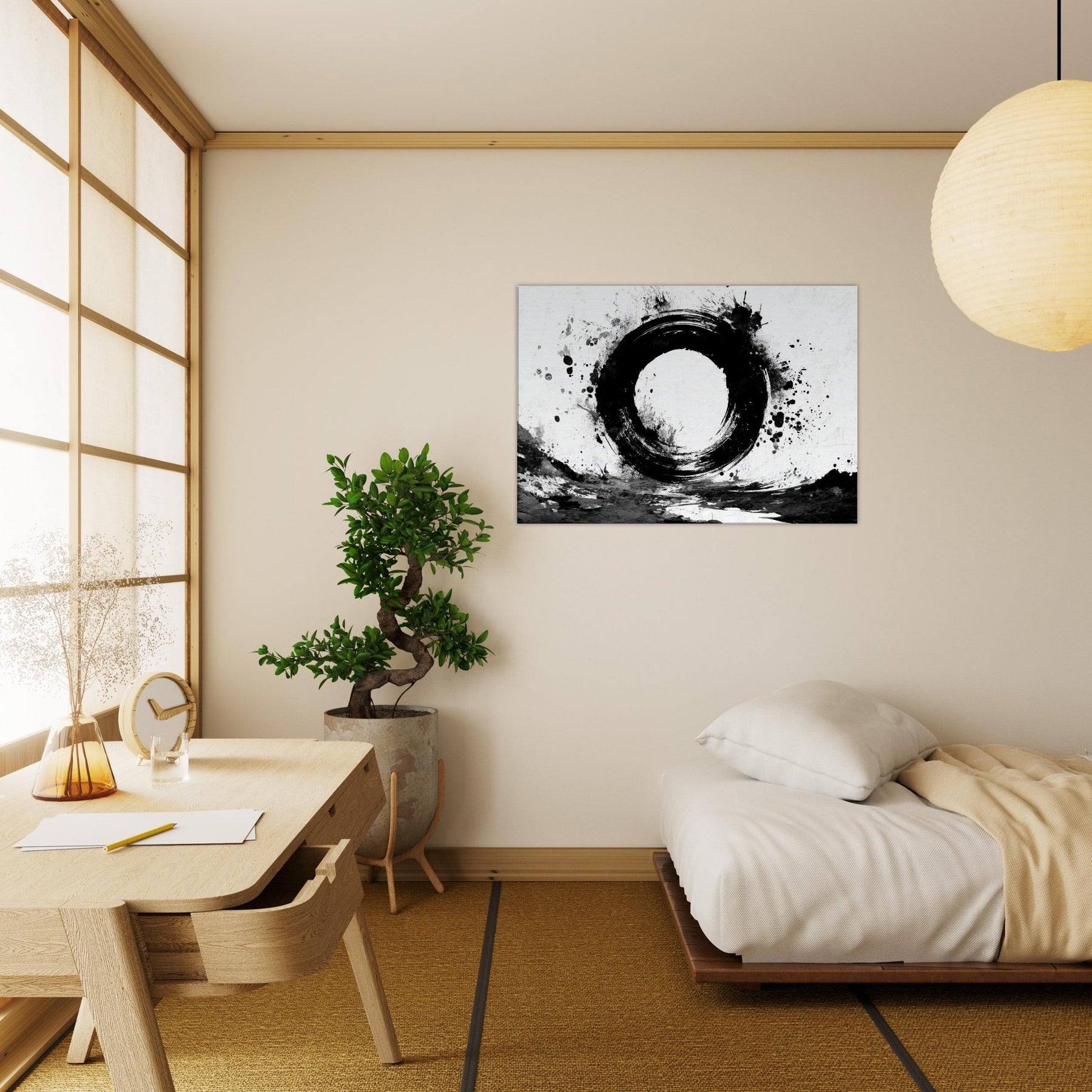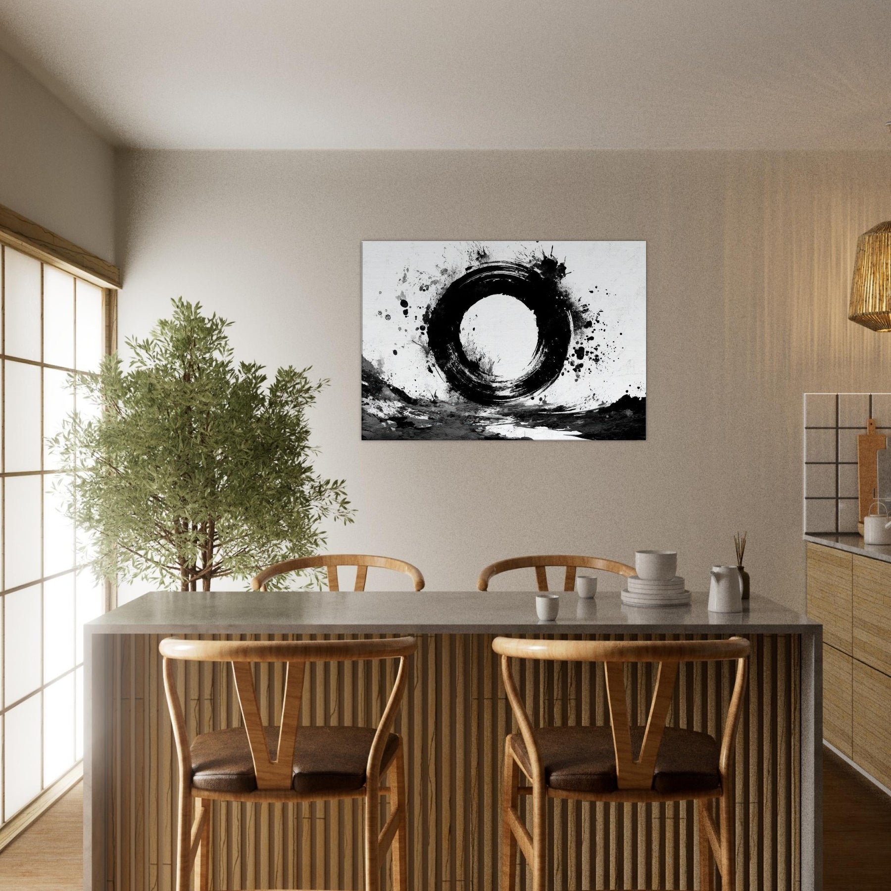 Hang above a couch or in an entryway to slow time, invite conversation, and create a contemplative mood that nourishes creativity and balance. The central subject is Ensō (Zen Circle).