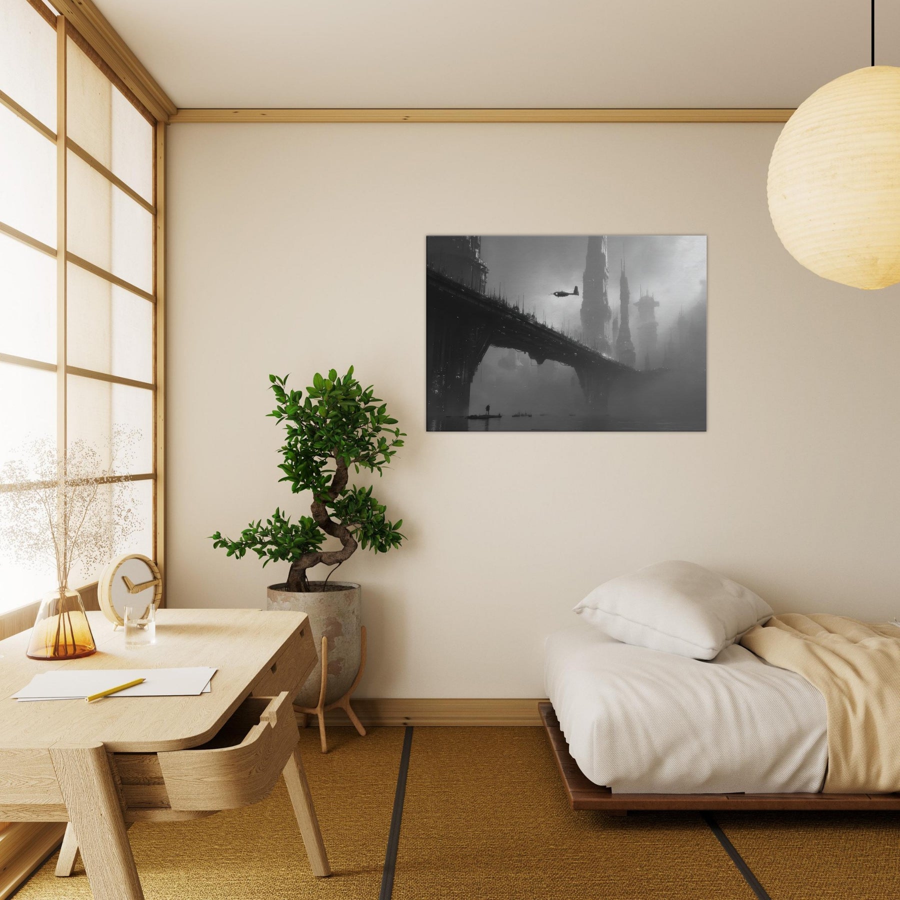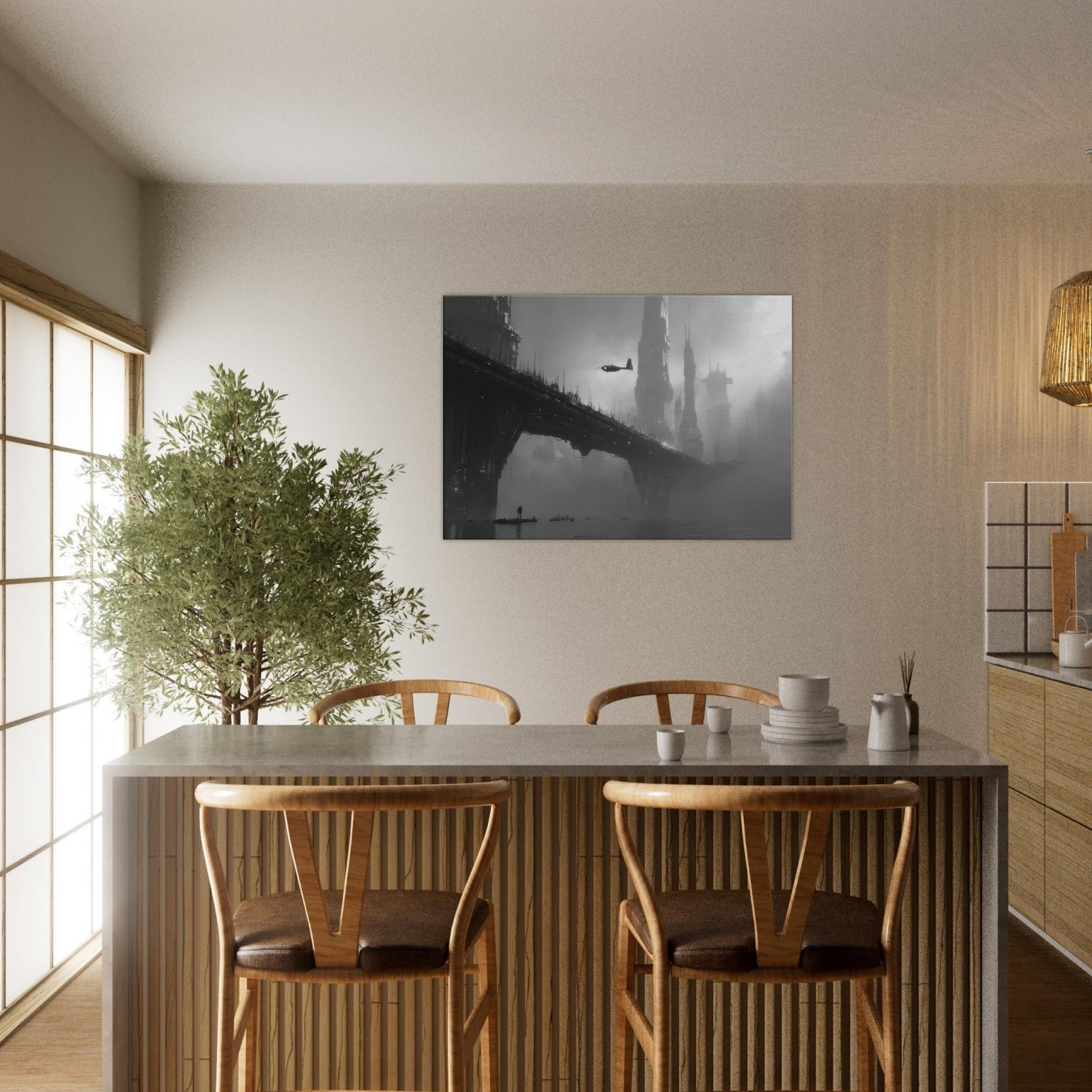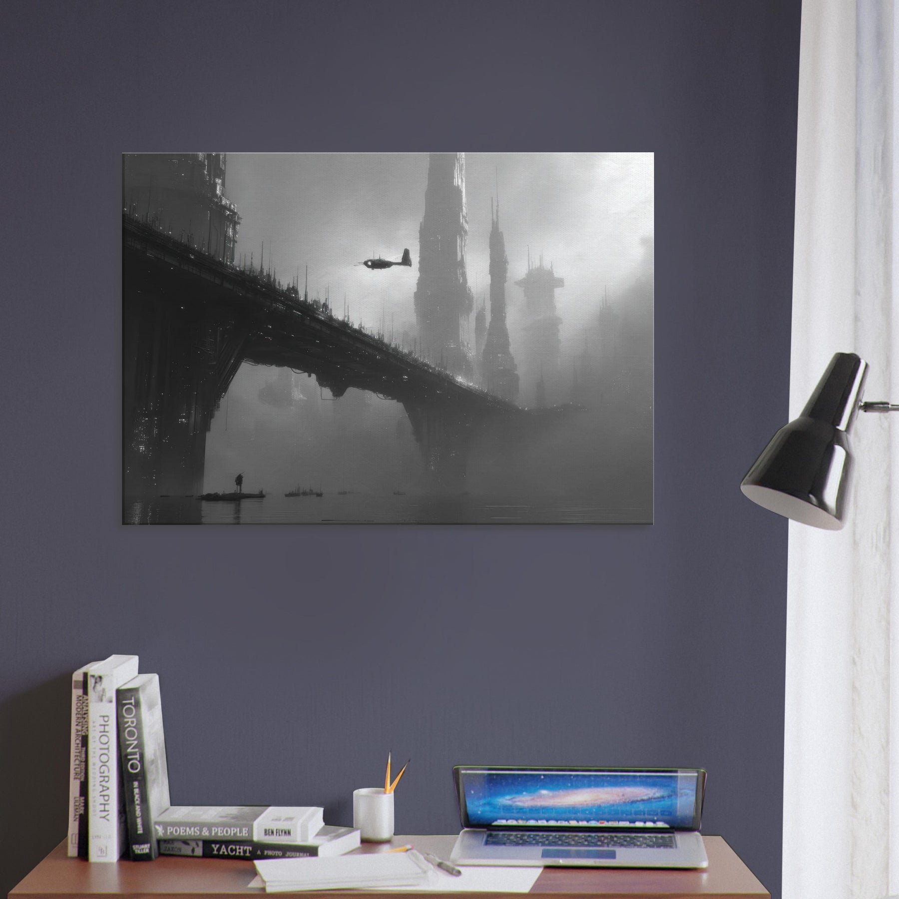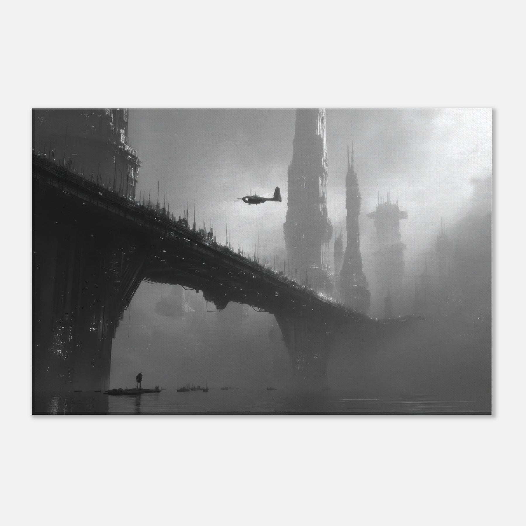 In stark black and white, its spires glow with quiet intelligence as a lone vessel glides along a bridge of ether. Fog veils and reveals sharp silhouettes, inviting memory and wonder.