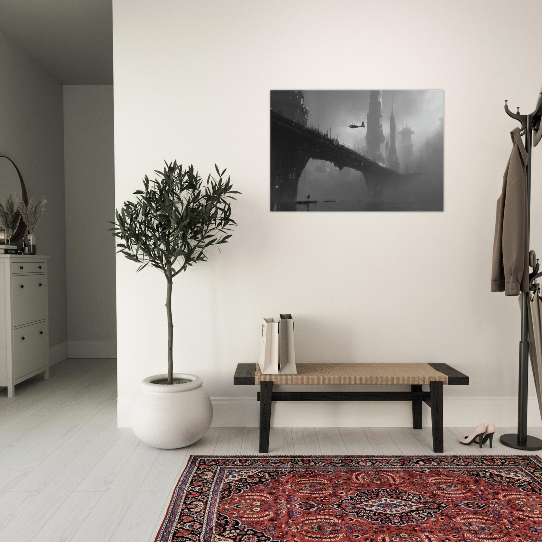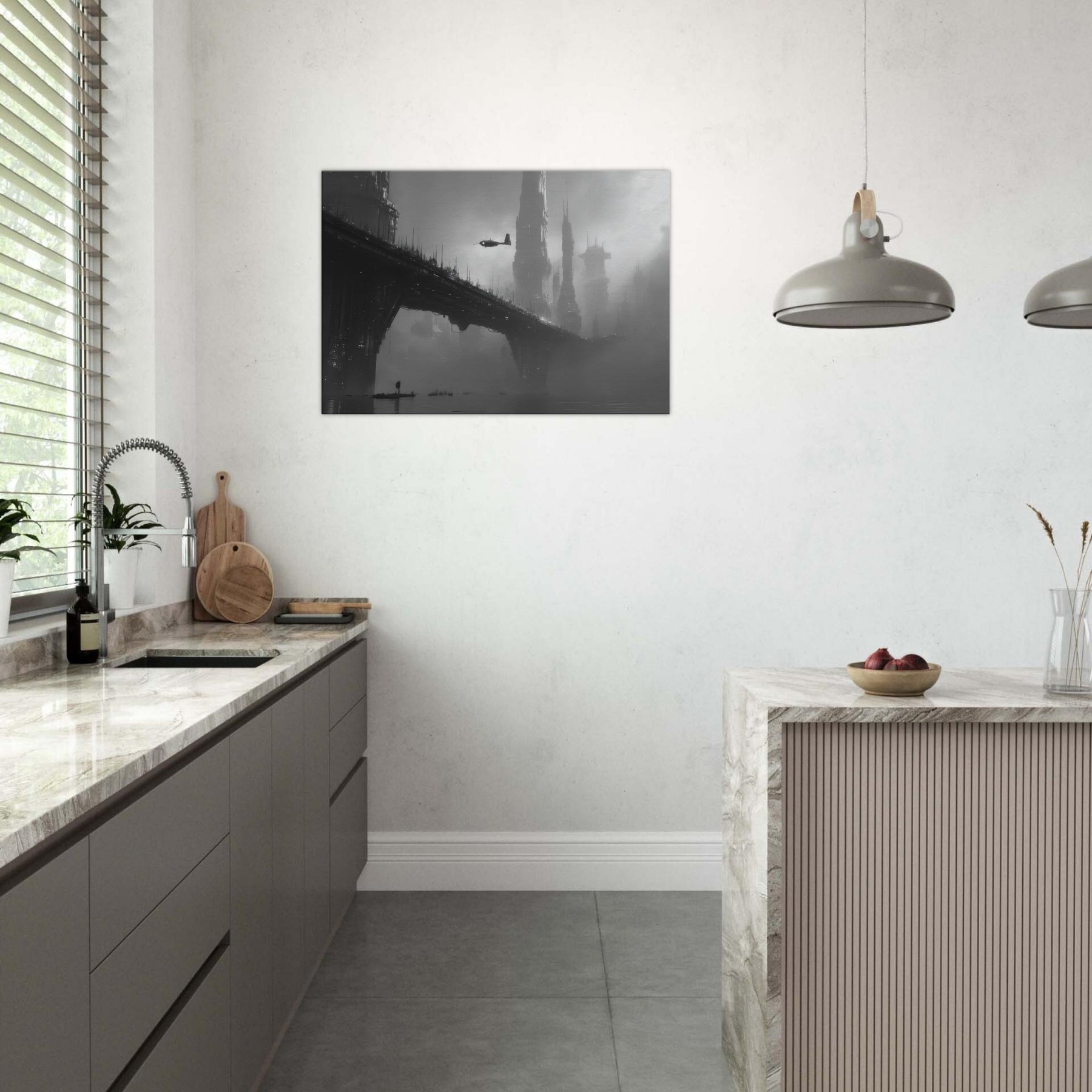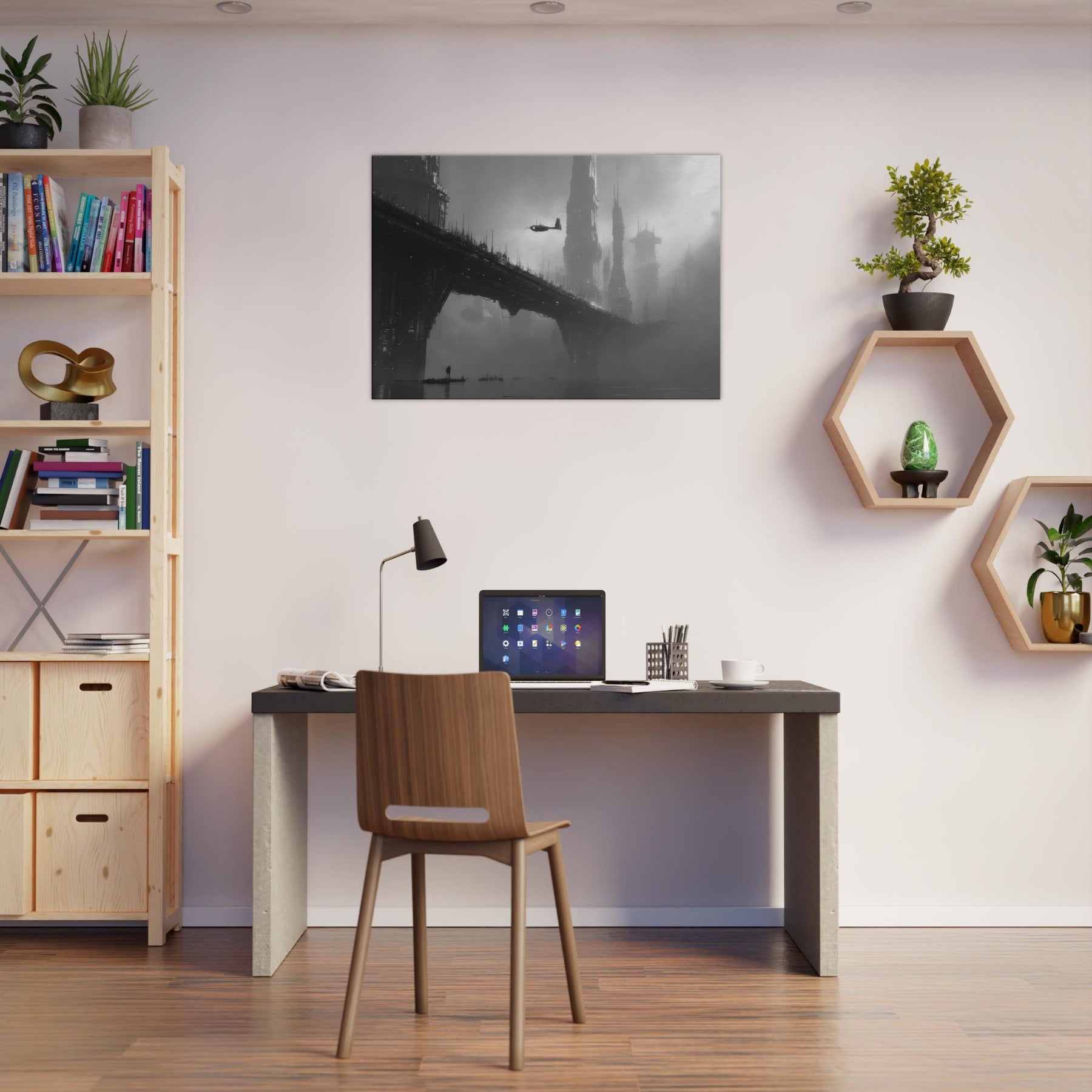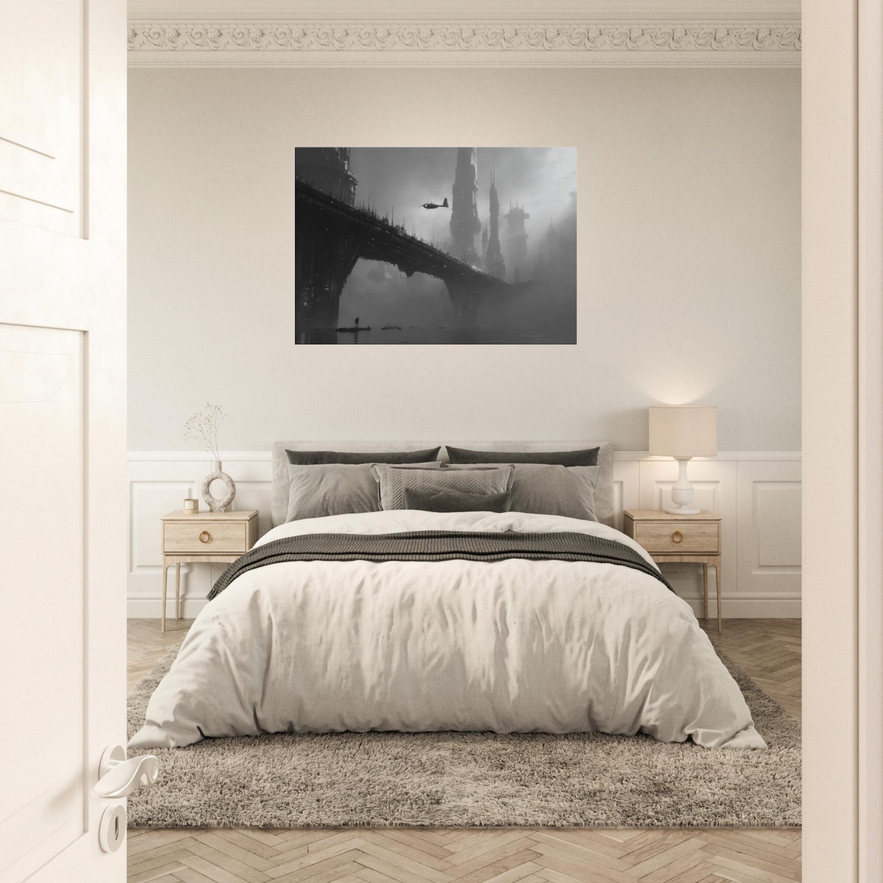 In stark black and white, its spires glow with quiet intelligence as a lone vessel glides along a bridge of ether. Fog veils and reveals sharp silhouettes, inviting memory and wonder.