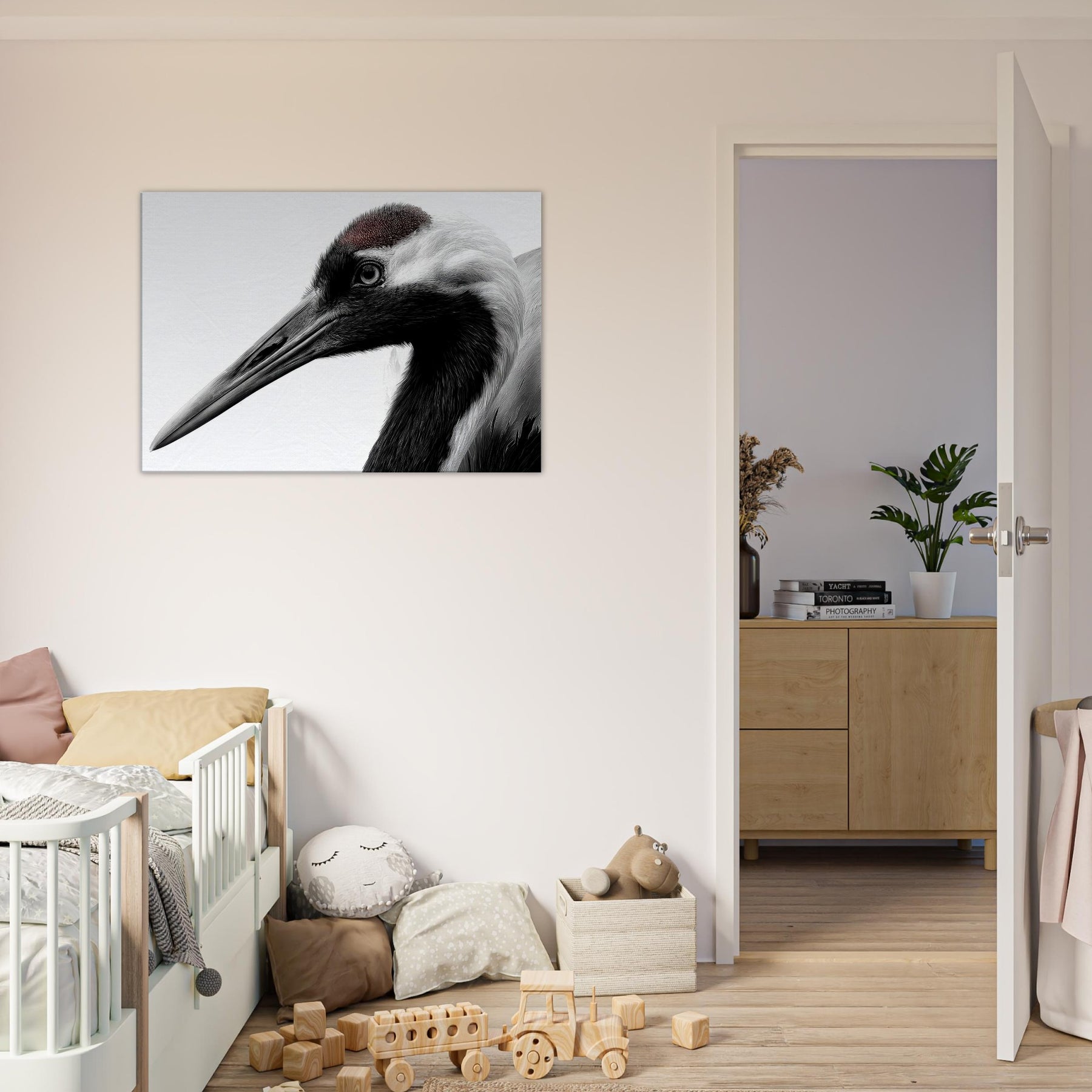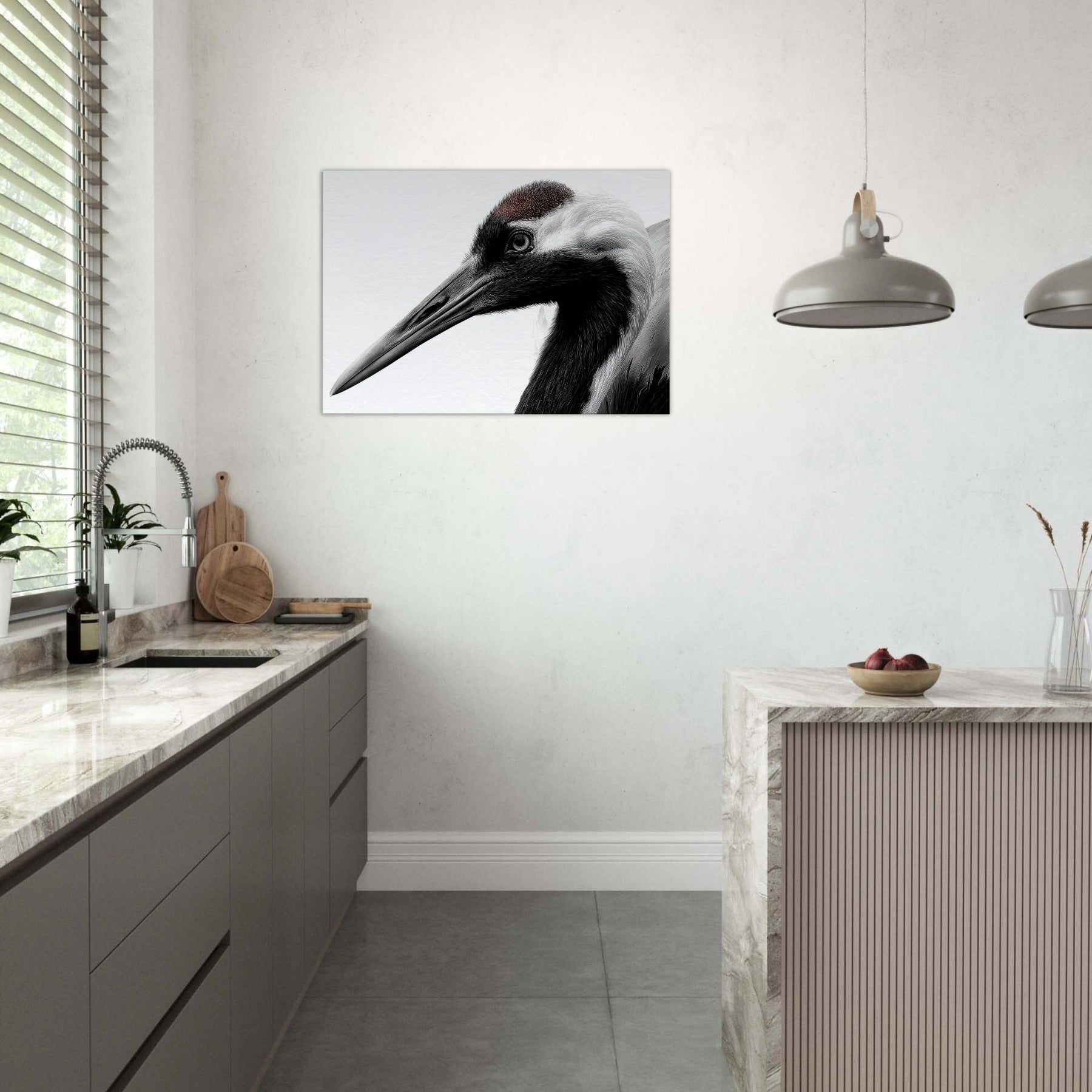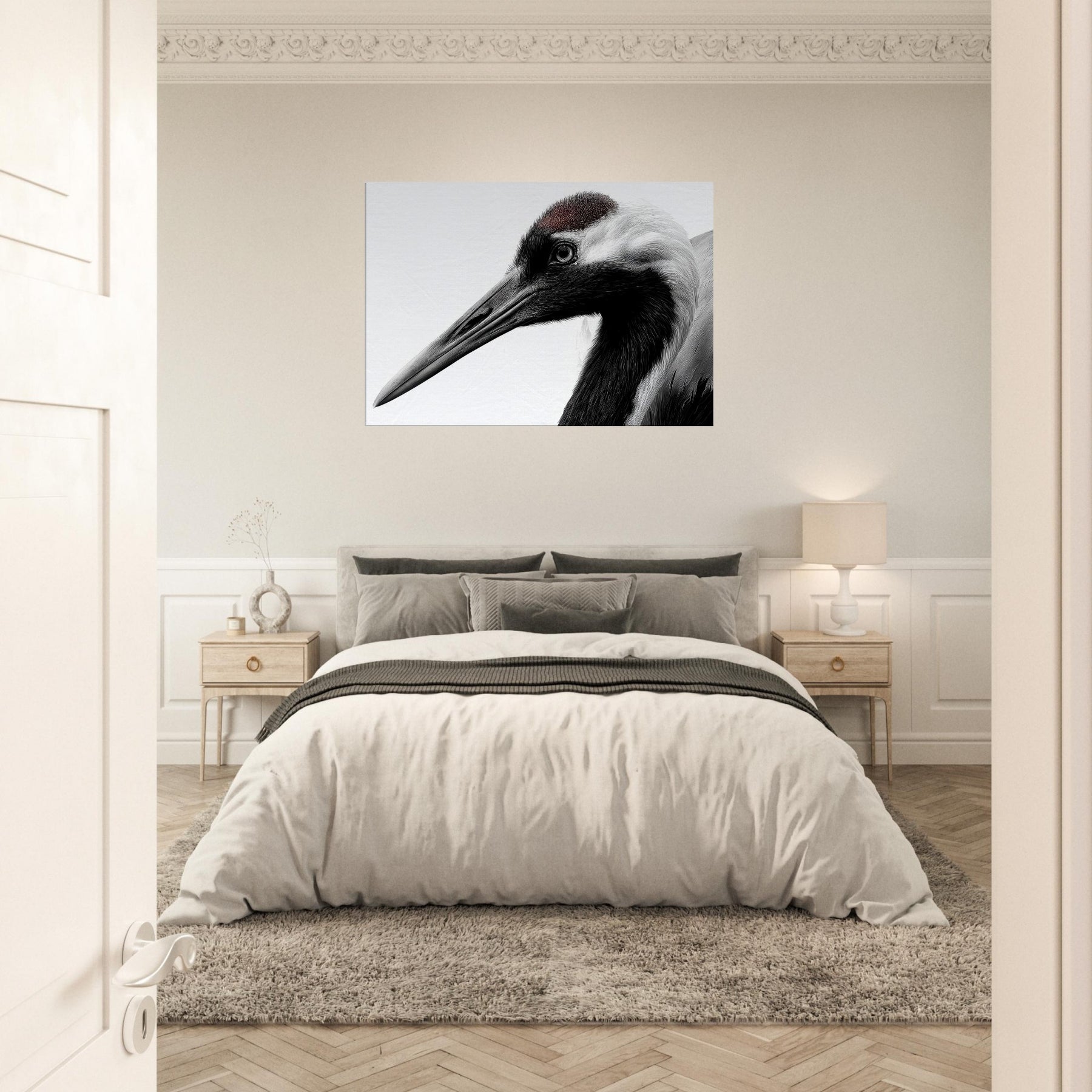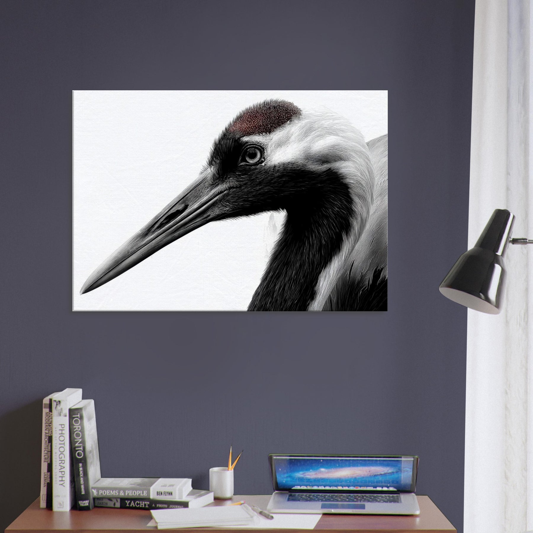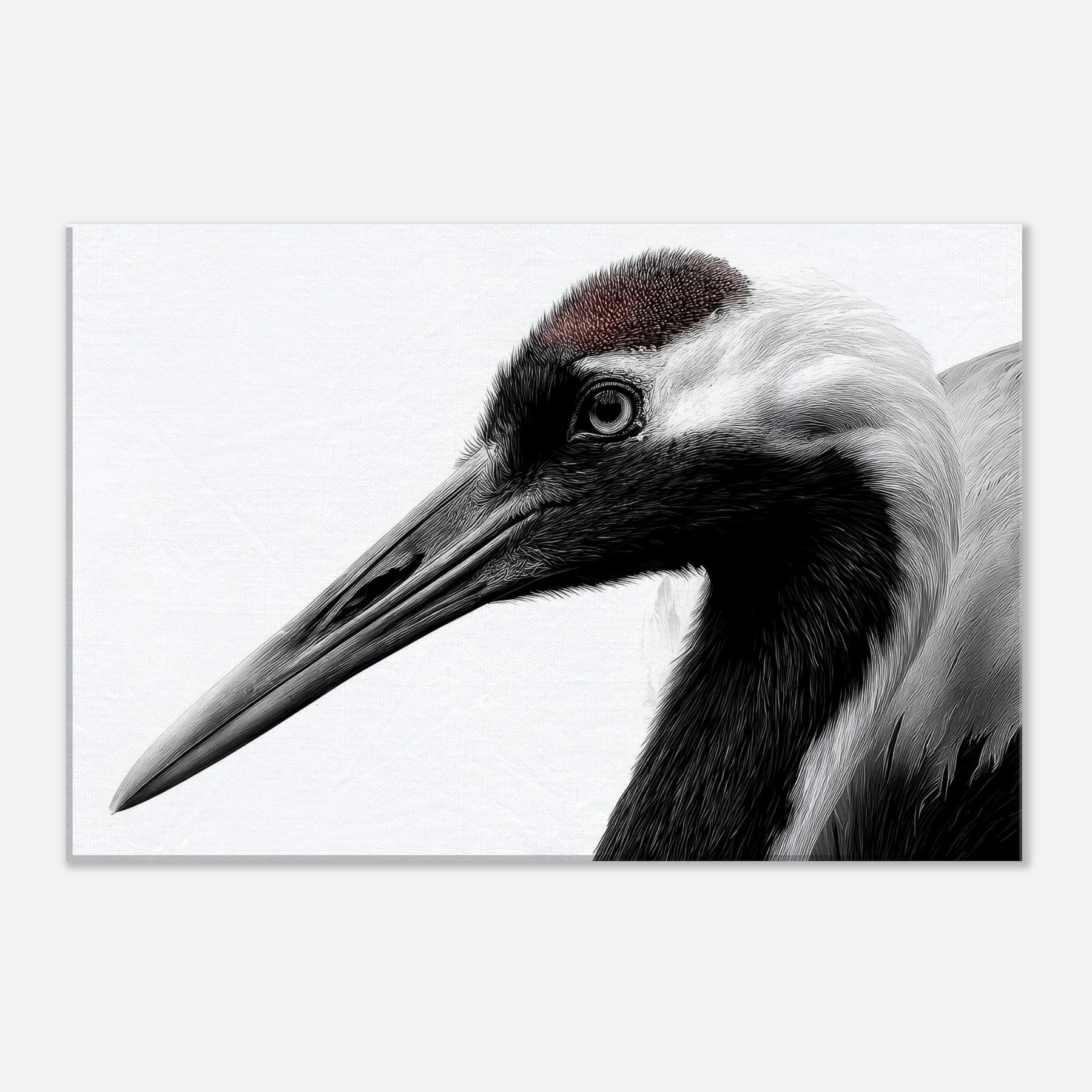 Red Crowned Crane glides through ink dark elegance in a study of form and restraint. This monochrome composition captures the bird’s poised silhouette with whisper thin lines and rich negative space, inviting quiet reflection.