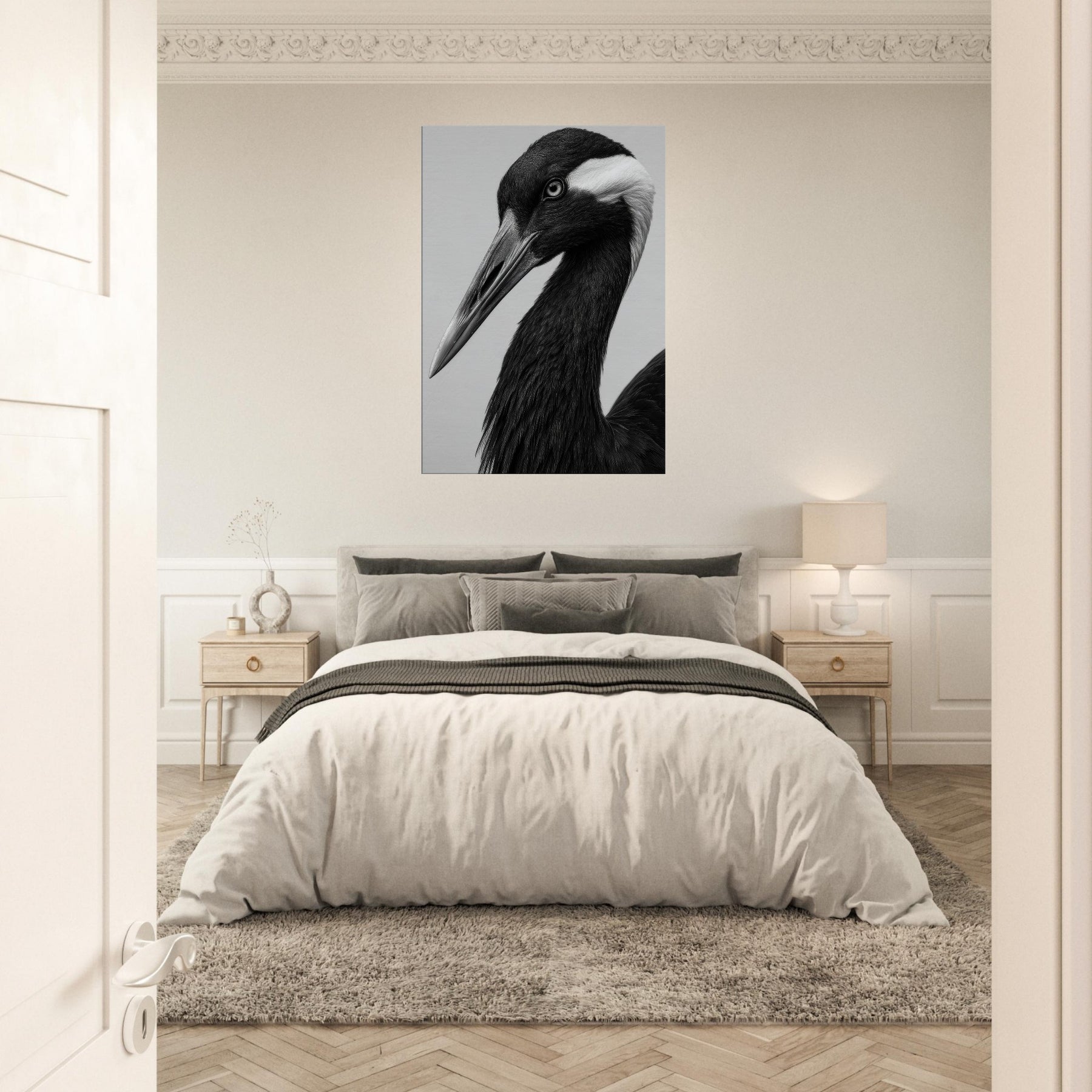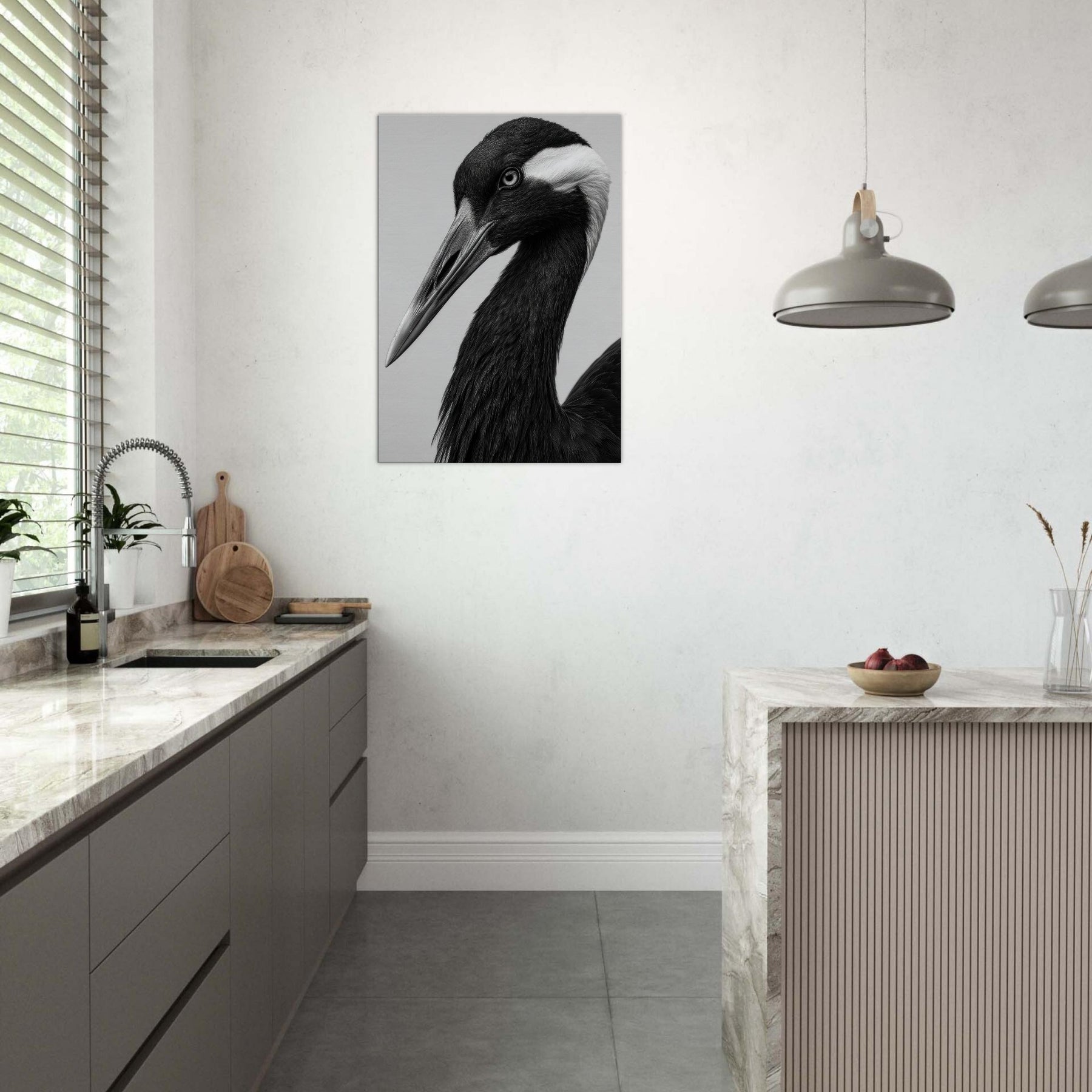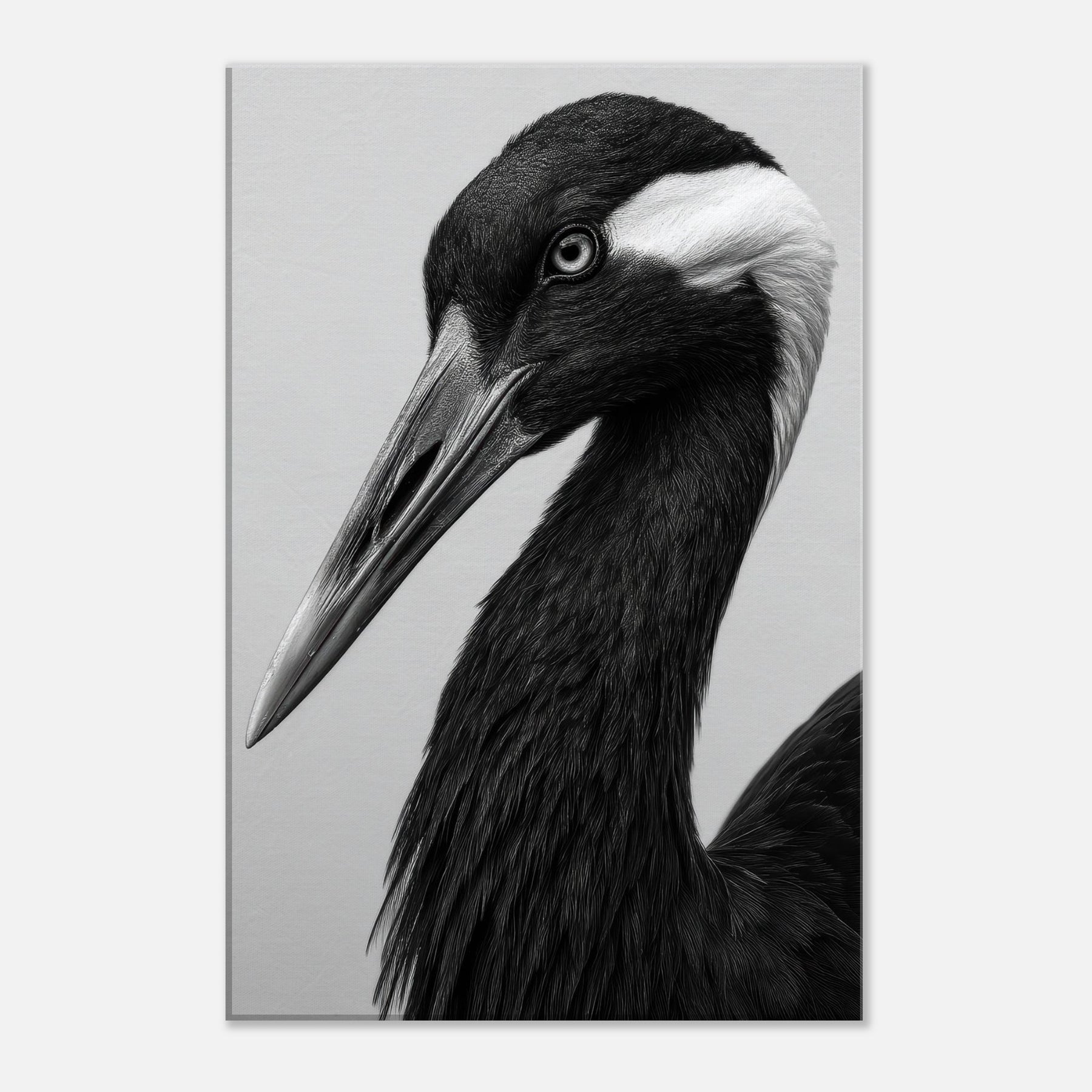 In stark black and white, this Crane embodies quiet poise. The long neck curves with graceful intent, the beak a pale spear against obsidian plumage. Light brushes reveal subtle textures, while shadow deepens the form, suggesting dawn over a still lake. The Primary Subject, Crane, invites a tranquil moment and a refined focal point for any room. This piece elevates a living space with timeless elegance, pairing effortlessly with modern furnishings and neutral palettes, turning walls into a gallery of contemplative mood and understated drama.
