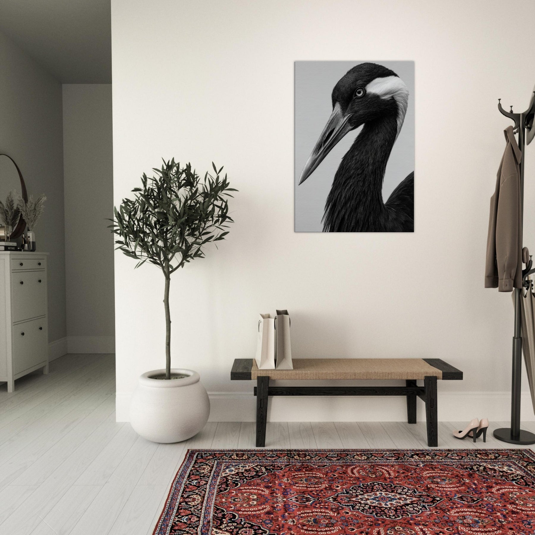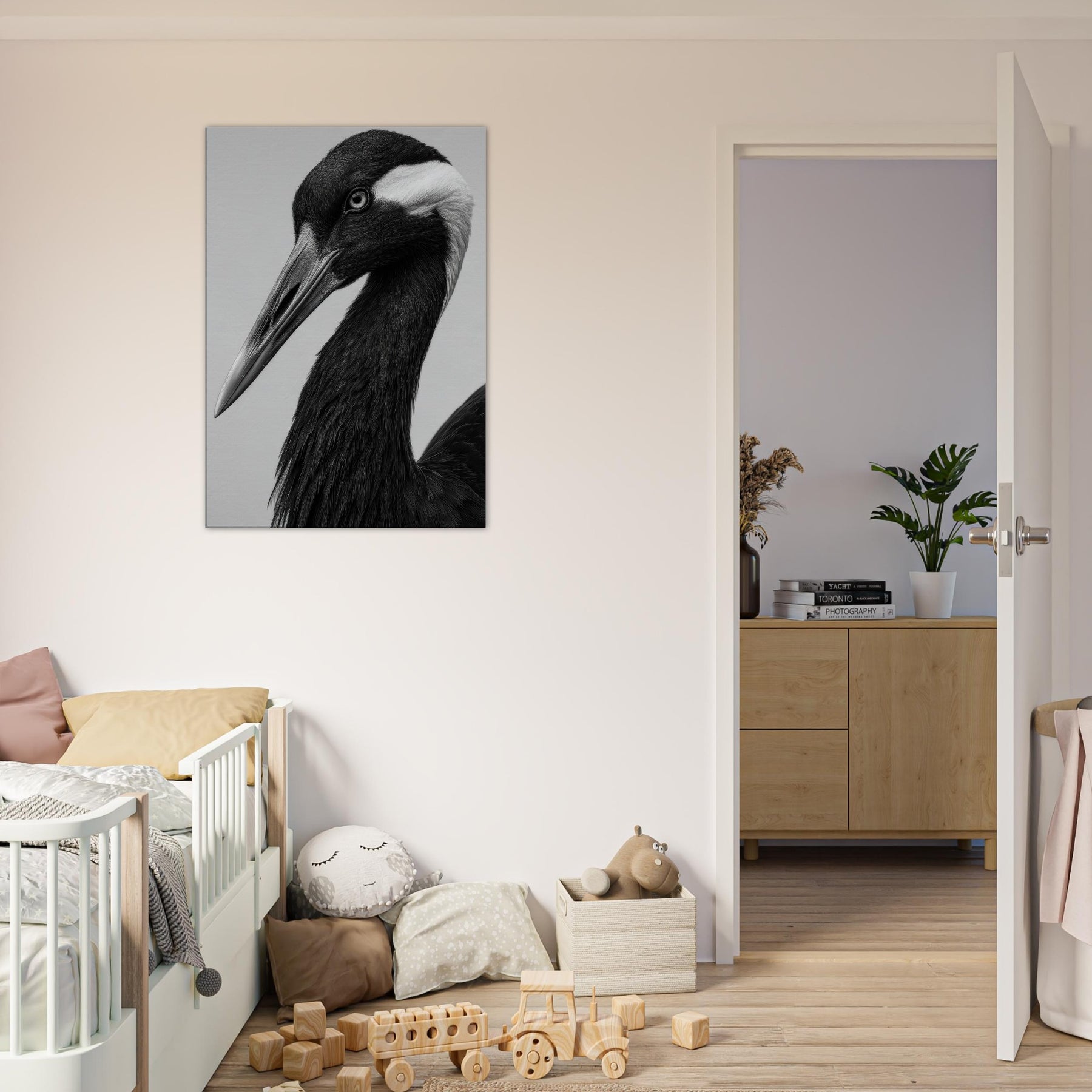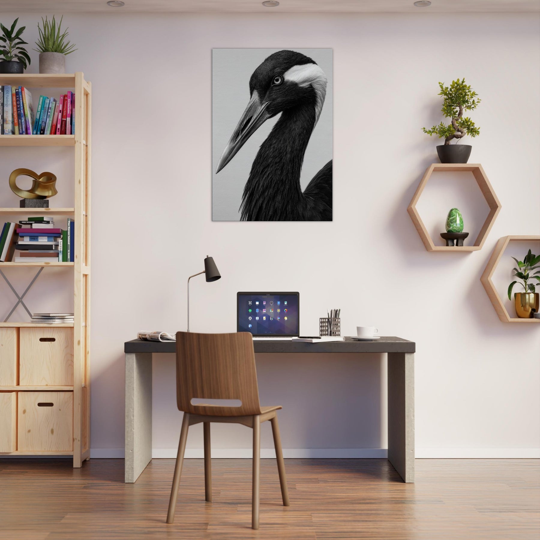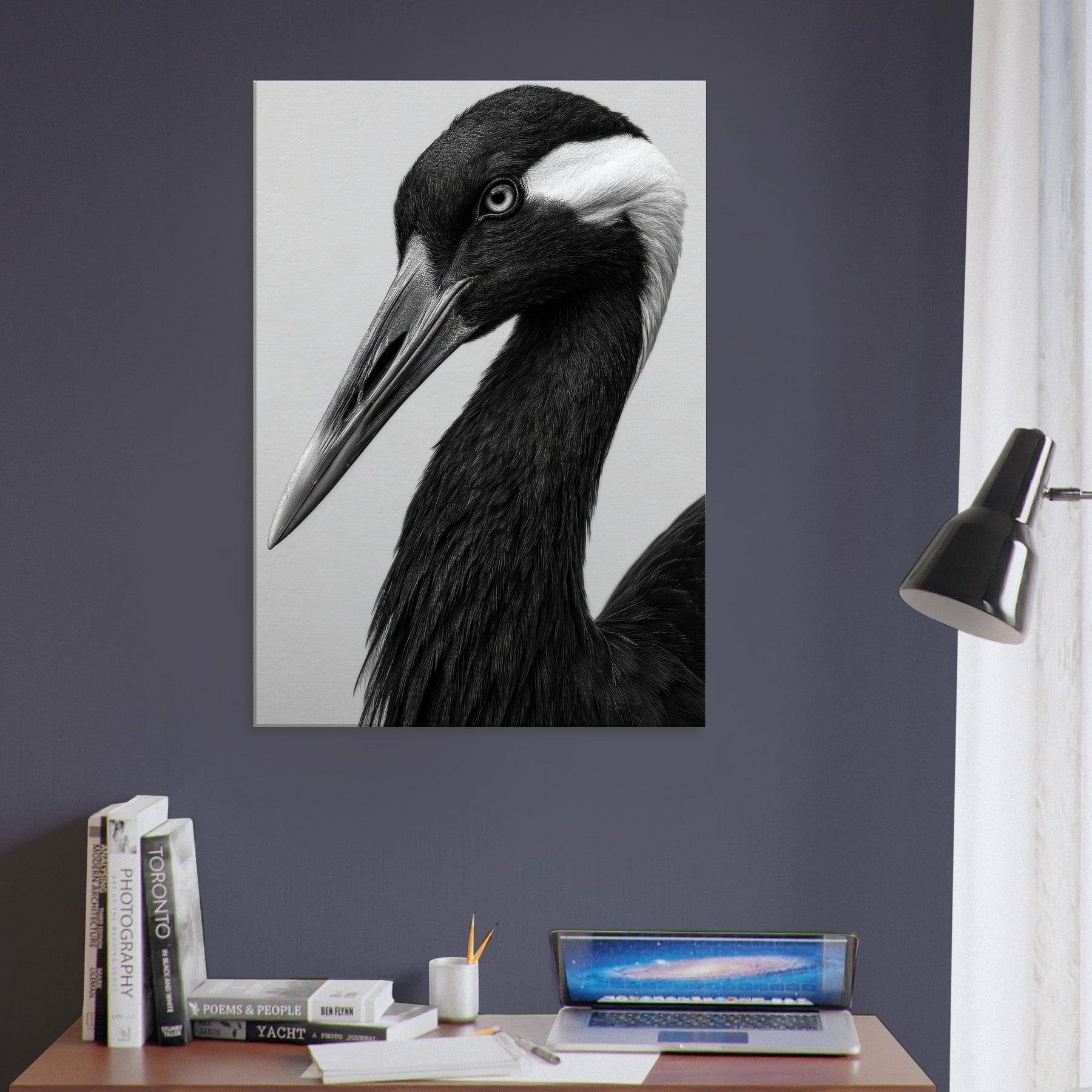 In stark black and white, this Crane embodies quiet poise. The long neck curves with graceful intent, the beak a pale spear against obsidian plumage. Light brushes reveal subtle textures, while shadow deepens the form, suggesting dawn over a still lake. The Primary Subject, Crane, invites a tranquil moment and a refined focal point for any room. This piece elevates a living space with timeless elegance, pairing effortlessly with modern furnishings and neutral palettes, turning walls into a gallery of contemplative mood and understated drama.