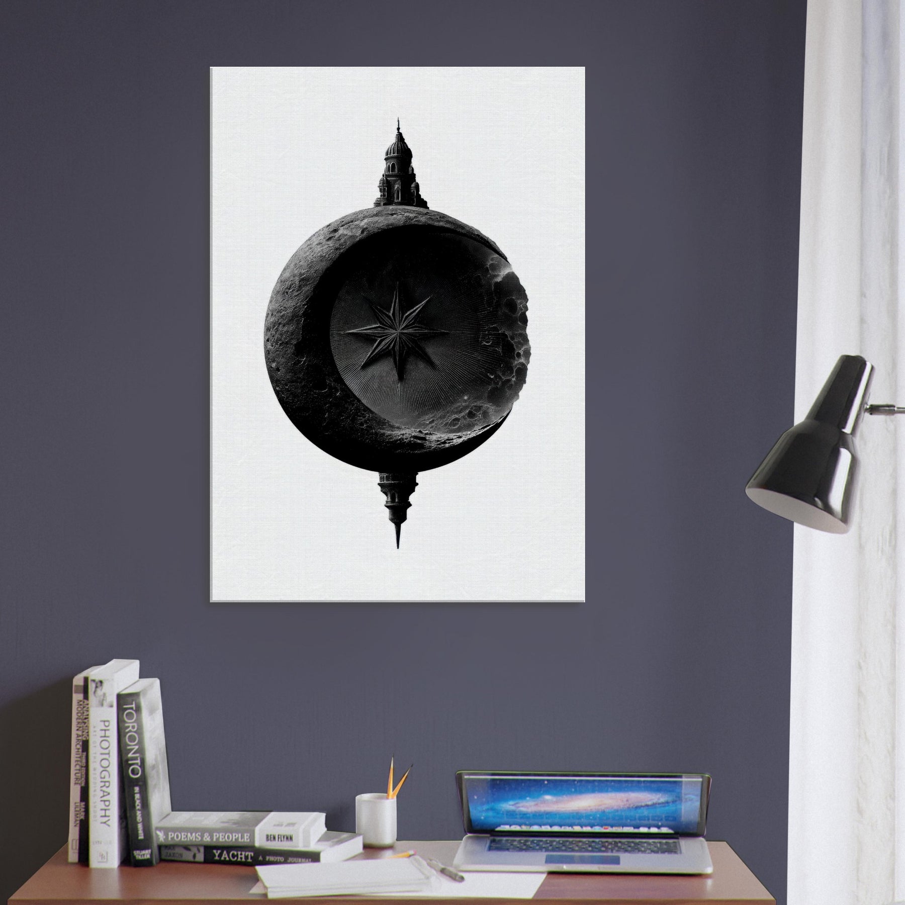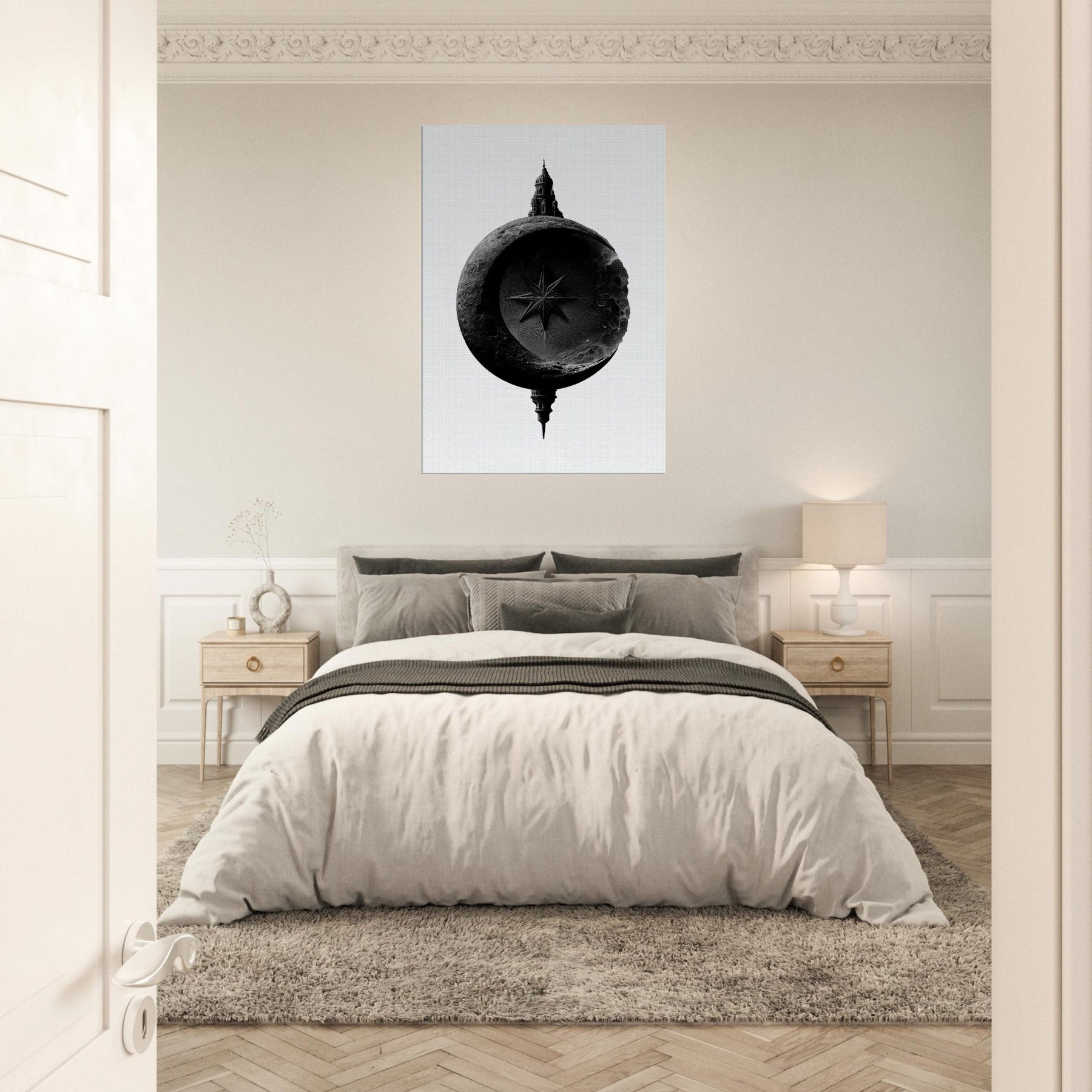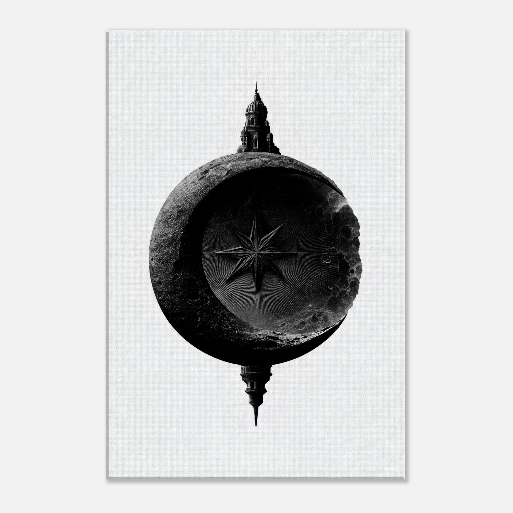 Poised between shadow and light, it speaks in black and white, inviting a moment of stillness in any room. The lunar circle cradles a sharp star while a distant architectural silhouette rises from the rim, suggesting mystery, heritage, and horizon.