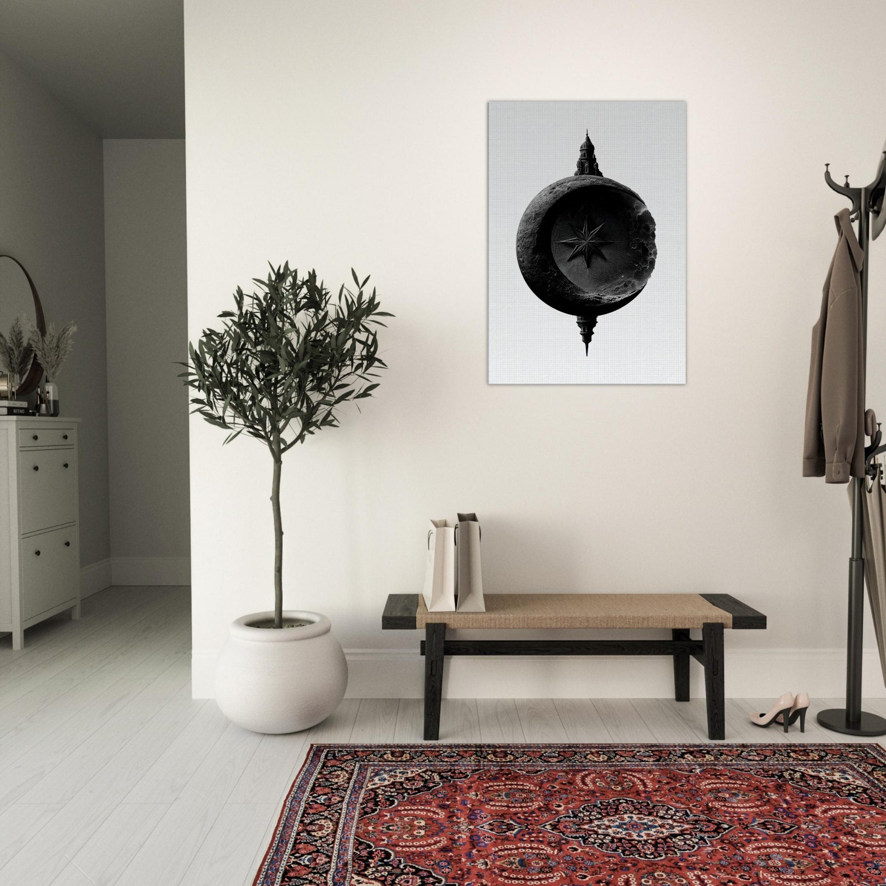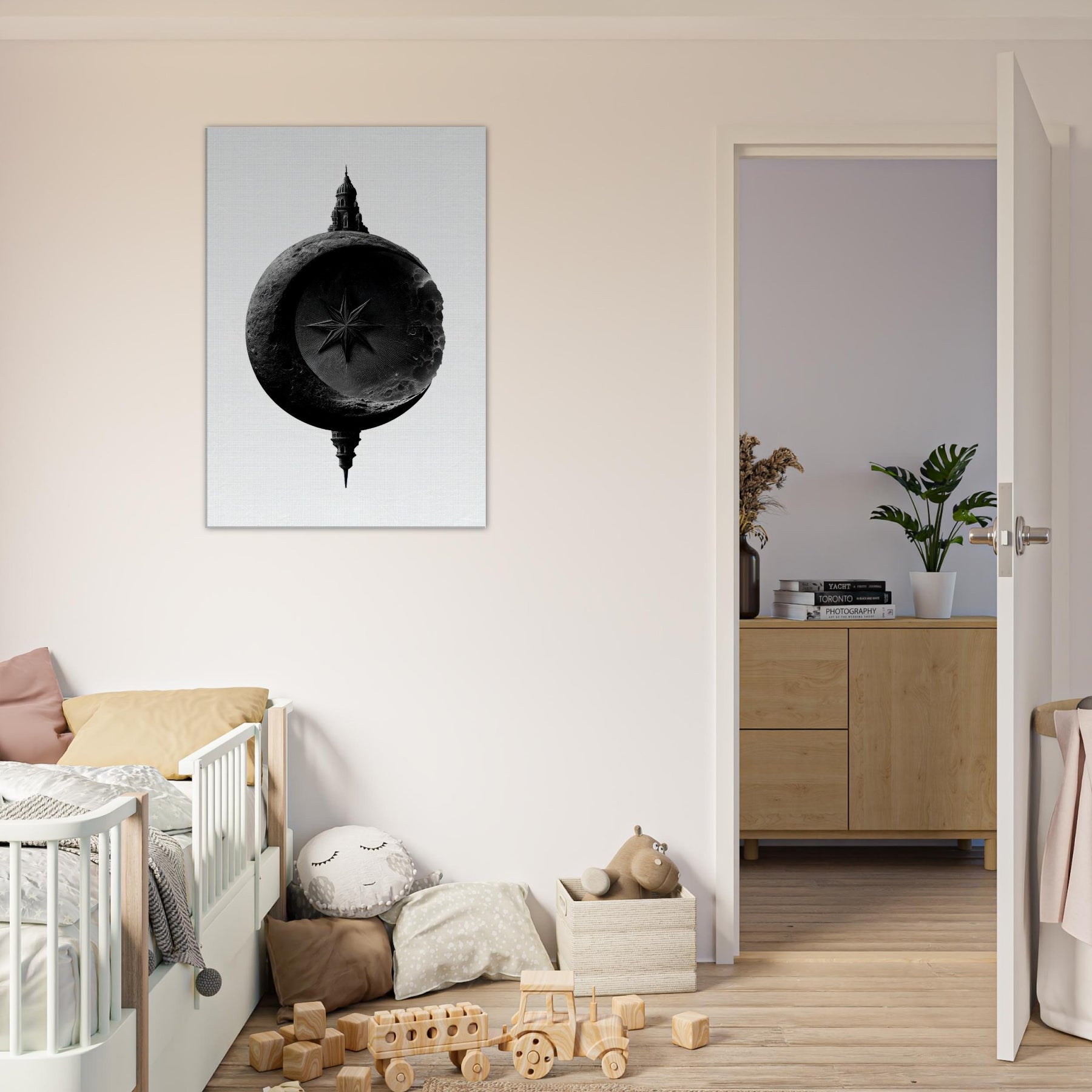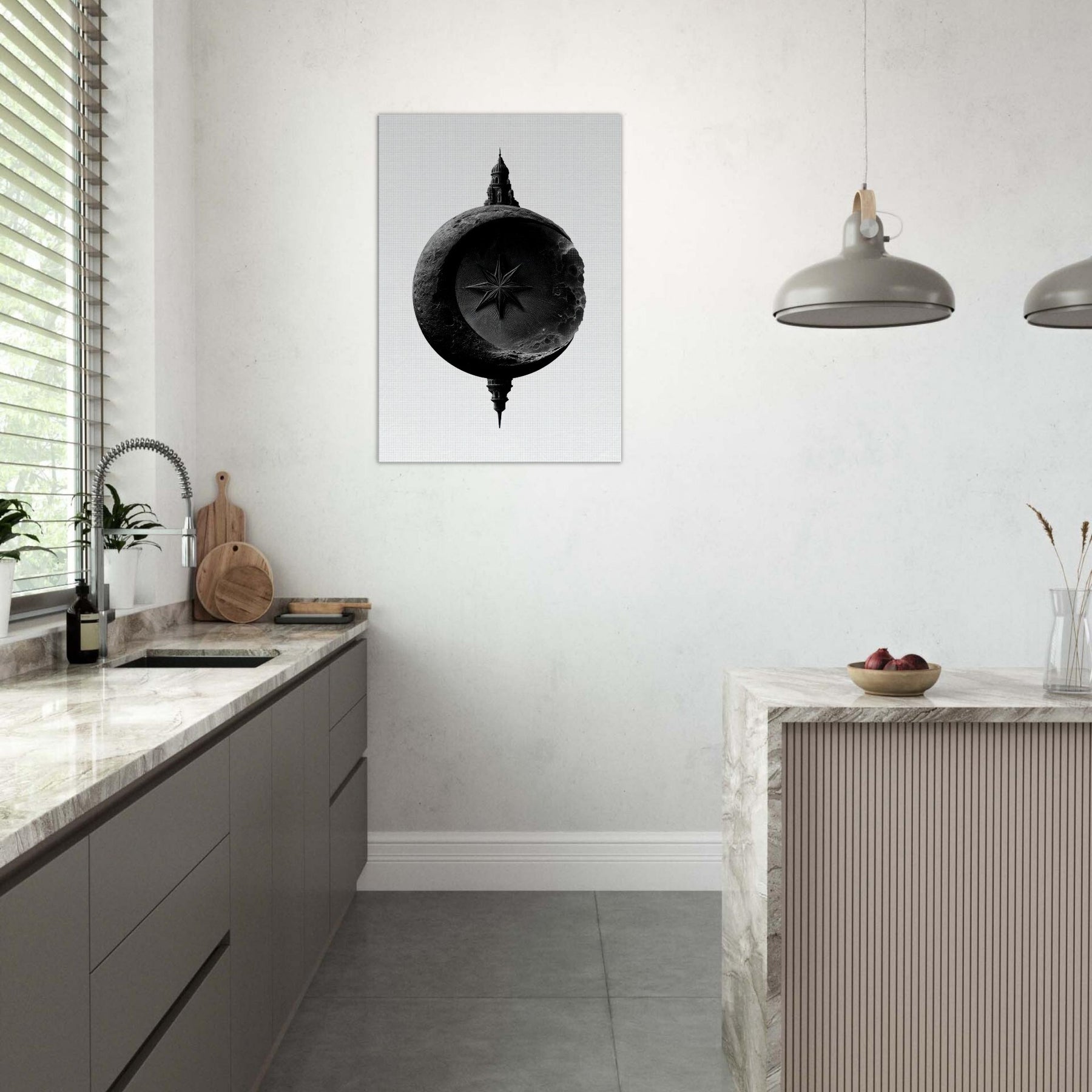 Poised between shadow and light, it speaks in black and white, inviting a moment of stillness in any room. The lunar circle cradles a sharp star while a distant architectural silhouette rises from the rim, suggesting mystery, heritage, and horizon.