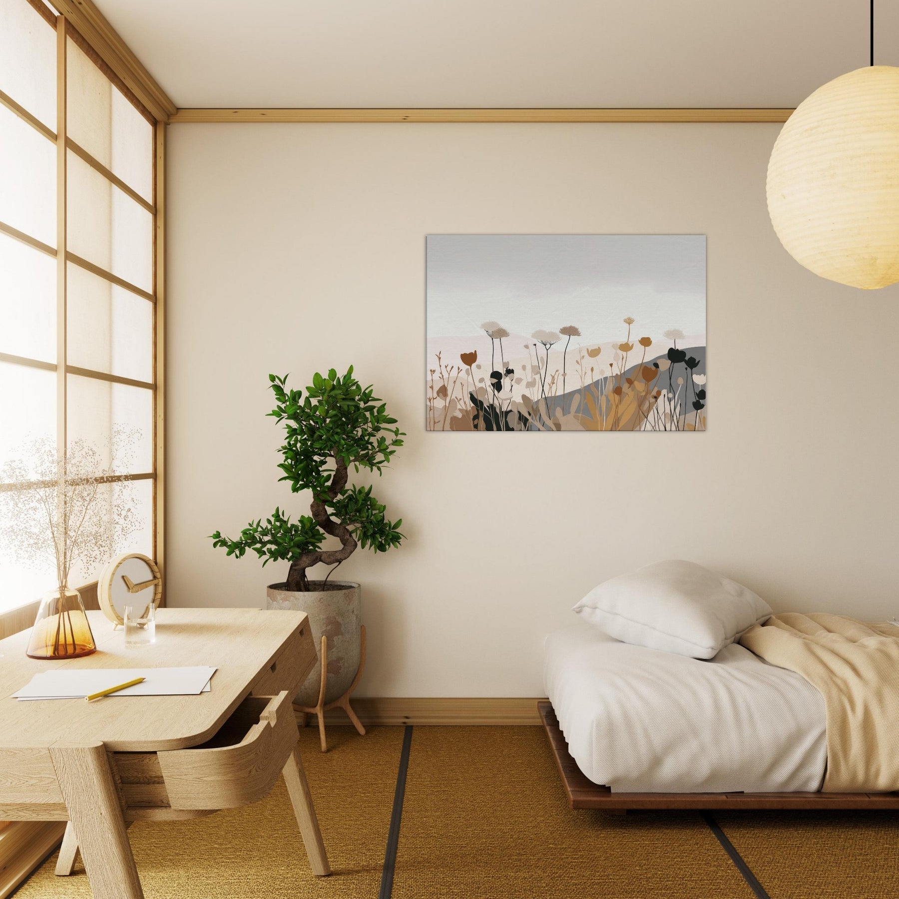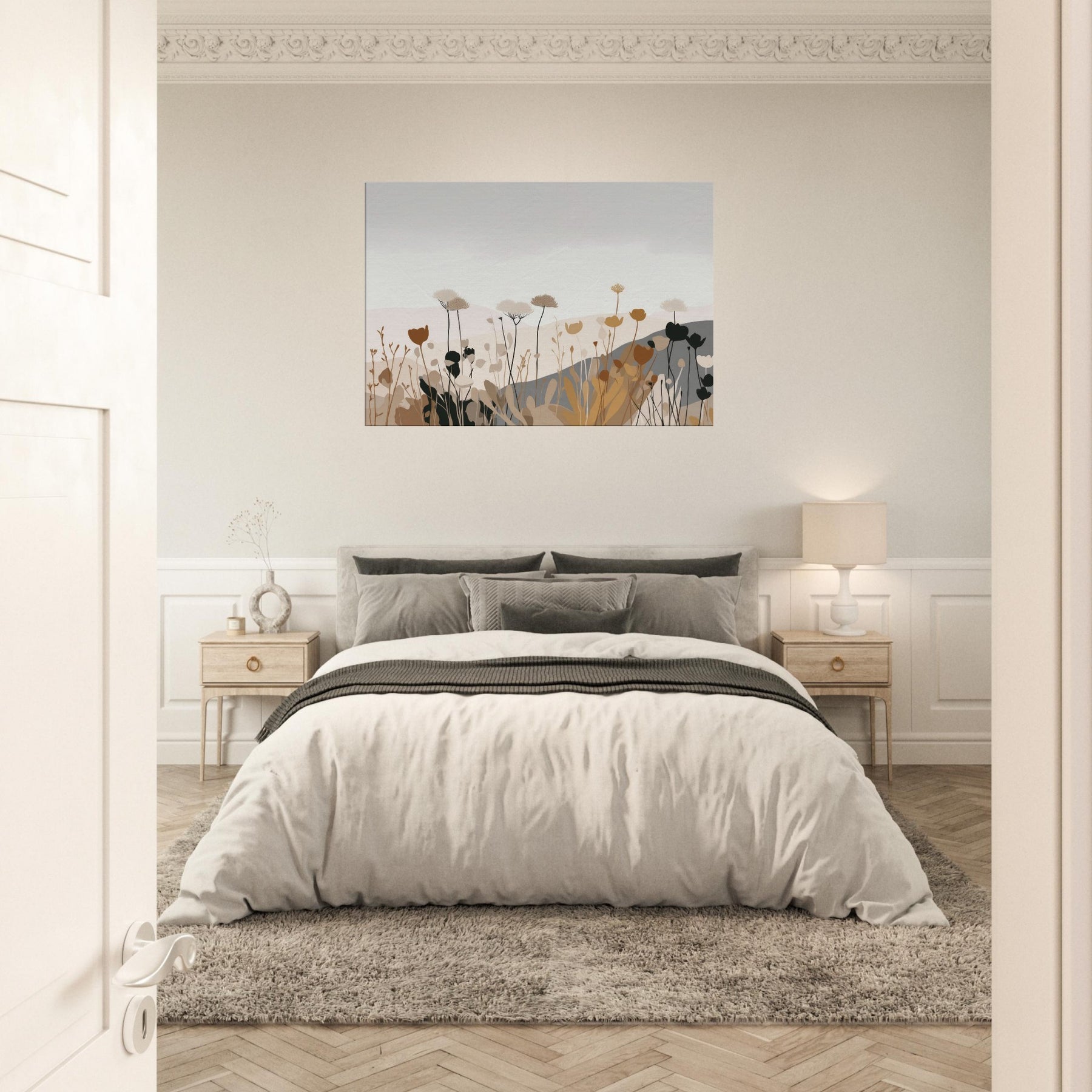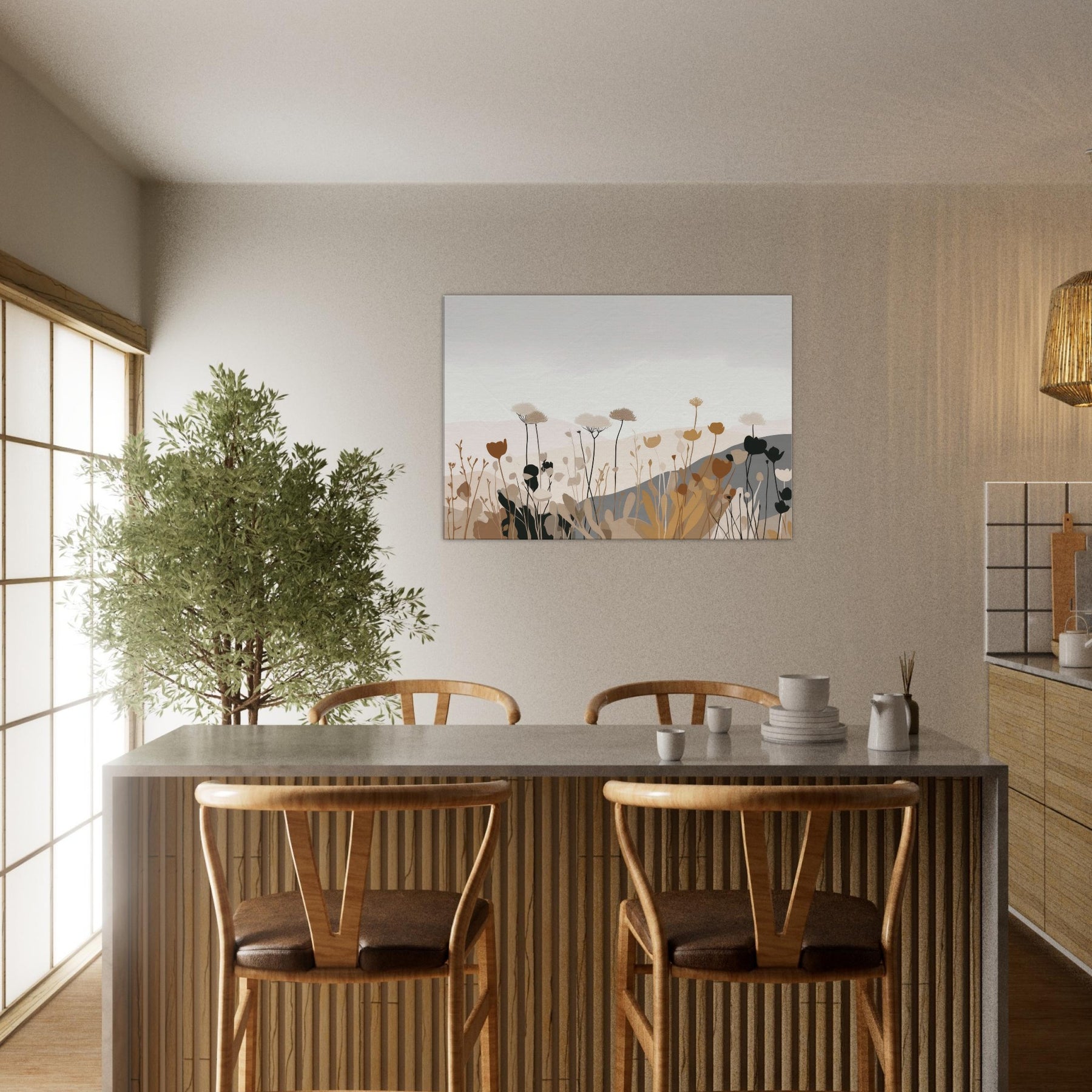 Soft hills, delicate stalks, and a quiet horizon converge in this Flower Field composition. The subtle palette cream, tea, and ash glides across the wall like a morning breath, inviting calm without shouting. The slender stems rise with quiet confidence, turning a room into a breath of open air, a space for reflection and gentle focus. Perfect for living rooms or bedrooms, it lends minimalist elegance and nature’s serene energy to any space seeking clarity and grace.