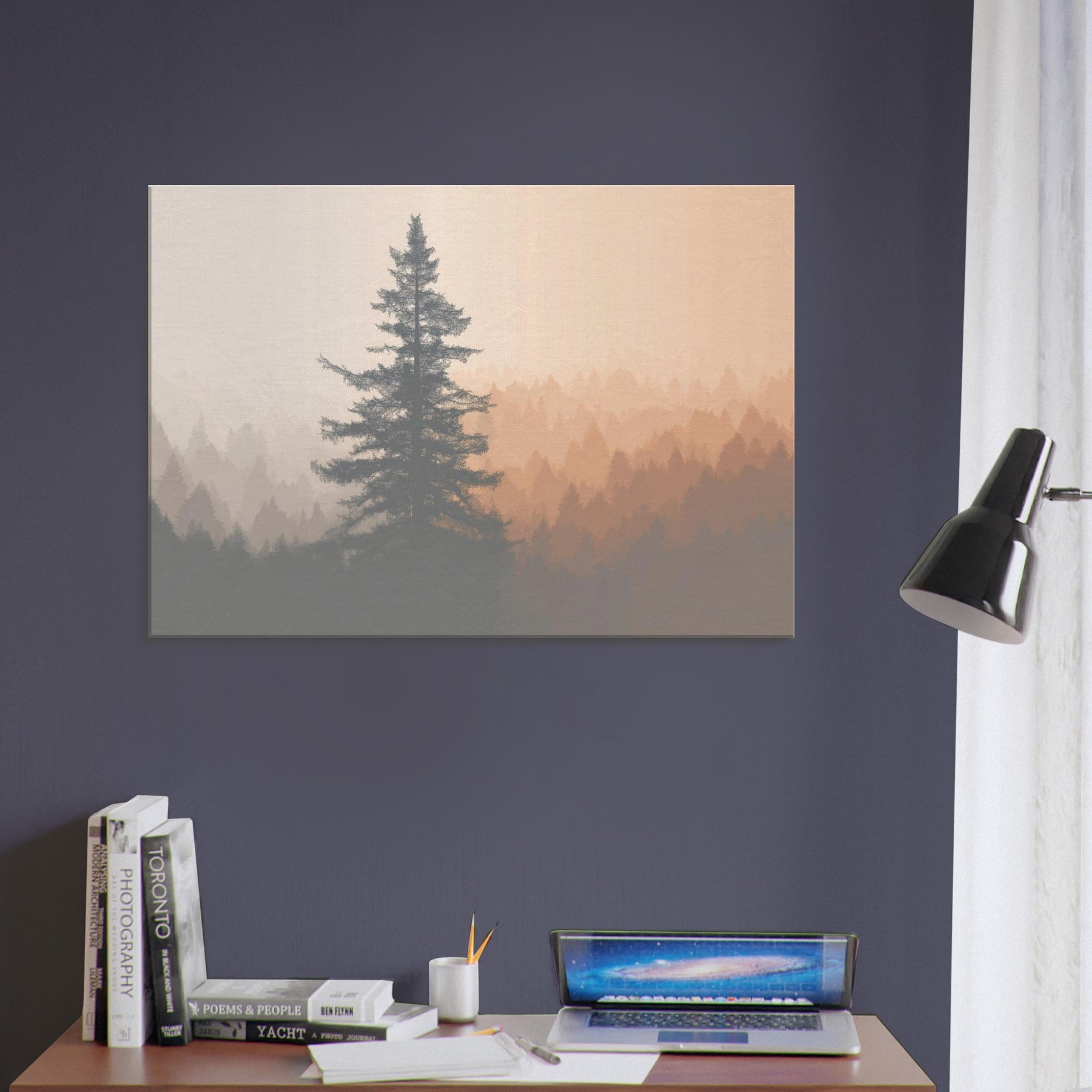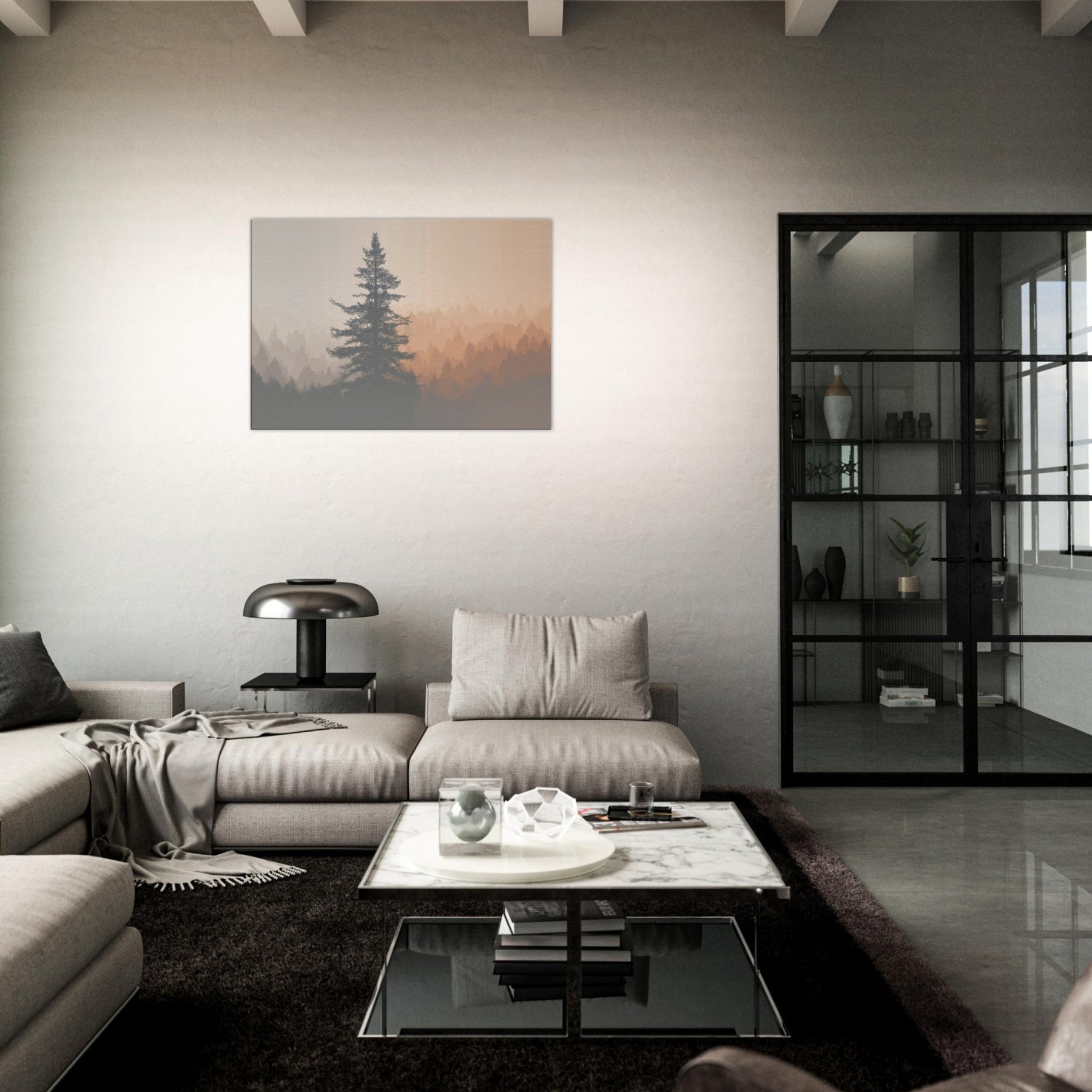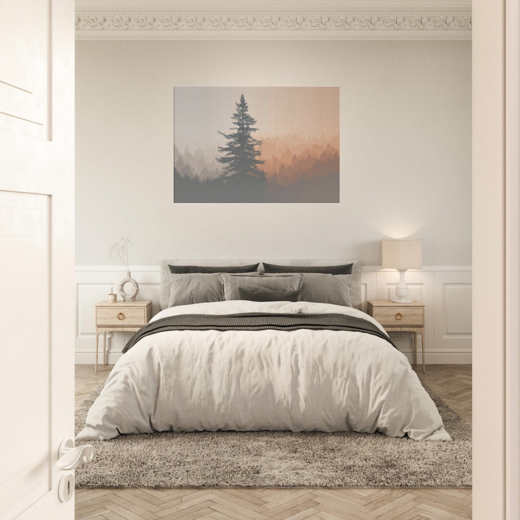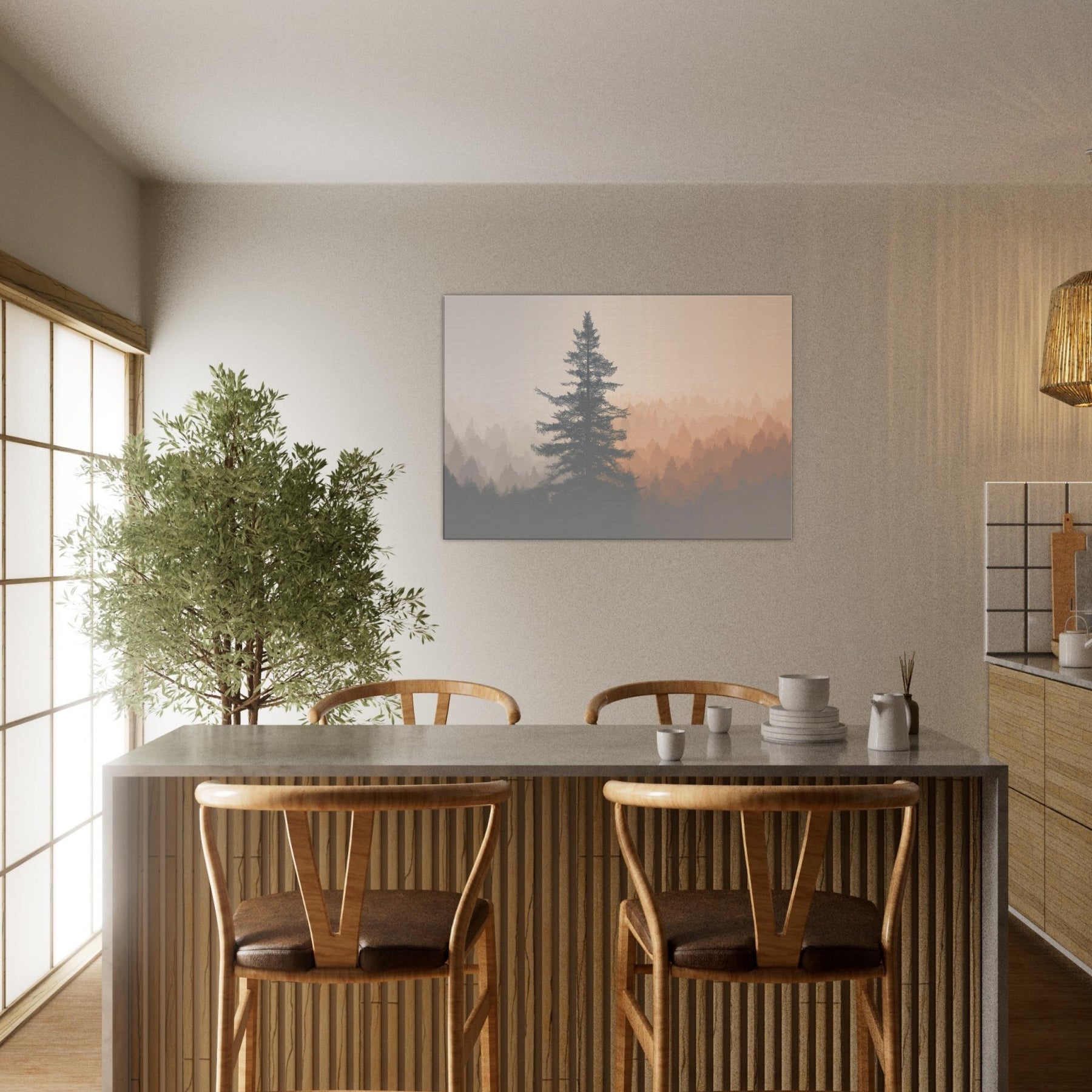 Foggy Forest unfolds in a hush of light, where minimalist tones pare the to a single breath of color. The piece invites the room to breathe soft grays melding with peachy warmth, a quiet horizon that calms the day. In the balance of negative space and delicate silhouettes, the Foggy Forest becomes a sanctuary for contemplation and rest, a subtle centerpiece that elevates a living space with serenity and breathable quiet.