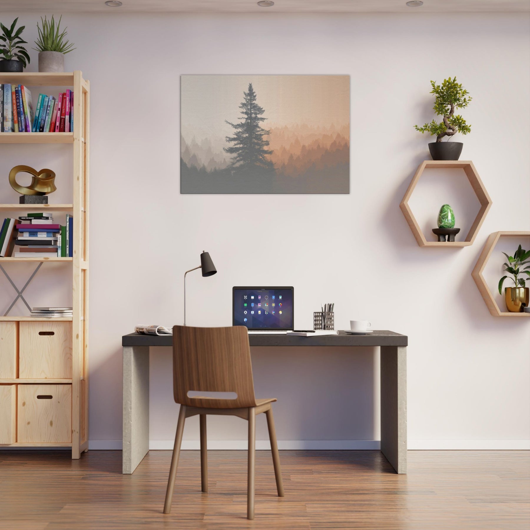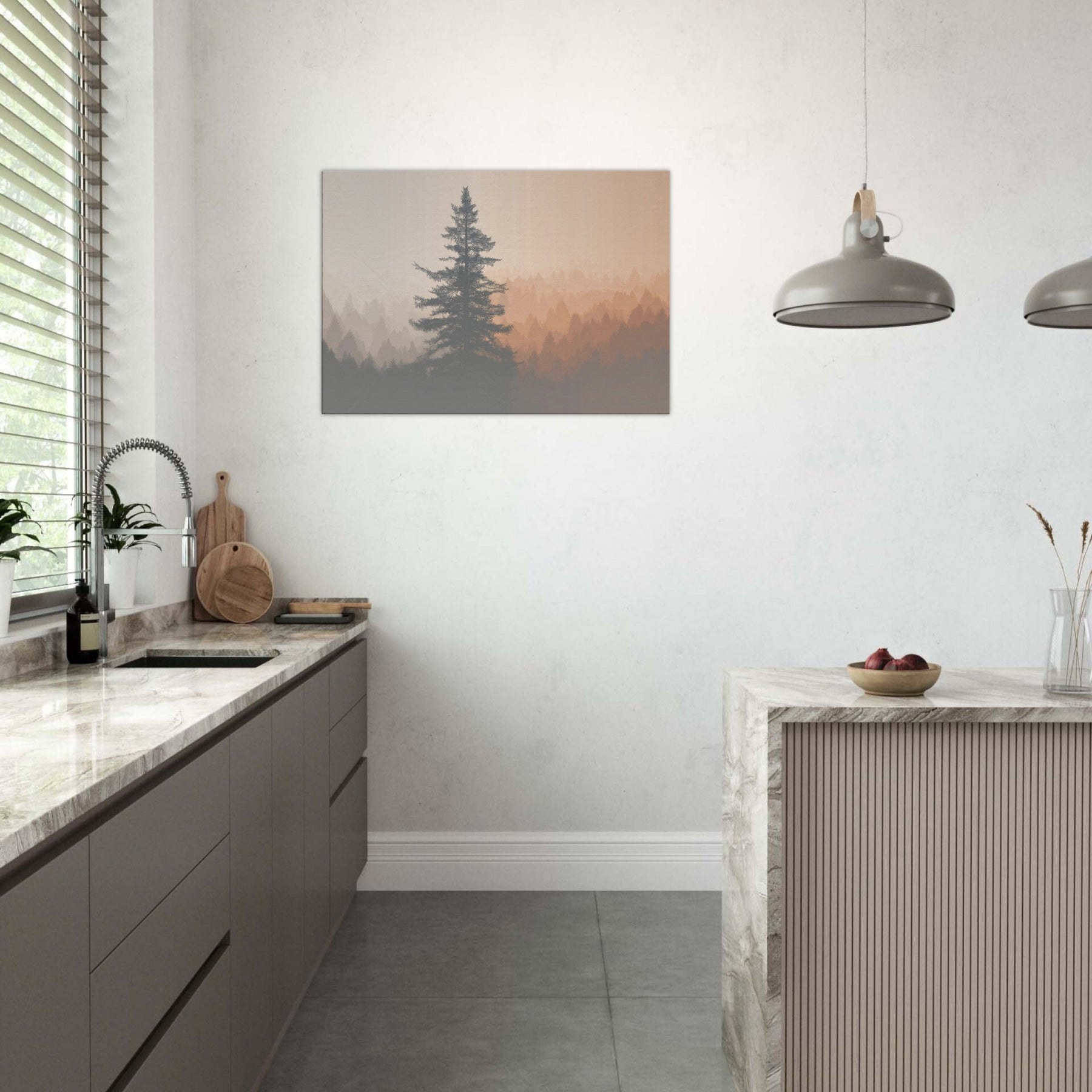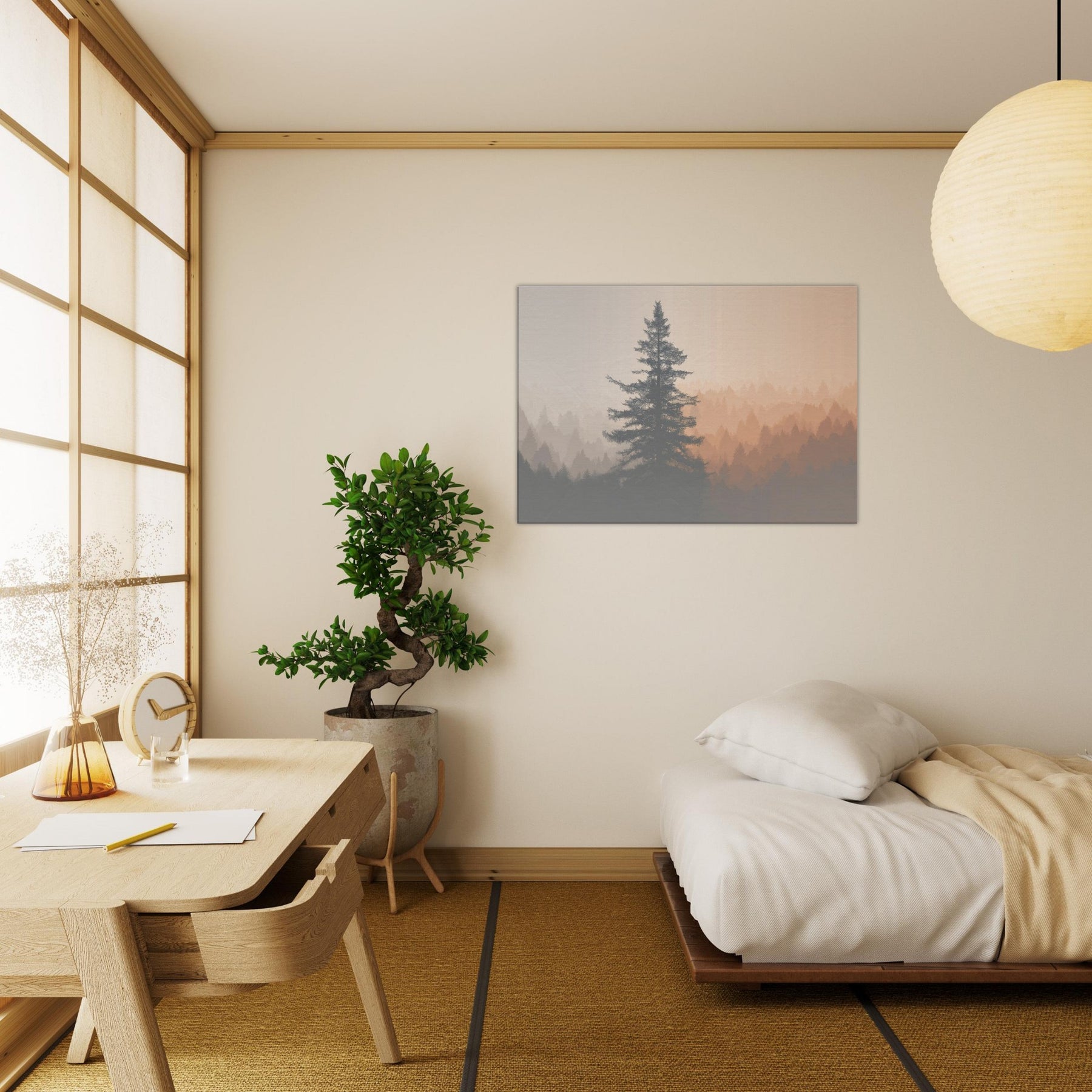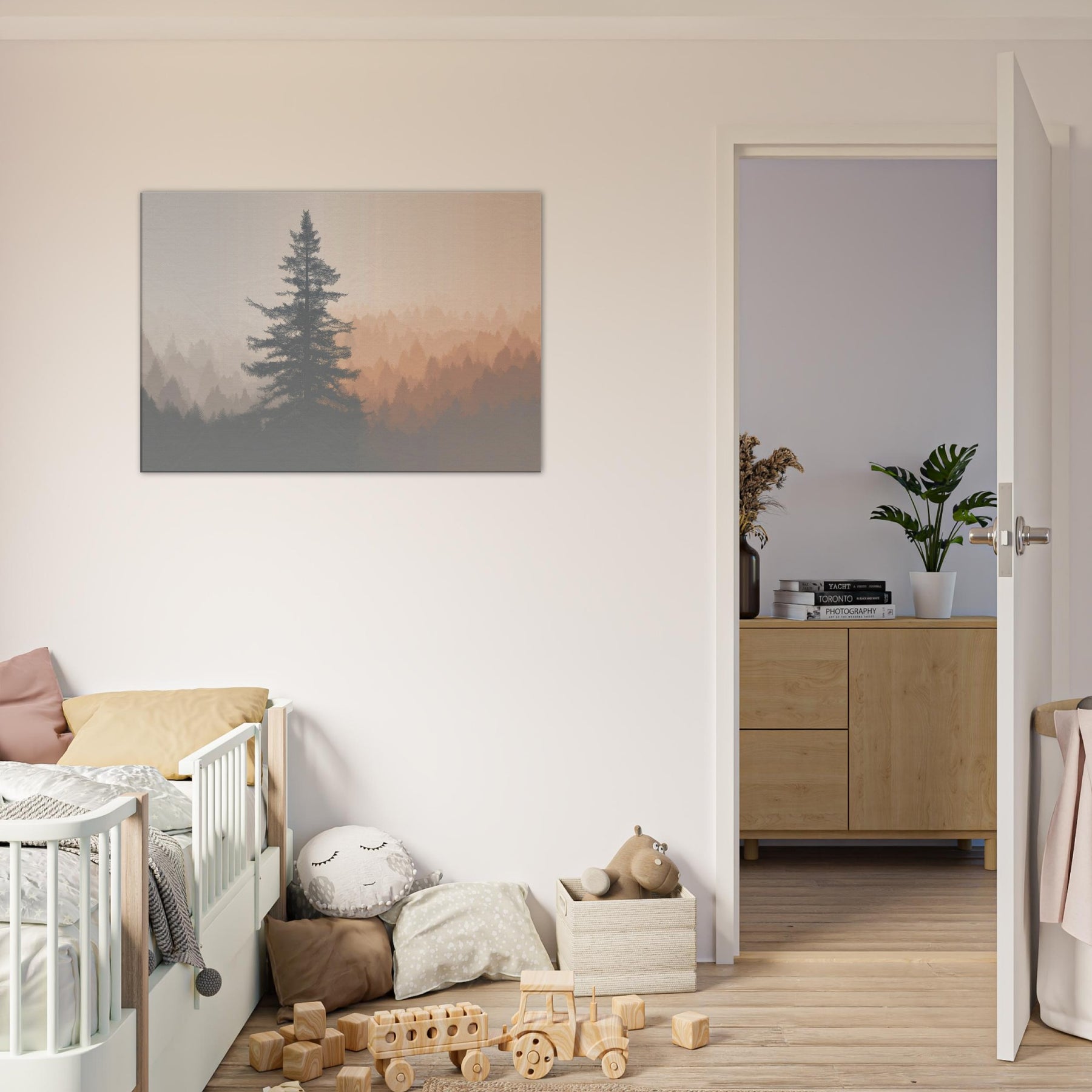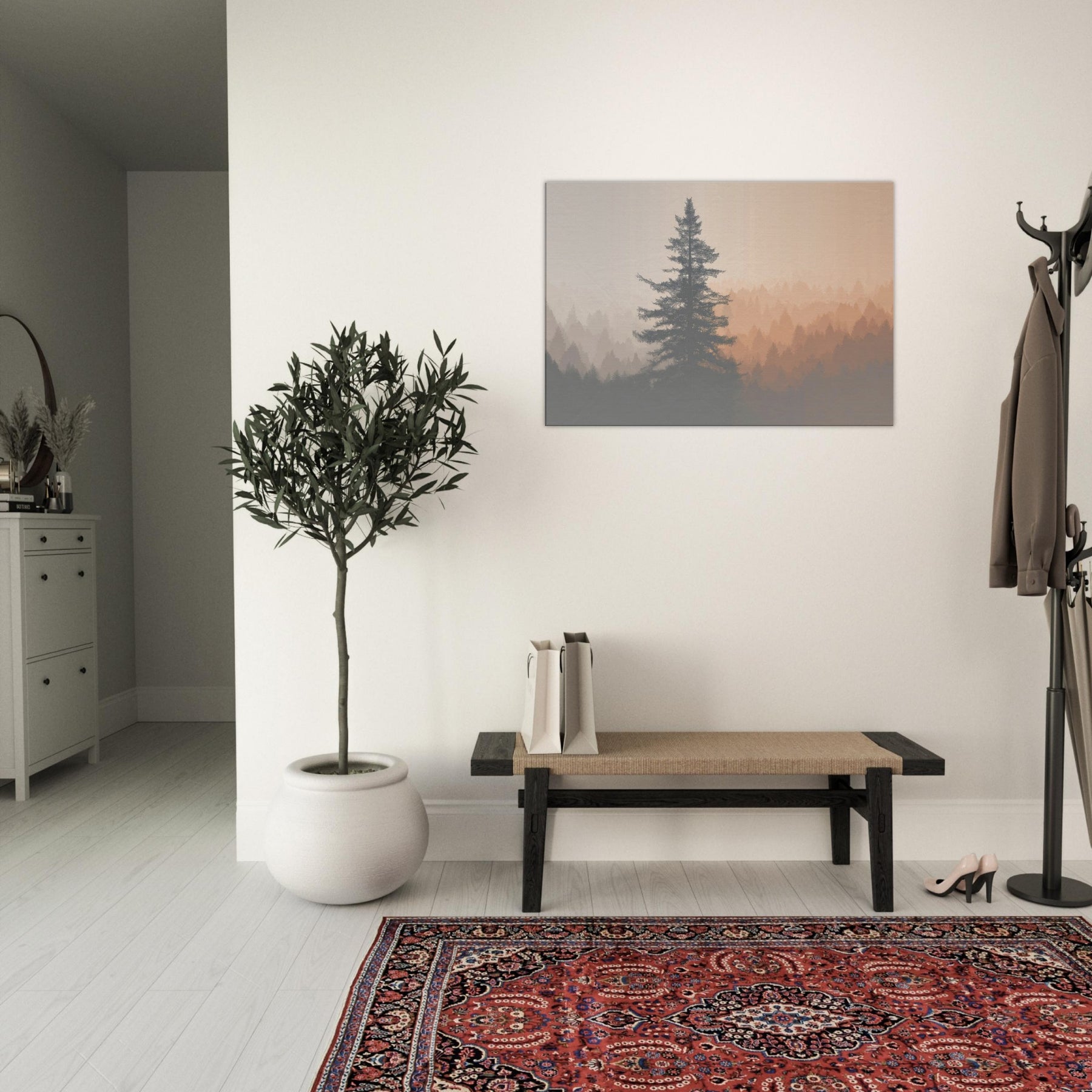 Foggy Forest unfolds in a hush of light, where minimalist tones pare the to a single breath of color. The piece invites the room to breathe soft grays melding with peachy warmth, a quiet horizon that calms the day. In the balance of negative space and delicate silhouettes, the Foggy Forest becomes a sanctuary for contemplation and rest, a subtle centerpiece that elevates a living space with serenity and breathable quiet.