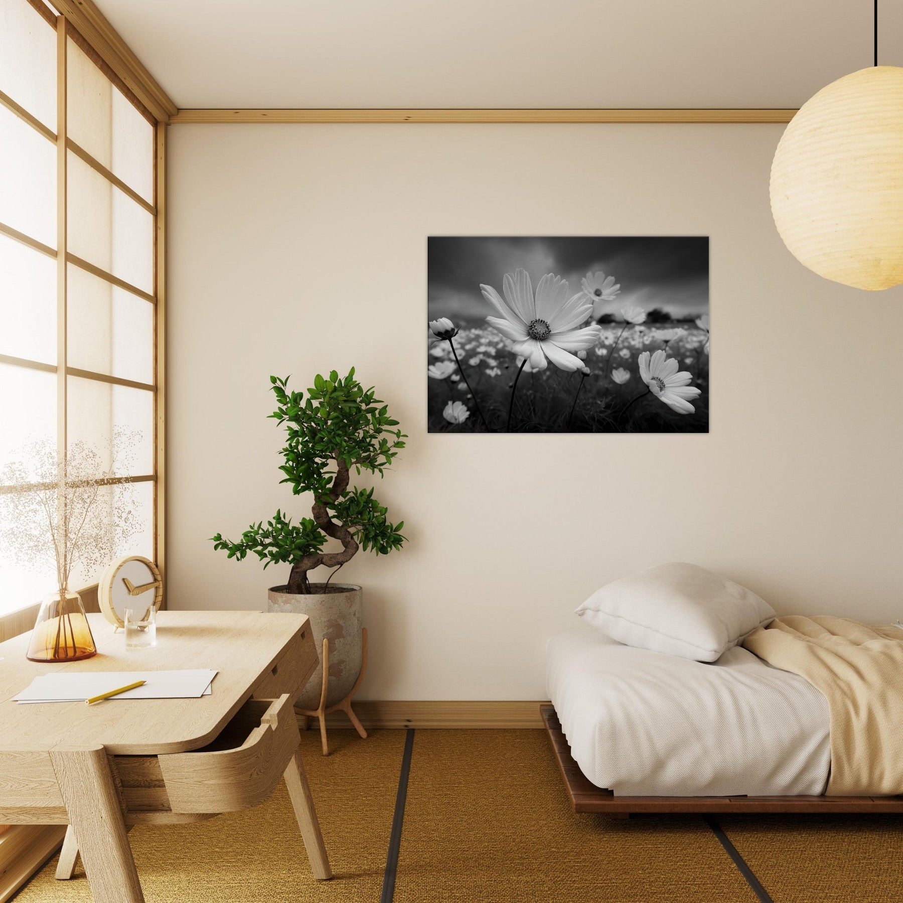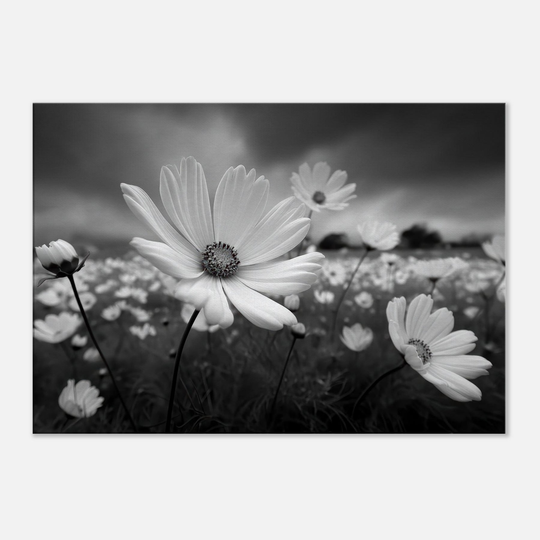 Immerse your space in a quiet field of time, where the Primary Subject unfolds in soft grayscale. This black and white composition captures the petals' tremble and the field's distant hush, inviting calm, focus, and a touch of drama to everyday life.