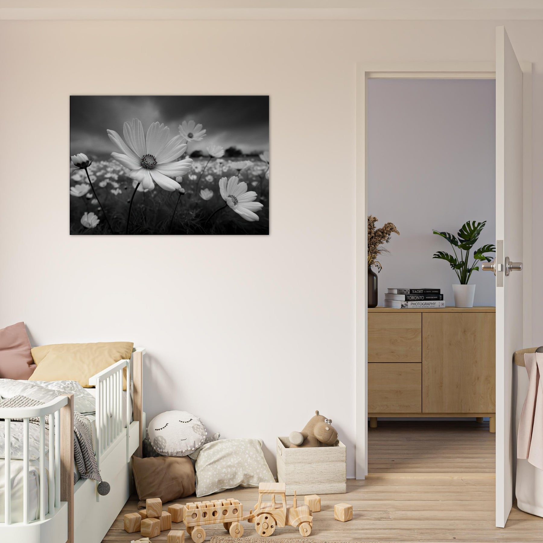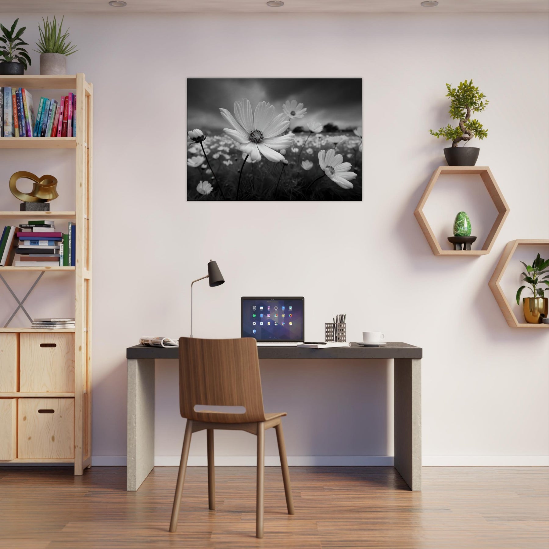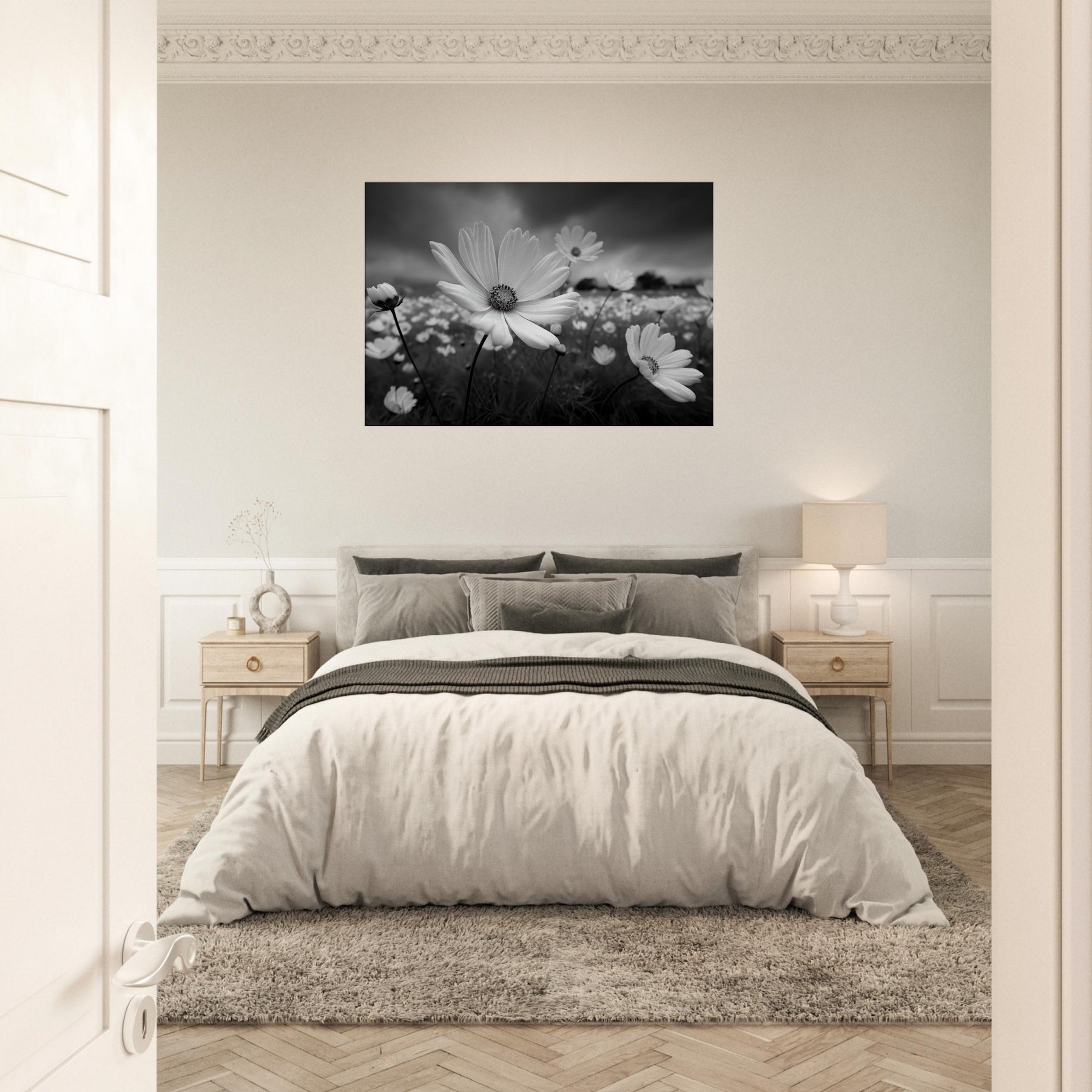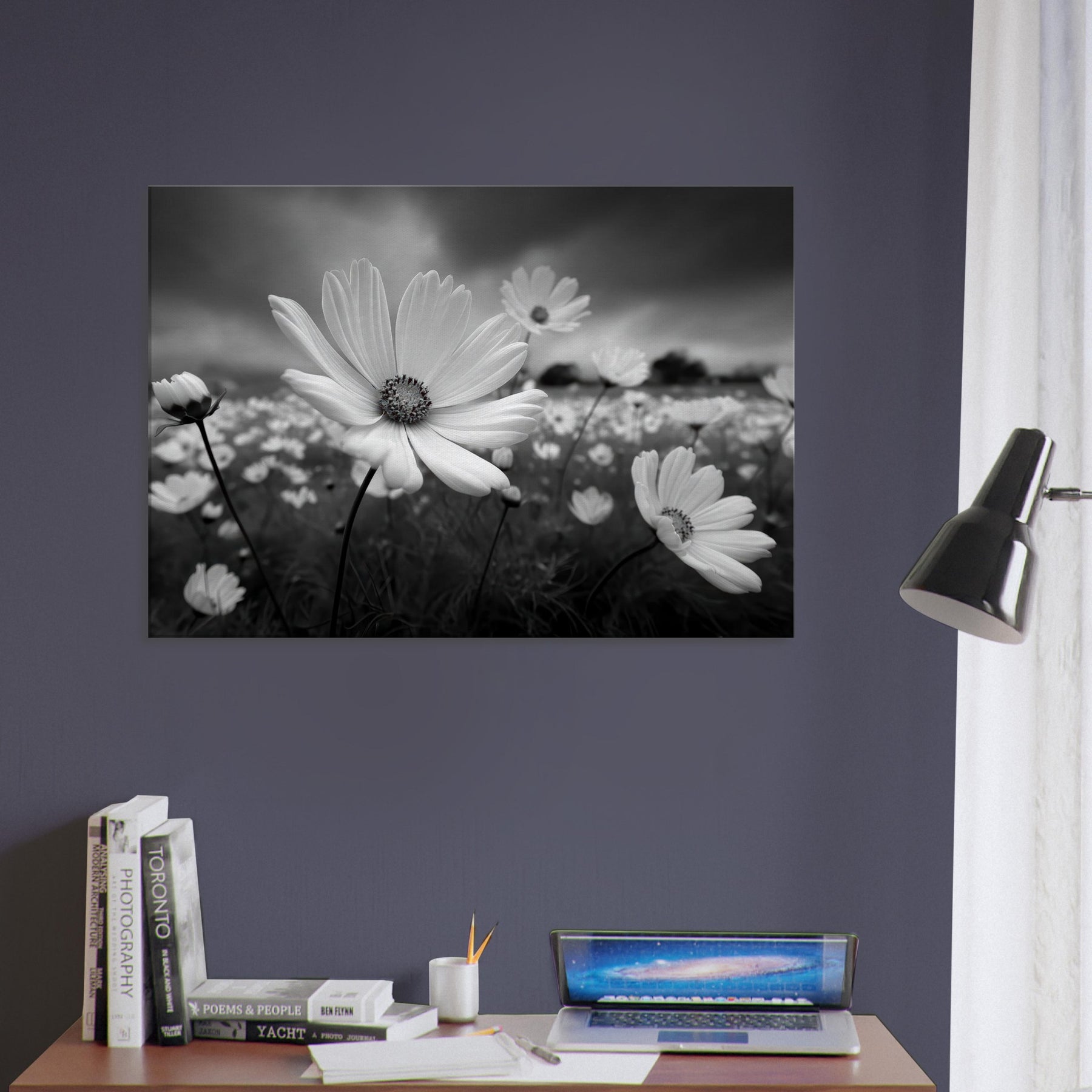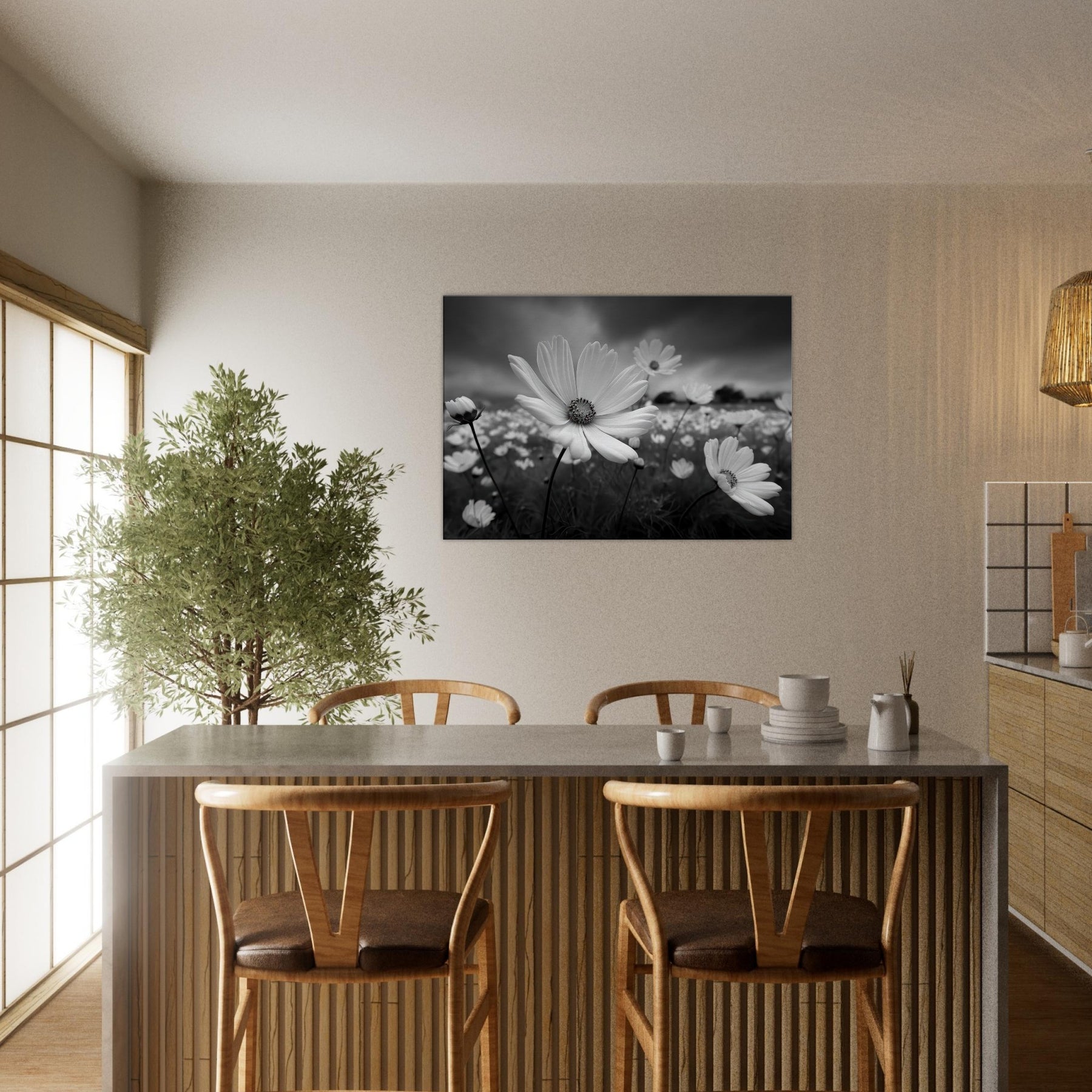 The absence of color heightens texture, the slender stems, the radiating petals, and the moody sky, creating a centerpiece that feels both serene and cinematic. Perfect above a sofa or in a hallway, it anchors the room with lyrical clarity.