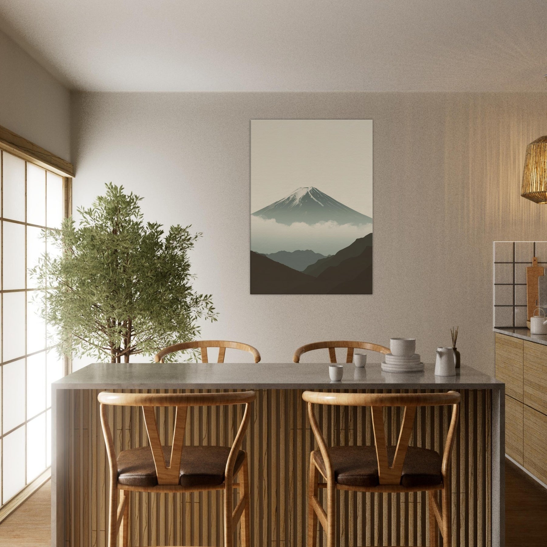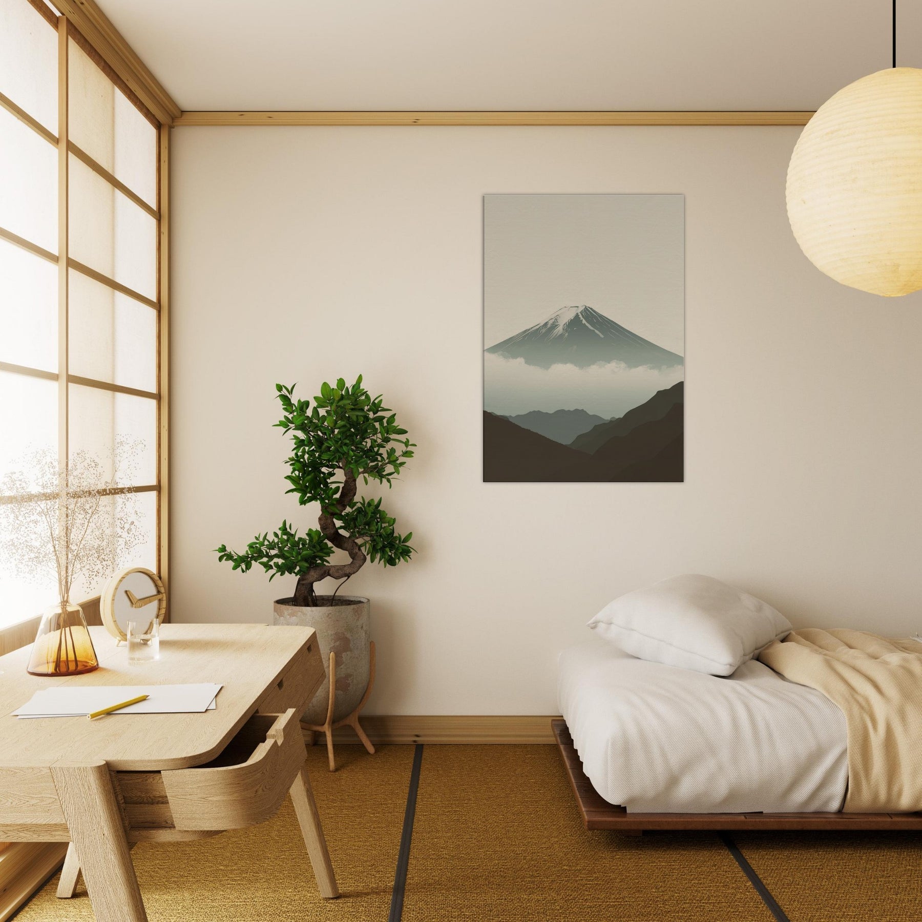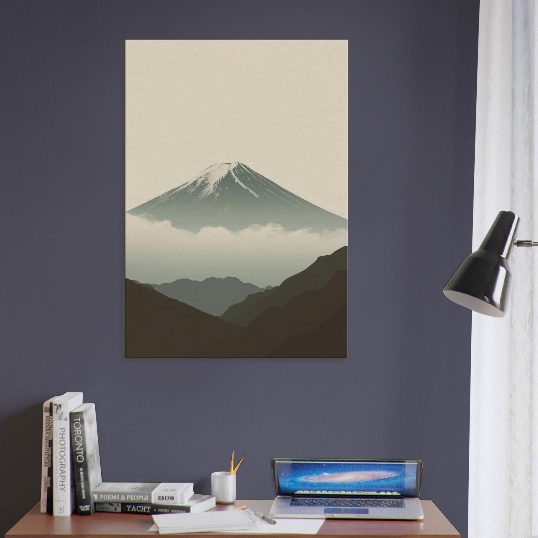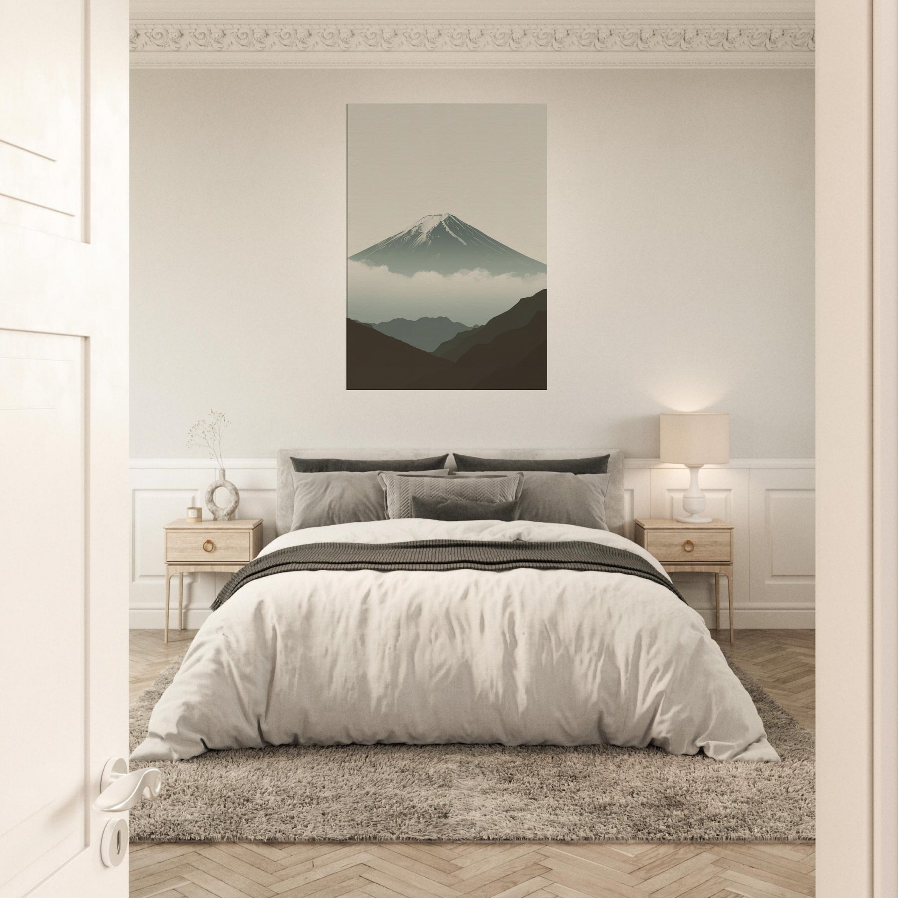 Mount Fuji rises in quiet majesty, rendered in clean lines and a hush of soft tones that invite stillness into your space. The composition breathes with misty clouds and distant ridges, creating a sense of depth without crowding the room. This wall art infuses a living area with calm, contemplative rhythm, a focal point for evenings, mornings, and thoughtful conversations. Perfect for a serene bedroom, an airy hallway, or a minimalist living room, it partners with neutrals to elevate every moment.