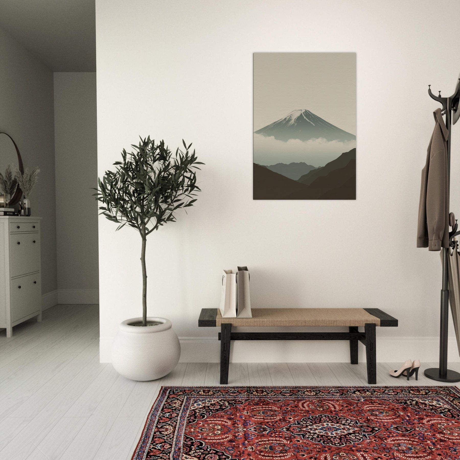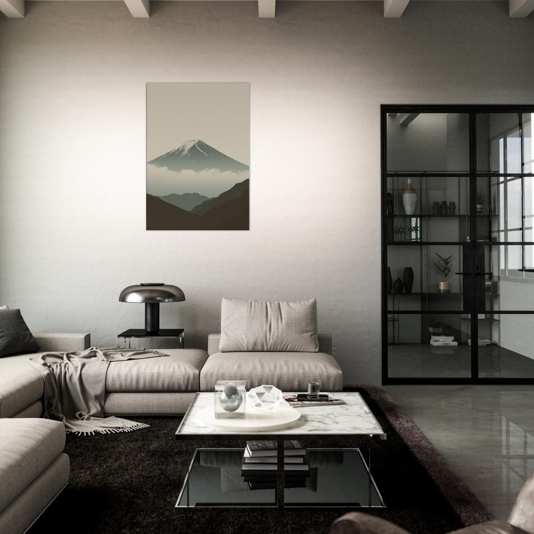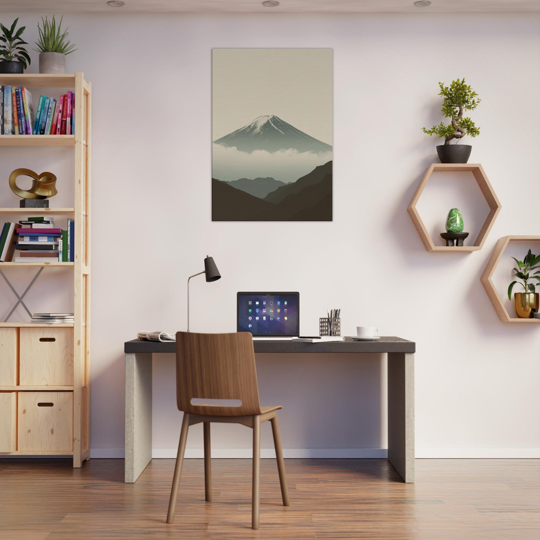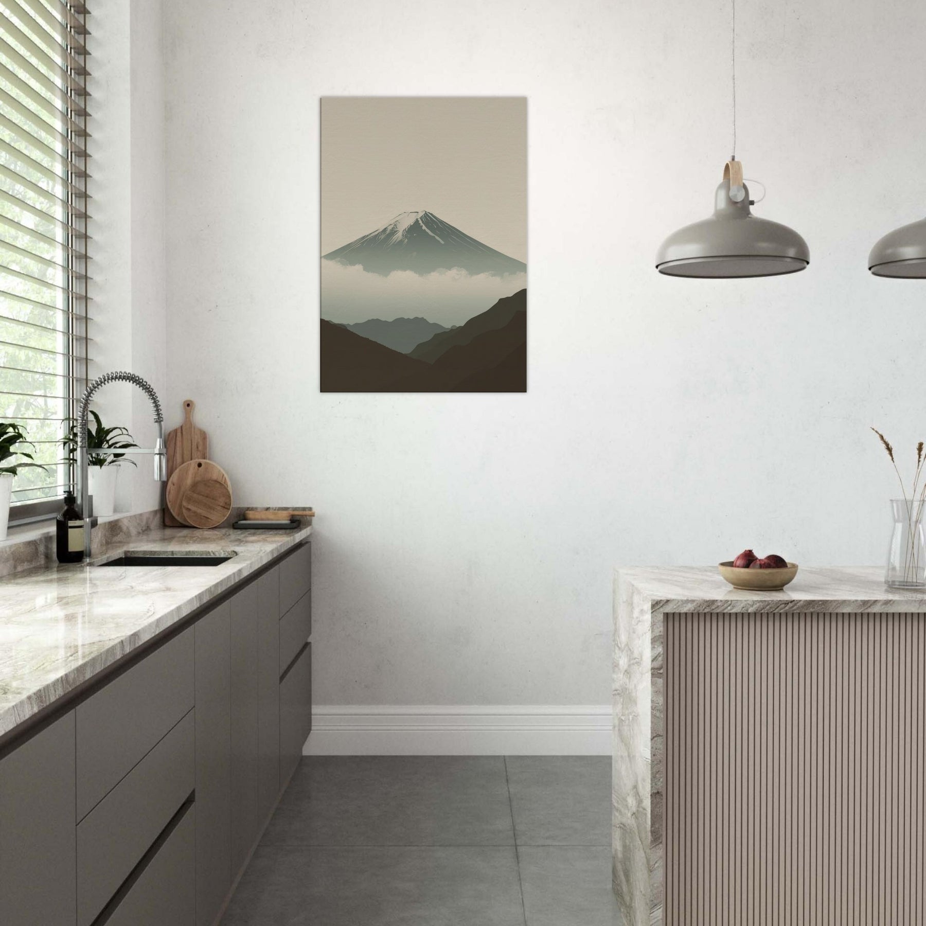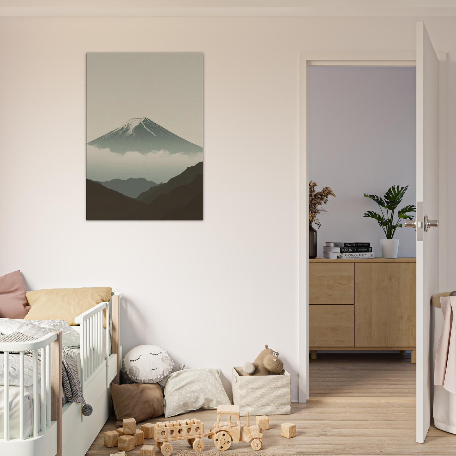 Mount Fuji rises in quiet majesty, rendered in clean lines and a hush of soft tones that invite stillness into your space. The composition breathes with misty clouds and distant ridges, creating a sense of depth without crowding the room. This wall art infuses a living area with calm, contemplative rhythm, a focal point for evenings, mornings, and thoughtful conversations. Perfect for a serene bedroom, an airy hallway, or a minimalist living room, it partners with neutrals to elevate every moment.