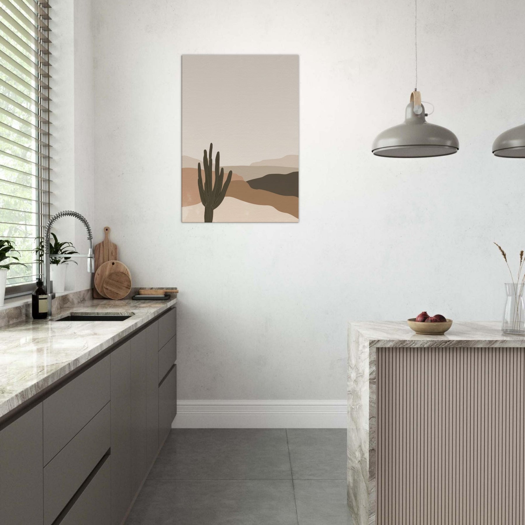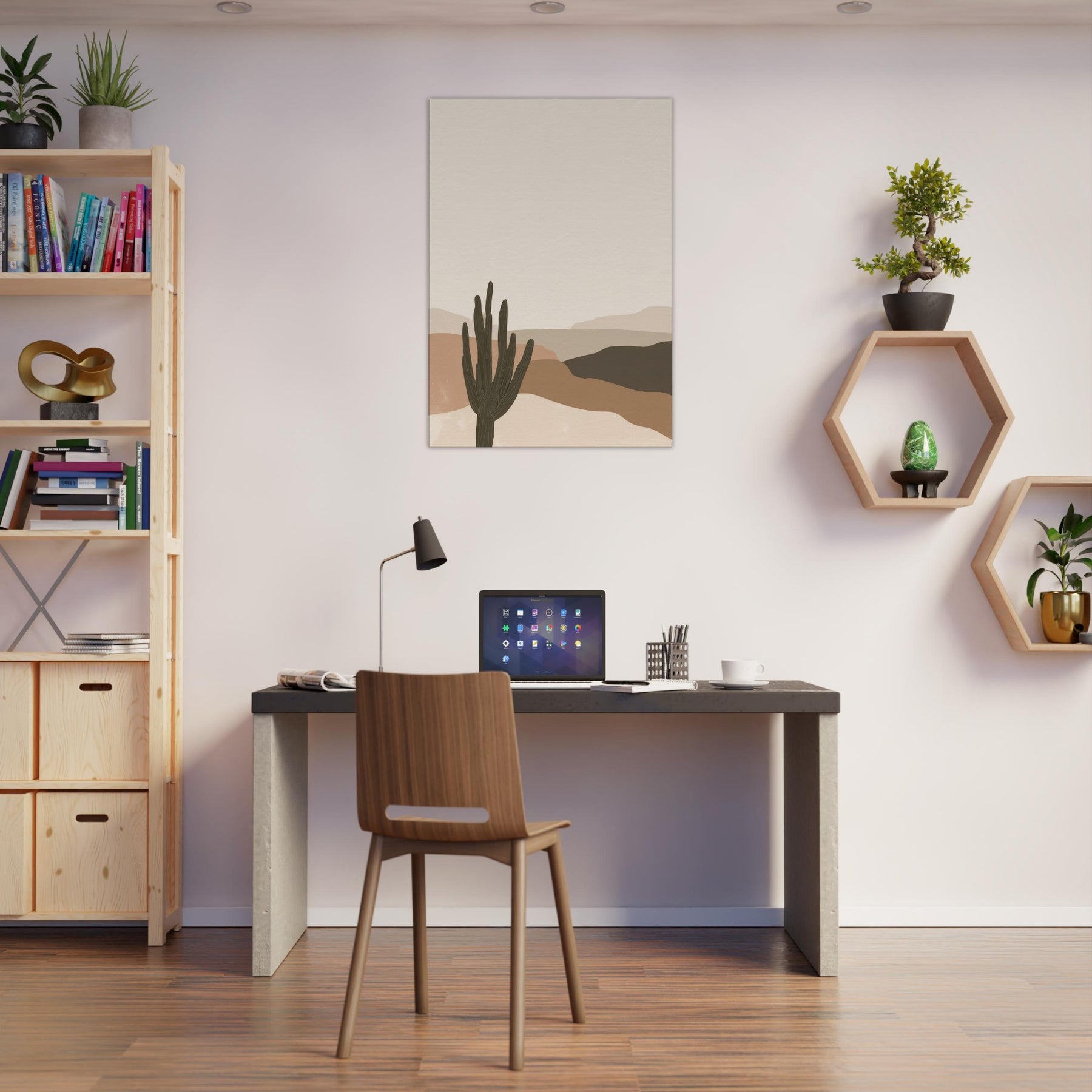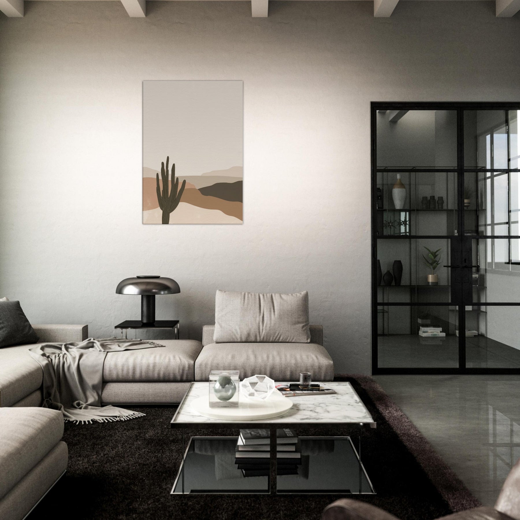Mediate on quiet horizon and warm mineral light. This Desert minimalist study unfolds across soft sands and a solitary cactus, inviting stillness into your living room or bedroom. The composition breathes with spacious negative space, letting color and texture shimmer like heat rising off a dune at dusk. Its serene mood pairs with sculptural edges and muted earth tones, turning any wall into a sanctuary where conversations slow and ideas flow as gently as a desert breeze.