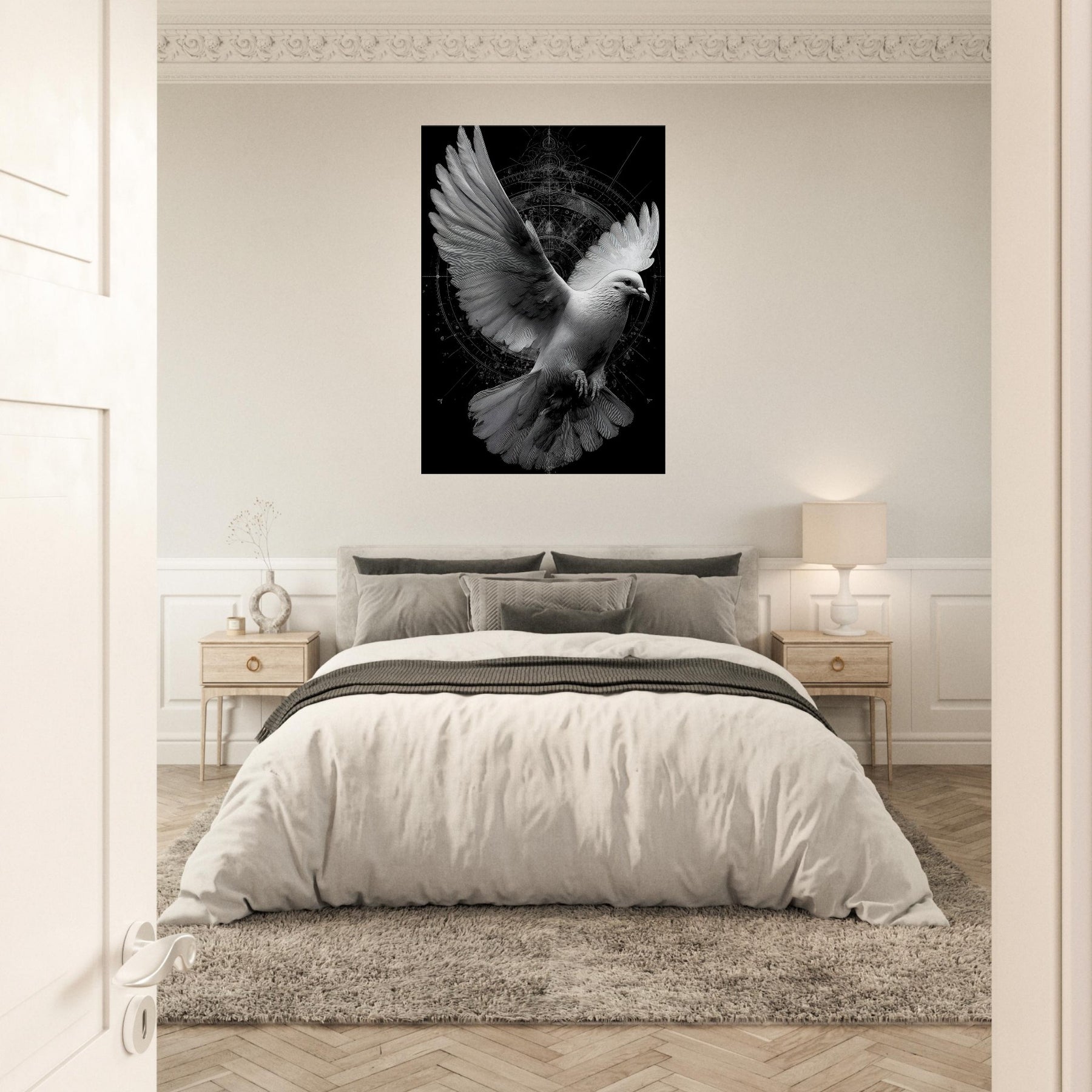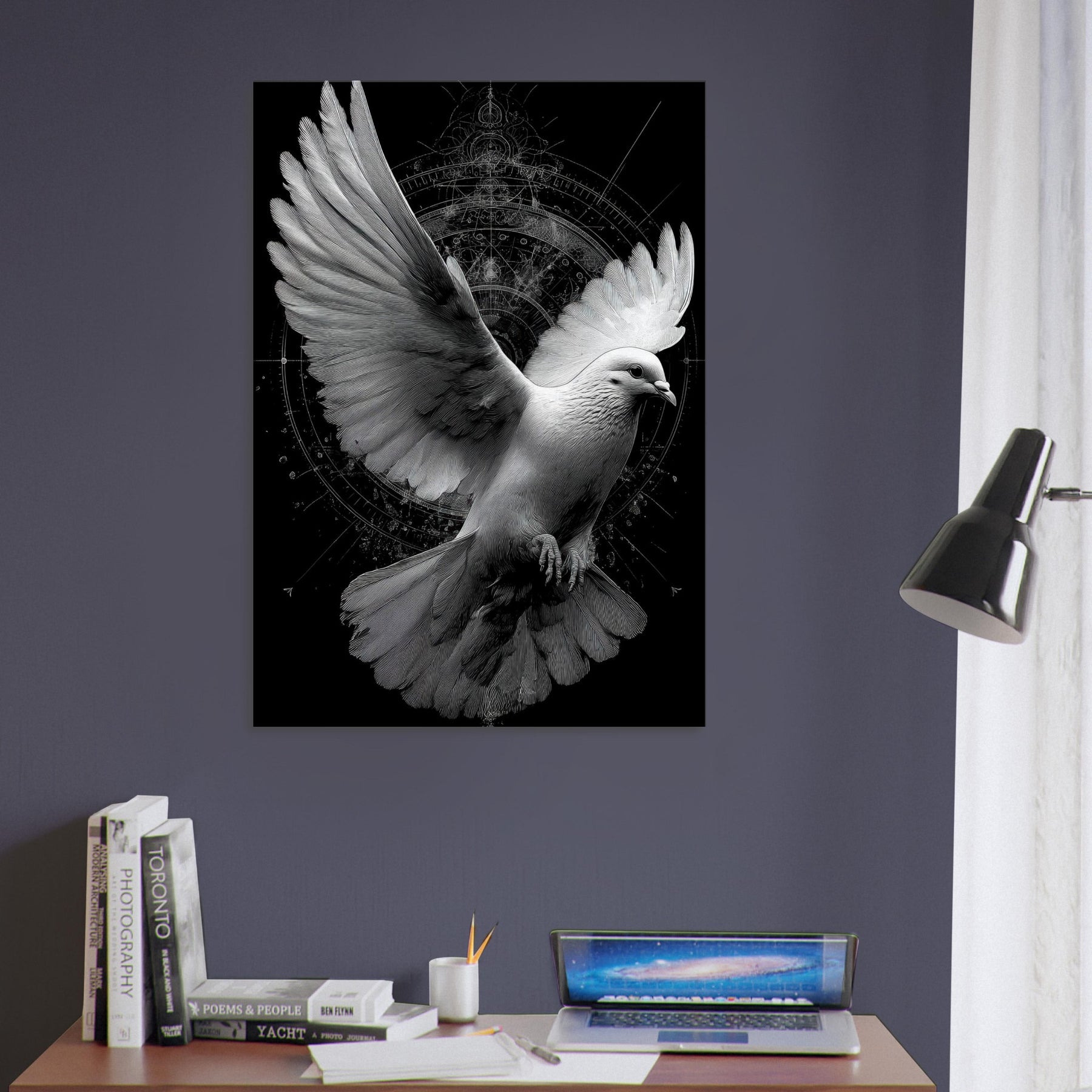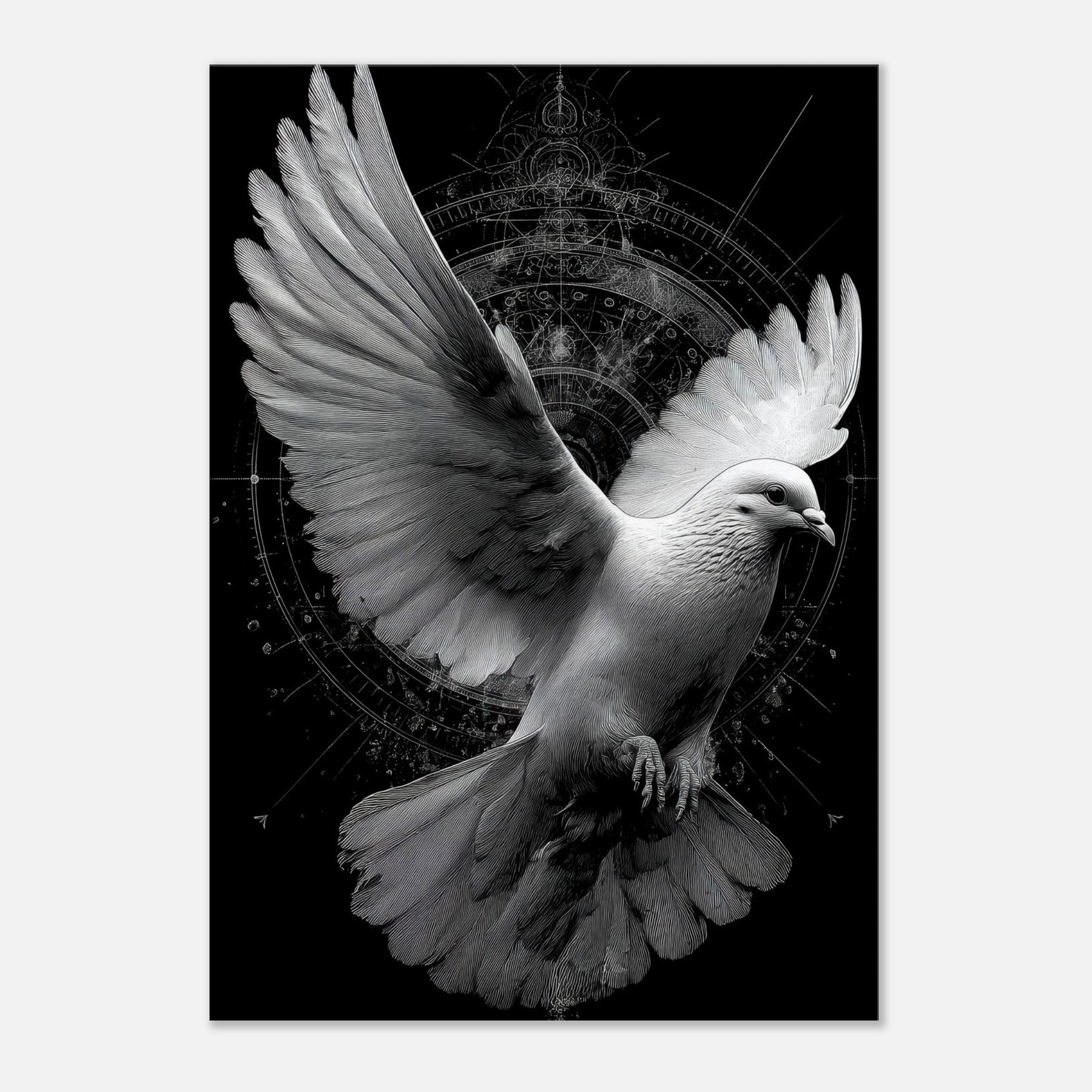 Embrace stillness with the Dove of Peace, rendered in stark black and white as if etched in moonlight. The mystical bird glides through a lattice of celestial circles, its feathers catching the night air in soft, glistening detail.