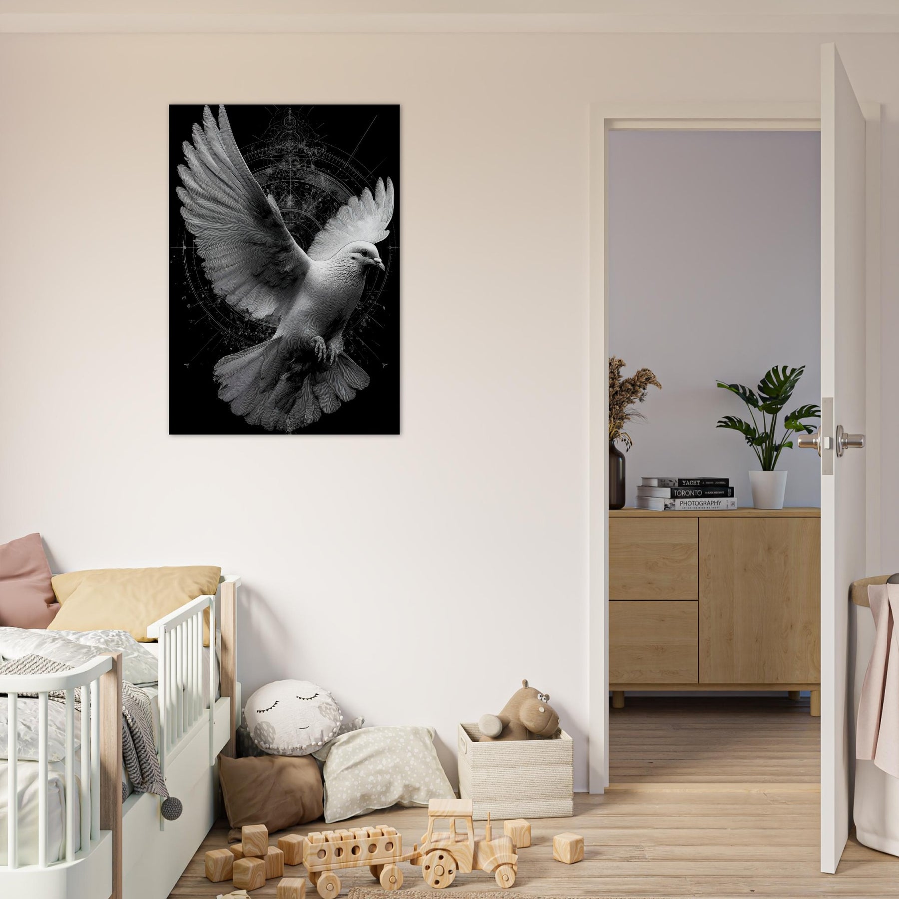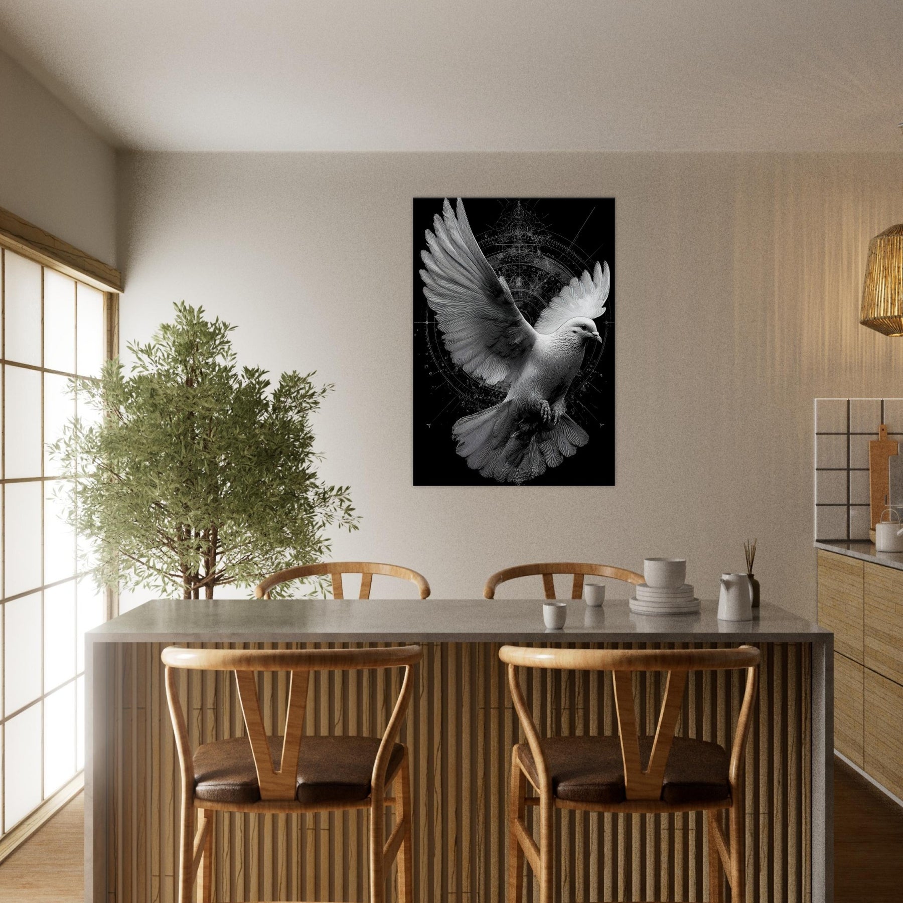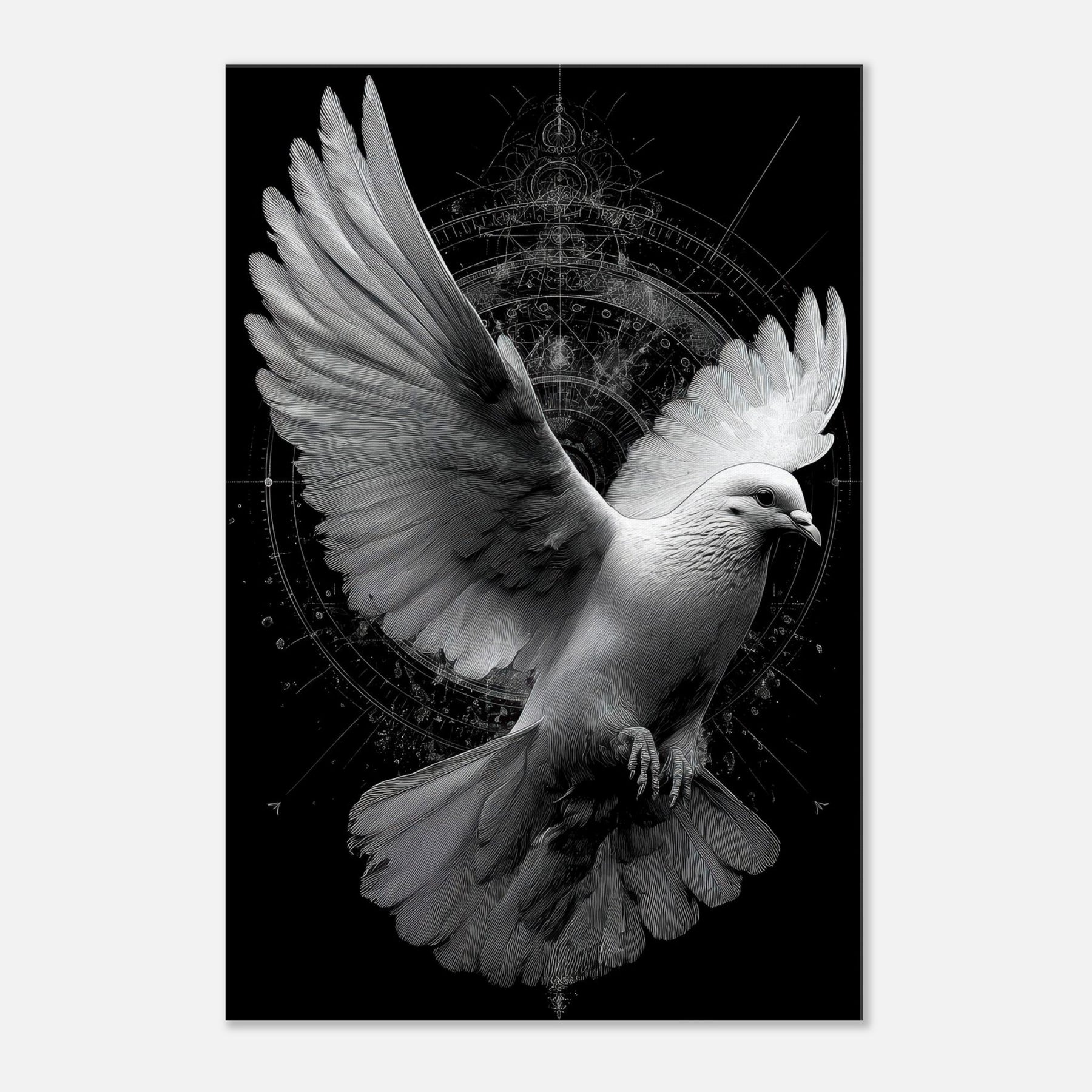 Embrace stillness with the Dove of Peace, rendered in stark black and white as if etched in moonlight. The mystical bird glides through a lattice of celestial circles, its feathers catching the night air in soft, glistening detail.