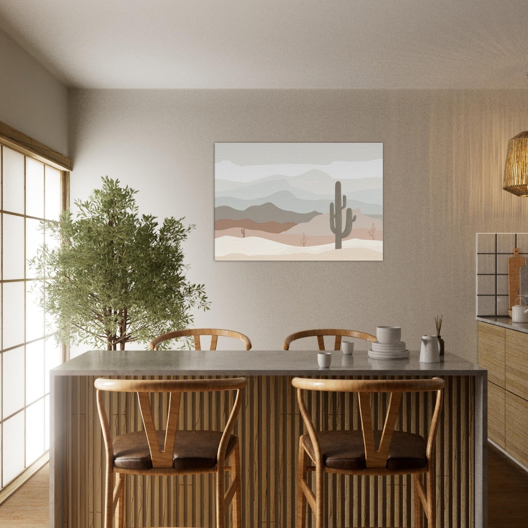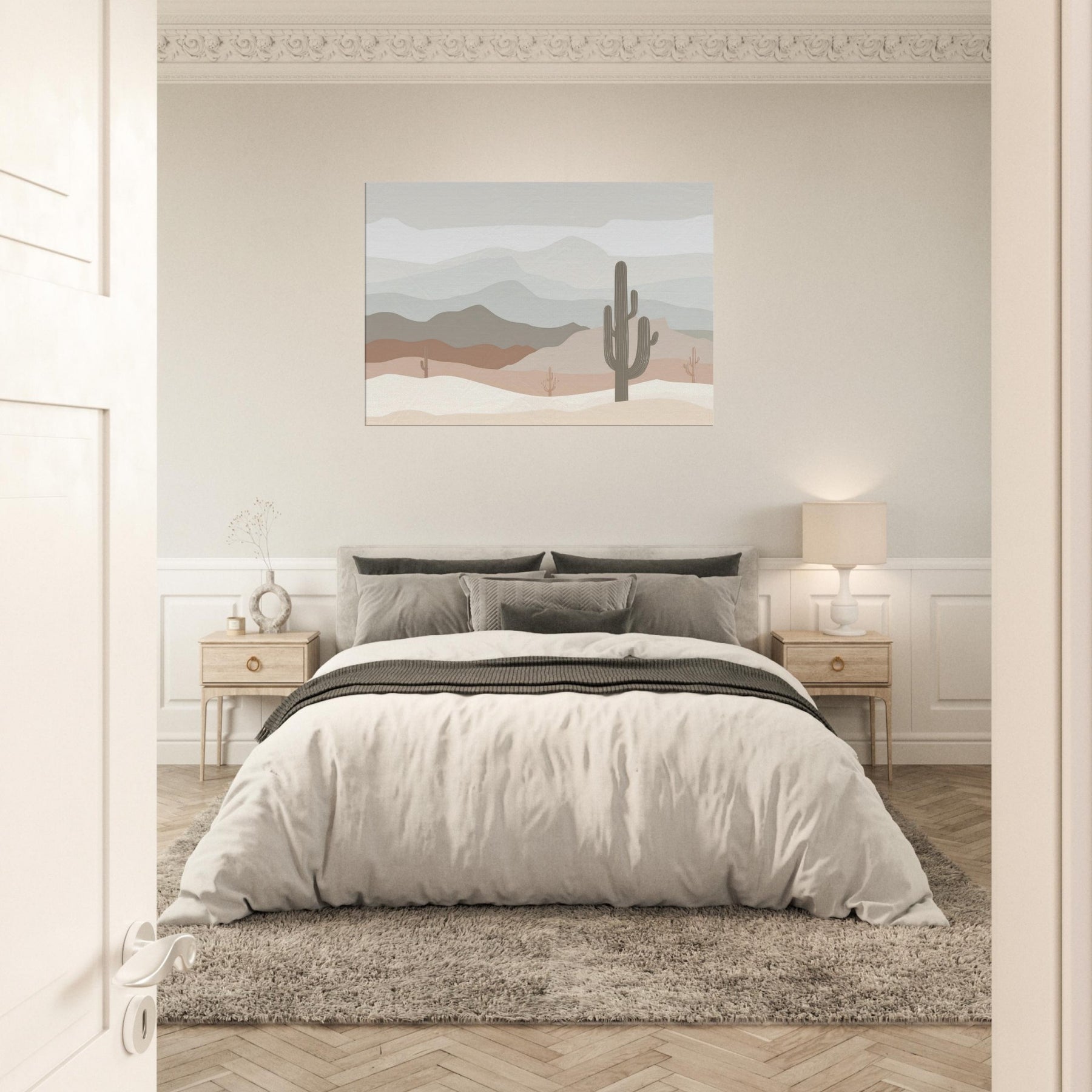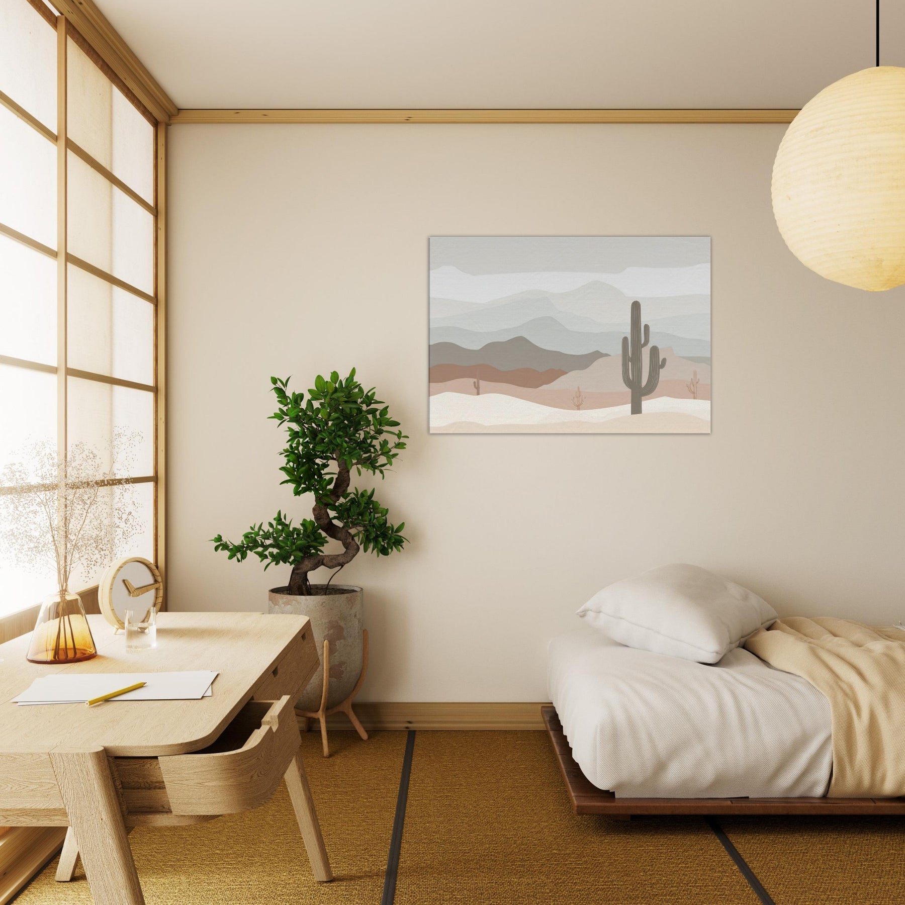Ease into a quiet horizon with this minimalist Desert scene, where layered dunes cradle pale skies and sculptural cacti rise like quiet sentinels. The soft, earthy palette invites warmth and calm, turning any living room into a still life of breath and light. Perfect for a reading nook or lounge, it absorbs and reflects color through the day, subtly shifting mood as the sun moves. A gentle, timeless backdrop for everyday moments.