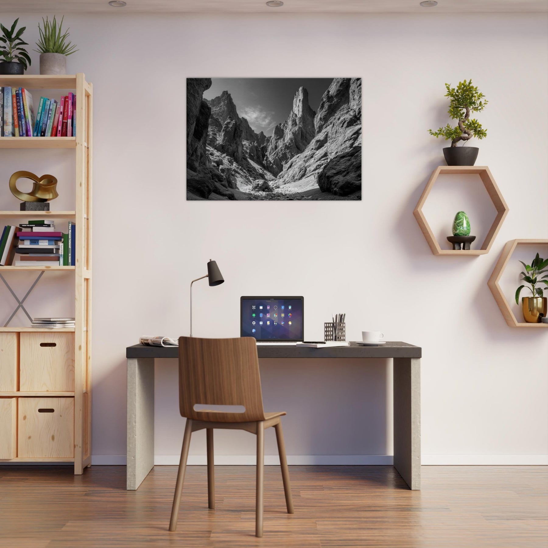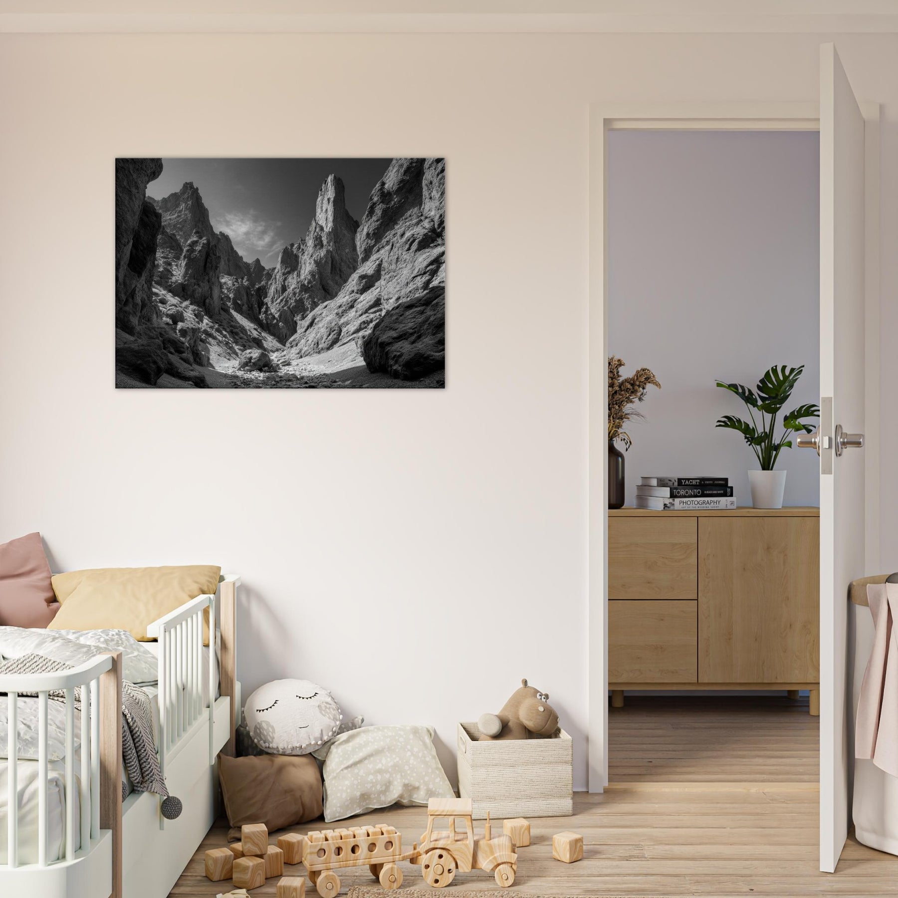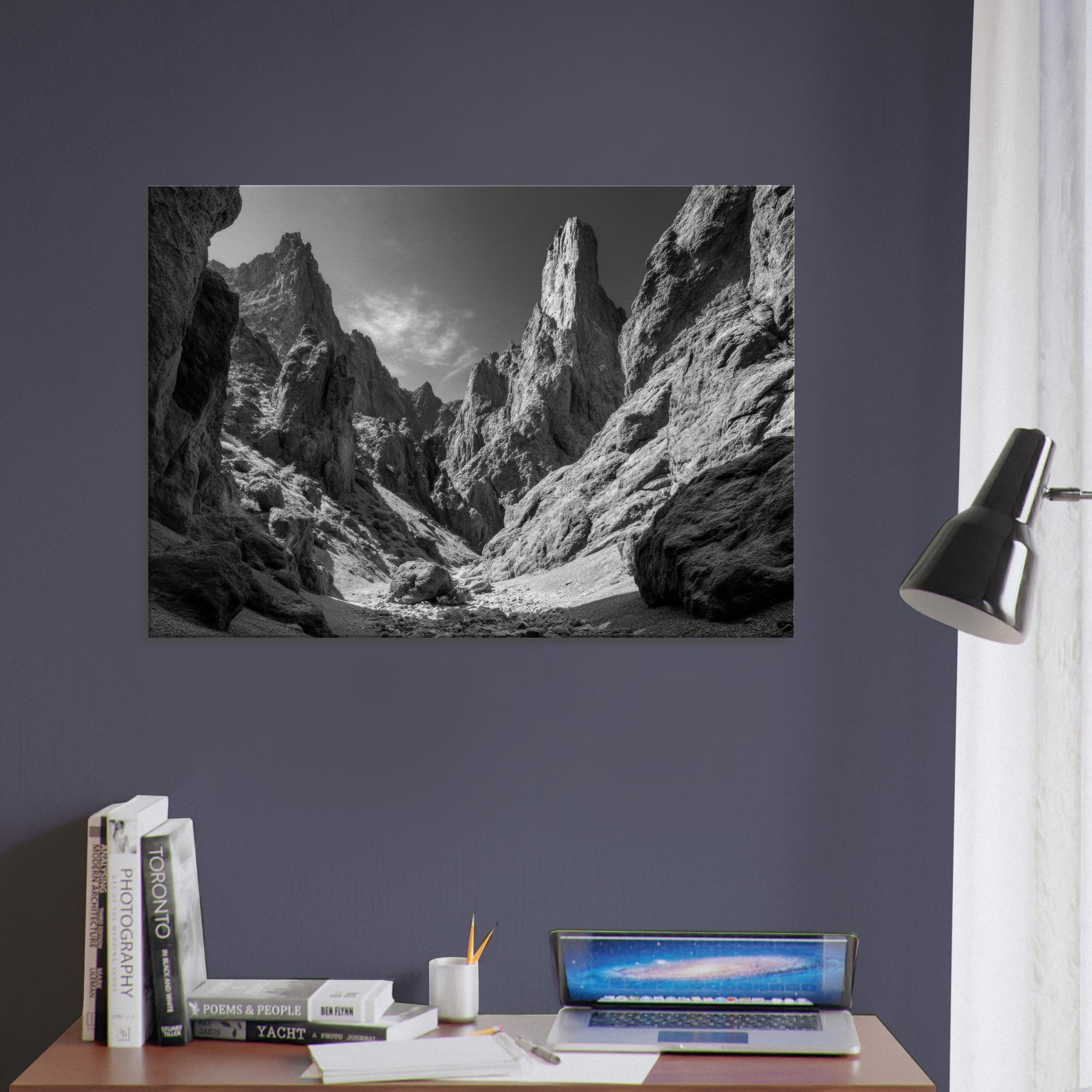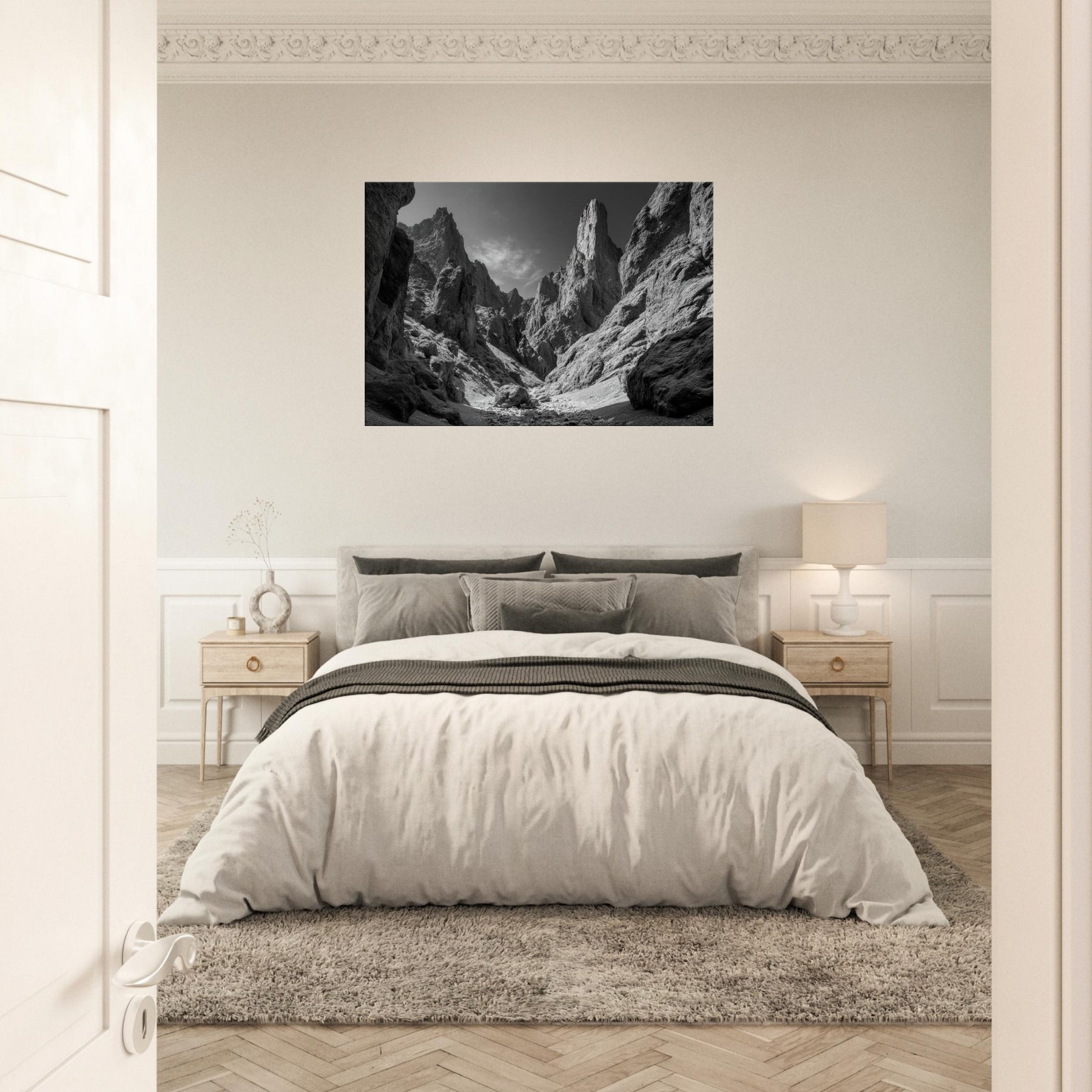 The image brings a cool, monochrome calm to a living space, pairing dramatic texture with simplicity. Hang it in a lounge or study to echo the endurance of rock and the promise of expansive horizons.