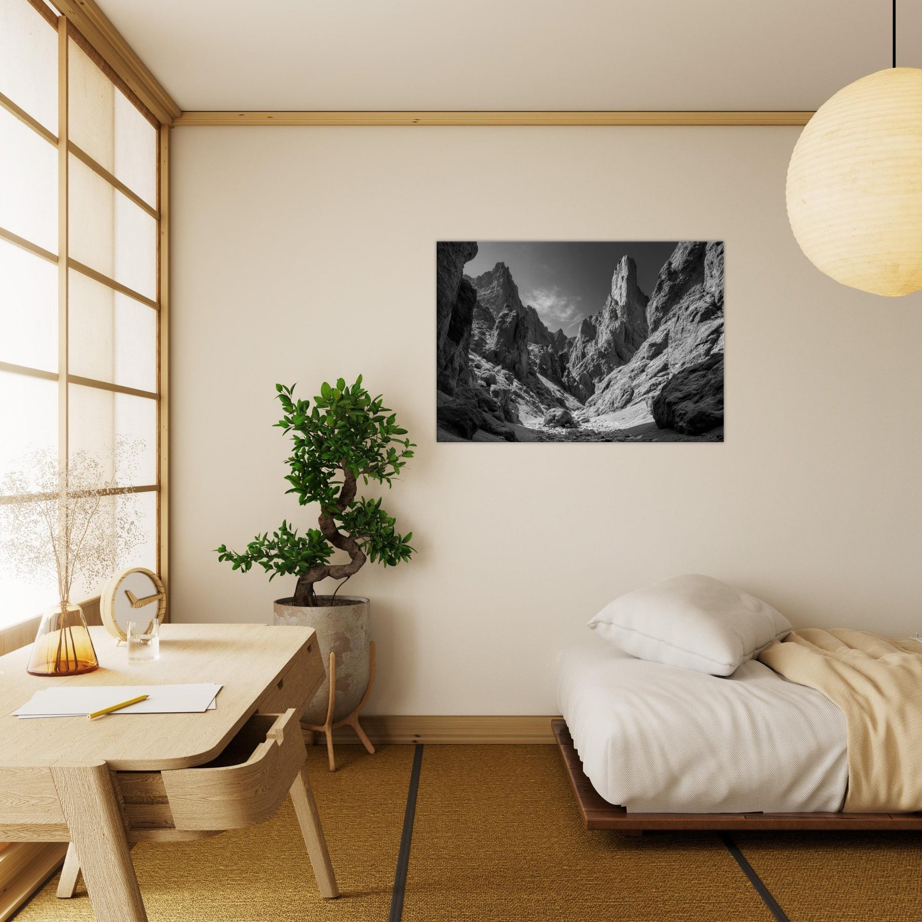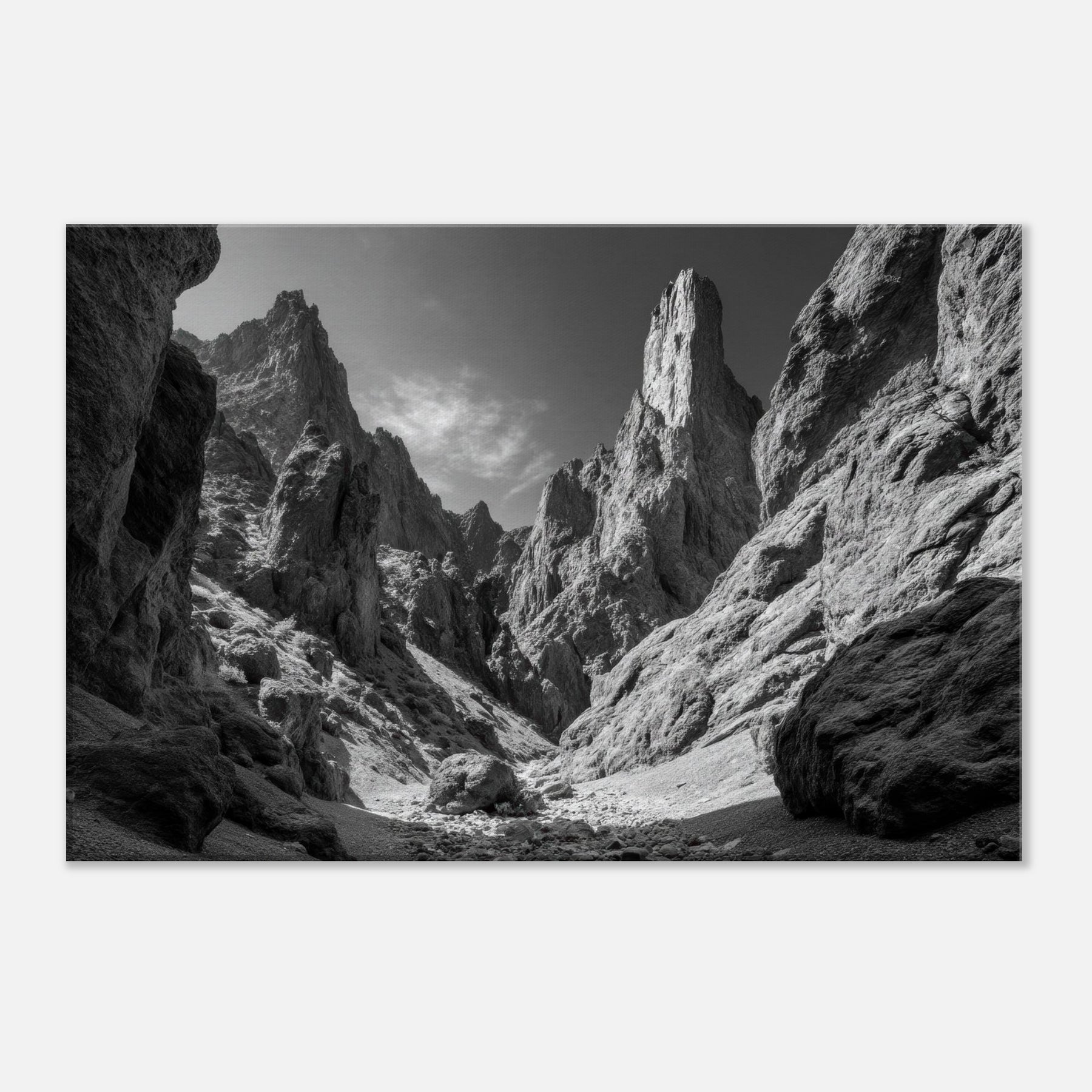 Rising walls of a Canyon, sculpted in stark light and shadow, invite quiet reflection. This black and white rendering captures the raw poetry of nature, where jagged silhouettes cut a breathless sky and the rough floor becomes a stage for stillness.
