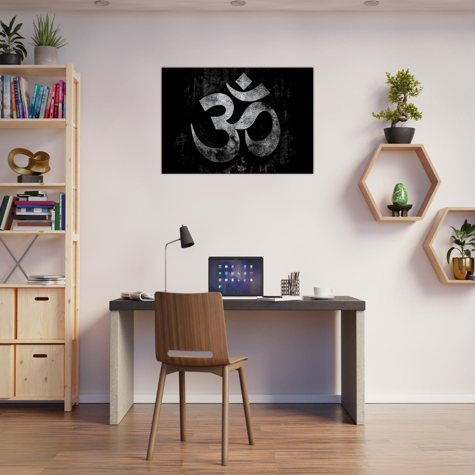 It becomes a focal point for contemplation, a subtle whisper of mysticism that elevates a living space with balance, depth, and a serene, almost timeless presence. The central subject is Om (Aum Symbol).