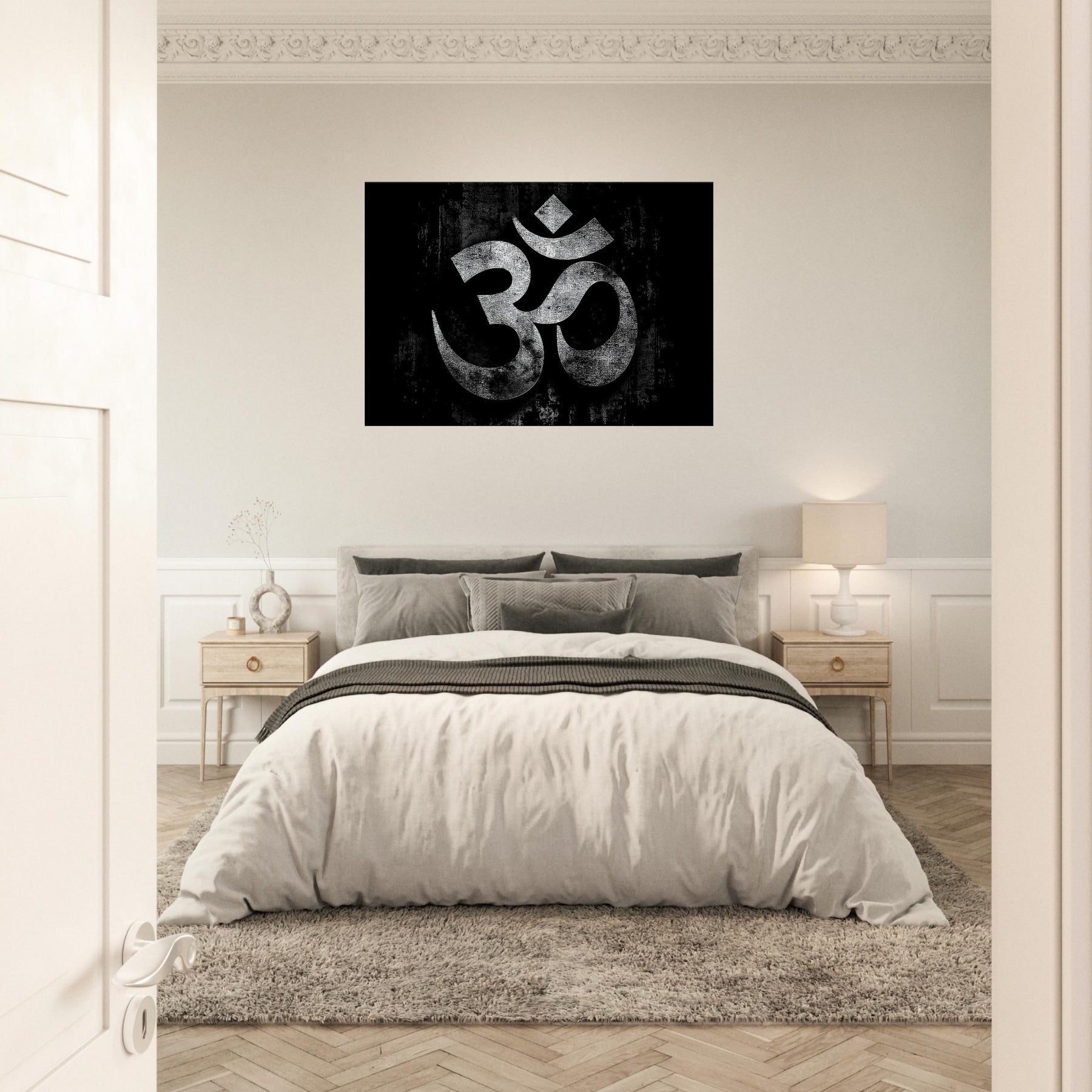 Bathed in stark contrast, this black and white meditation on the Om symbol invites a quiet breath into your room.