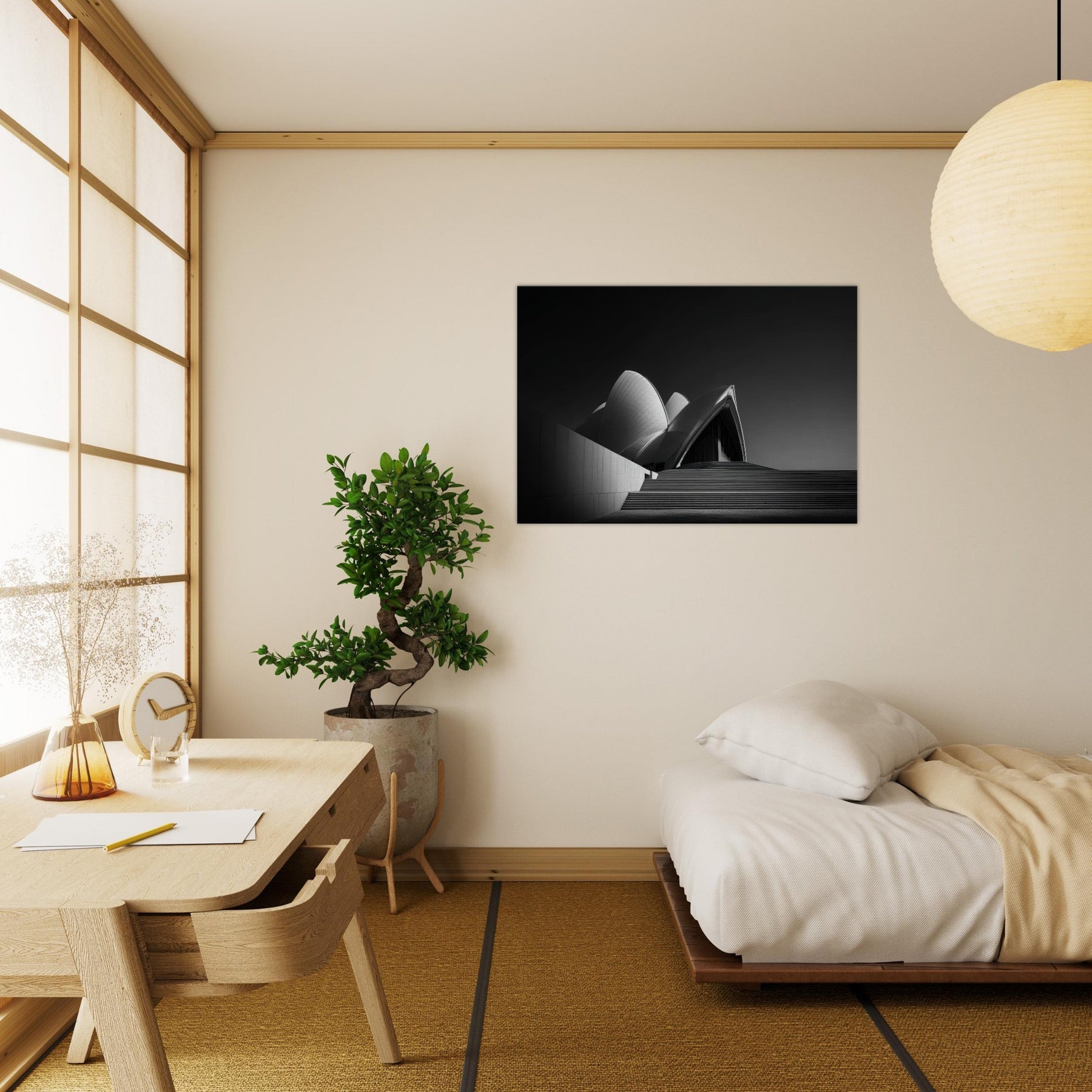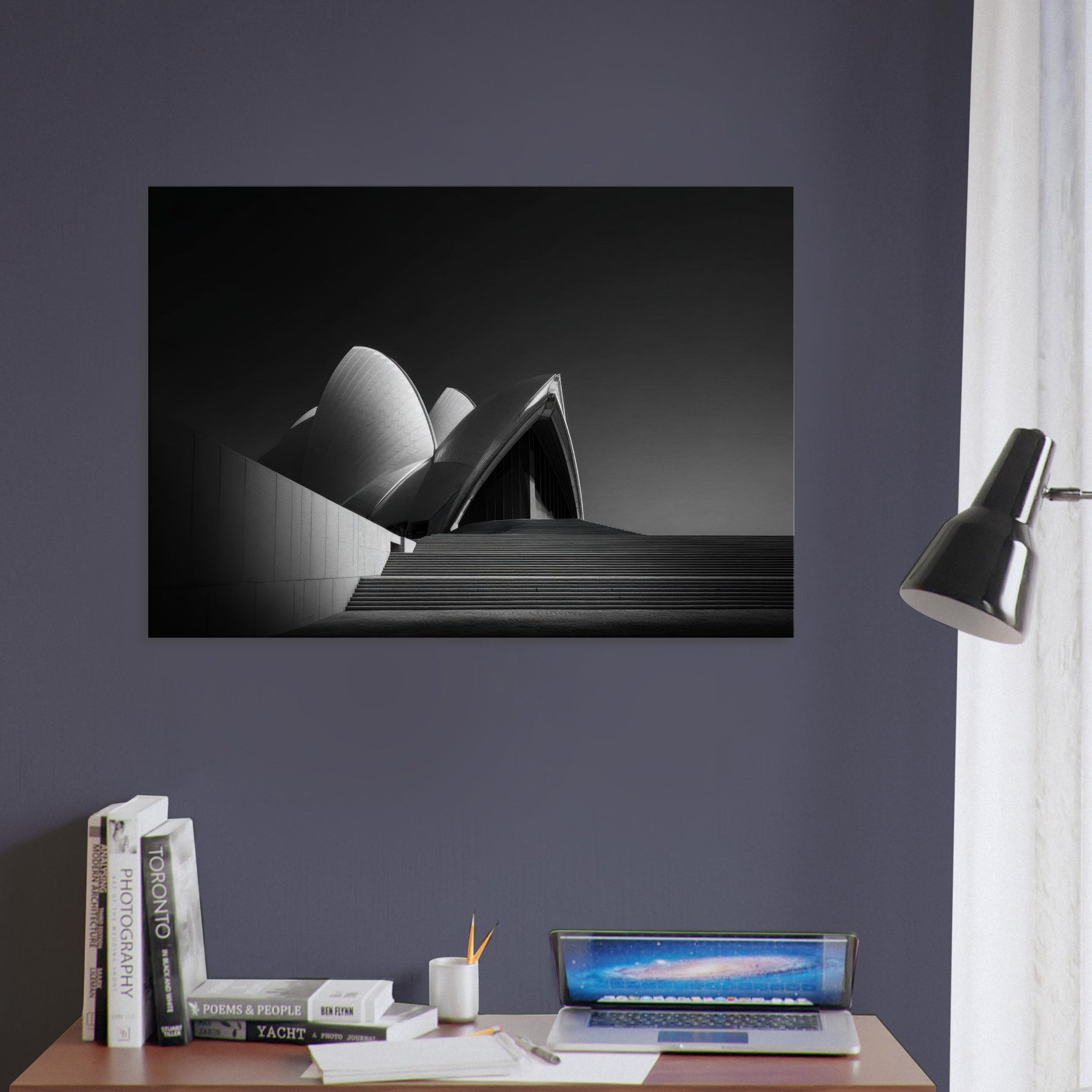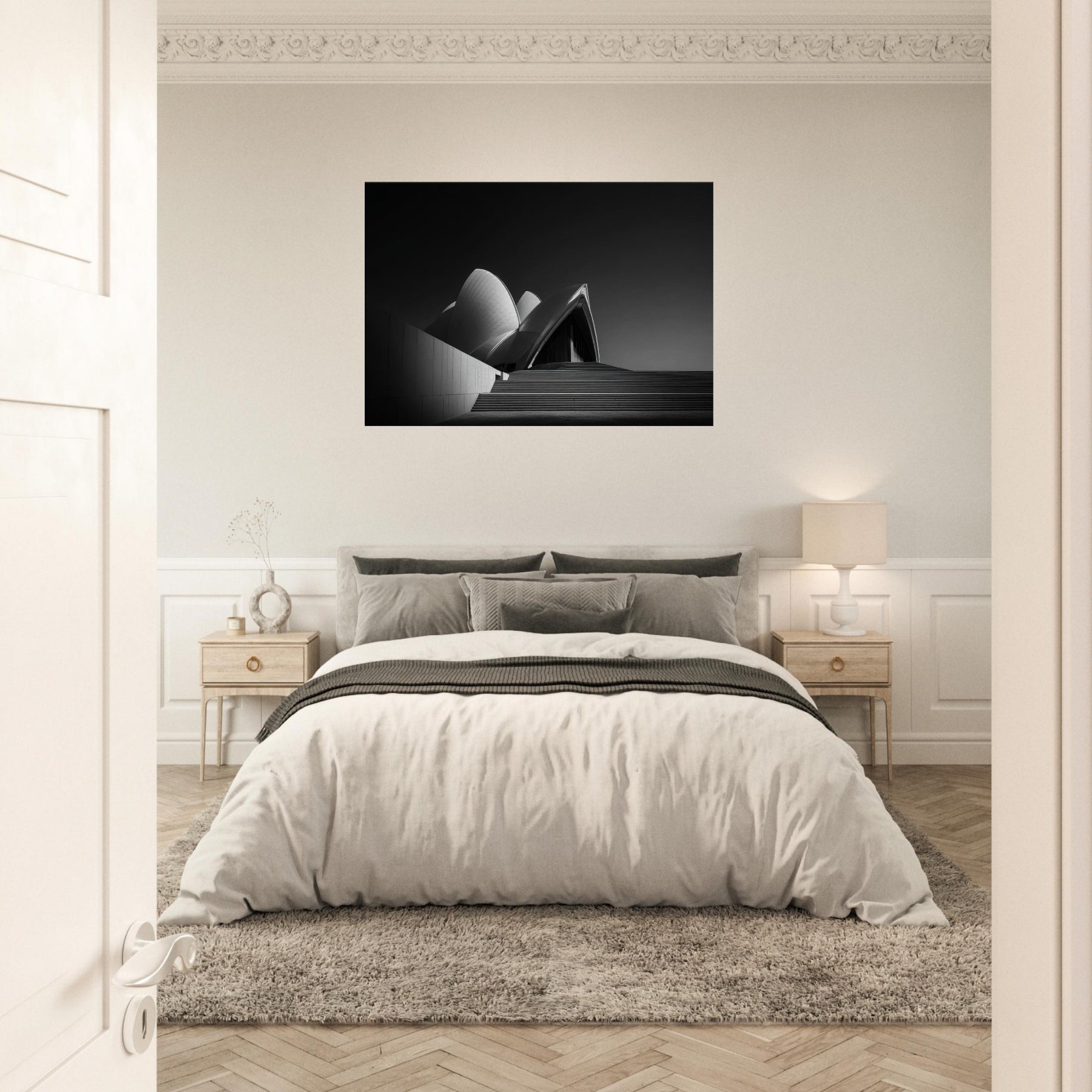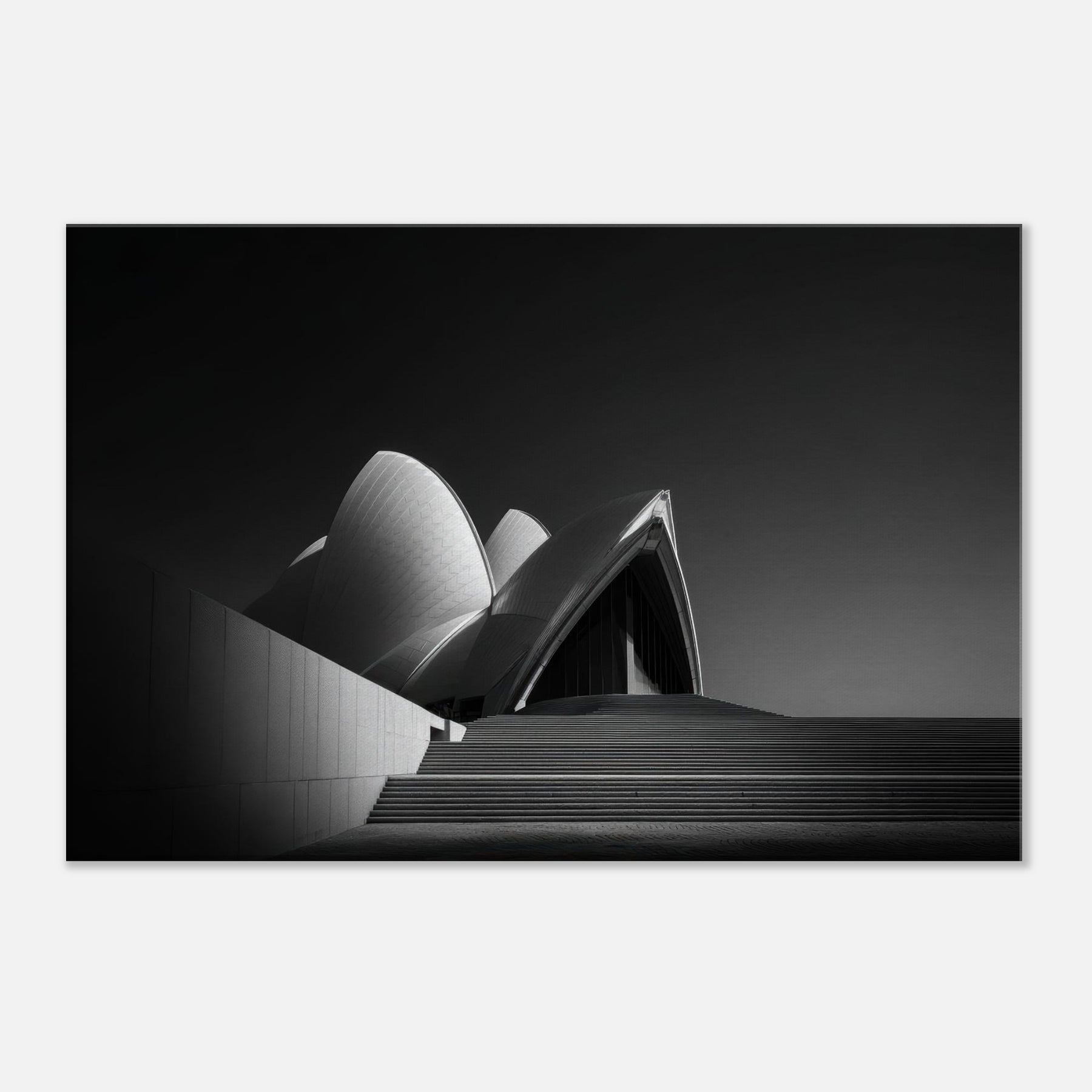 Step into a canvas of midnight calm and sculptural light. This black and white interpretation of the Sydney Opera House captures its sculptural sails with quiet precision, turning movement into stillness and ambition into shade.