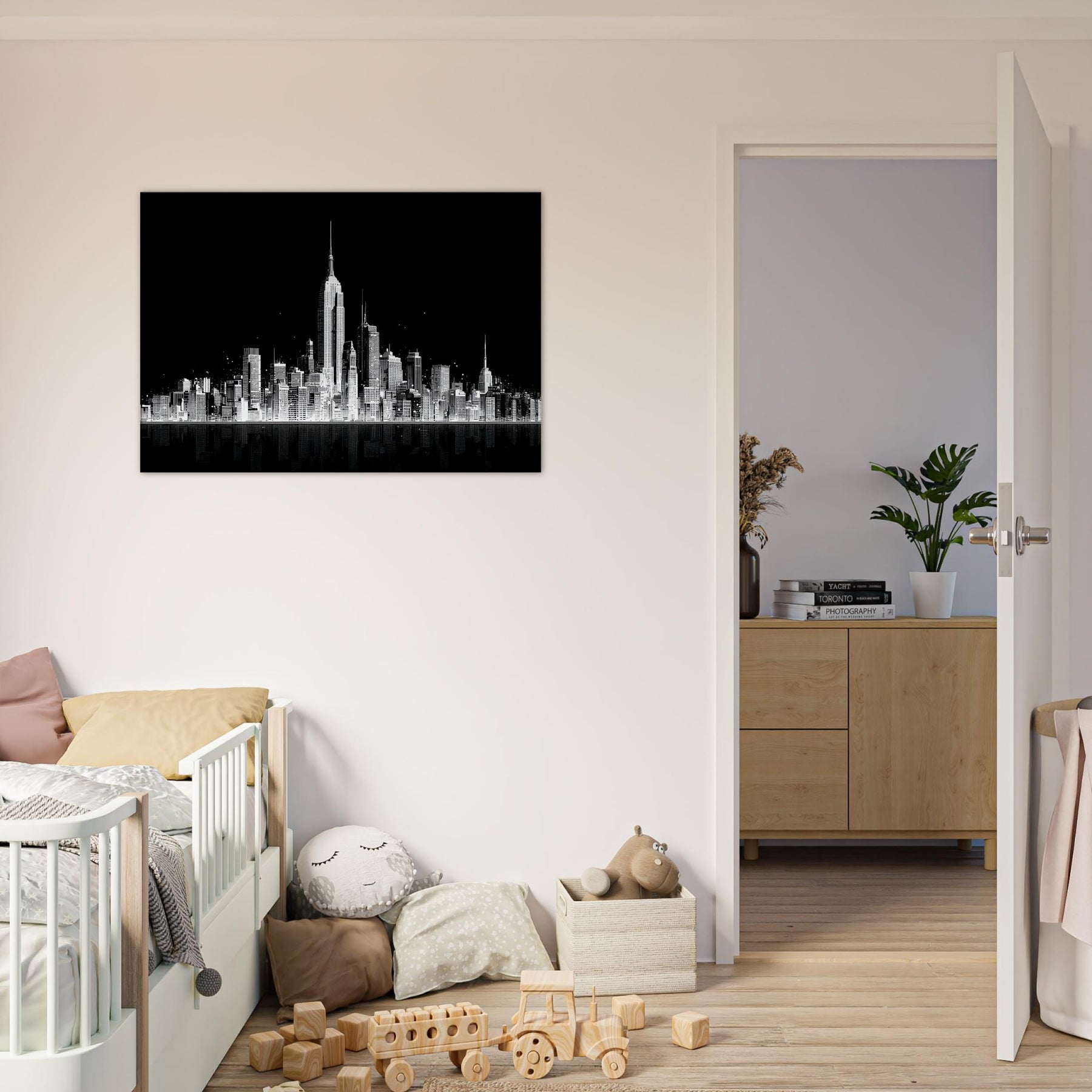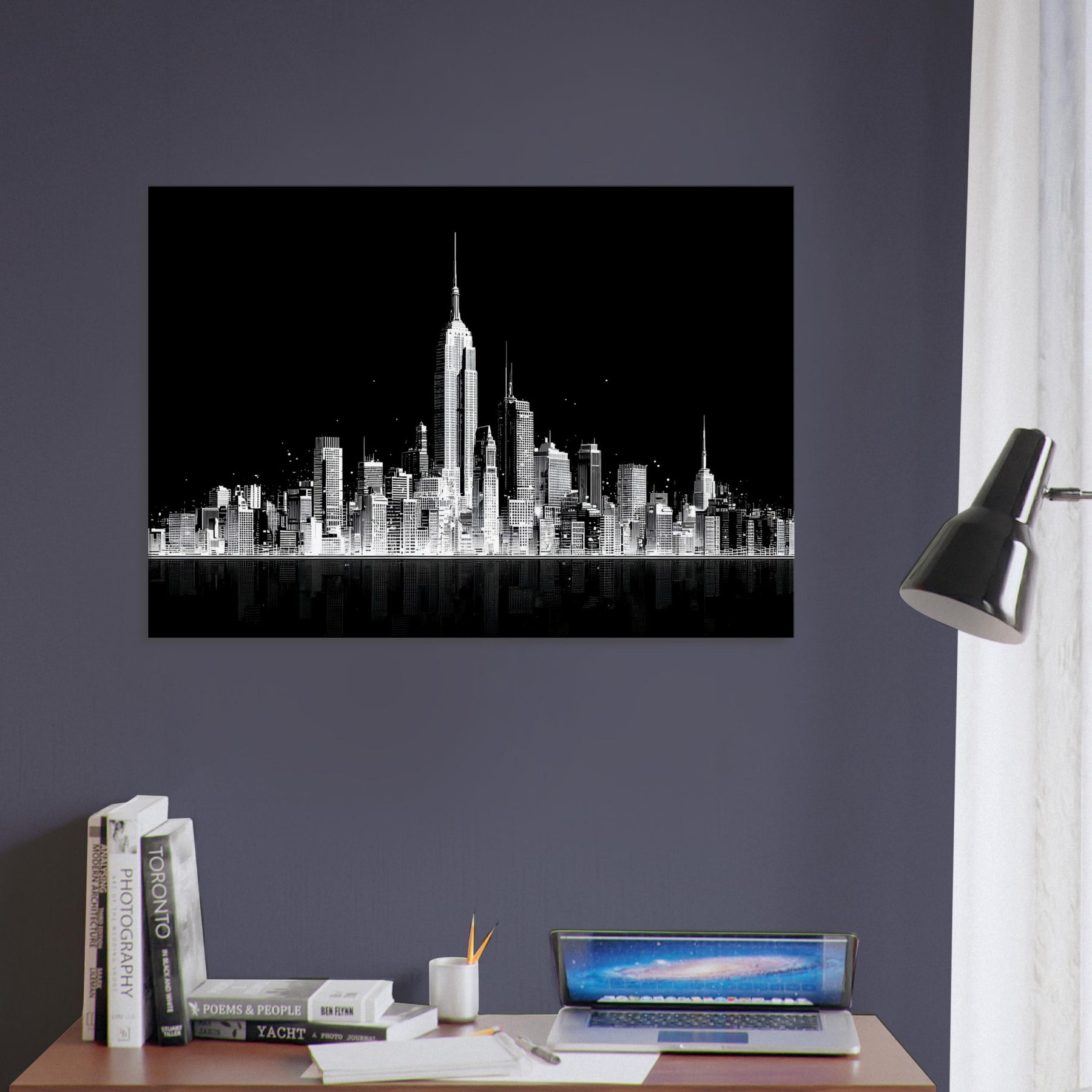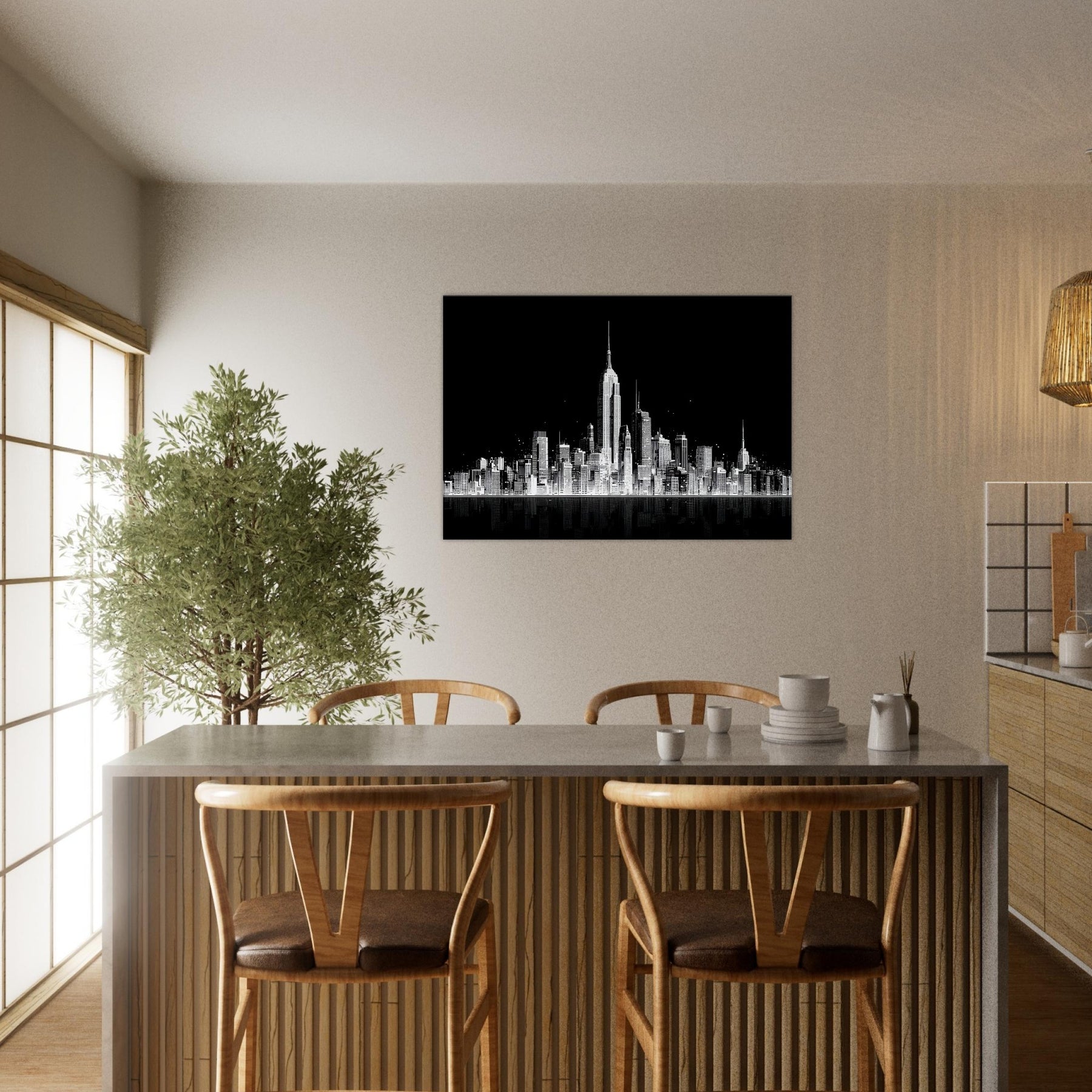 The contrast of ivory light against midnight darkness creates a calm, curated energy perfect for a living room or study. This wall art acts as a focal whisper, shaping conversation and lending urban poetry to everyday moments.
