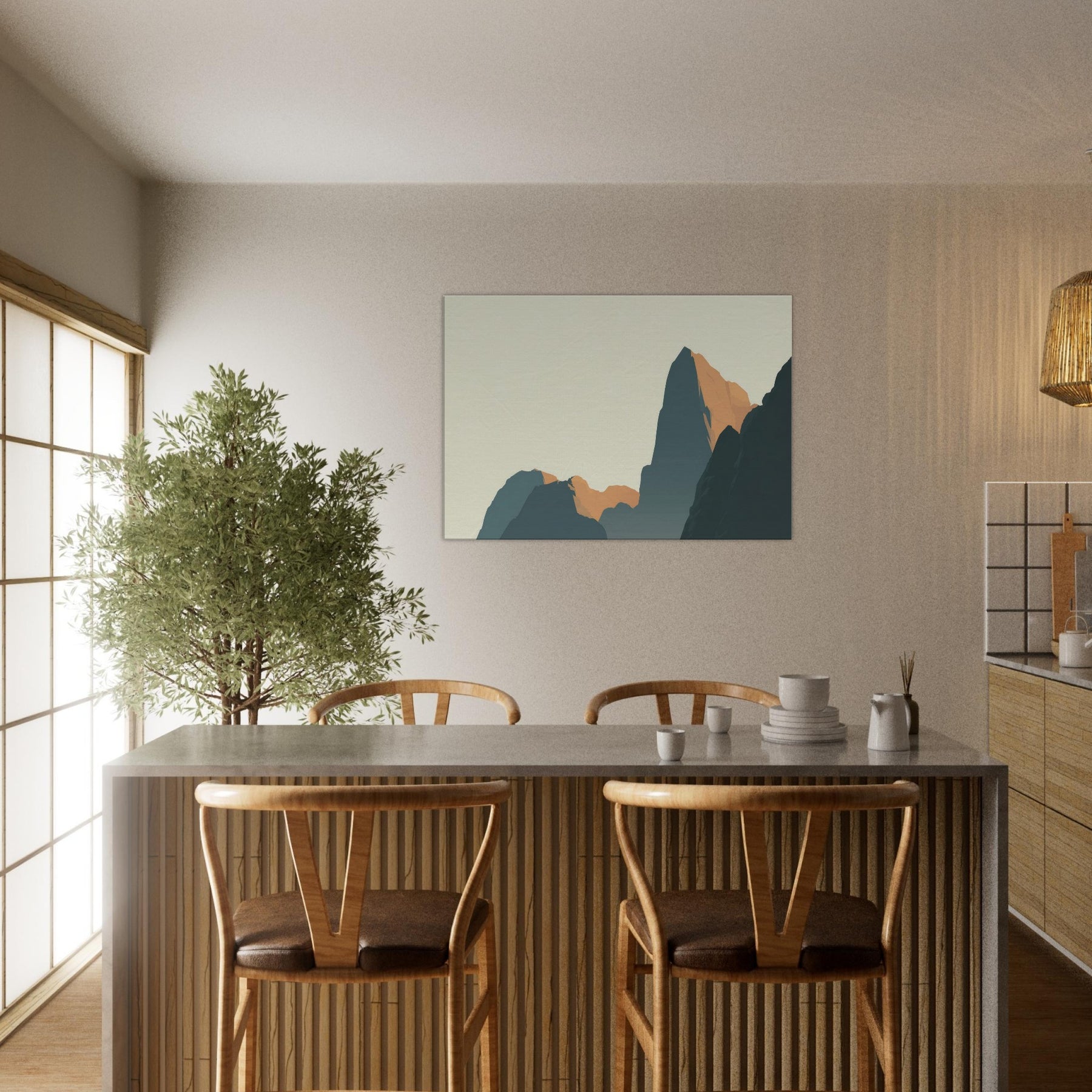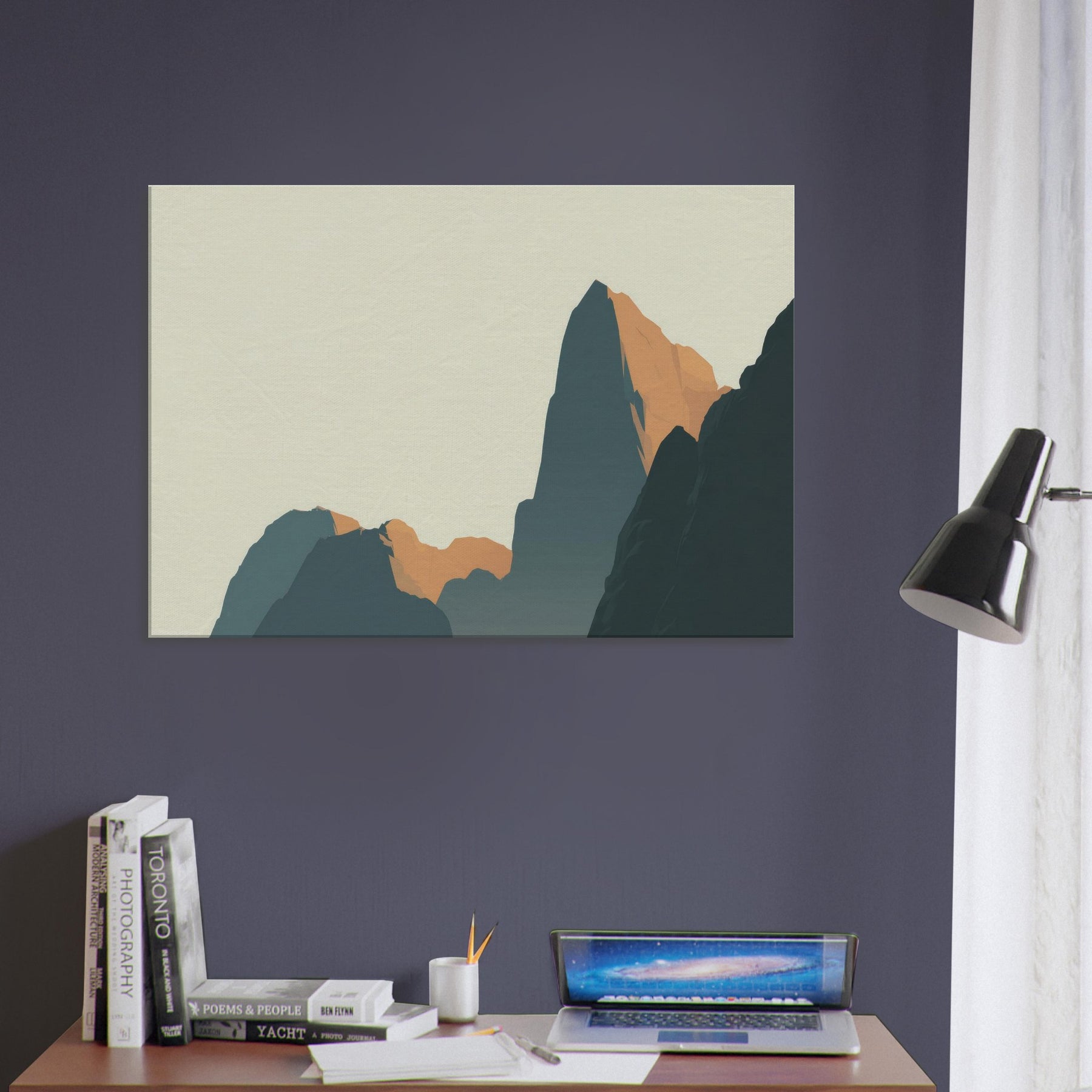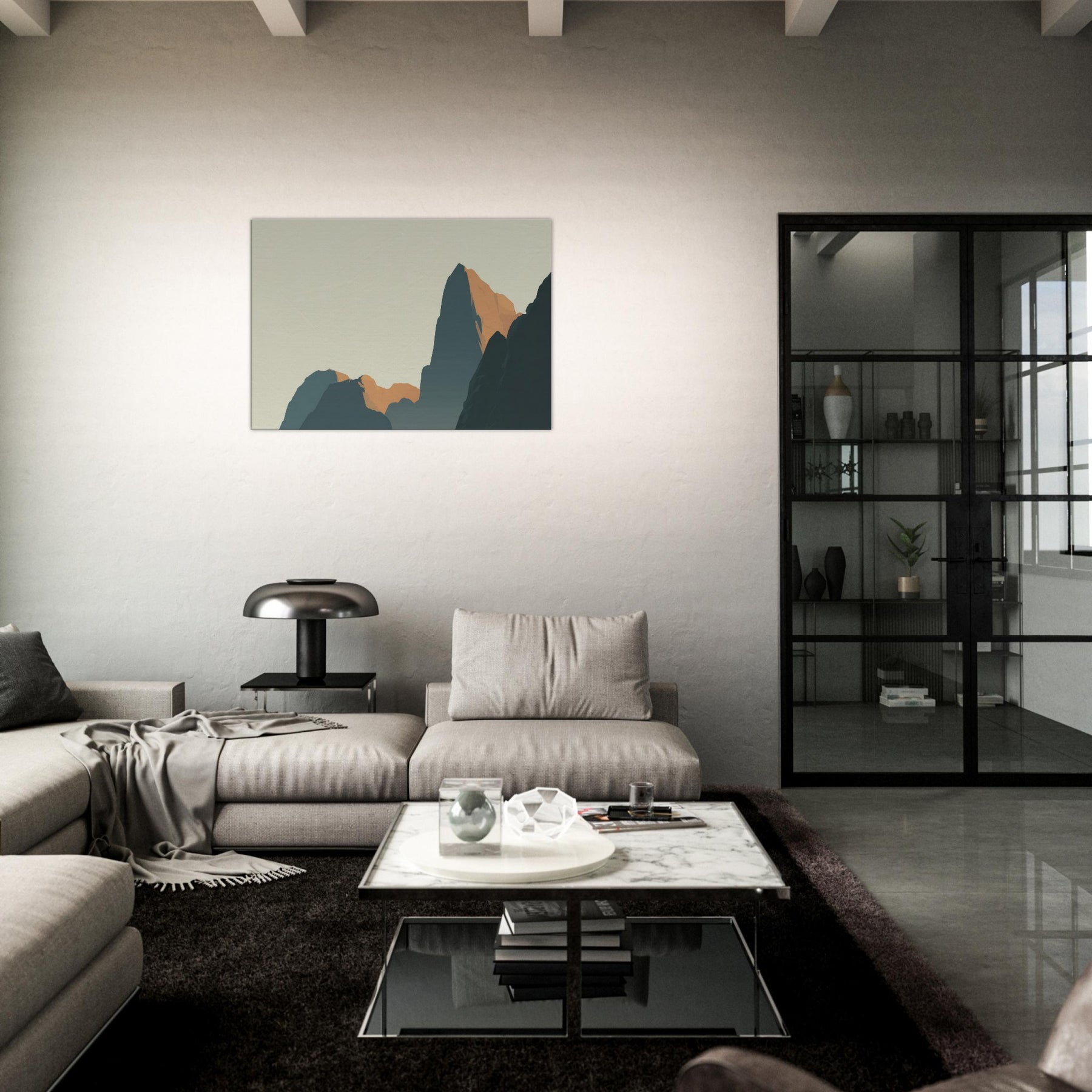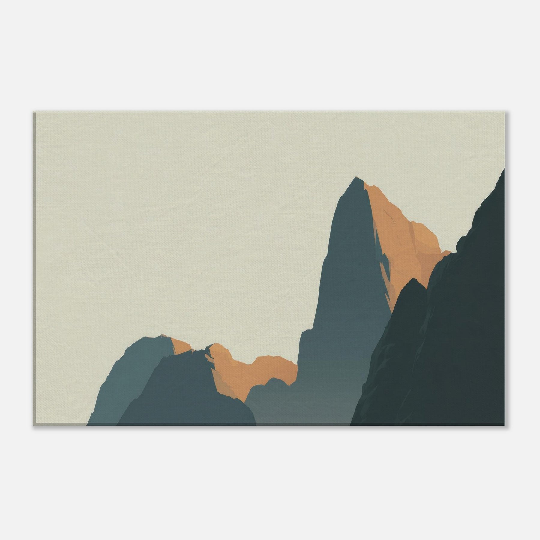 A quiet, expansive scene of cliffs rendered in clean planes, this minimalist study of nature invites contemplation. The pale sky, deep slate shadows, and warm ochre highlights breathe a sense of sunrise over the cliffs. The cliffs stand as a calm, enduring presence, offering balance and breathing space in any room. Hung above a sofa or at the end of a hallway, it transforms walls into a tranquil subtle, sophisticated, and endlessly reassuring.