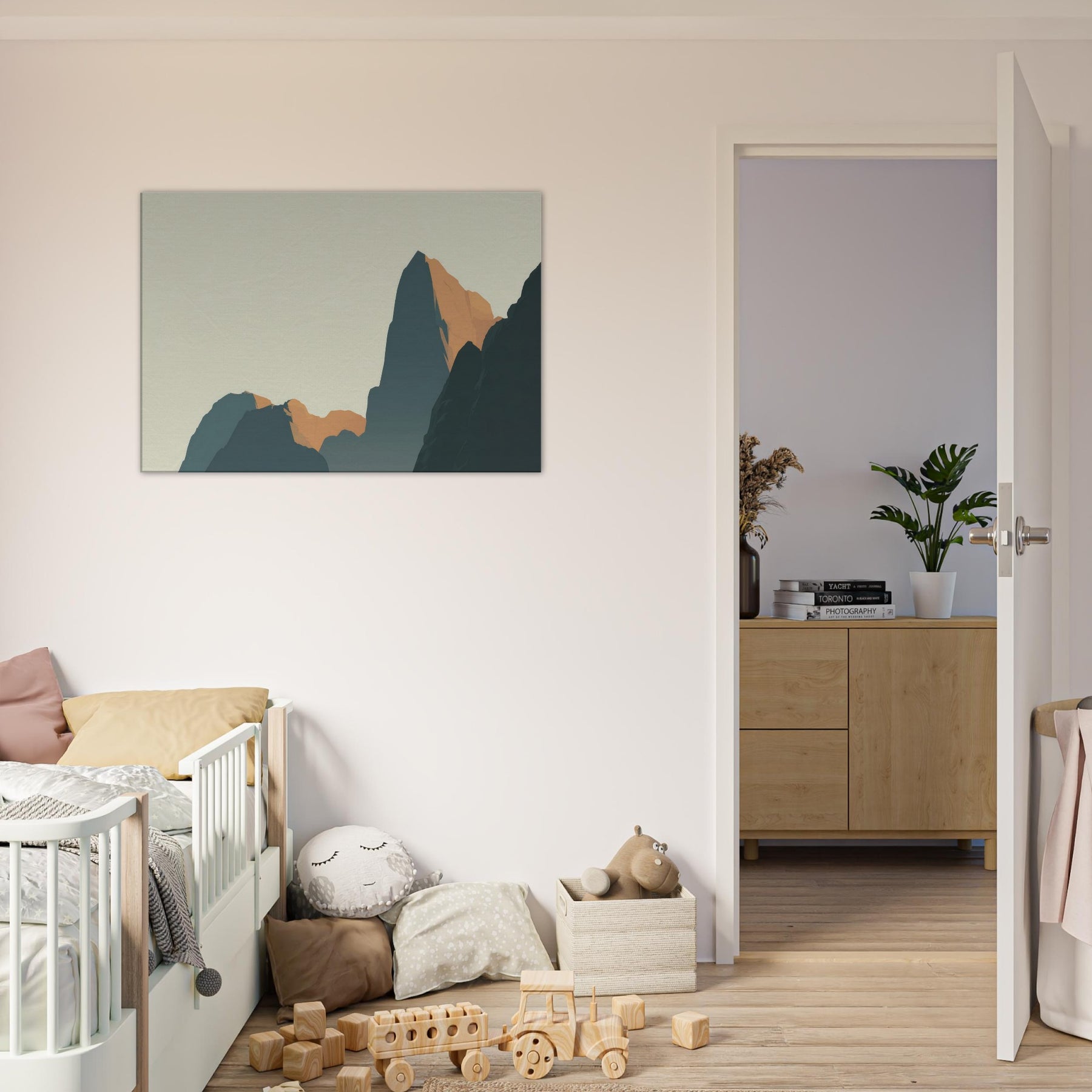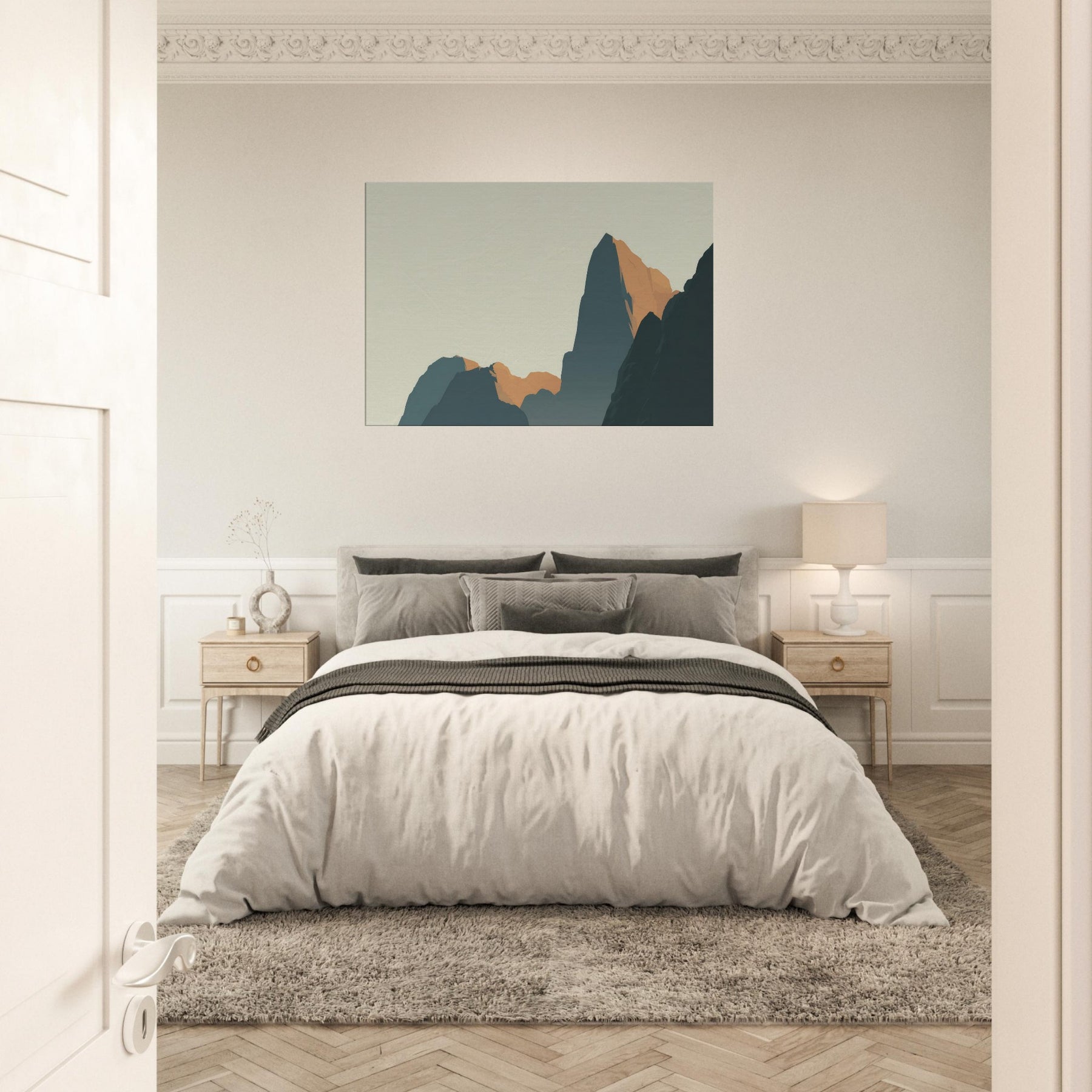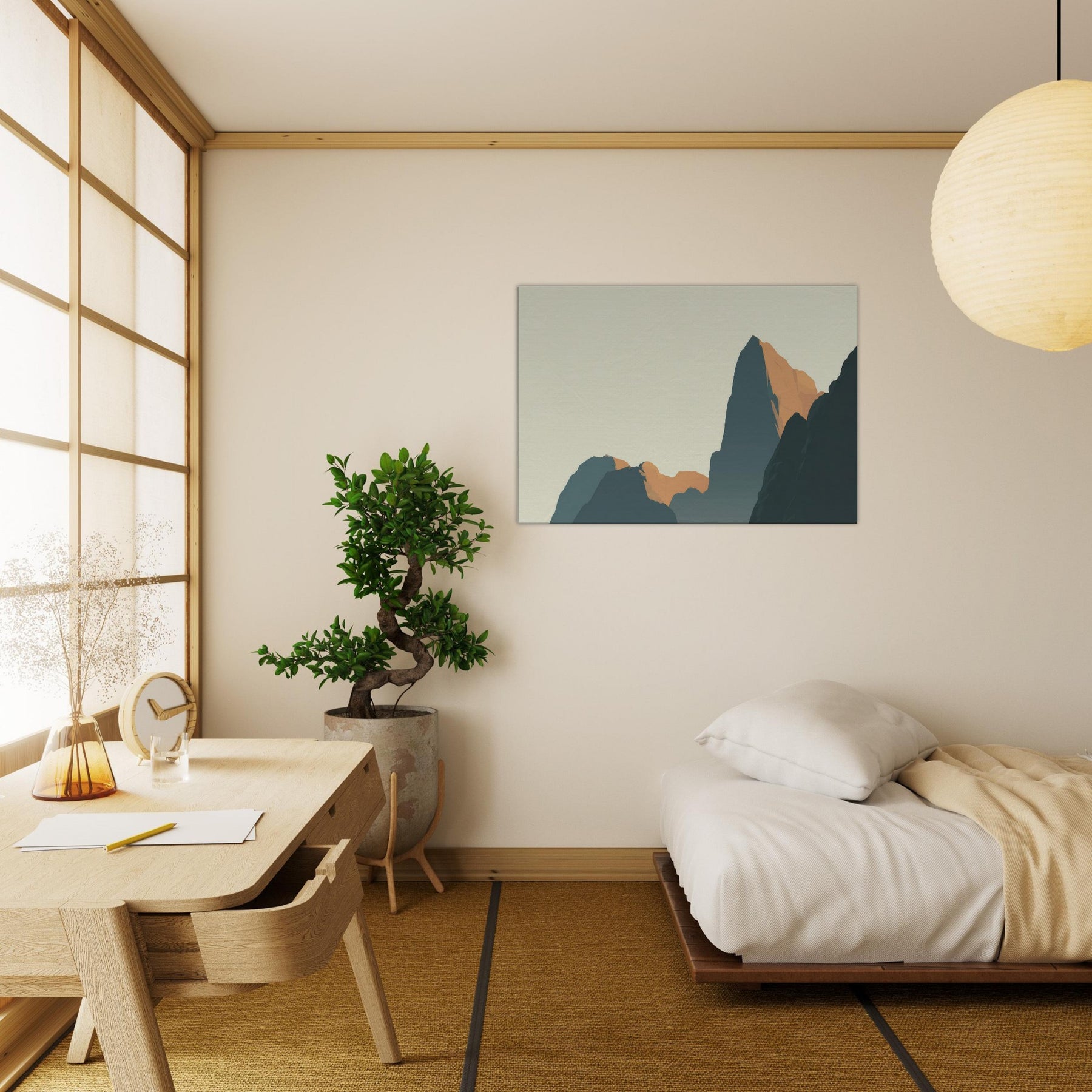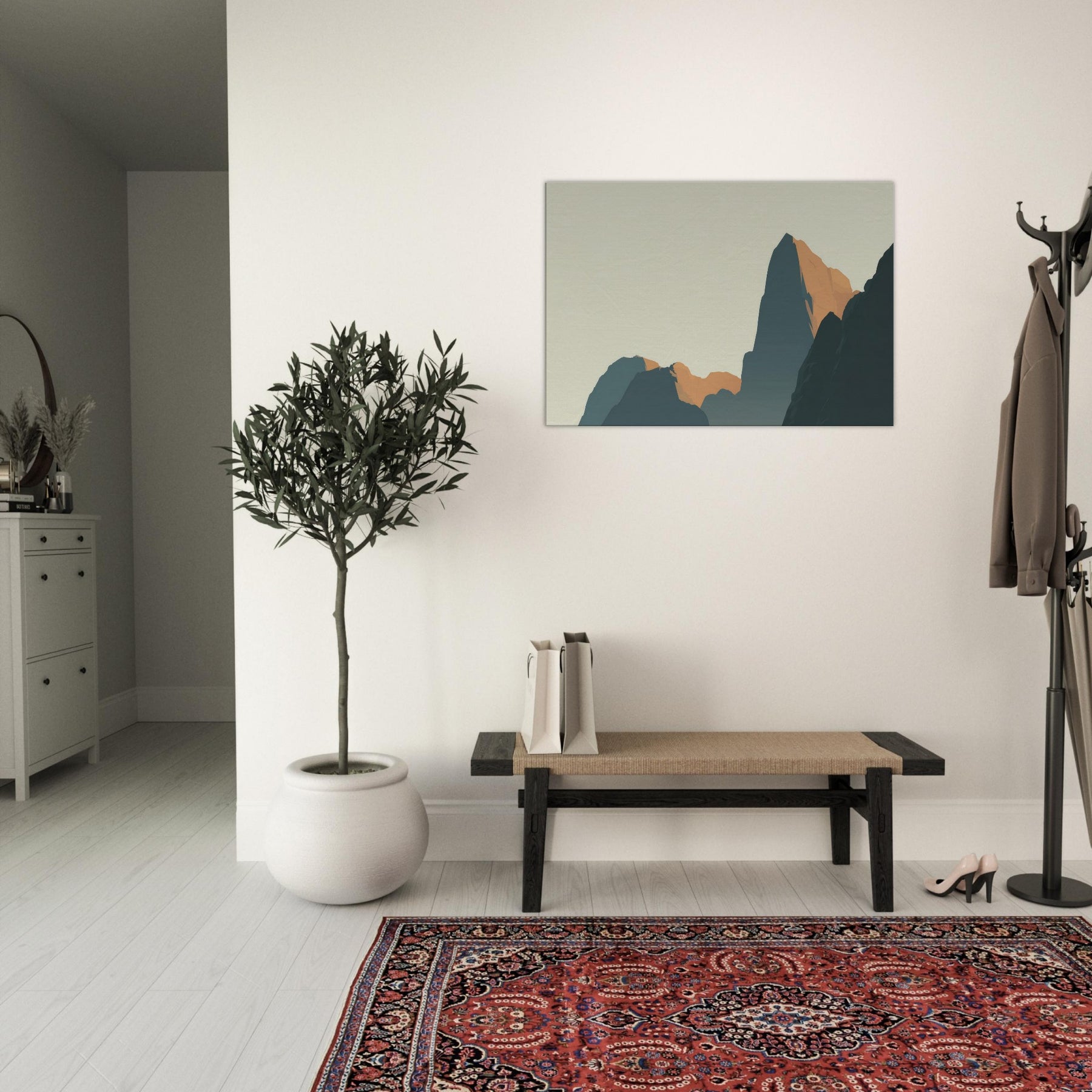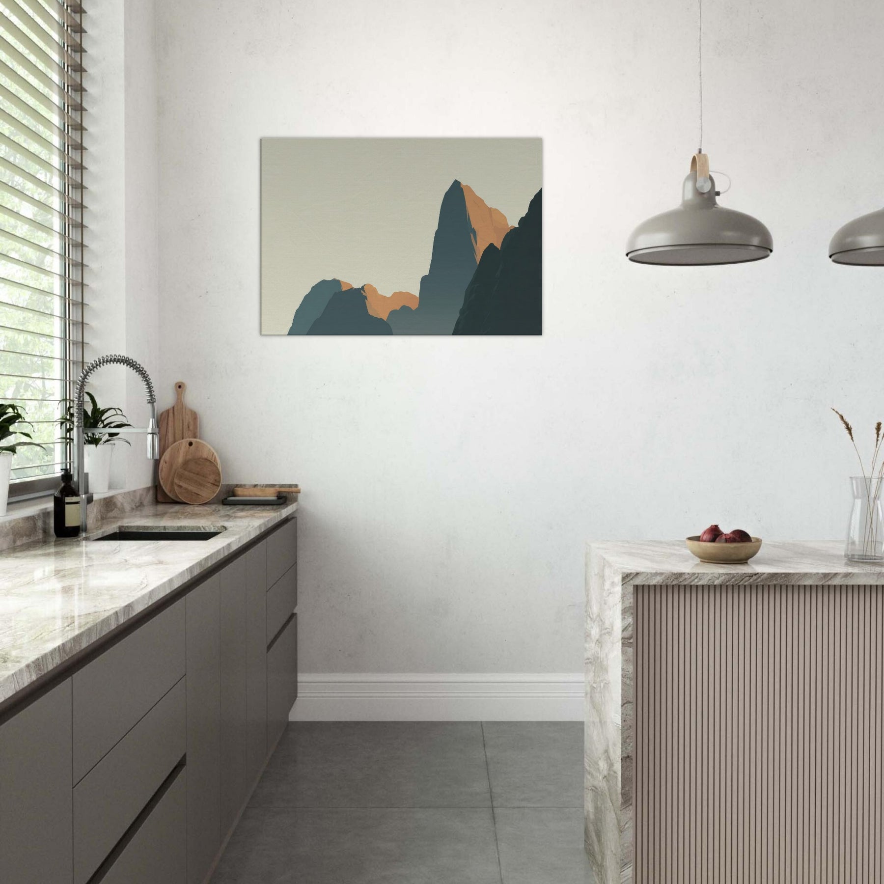 A quiet, expansive scene of cliffs rendered in clean planes, this minimalist study of nature invites contemplation. The pale sky, deep slate shadows, and warm ochre highlights breathe a sense of sunrise over the cliffs. The cliffs stand as a calm, enduring presence, offering balance and breathing space in any room. Hung above a sofa or at the end of a hallway, it transforms walls into a tranquil subtle, sophisticated, and endlessly reassuring.